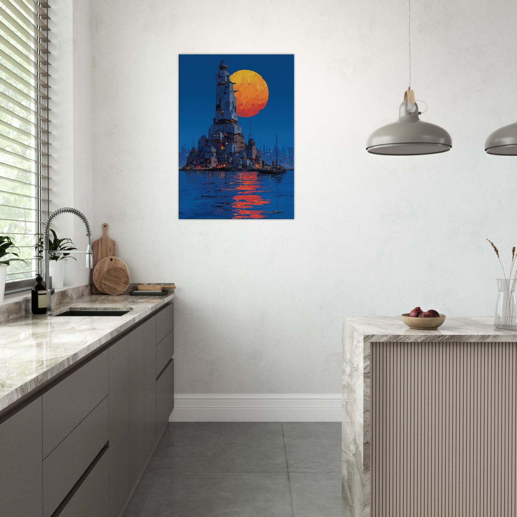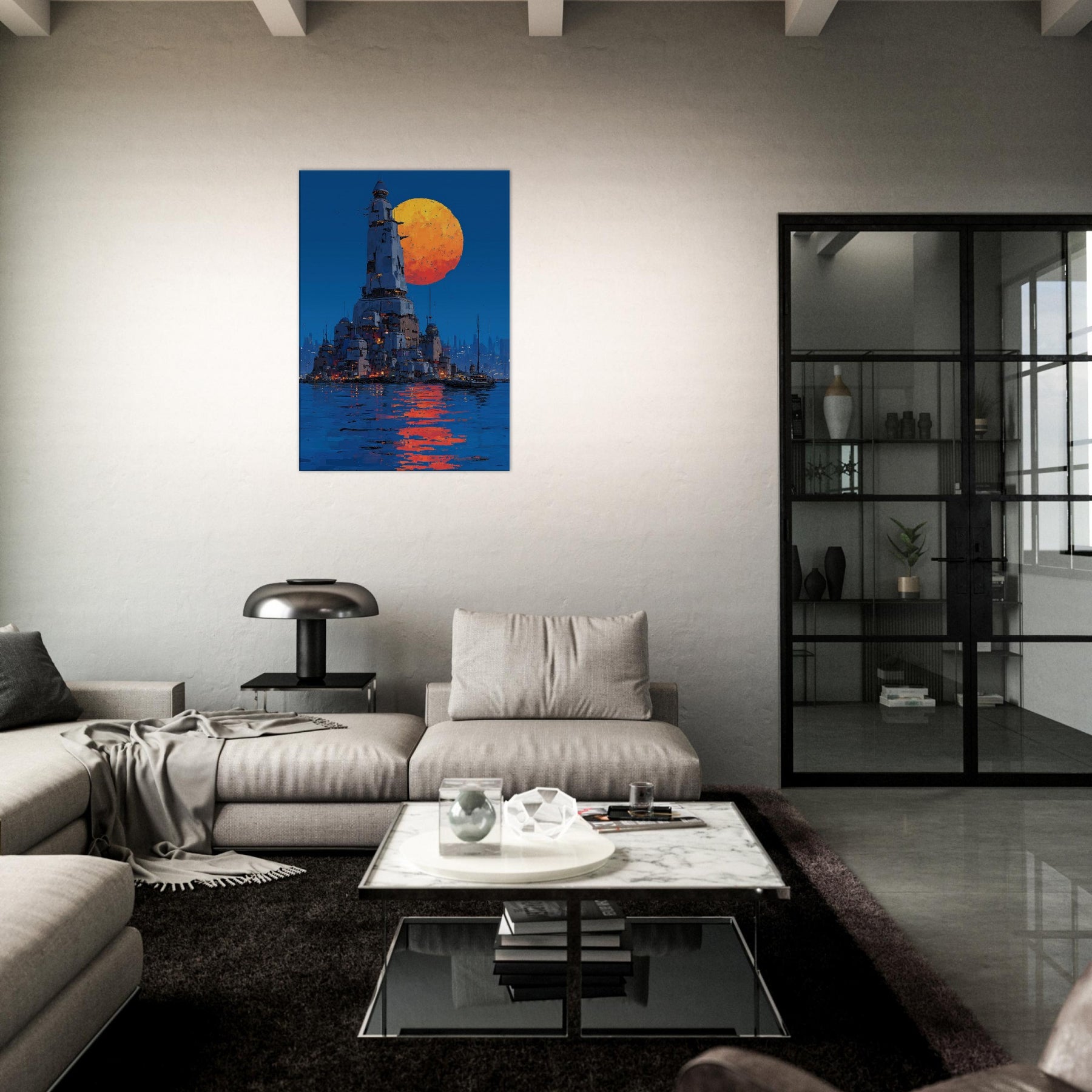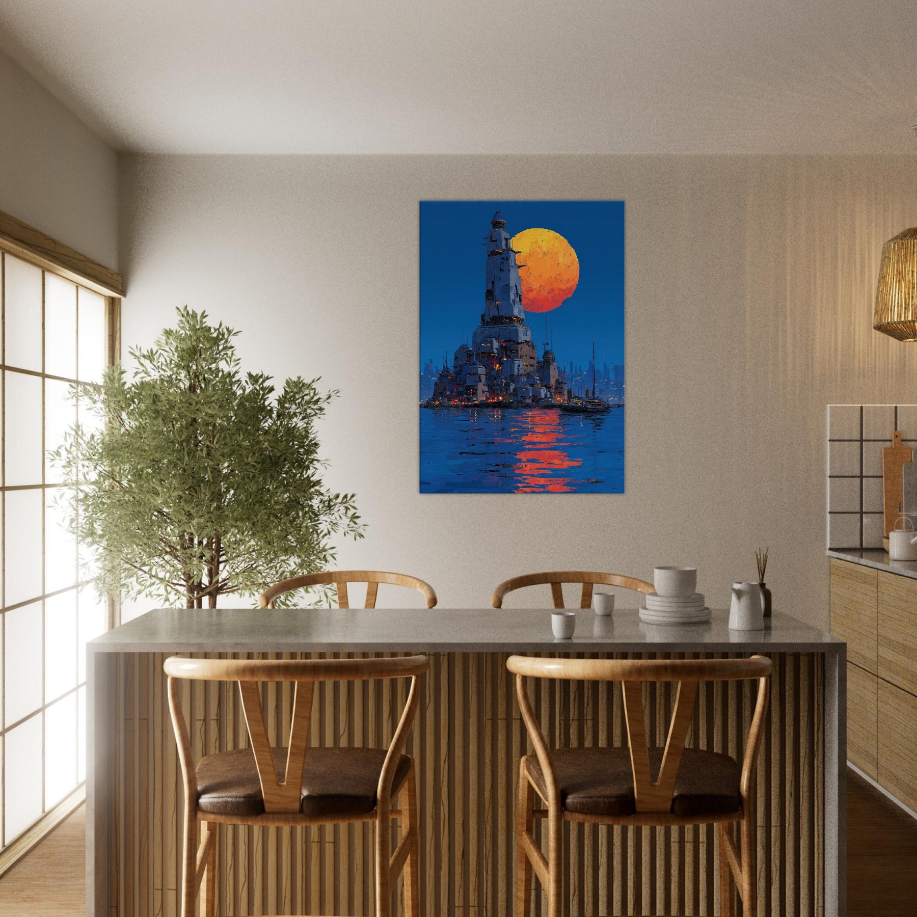 As the Primary Subject, Floating City, a fantastical skyline rises from tranquil waters, painted in a mane of cobalt and sapphire that shifts with every breath of light. The colossal orange sun sinks behind the towers, its warm reflection rippling across the surface like molten glass. This abstract composition bathes a room in twilight hush perfect for a living room or study infusing quiet wonder, mythic scale, and a serene, dreamlike energy that invites conversation and slow, lingering attention.