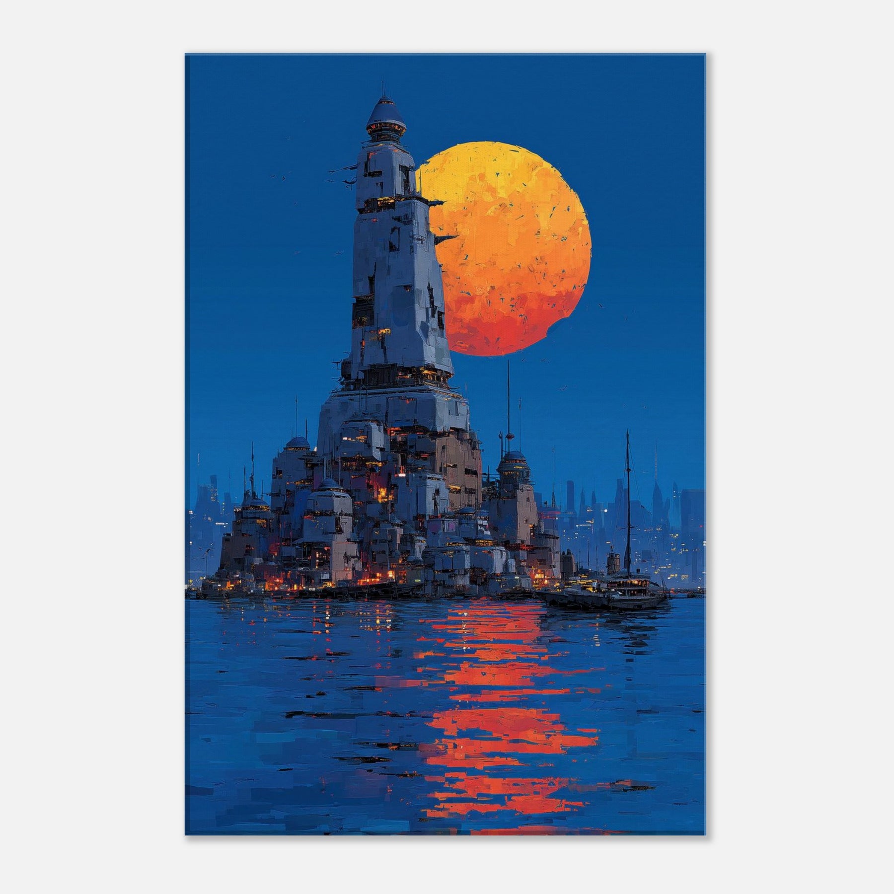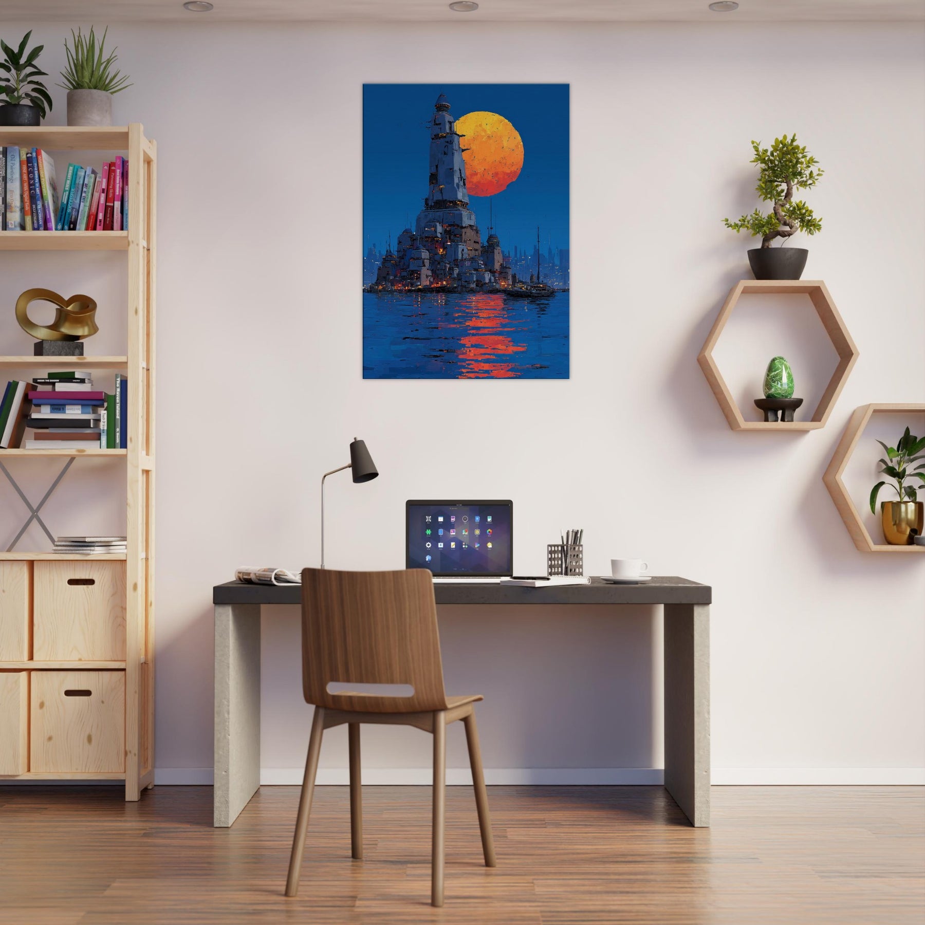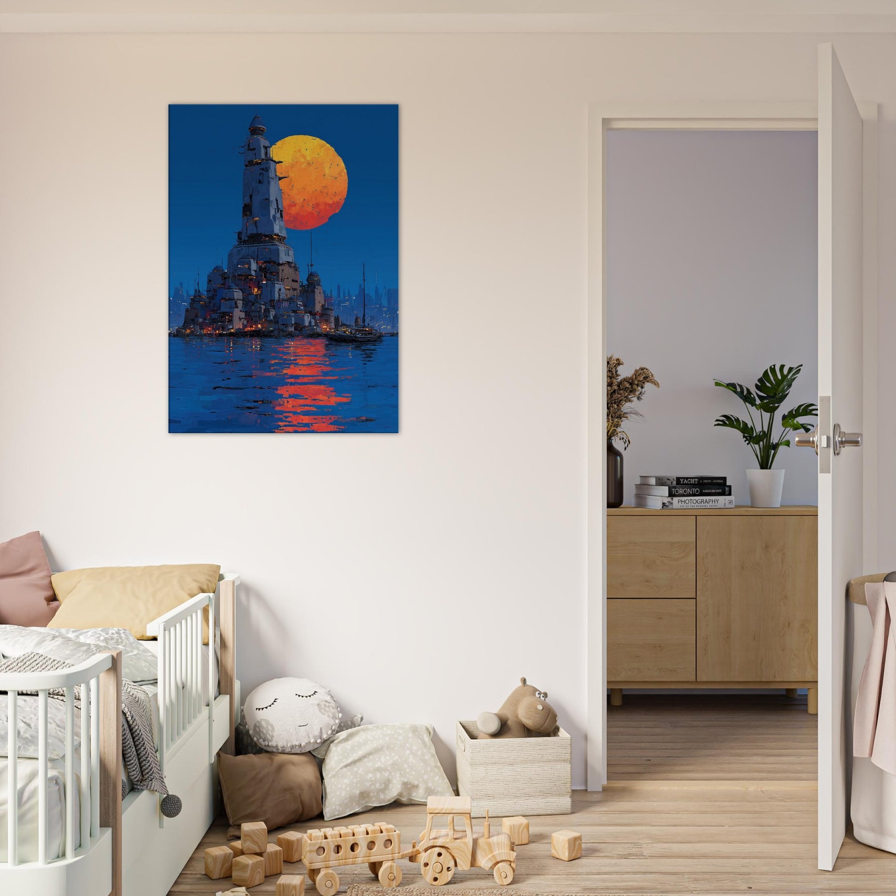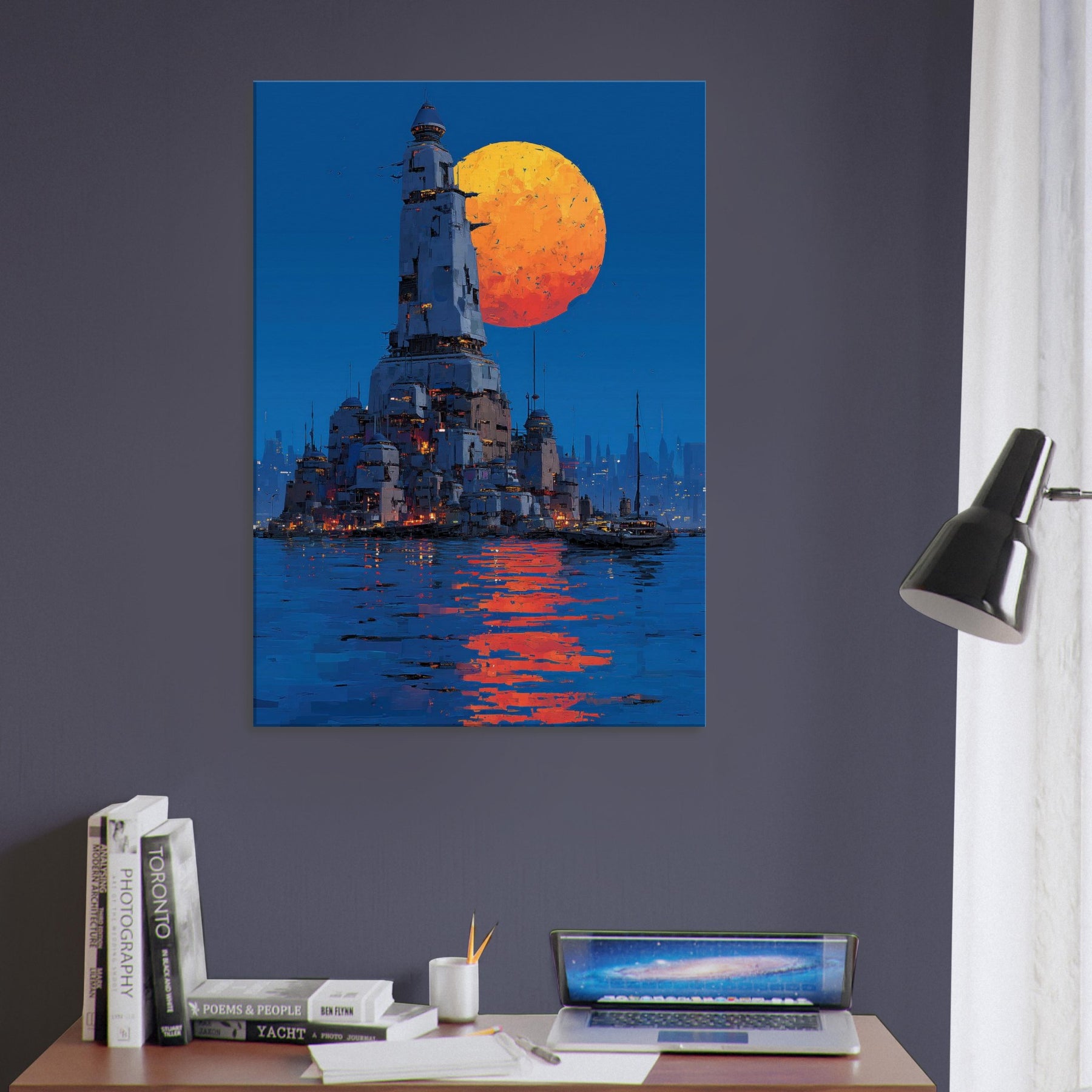 As the Primary Subject, Floating City, a fantastical skyline rises from tranquil waters, painted in a mane of cobalt and sapphire that shifts with every breath of light. The colossal orange sun sinks behind the towers, its warm reflection rippling across the surface like molten glass. This abstract composition bathes a room in twilight hush perfect for a living room or study infusing quiet wonder, mythic scale, and a serene, dreamlike energy that invites conversation and slow, lingering attention.