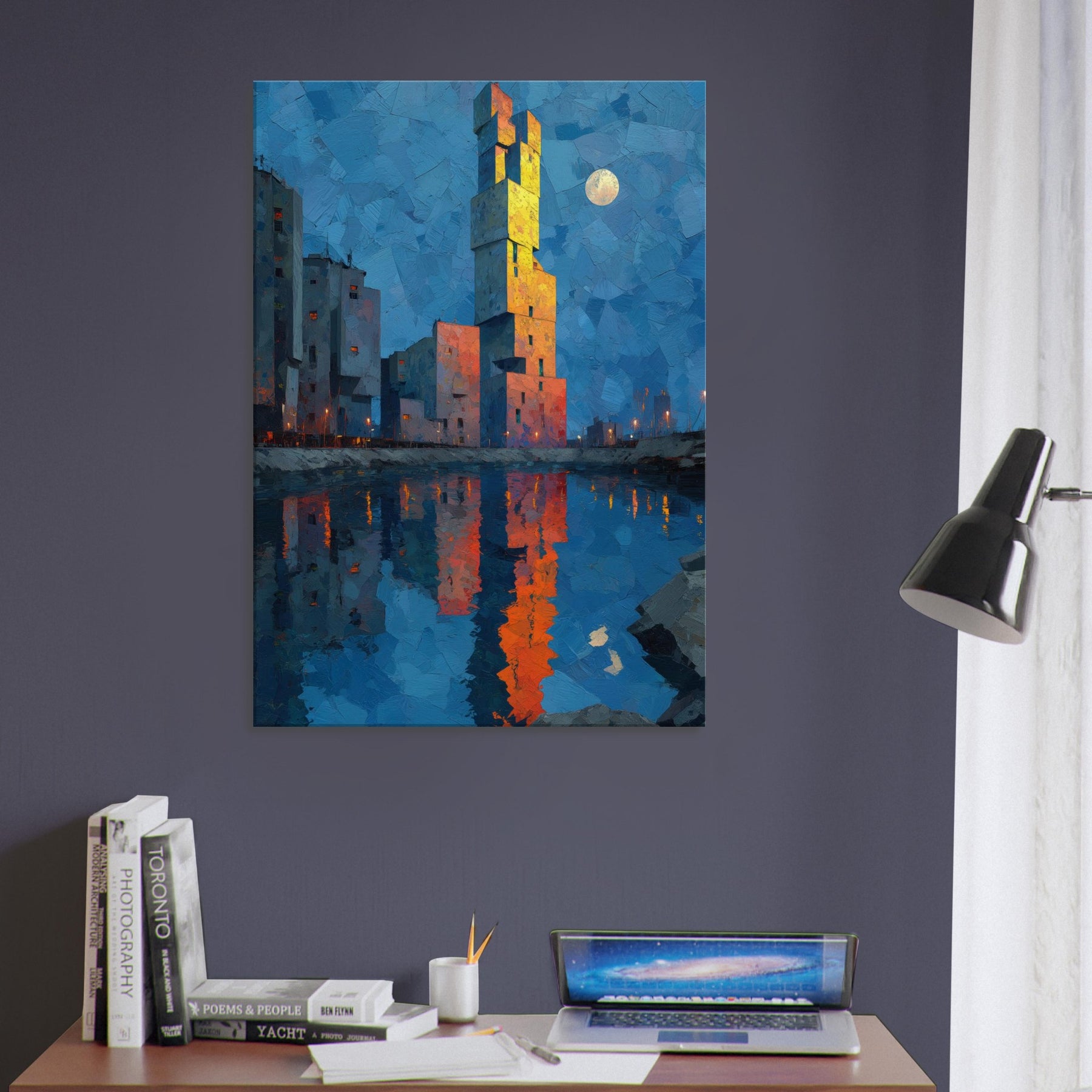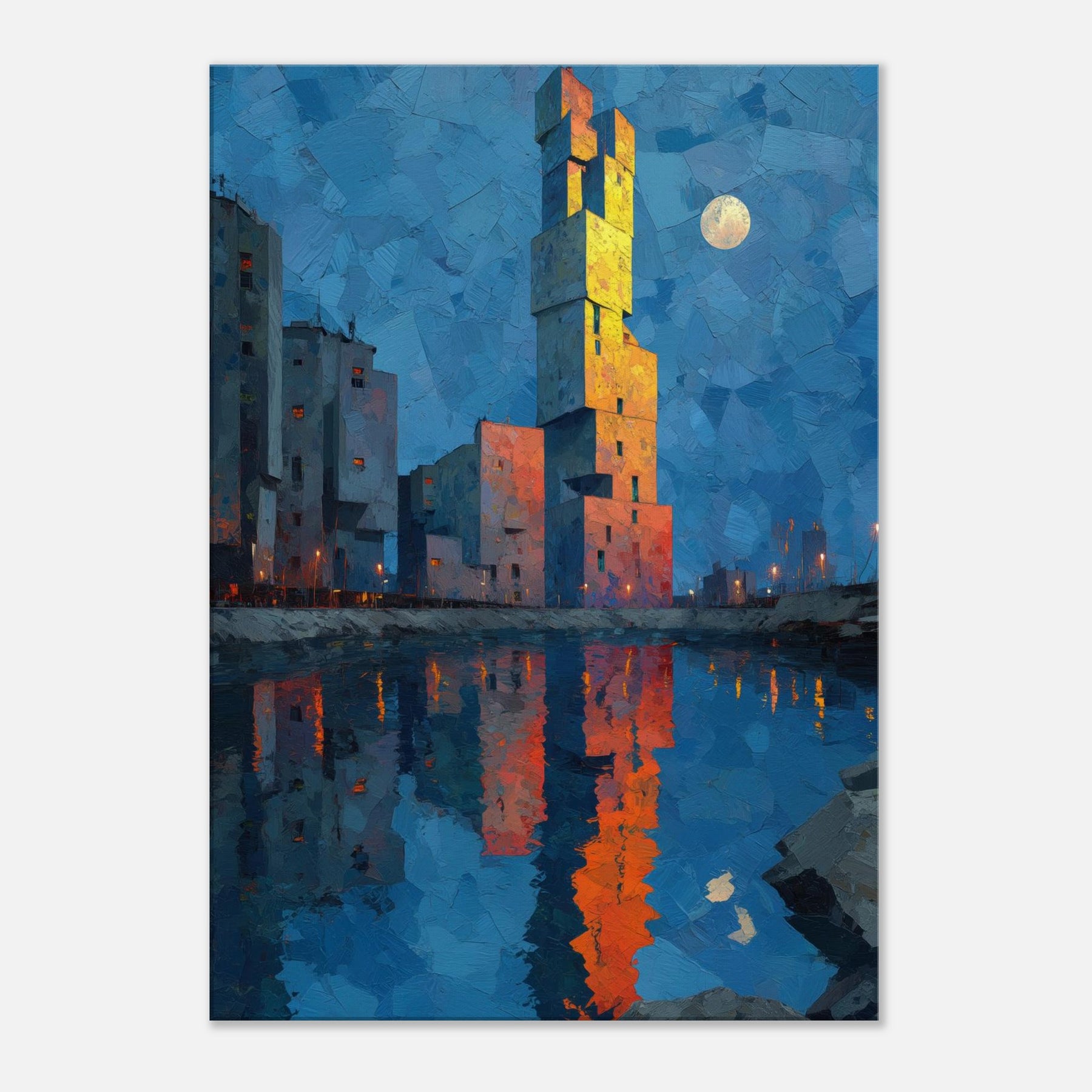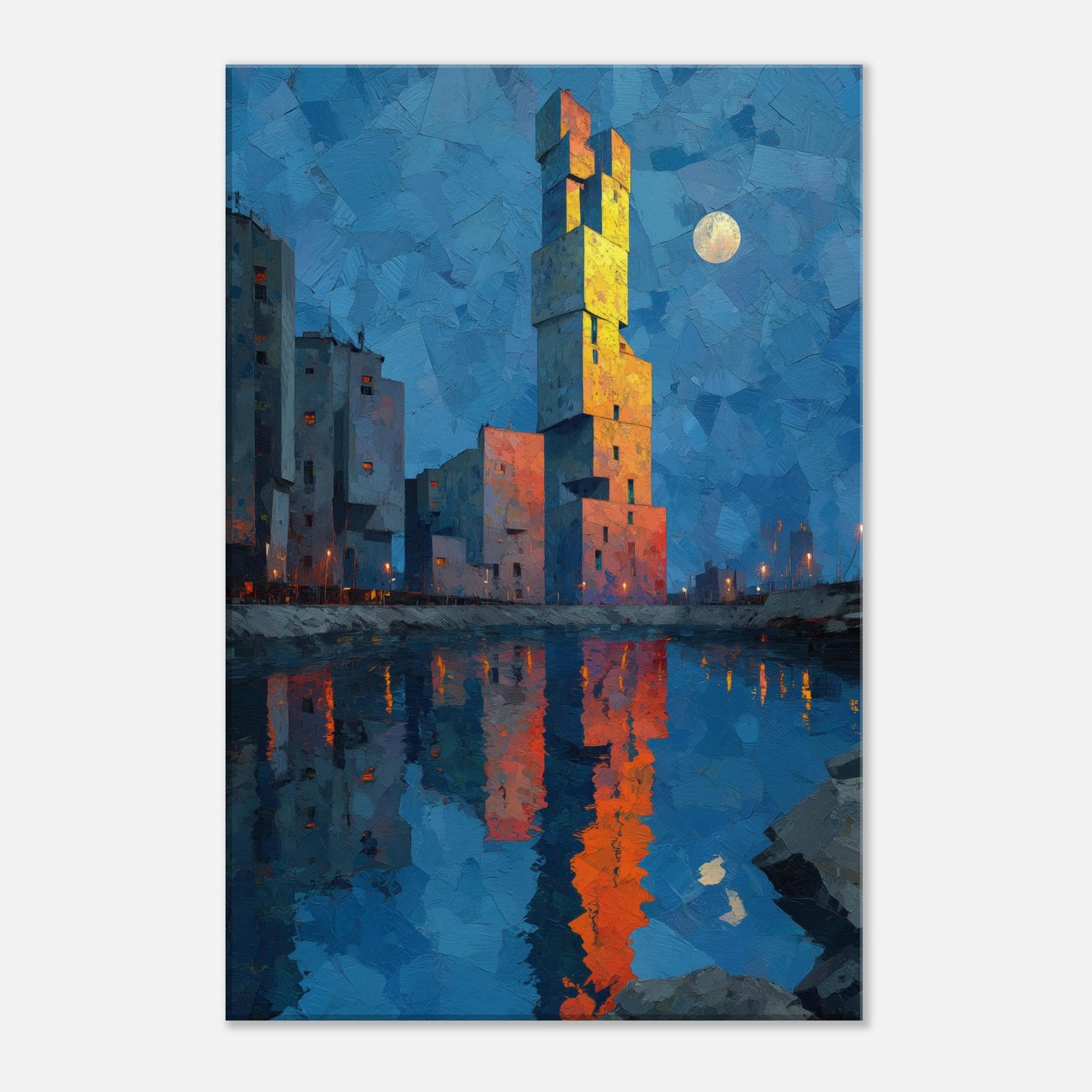 Floating City unfurls above a tranquil blue hour, where a singular tower climbs like a beacon from another realm. The abstract forms glow with sunset orange and gold, mirrored in the harbor's glassy surface, inviting quiet contemplation. This piece bathes your room in a cinematic twilight, dissolving edges between dream and wakefulness. It harmonizes cool blues with warm, electric accents, creating a focal point that feels both nautical and mythic. Hang it in a living space to spark imagination, conversation, and a serene, otherworldly glow.