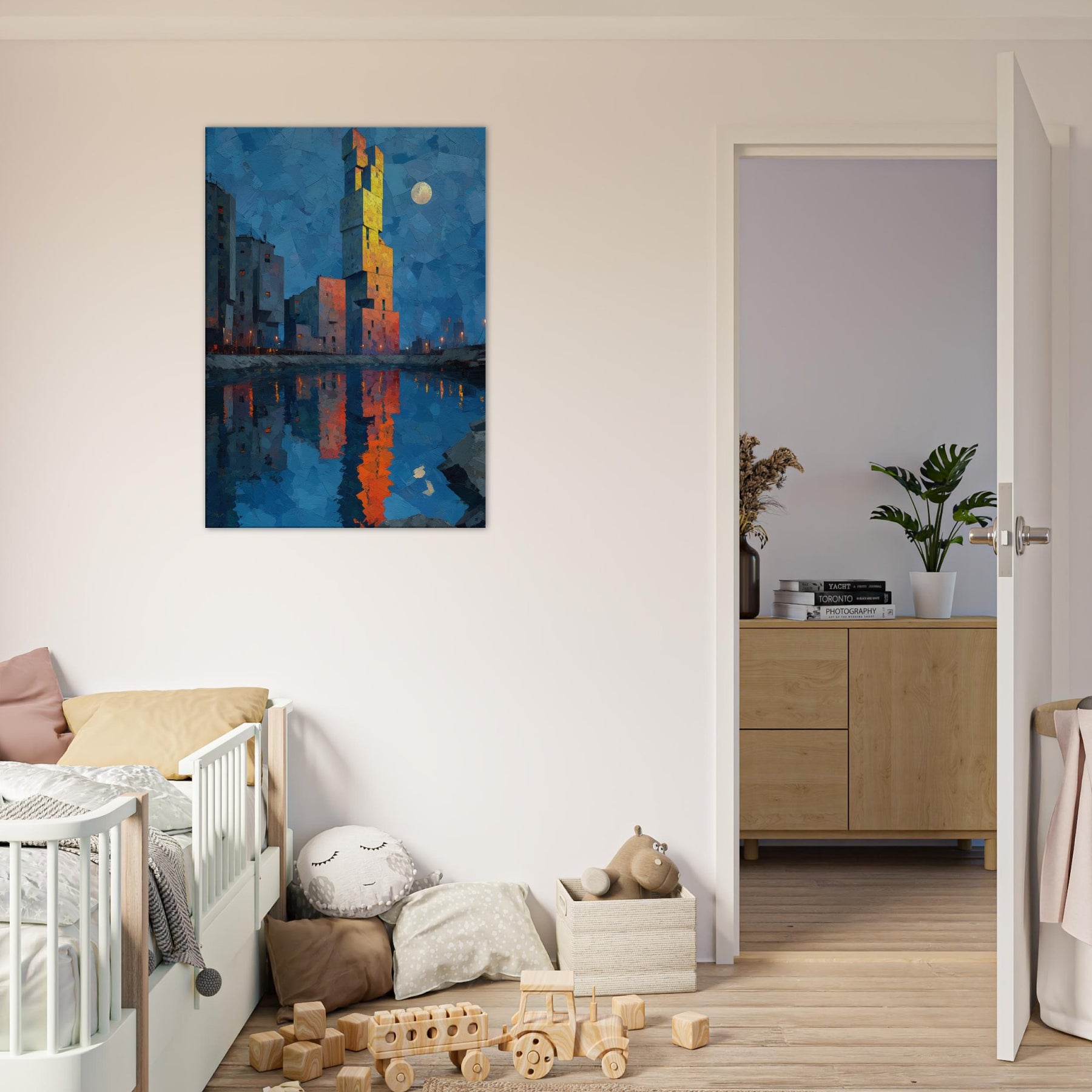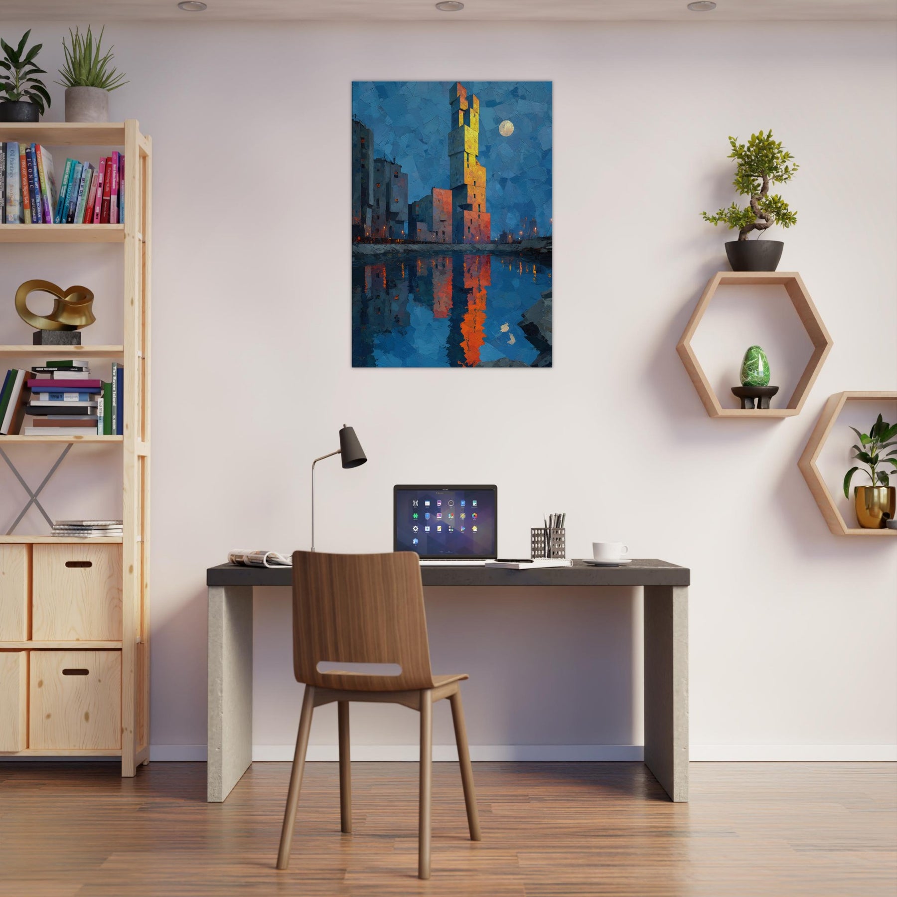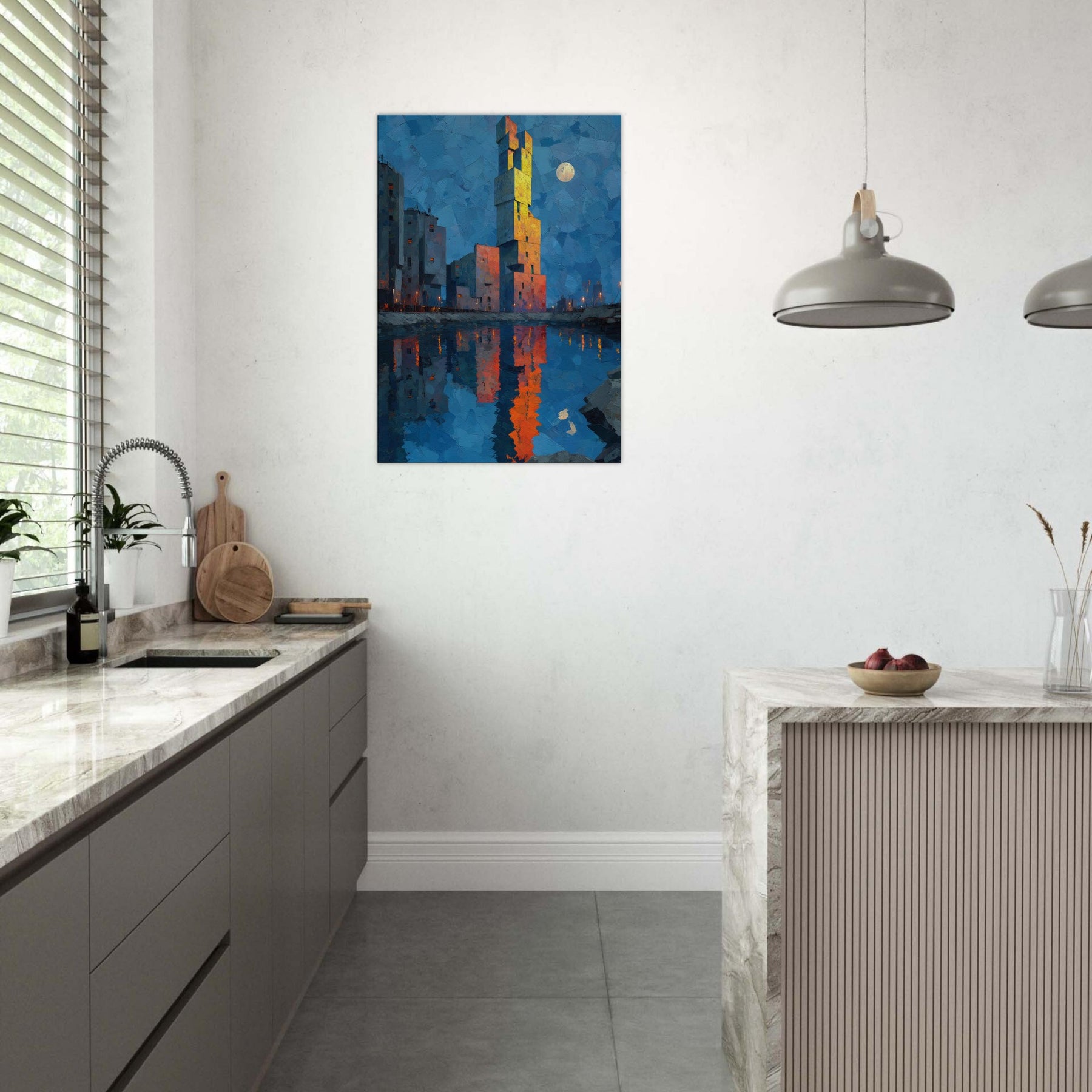 Floating City unfurls above a tranquil blue hour, where a singular tower climbs like a beacon from another realm. The abstract forms glow with sunset orange and gold, mirrored in the harbor's glassy surface, inviting quiet contemplation. This piece bathes your room in a cinematic twilight, dissolving edges between dream and wakefulness. It harmonizes cool blues with warm, electric accents, creating a focal point that feels both nautical and mythic. Hang it in a living space to spark imagination, conversation, and a serene, otherworldly glow.
