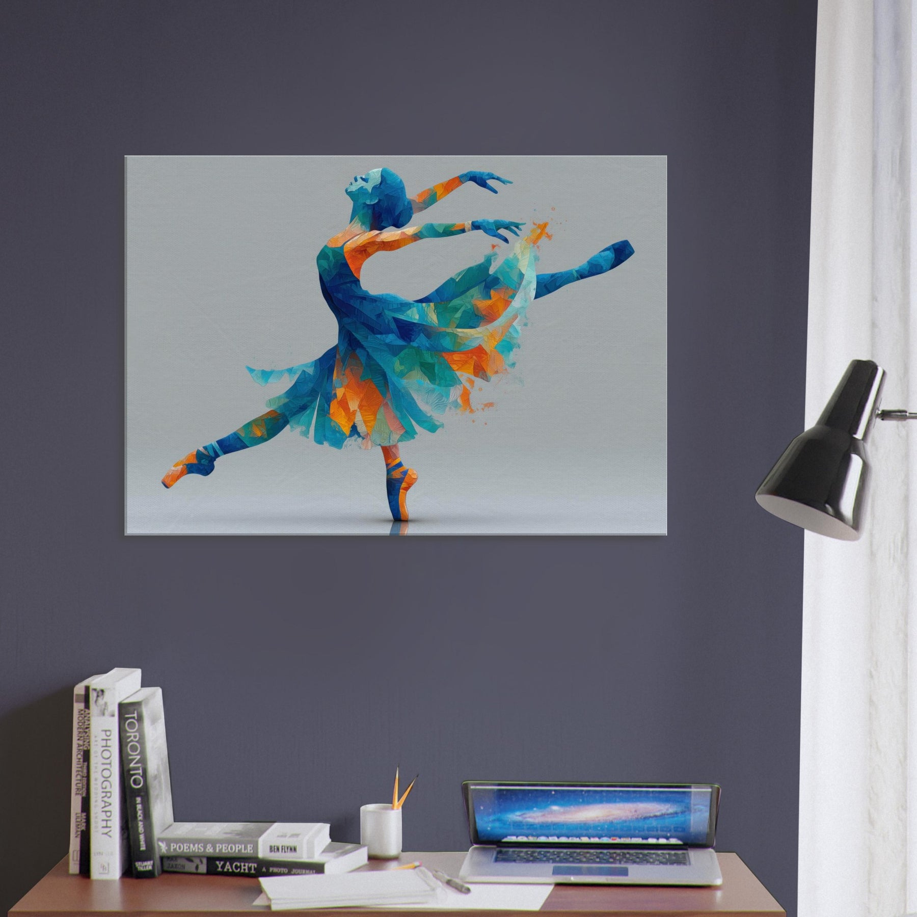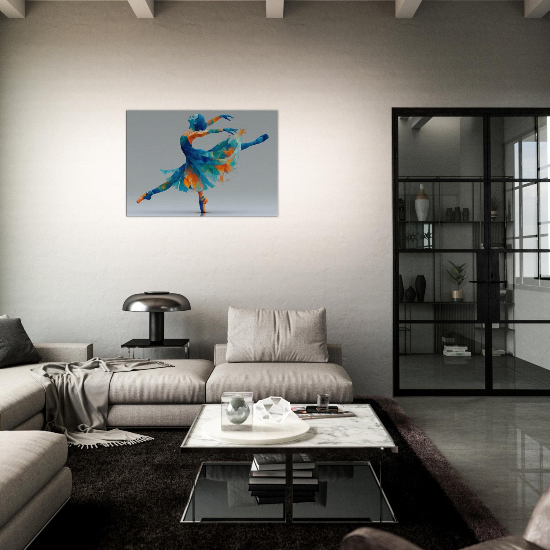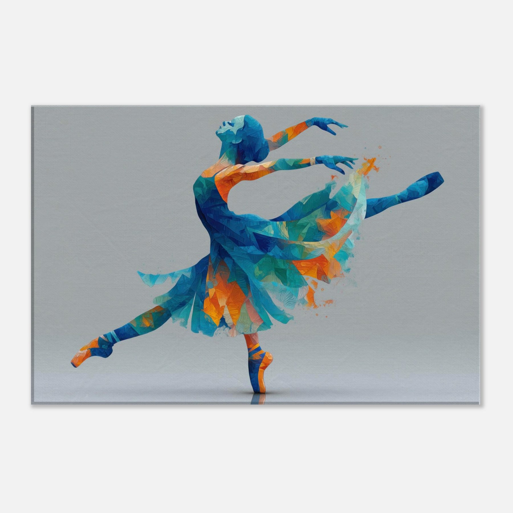 This piece centers on the Ballerina Silhouette, a dynamic figure carved from color and light. Abstract facets of blue, turquoise, and warm orange converge into a graceful arc, capturing a moment of leap and stillness alike. The painterly geometry feels airy and luminous, inviting soft reflections and a sense of motion in space. Perfect for a living room or studio, it transforms a wall into a quiet stage where elegance, energy, and memory mingle to elevate everyday moments.