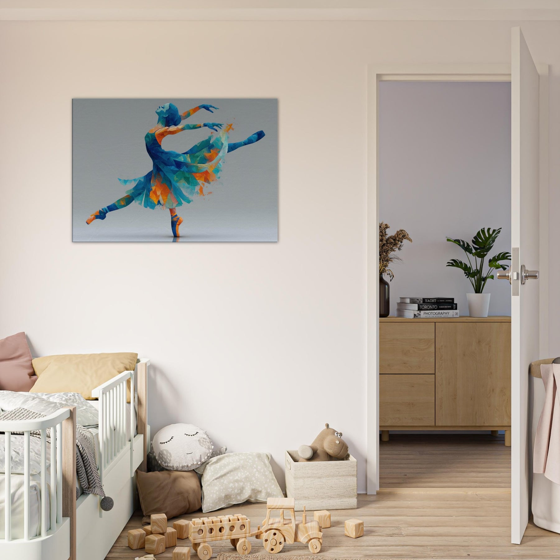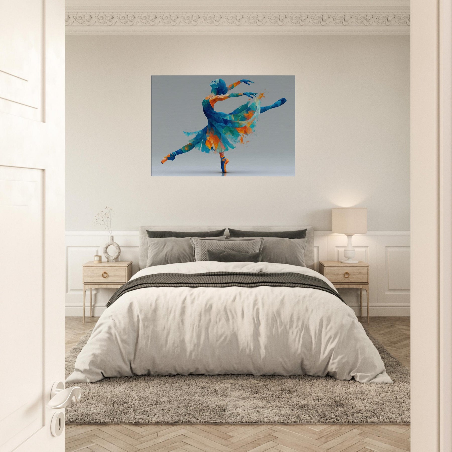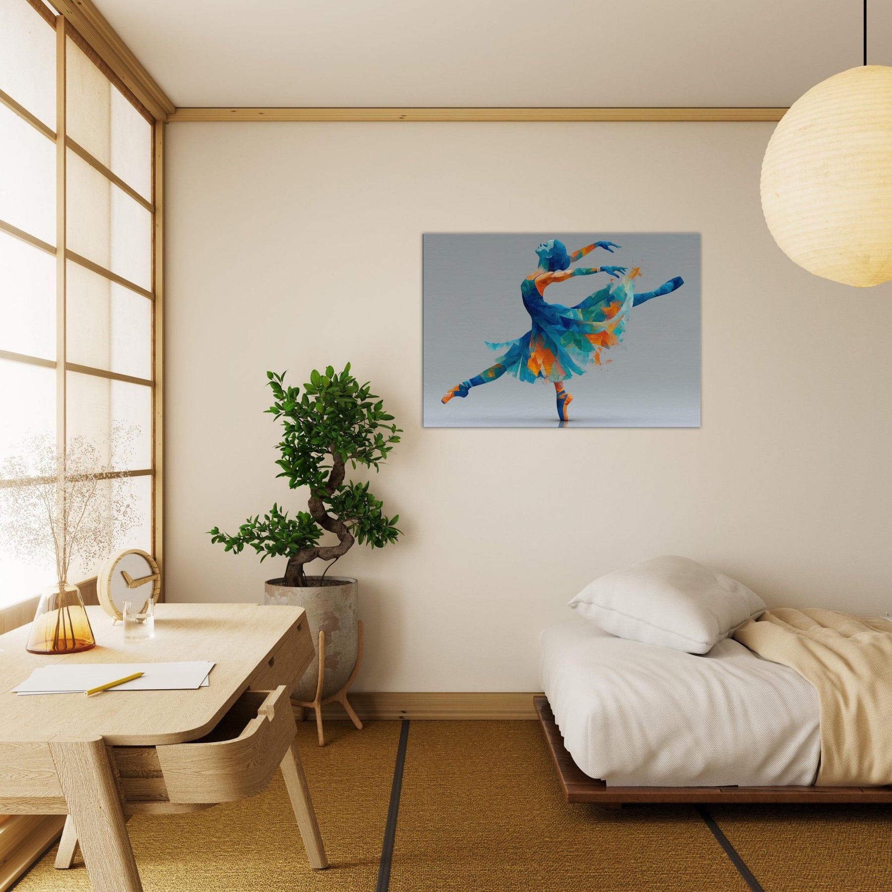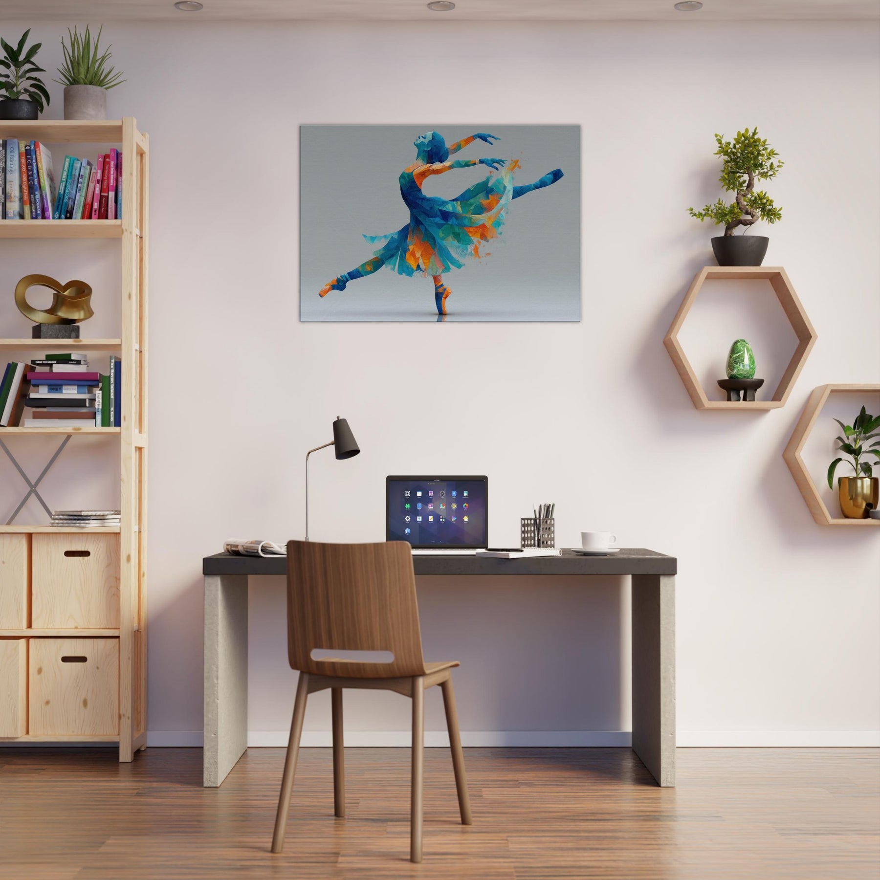 This piece centers on the Ballerina Silhouette, a dynamic figure carved from color and light. Abstract facets of blue, turquoise, and warm orange converge into a graceful arc, capturing a moment of leap and stillness alike. The painterly geometry feels airy and luminous, inviting soft reflections and a sense of motion in space. Perfect for a living room or studio, it transforms a wall into a quiet stage where elegance, energy, and memory mingle to elevate everyday moments.
