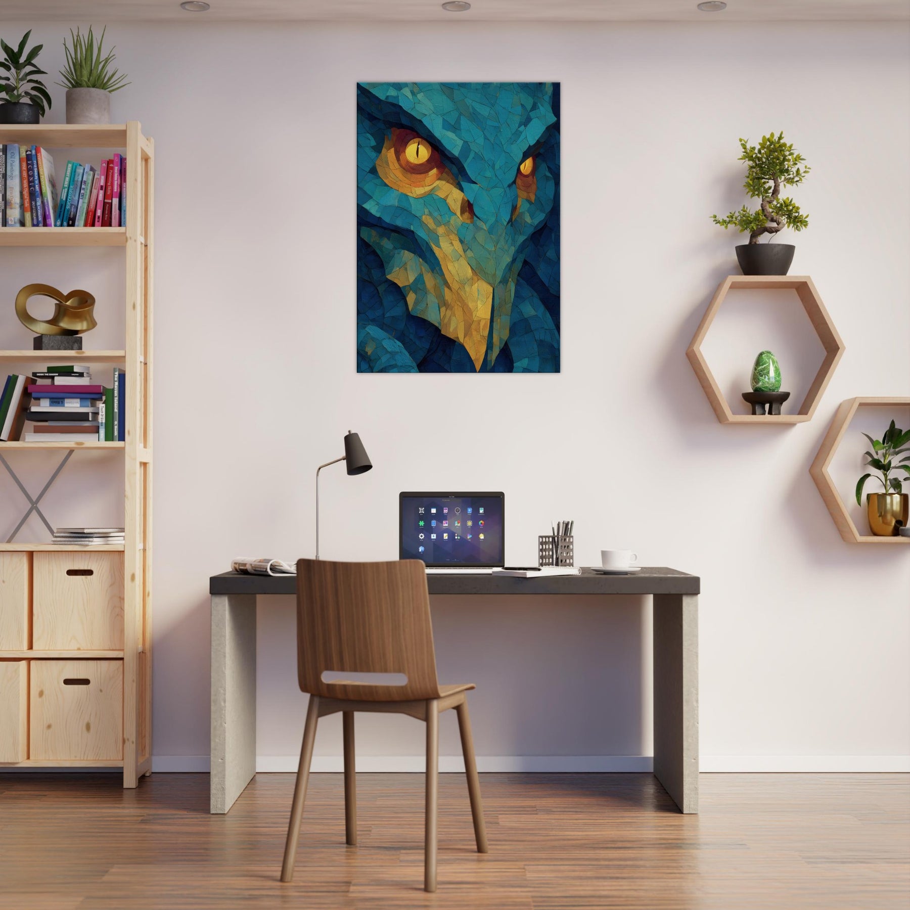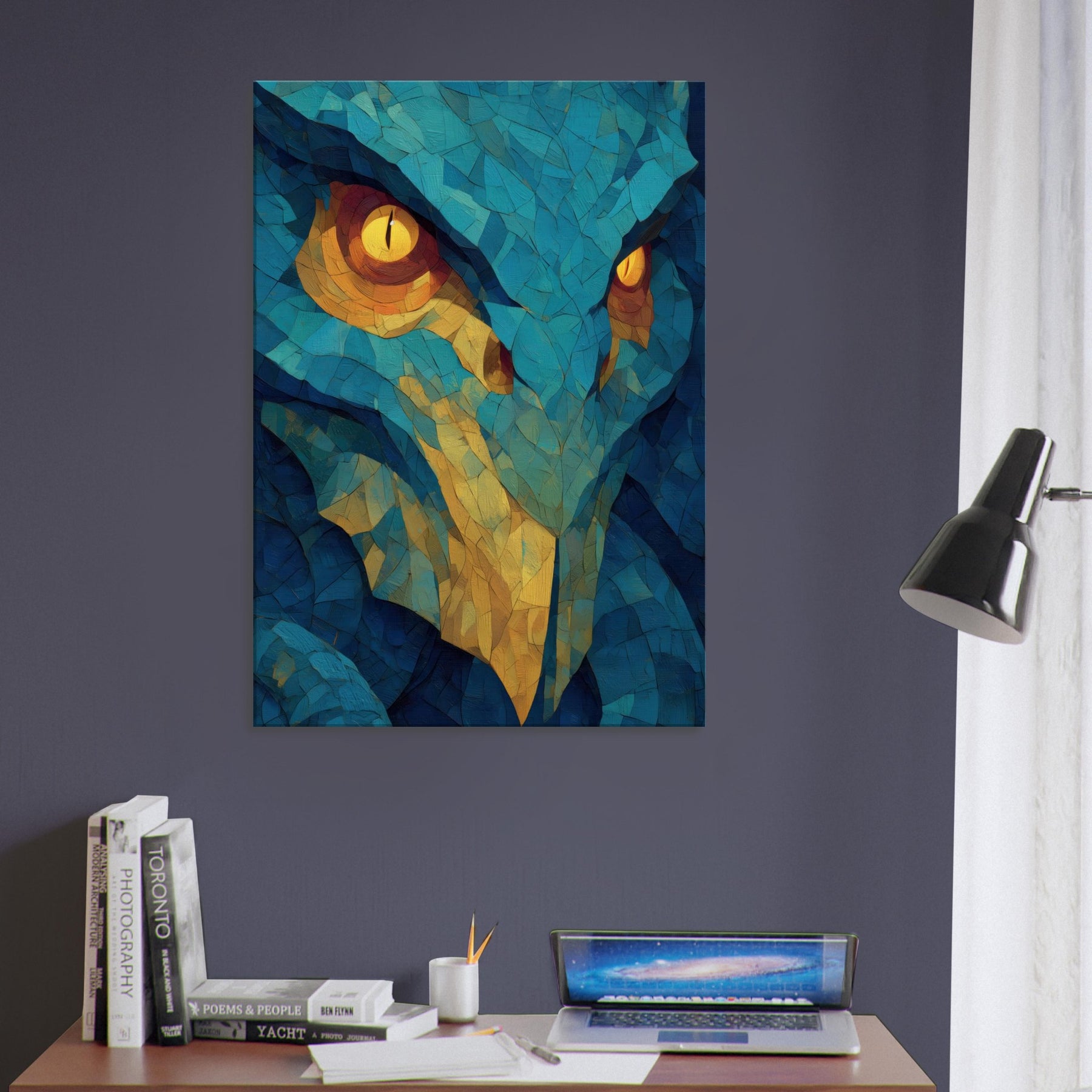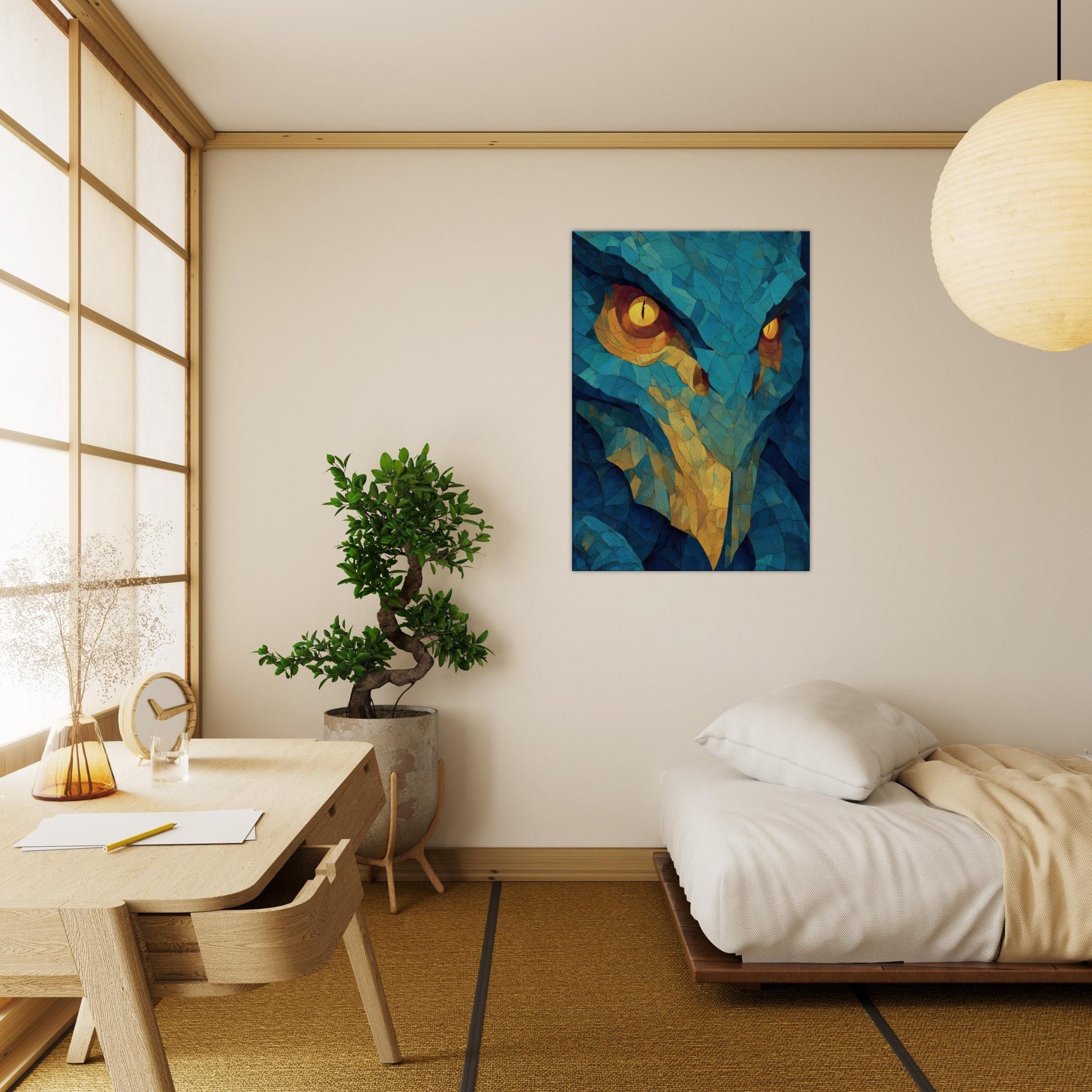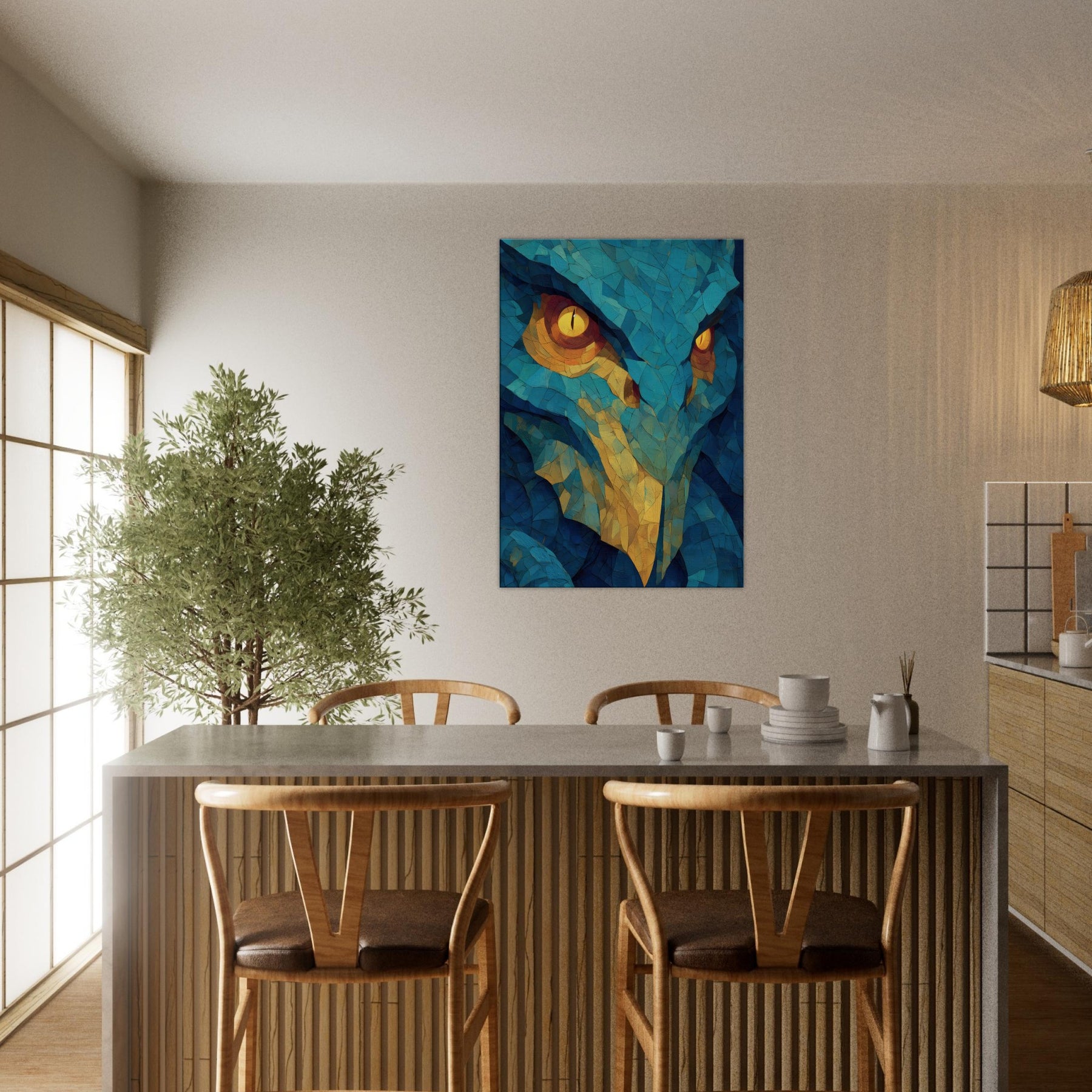 Let this Kraken emerge from the deep, a creature of shadow and light rendered in jewel toned facets. The painting blends ocean blues with ember gold hints, guiding the eye toward its piercing, amber gaze. It envelops a space in myth and movement, turning a wall into a harbor of imagination and calm. The Kraken anchors the room with a fearless fantasy, while the abstract geometry and luminous color create texture you can feel soft as sea spray, warm as a sunset, perfect for a living room or study seeking quiet drama.
