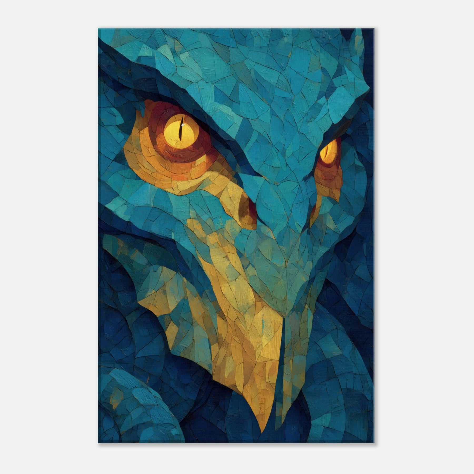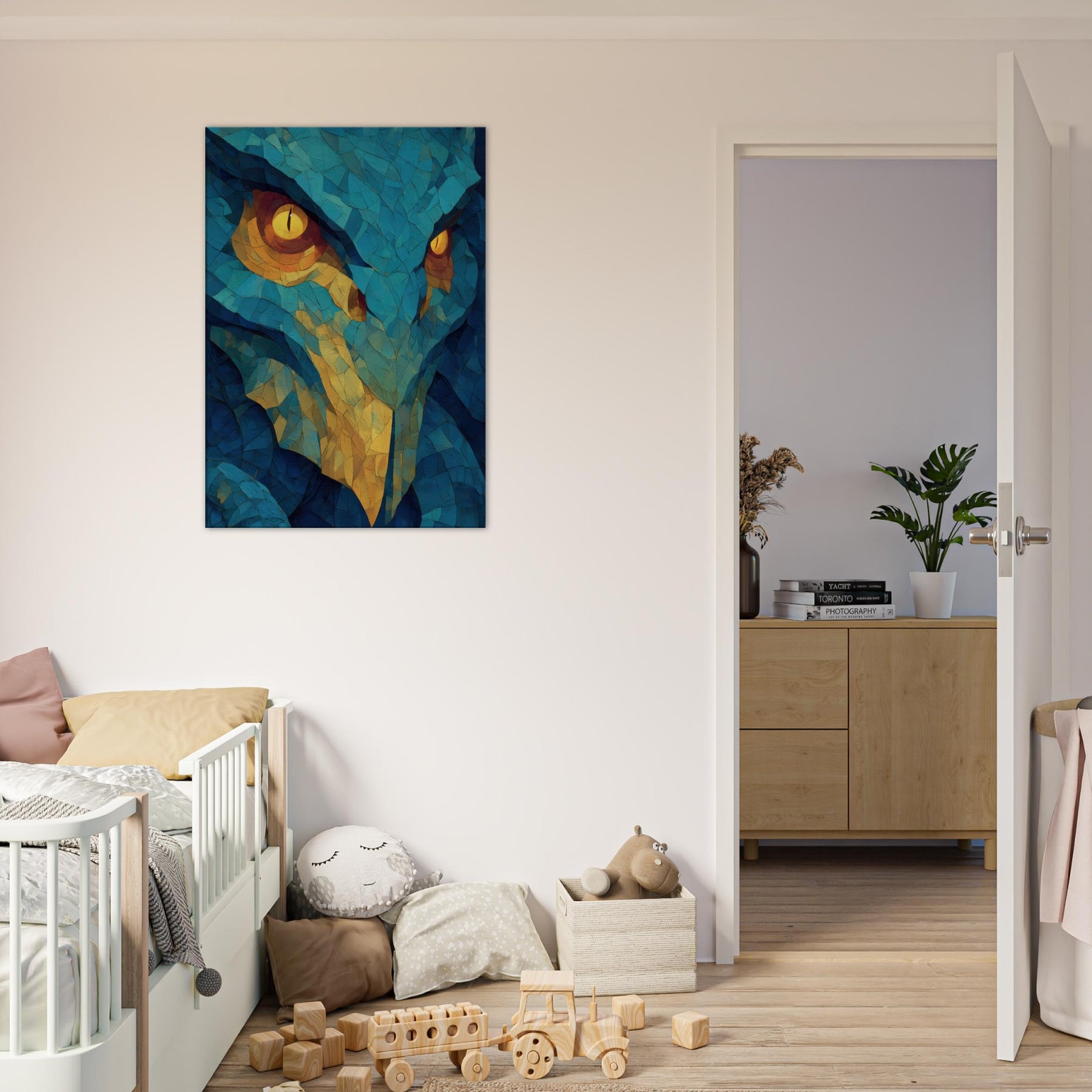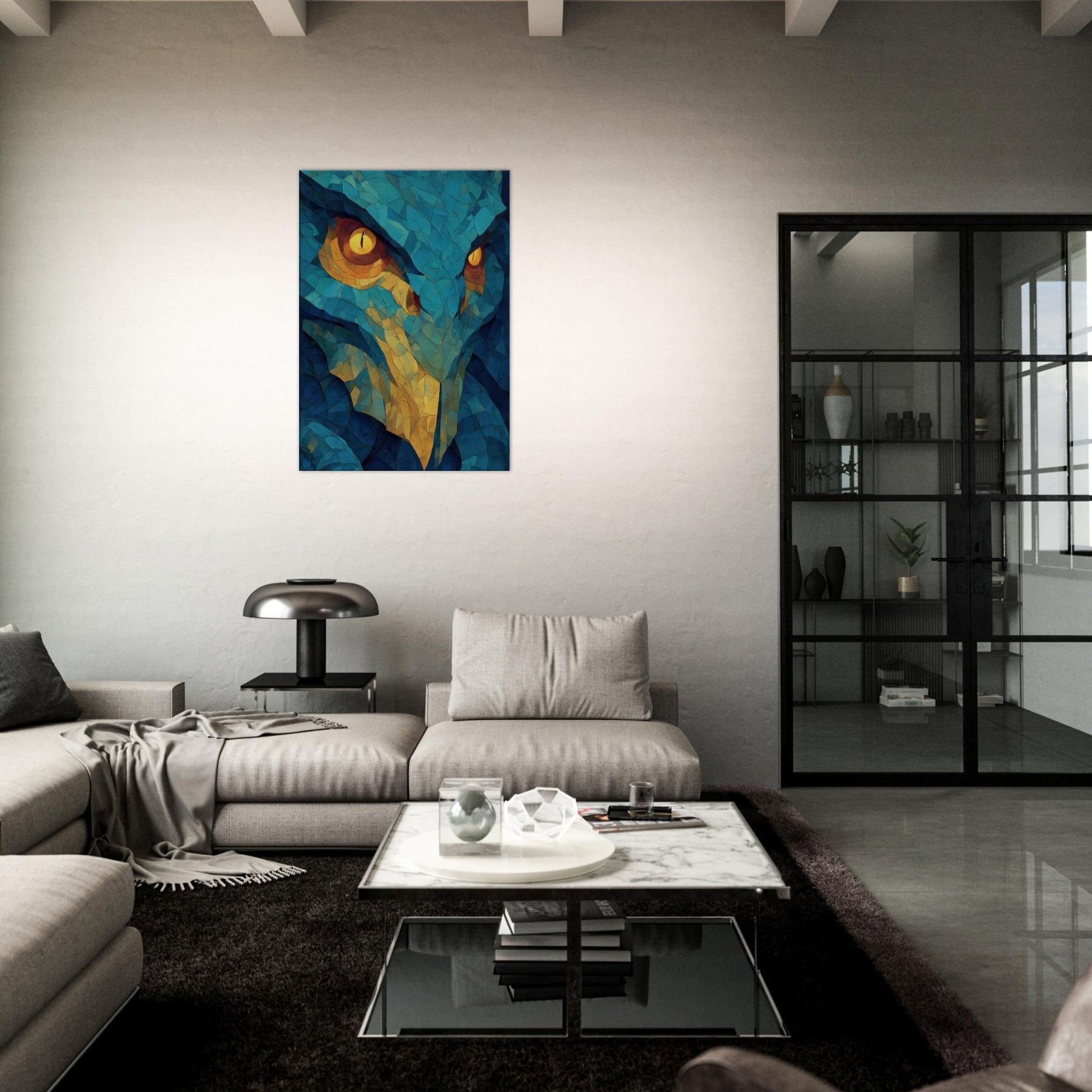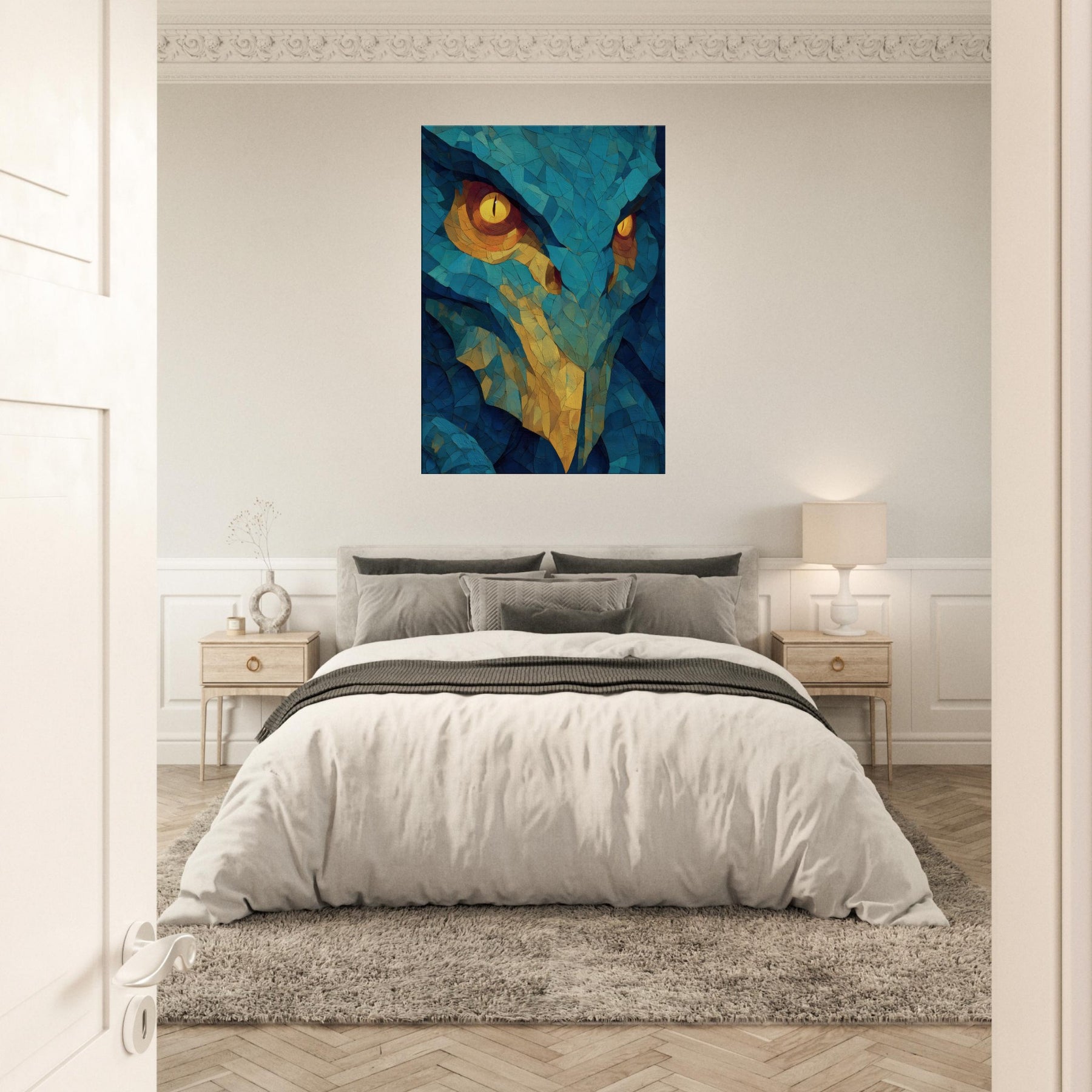 Let this Kraken emerge from the deep, a creature of shadow and light rendered in jewel toned facets. The painting blends ocean blues with ember gold hints, guiding the eye toward its piercing, amber gaze. It envelops a space in myth and movement, turning a wall into a harbor of imagination and calm. The Kraken anchors the room with a fearless fantasy, while the abstract geometry and luminous color create texture you can feel soft as sea spray, warm as a sunset, perfect for a living room or study seeking quiet drama.
