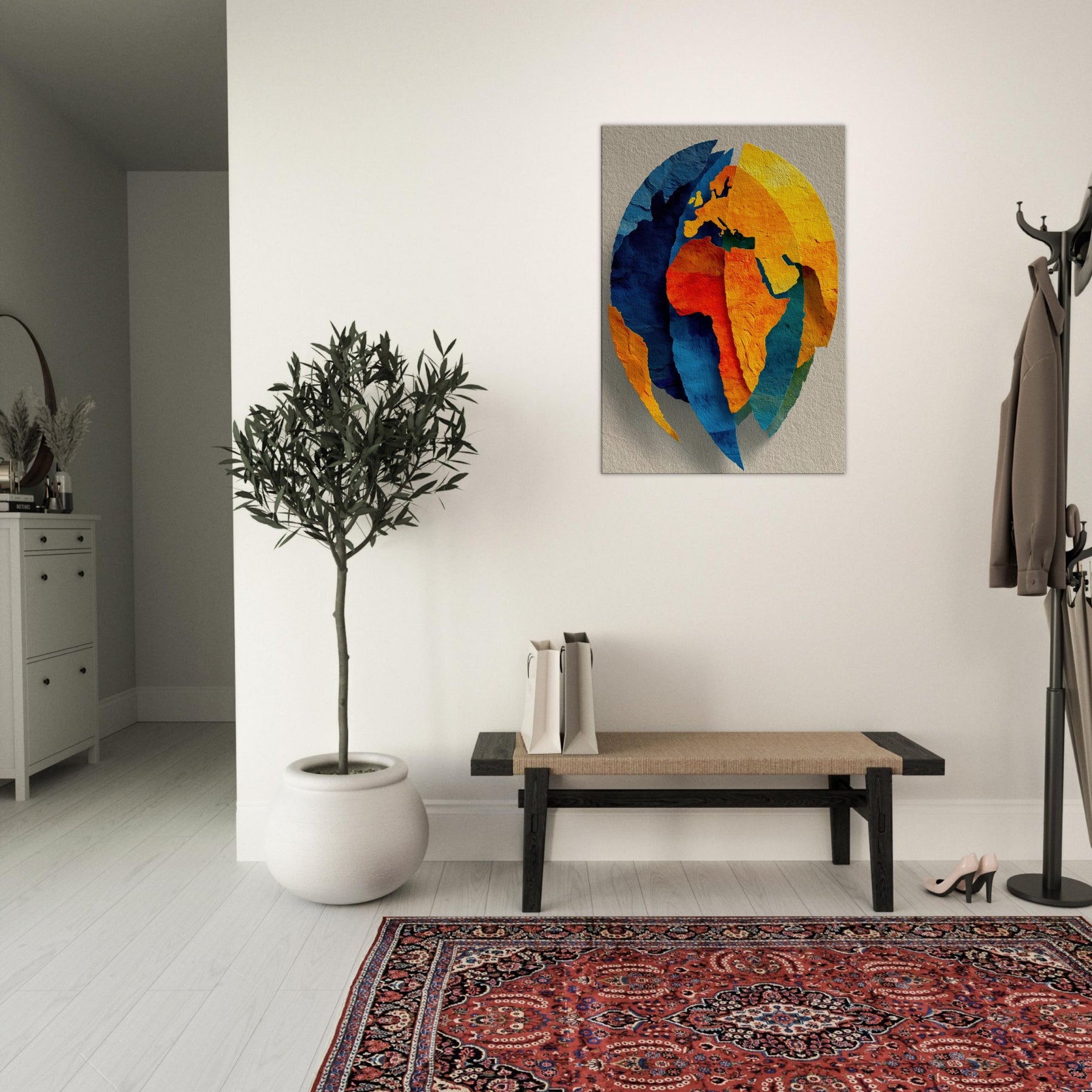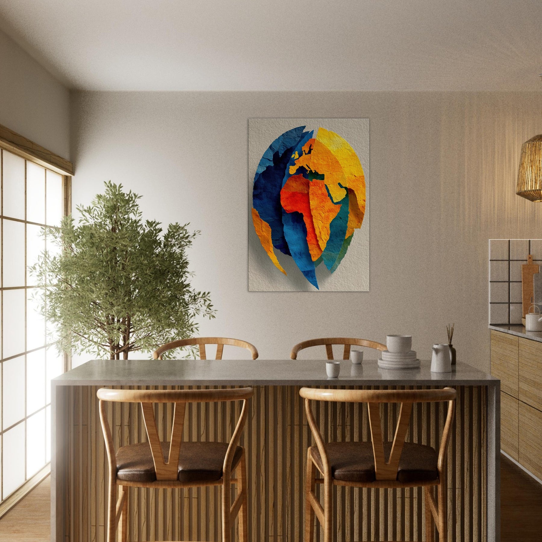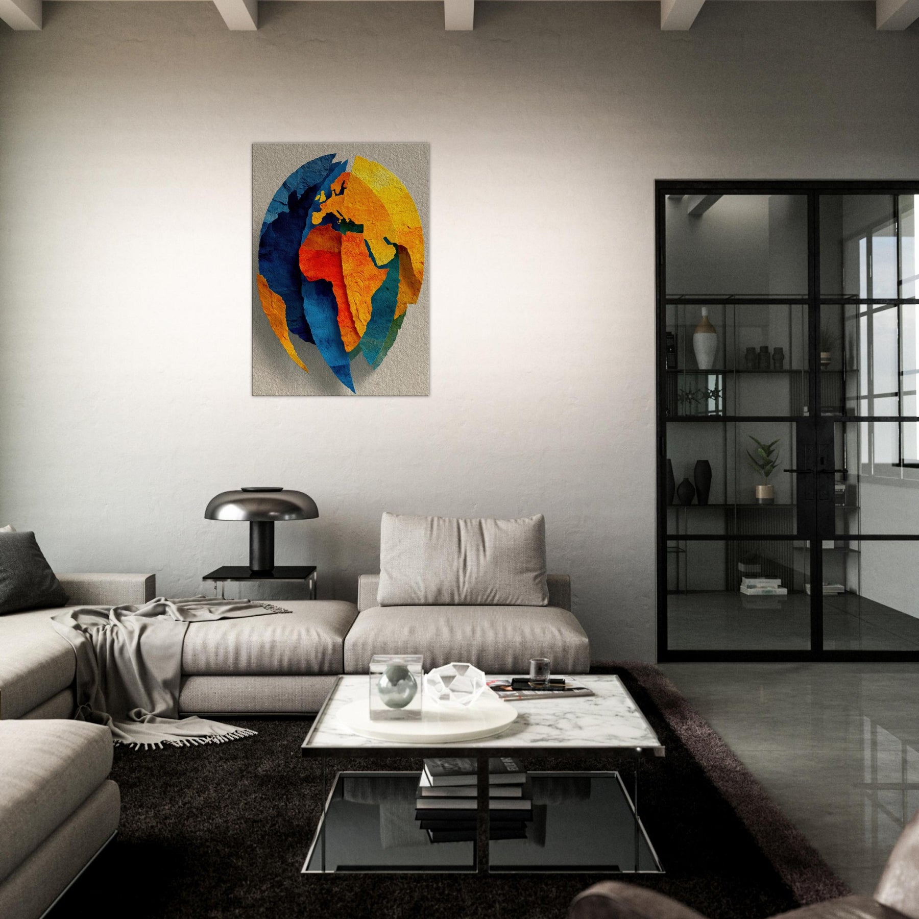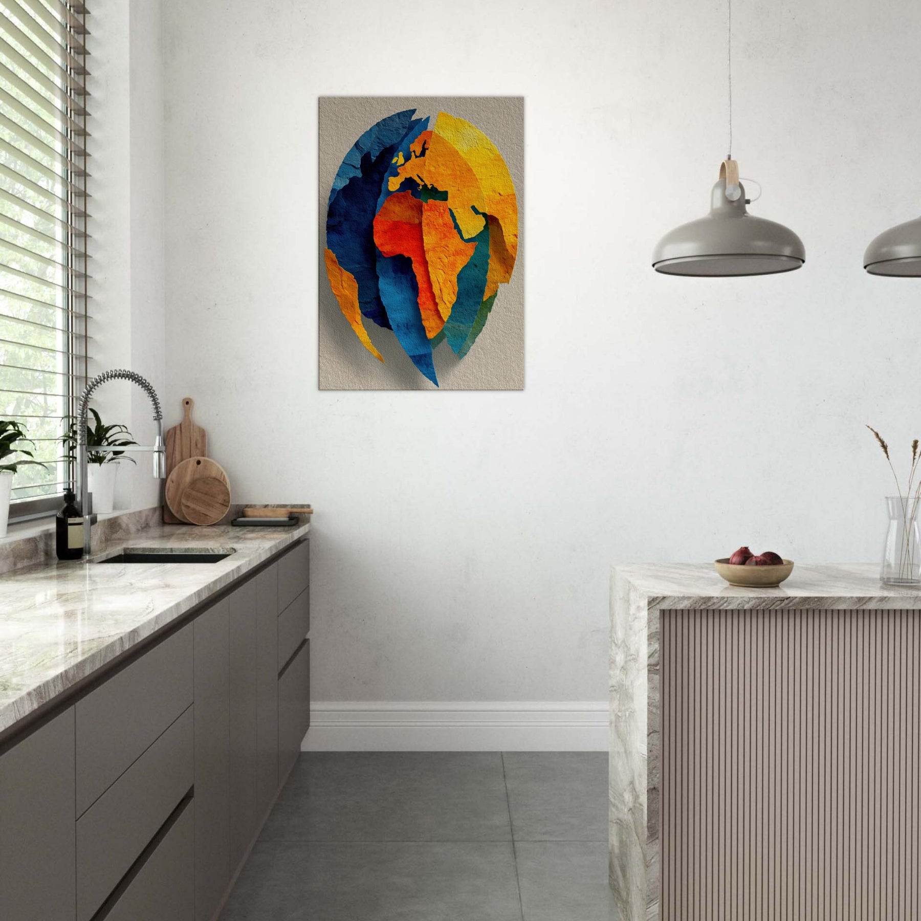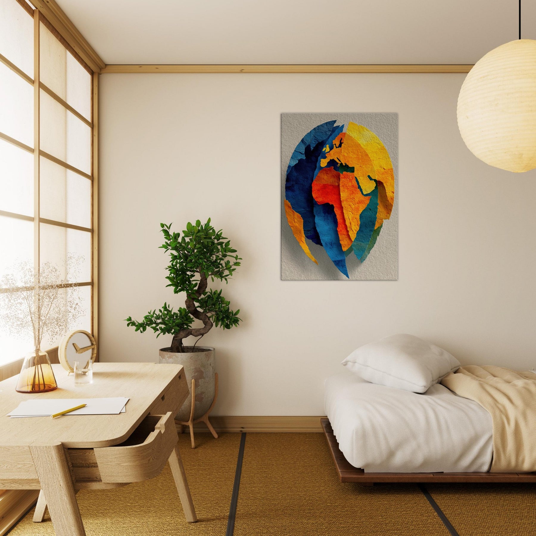 Globe Silhouette unfolds in a marriage of color and shadow, each torn layer revealing a new horizon. This abstract inspired composition invites the eye to travel without leaving the room, turning walls into a quiet map of possibility. The Globe Silhouette glows with warm sunset tones and deep ocean blues, bringing depth, texture, and a sense of movement to a living space. Perfect above a sofa or desk, it anchors conversation while softening contemporary interiors with a tactile, sculptural presence.