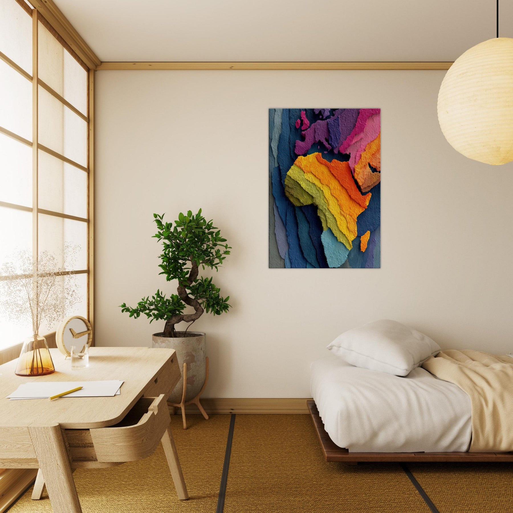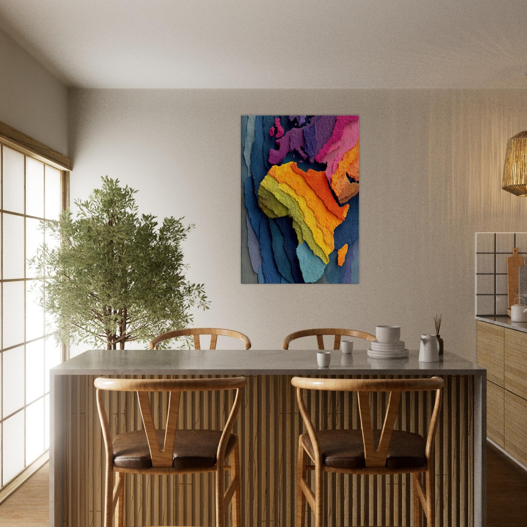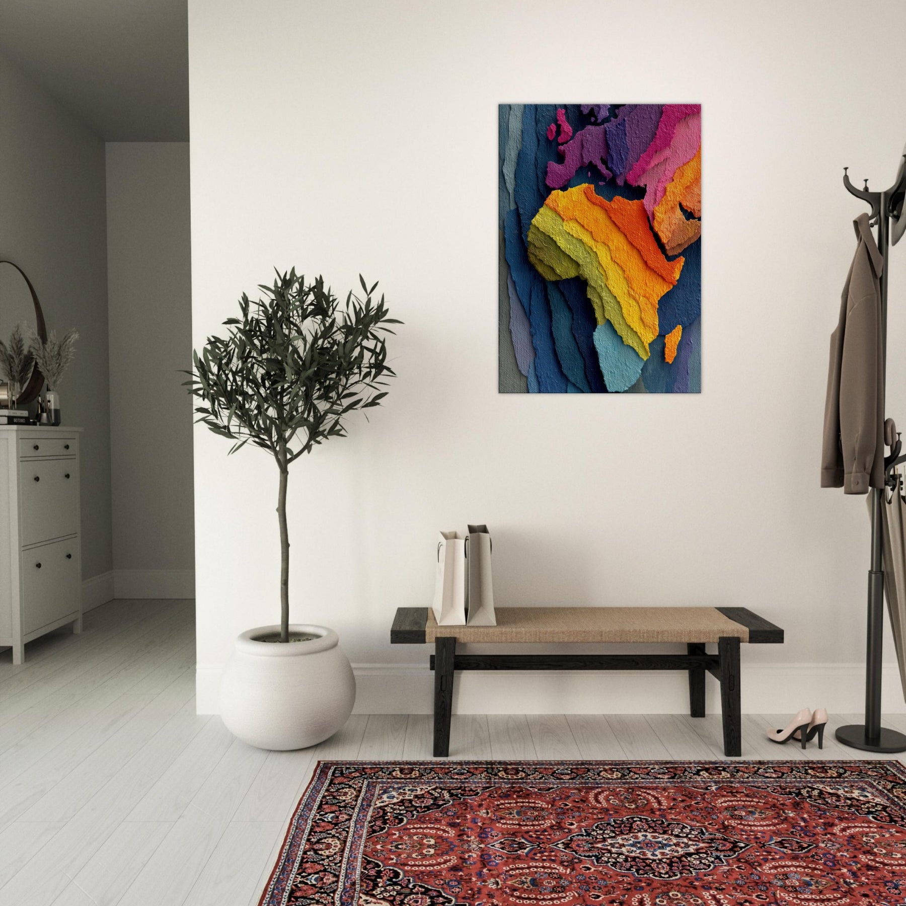 World Map Outline unfurls across your wall in a chorus of color. Layers of texture weave continents in radiant bands, inviting the eye to drift and discover new edges as light shifts. This piece turns a living room into a map of memory, a room where travel meets home. The bold tones emeralds, blues, sunset yellows create warmth while the delicate lines suggest architecture, streets, and skylines. A statement canvas that complements modern interiors with depth, glow, and a sense of possibility.