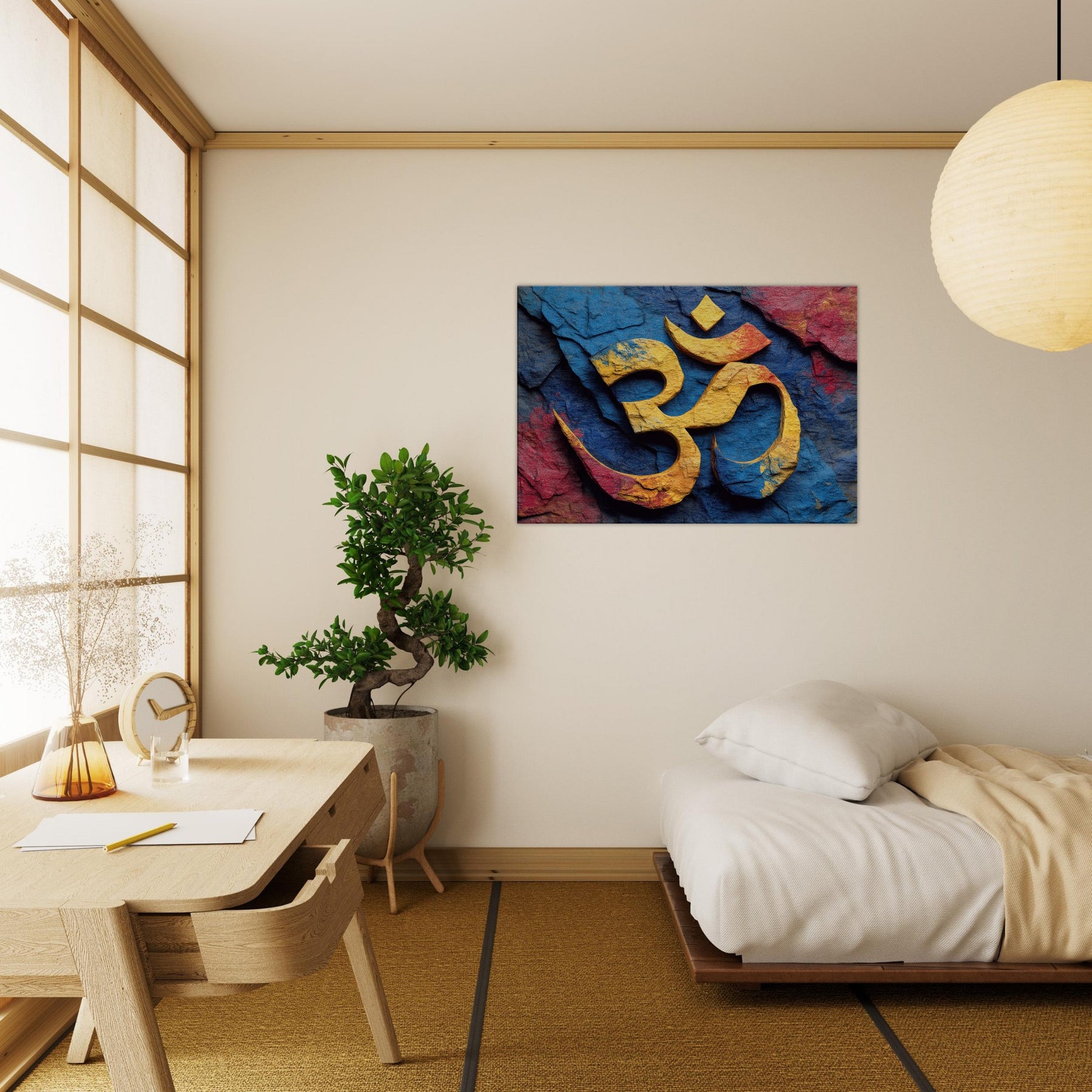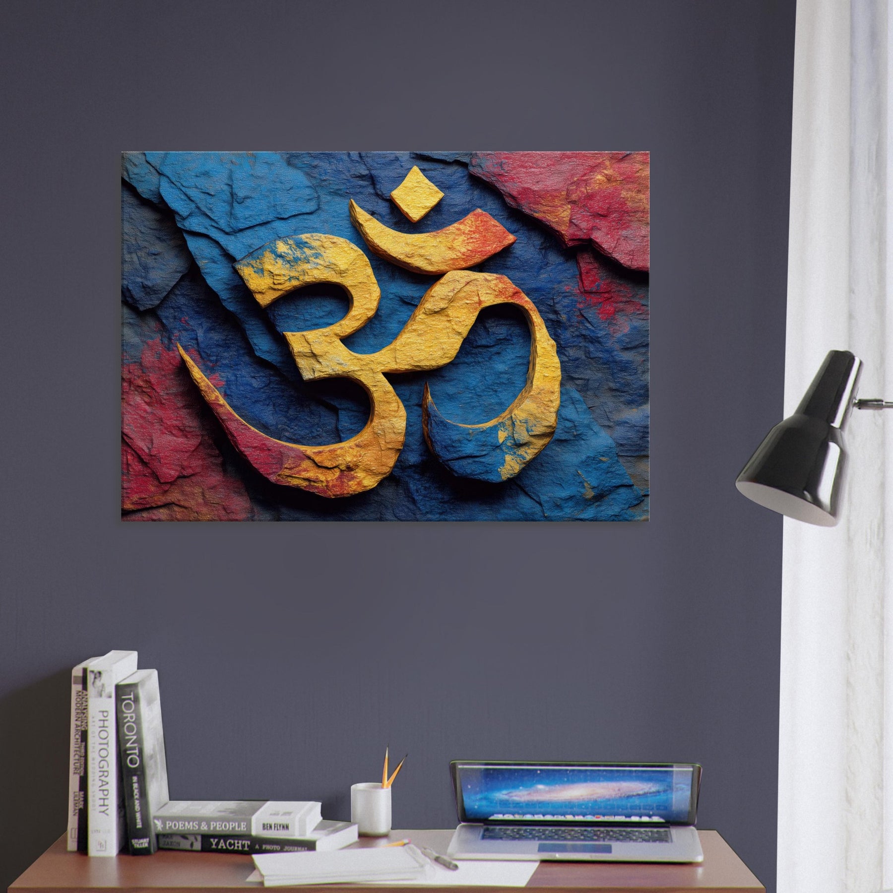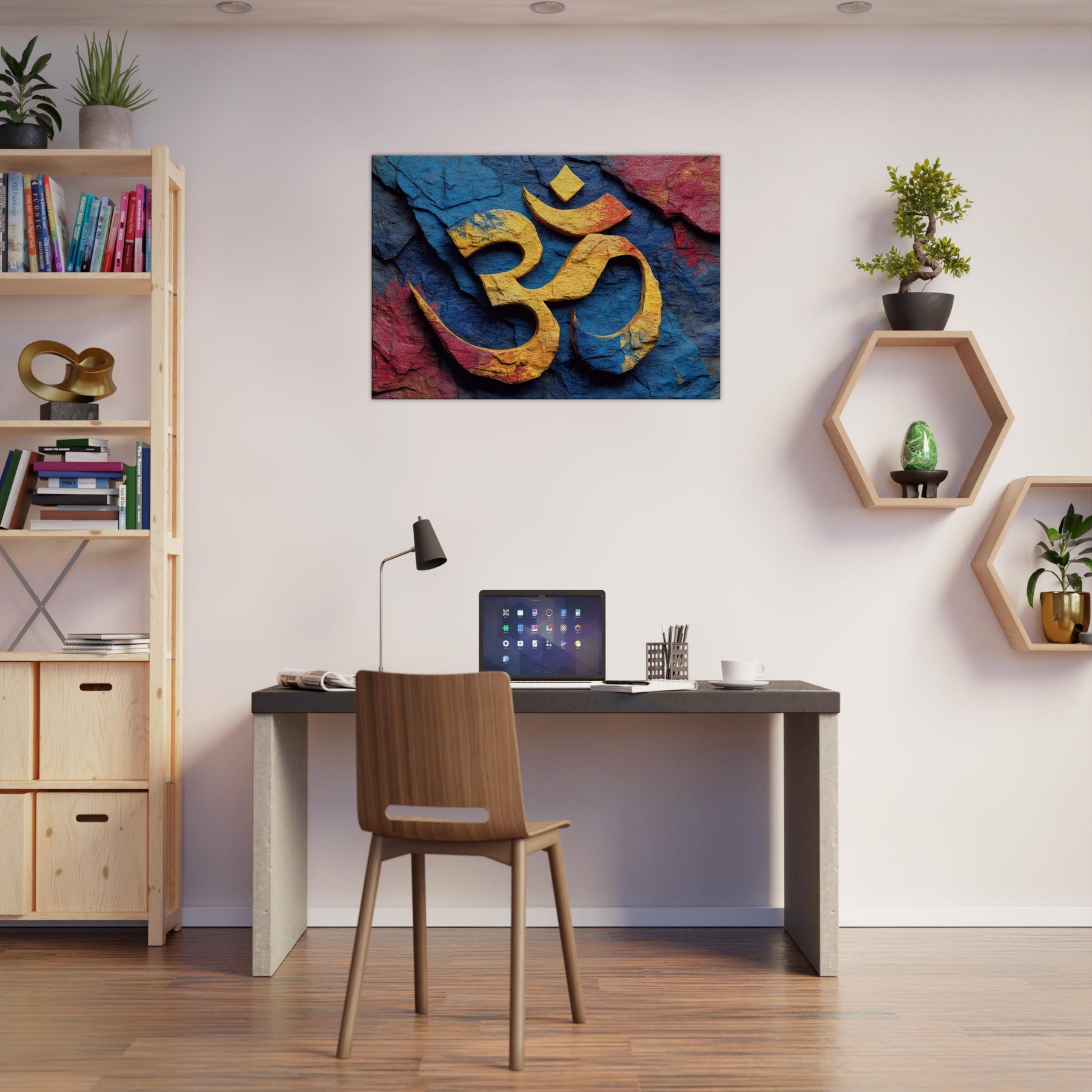 In this enigmatic meditation, the Om unfurls as a molten gold emblem set against a textured sea of cobalt and saffron. The abstract strokes ripple like wind and breath, inviting the room to breathe with you. The surface catches light, shifting from radiant glow to shadowed depth, turning any wall into a sanctuary. Perfect above a sofa or in a quiet hallway, it invites contemplation, softens edges, and makes everyday space feel expansive, sacred, and warmly luminous. The central subject is Om (Aum Symbol).