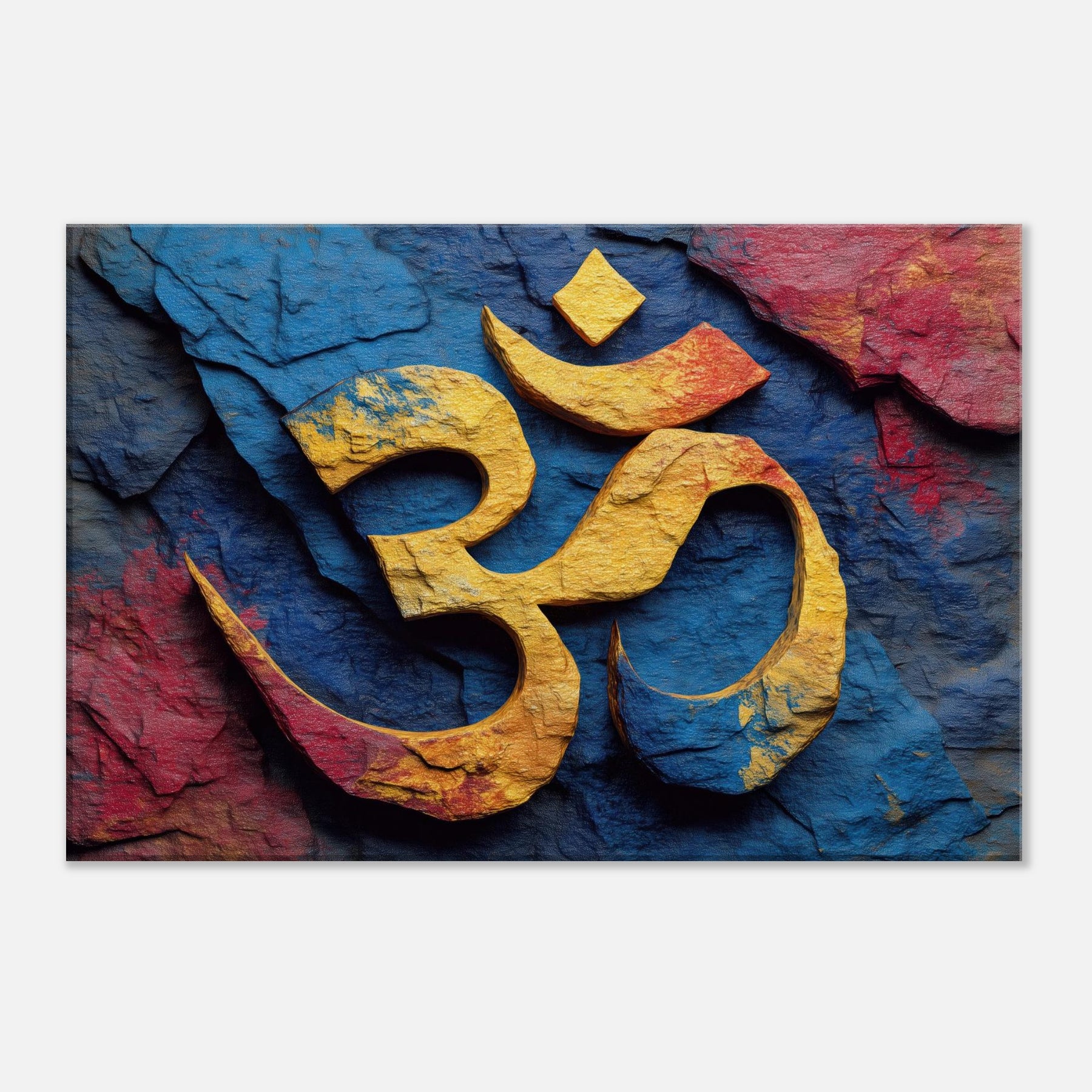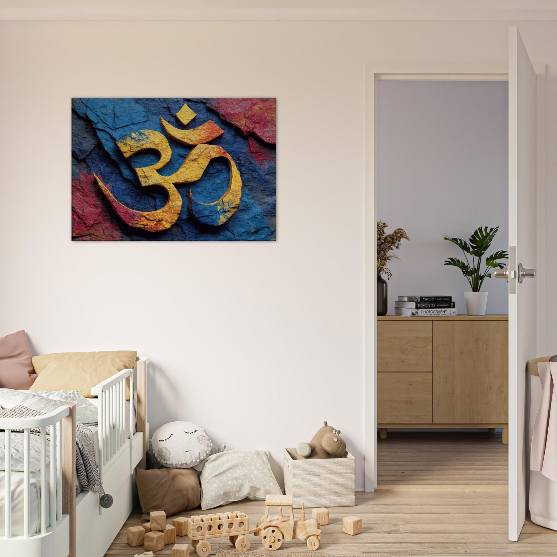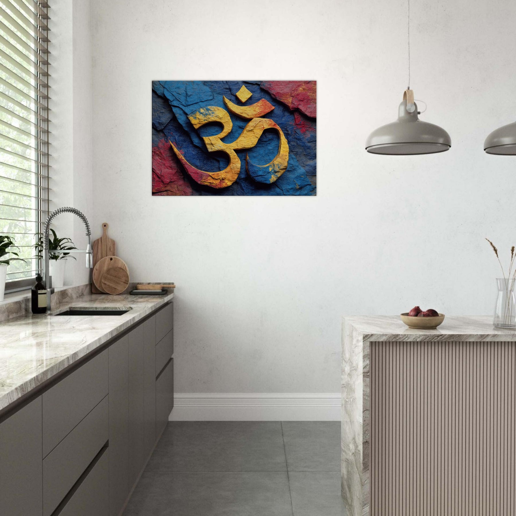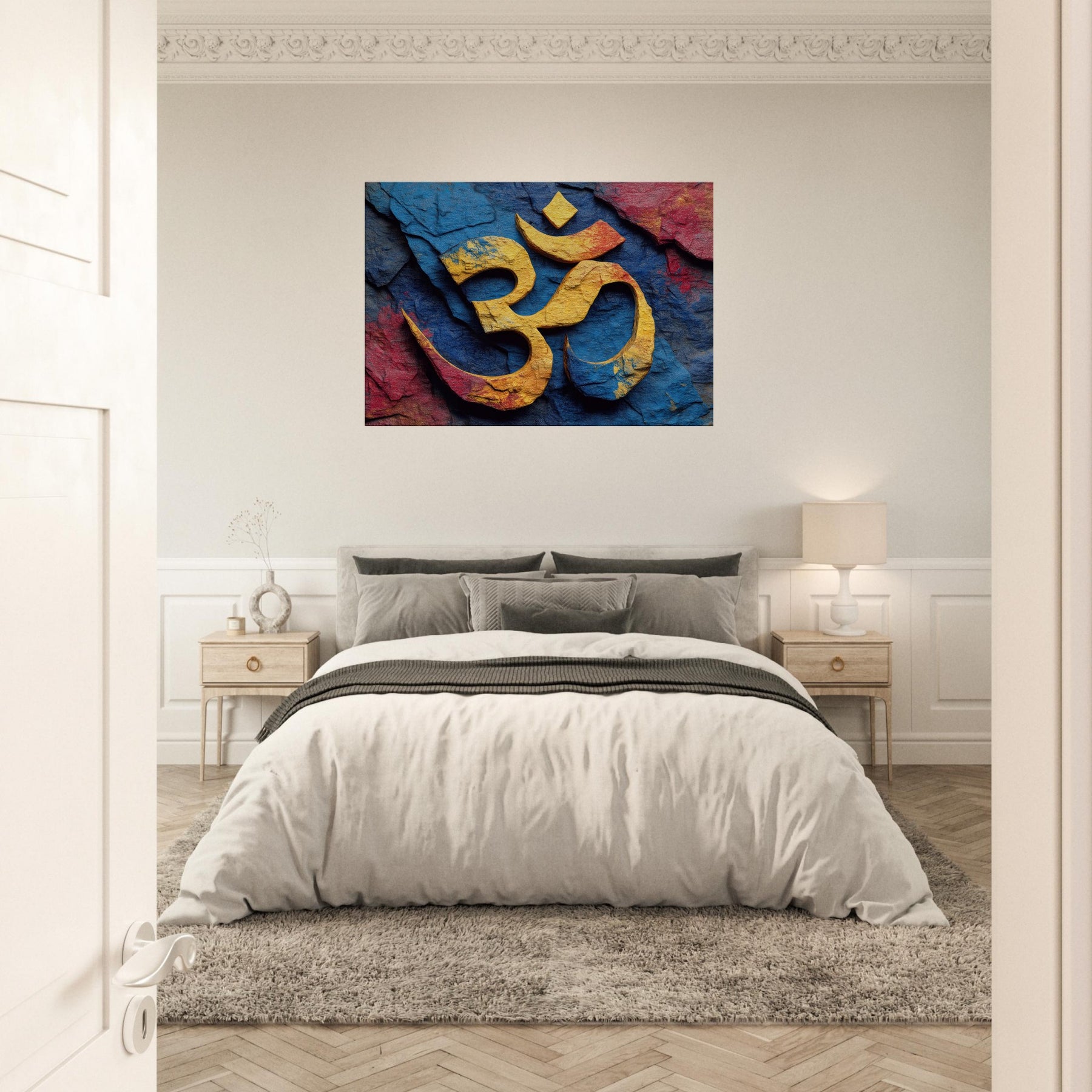 In this enigmatic meditation, the Om unfurls as a molten gold emblem set against a textured sea of cobalt and saffron. The abstract strokes ripple like wind and breath, inviting the room to breathe with you. The surface catches light, shifting from radiant glow to shadowed depth, turning any wall into a sanctuary. Perfect above a sofa or in a quiet hallway, it invites contemplation, softens edges, and makes everyday space feel expansive, sacred, and warmly luminous. The central subject is Om (Aum Symbol).
