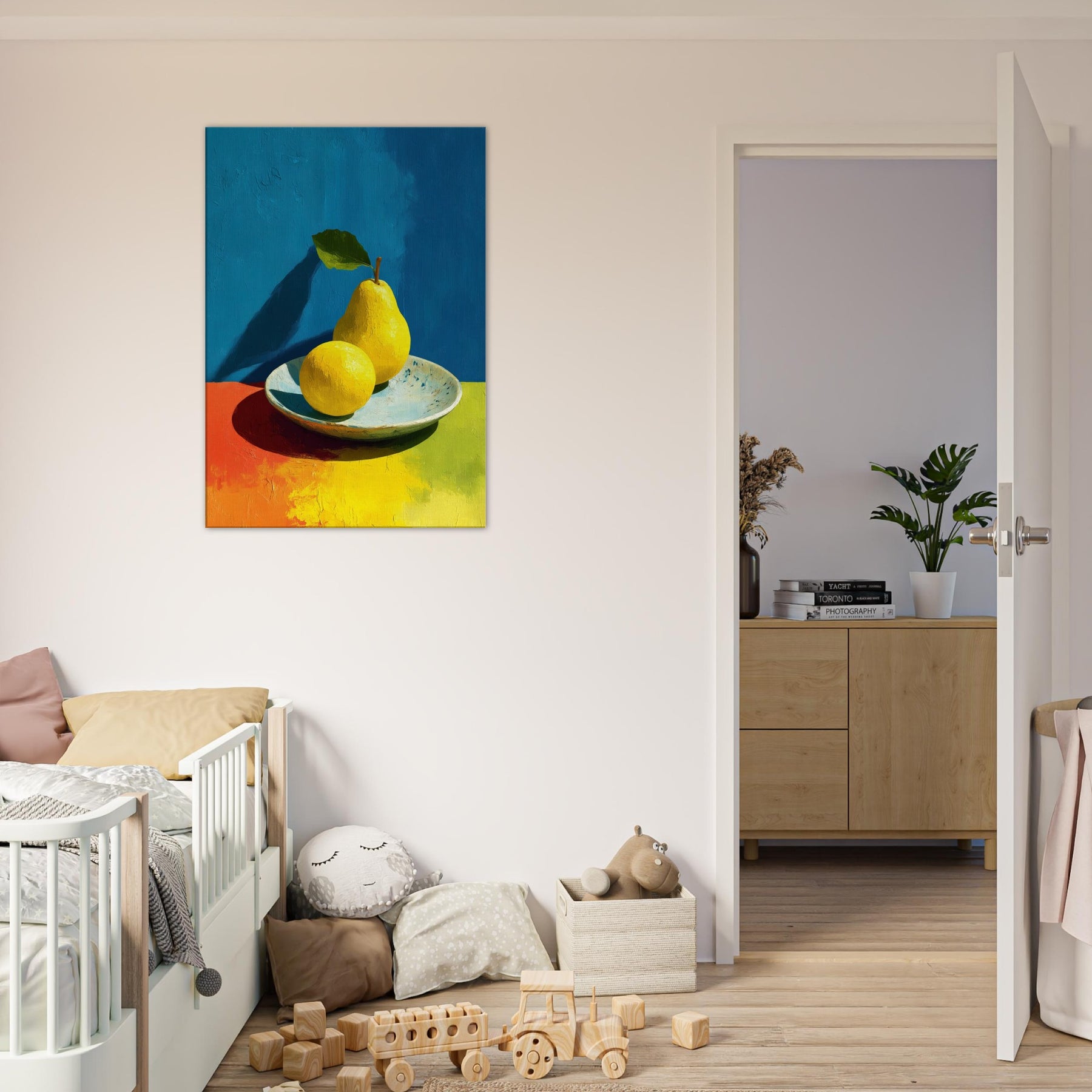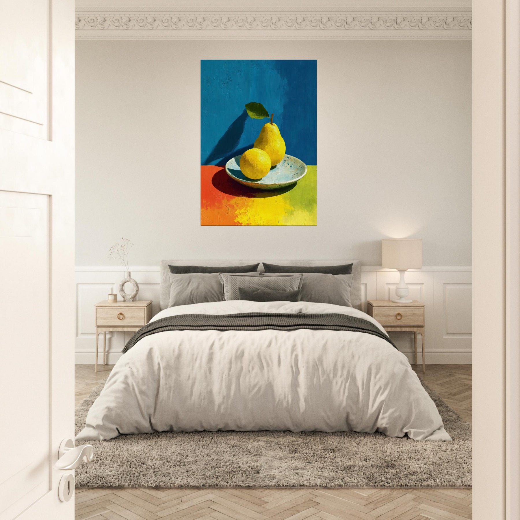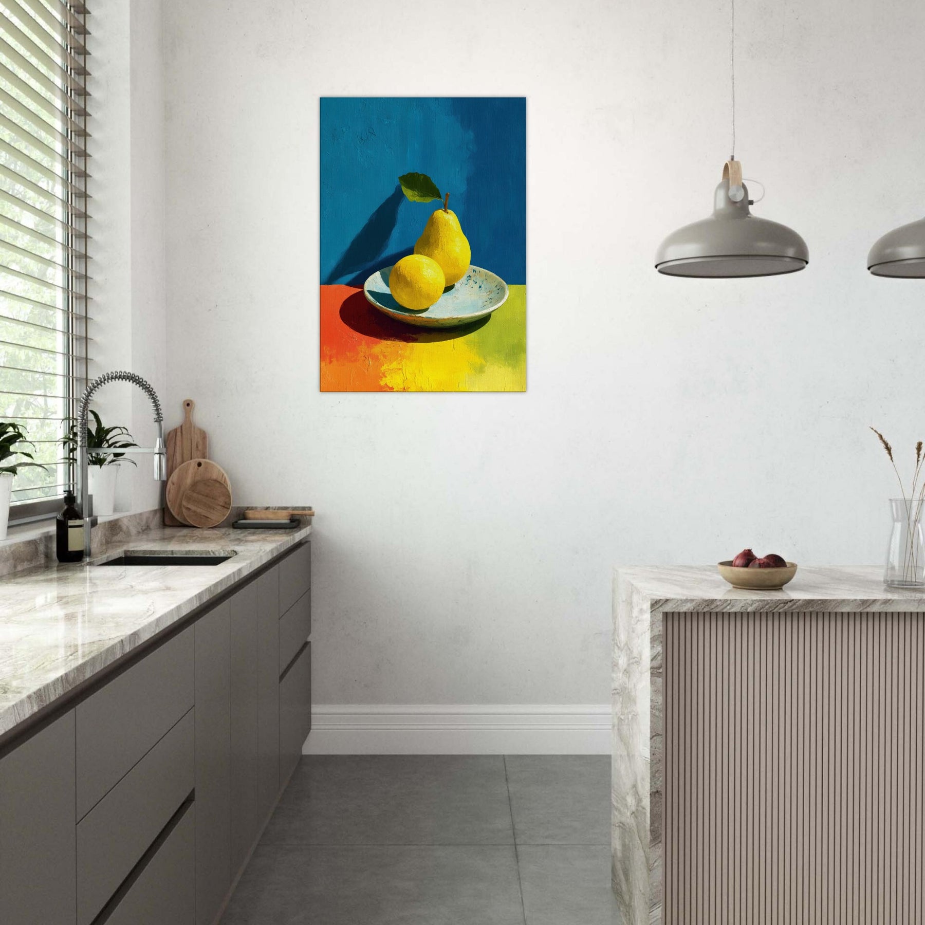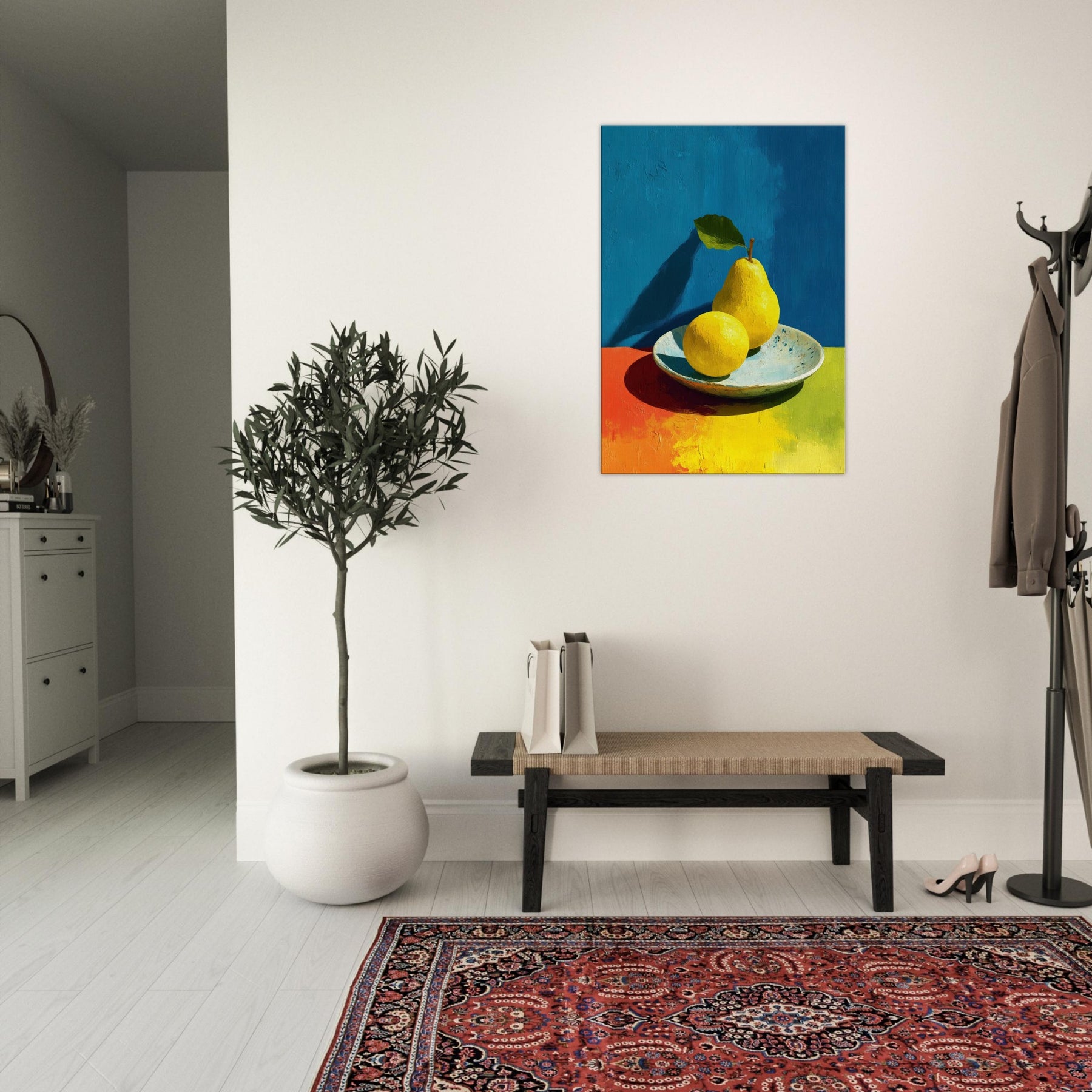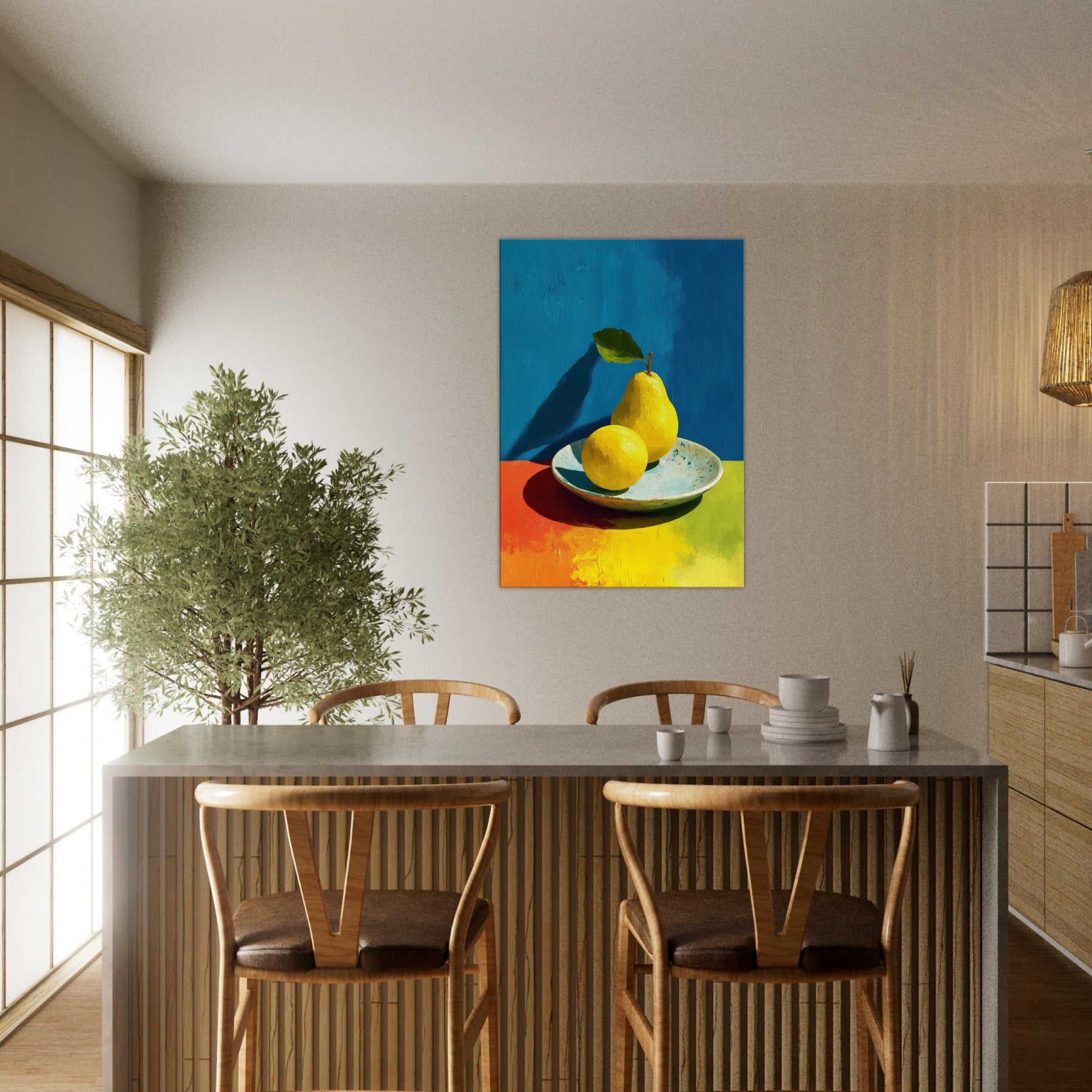 Like a sunlit still life caught between color blocks, this piece invites the senses to linger. The Pears on Plate rest with quiet gravity against a cobalt wall, their yellow skin catching light and casting warm glows across the room. A playful palette blue, red, lime, and teal creates a modern atmosphere that feels both fresh and timeless, perfect for a dining nook or living area seeking a touch of luminous calm and elegant whimsy.