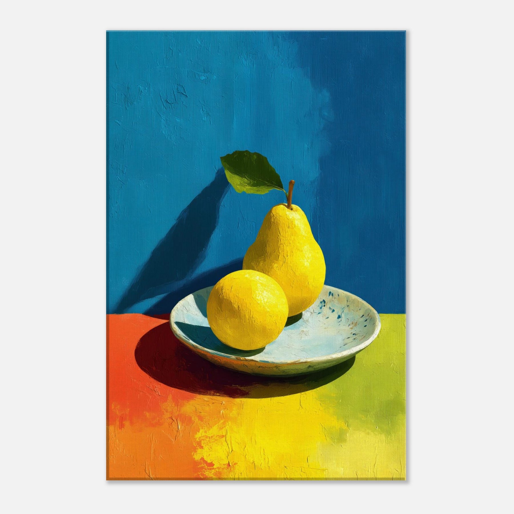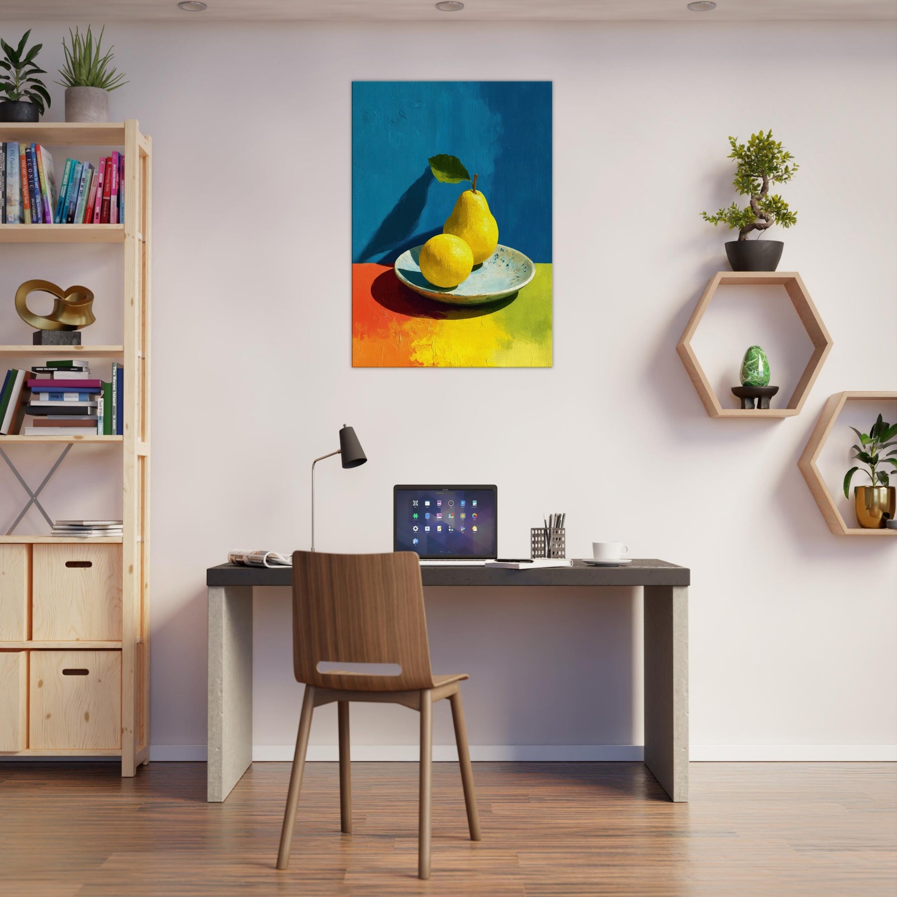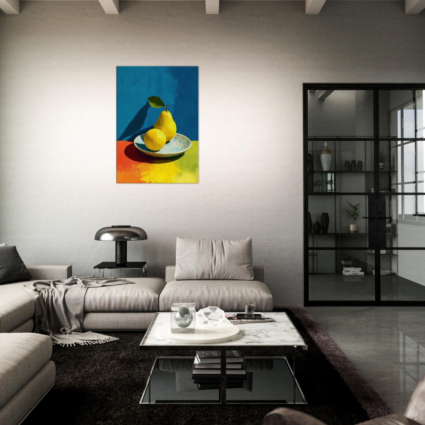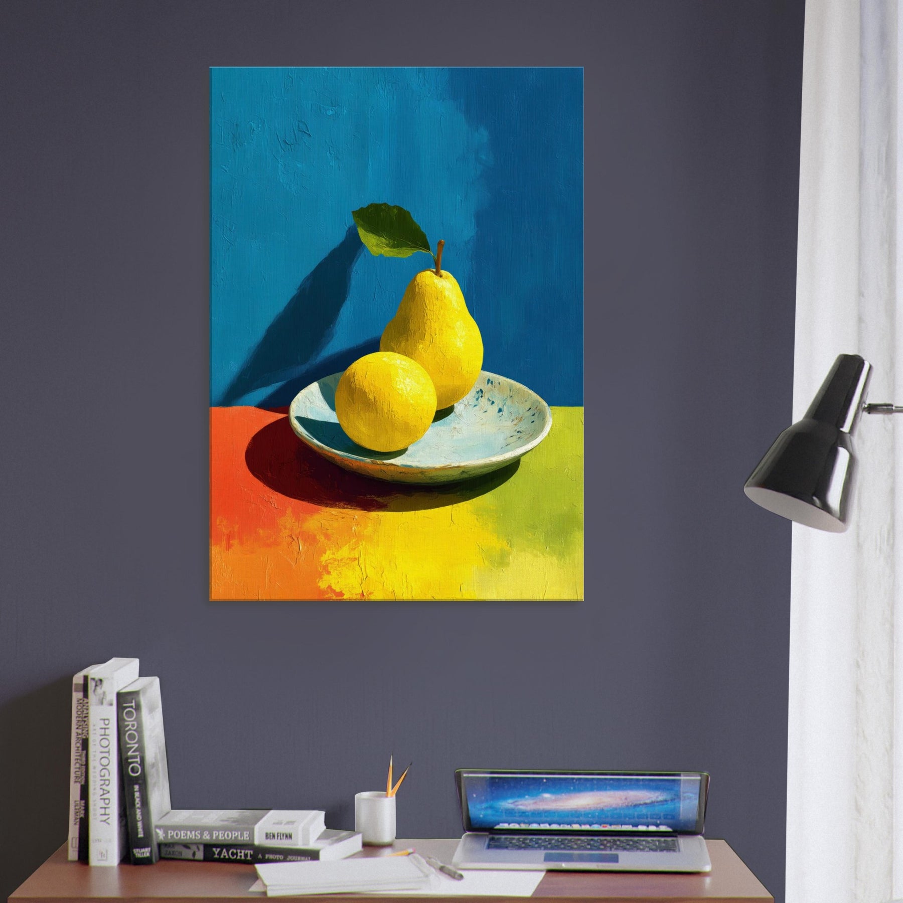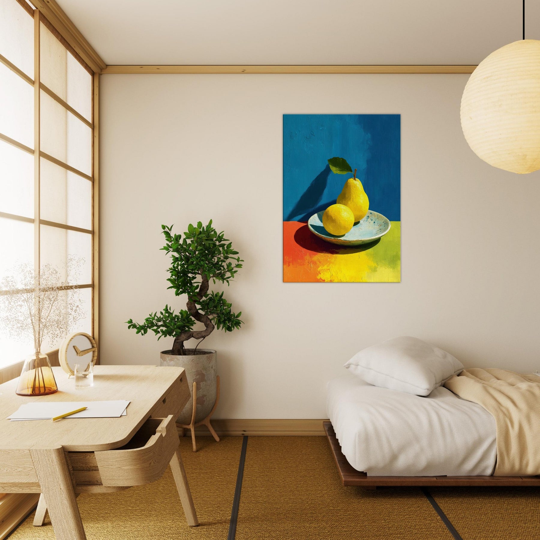 Like a sunlit still life caught between color blocks, this piece invites the senses to linger. The Pears on Plate rest with quiet gravity against a cobalt wall, their yellow skin catching light and casting warm glows across the room. A playful palette blue, red, lime, and teal creates a modern atmosphere that feels both fresh and timeless, perfect for a dining nook or living area seeking a touch of luminous calm and elegant whimsy.