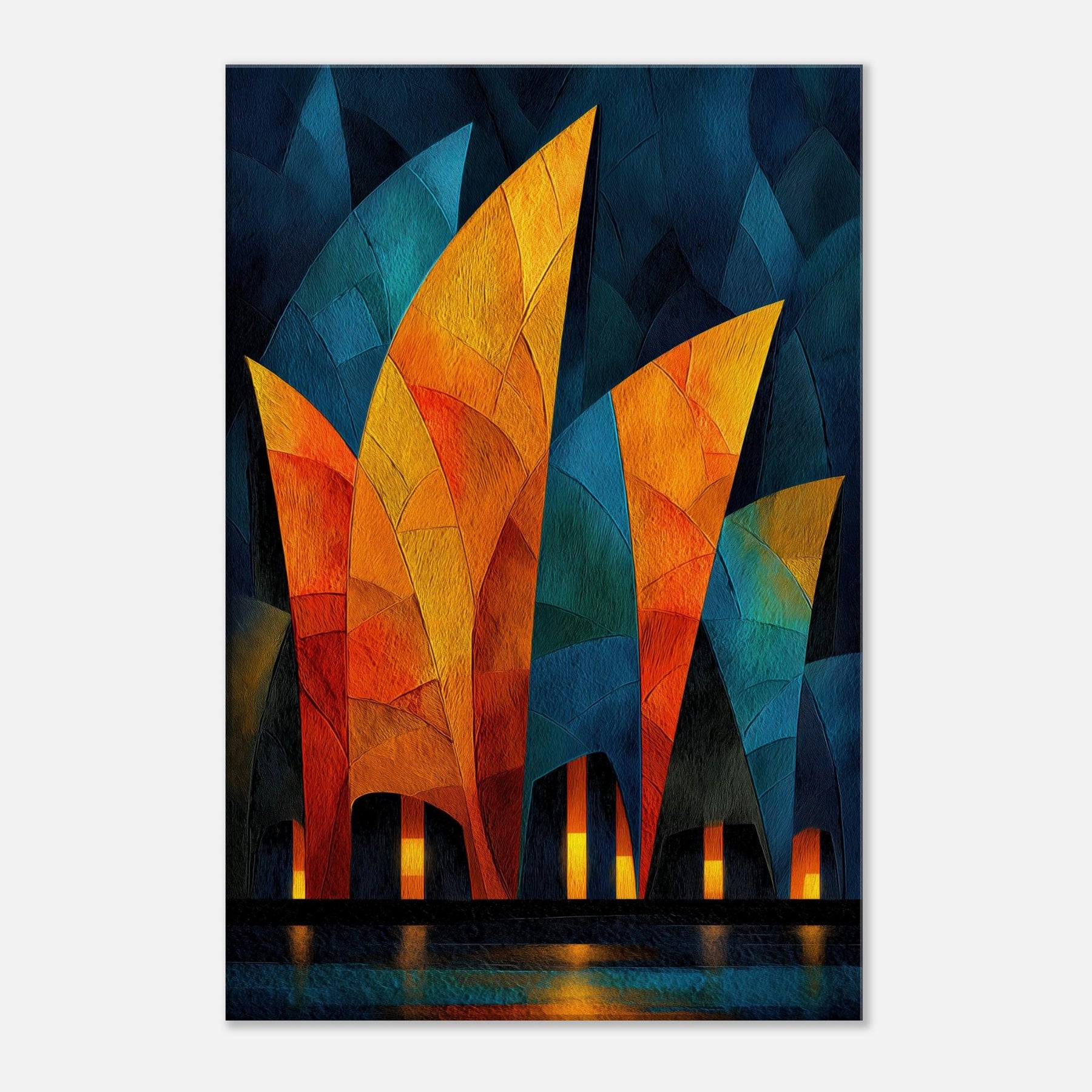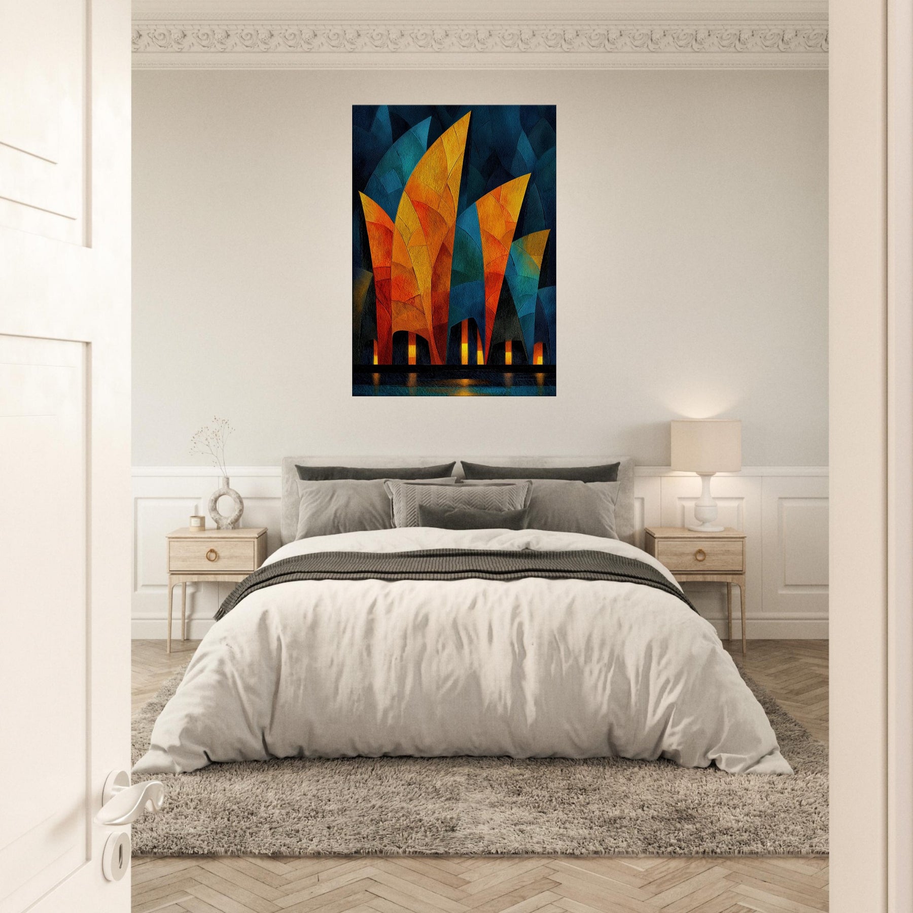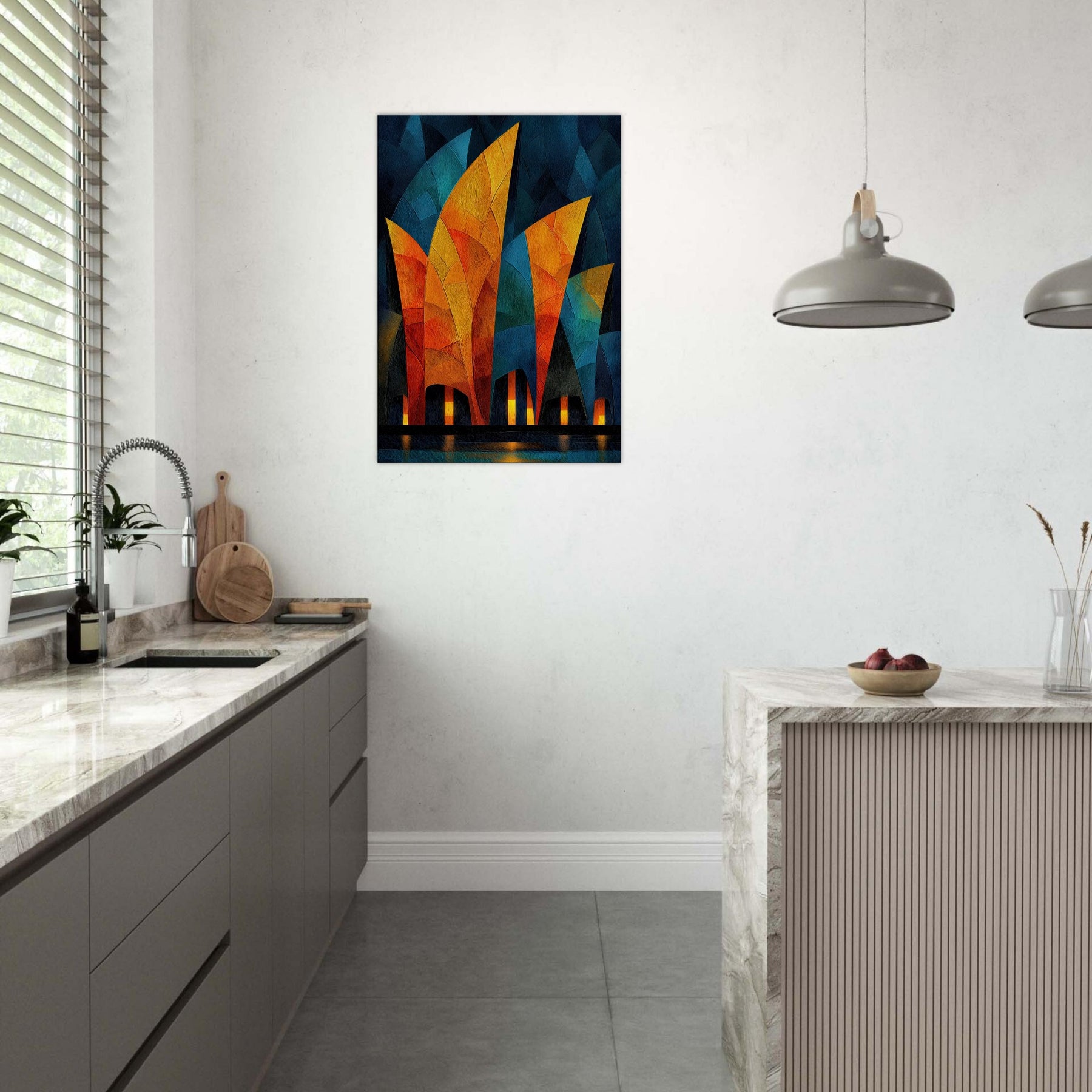 Mist and ember collide as the Sydney Opera House rises in a blaze of color, reimagined as ghostly sails of light. This abstract interpretation breathes energy into any space, turning walls into a harbor of warmth and possibility. You’ll feel the ocean breeze in the cool blues and the sunlit warmth in the radiant oranges, while the deep indigo backdrop grounds the room in quiet drama. Perfect above a sofa or console, it invites conversation, reflection, and a touch of architectural wonder into daily life.