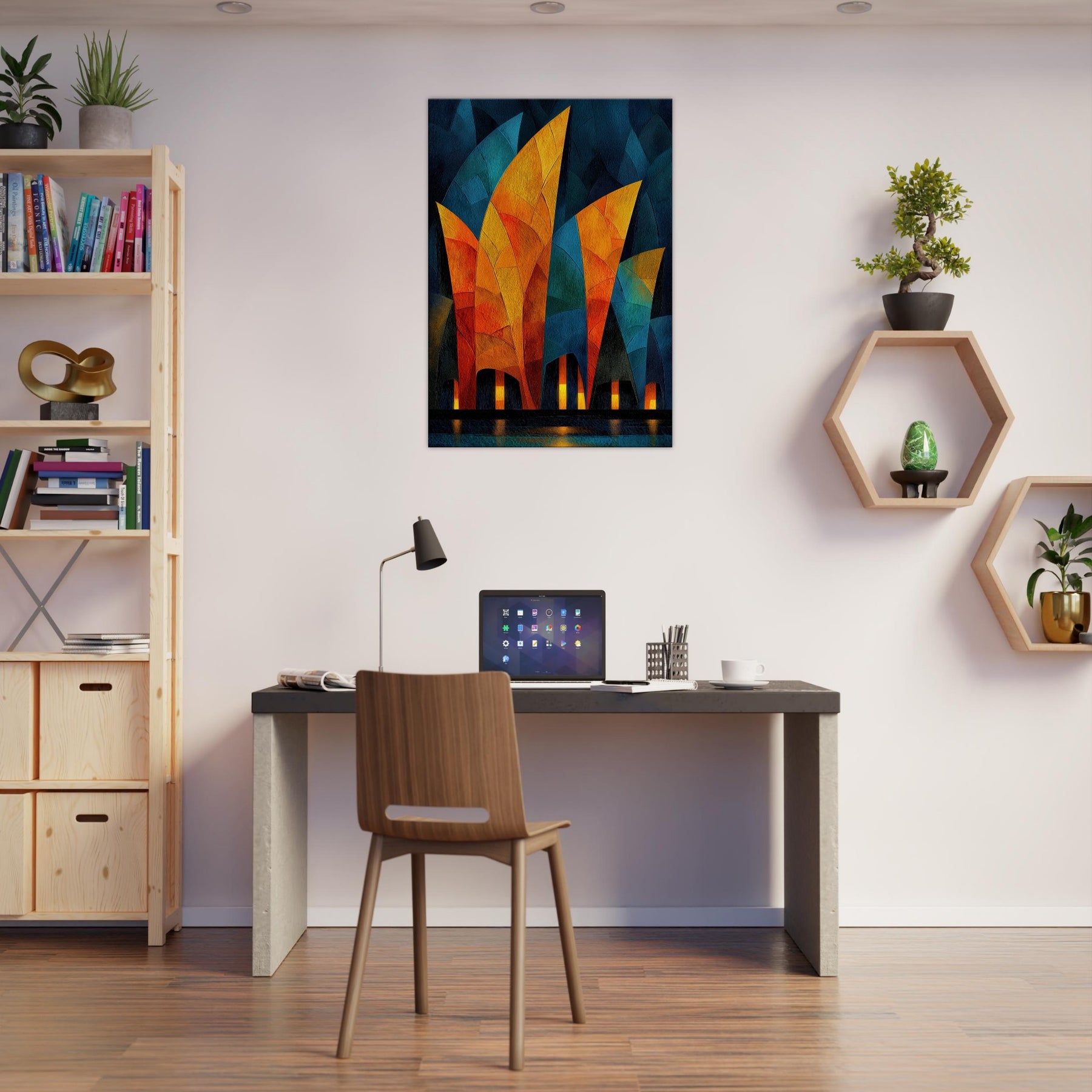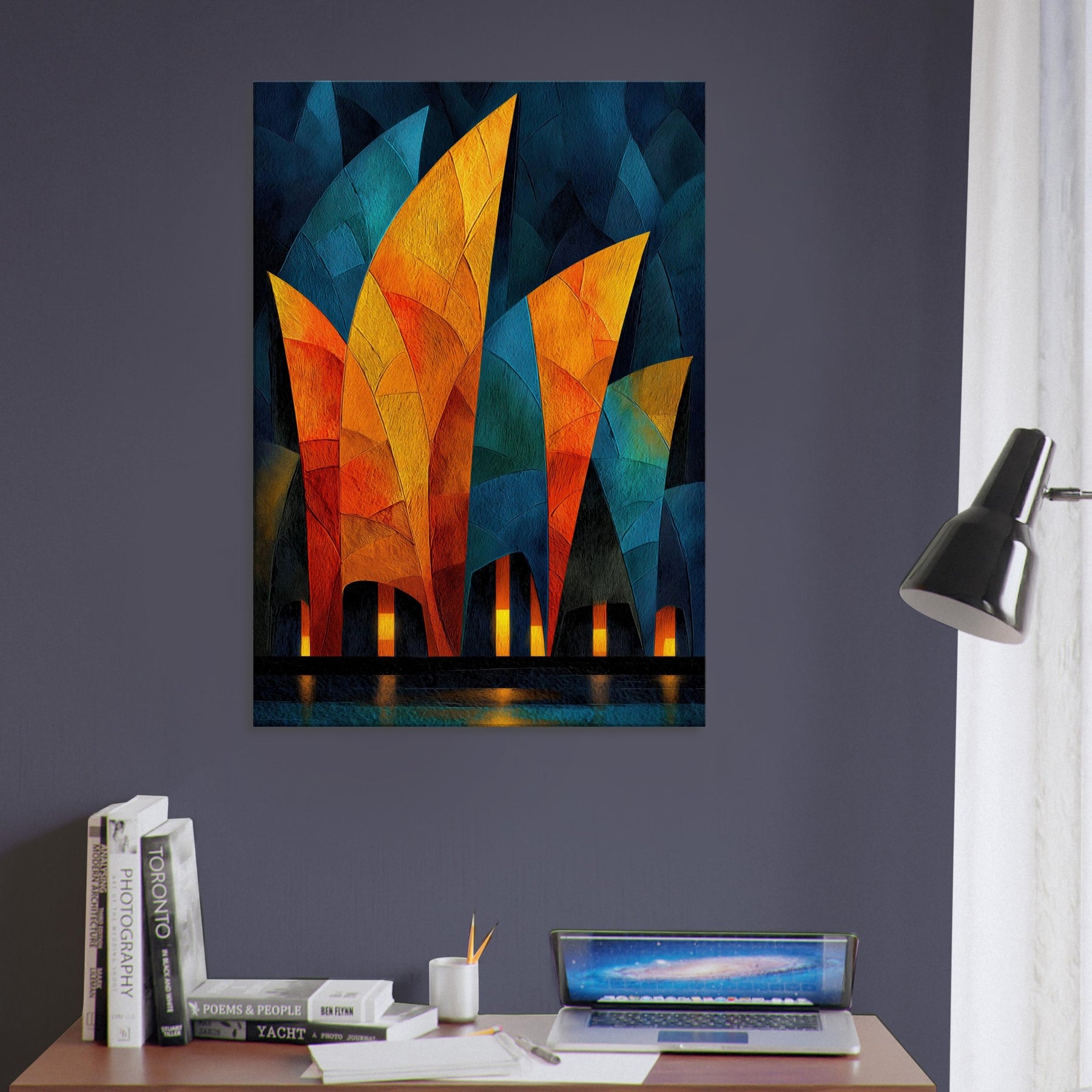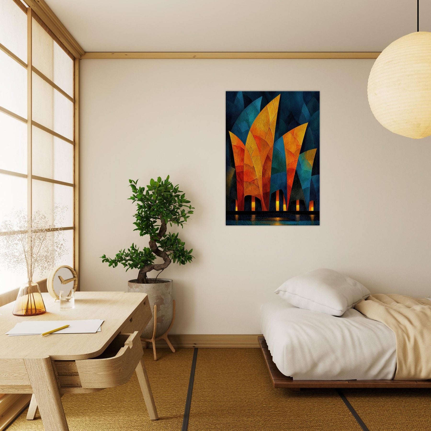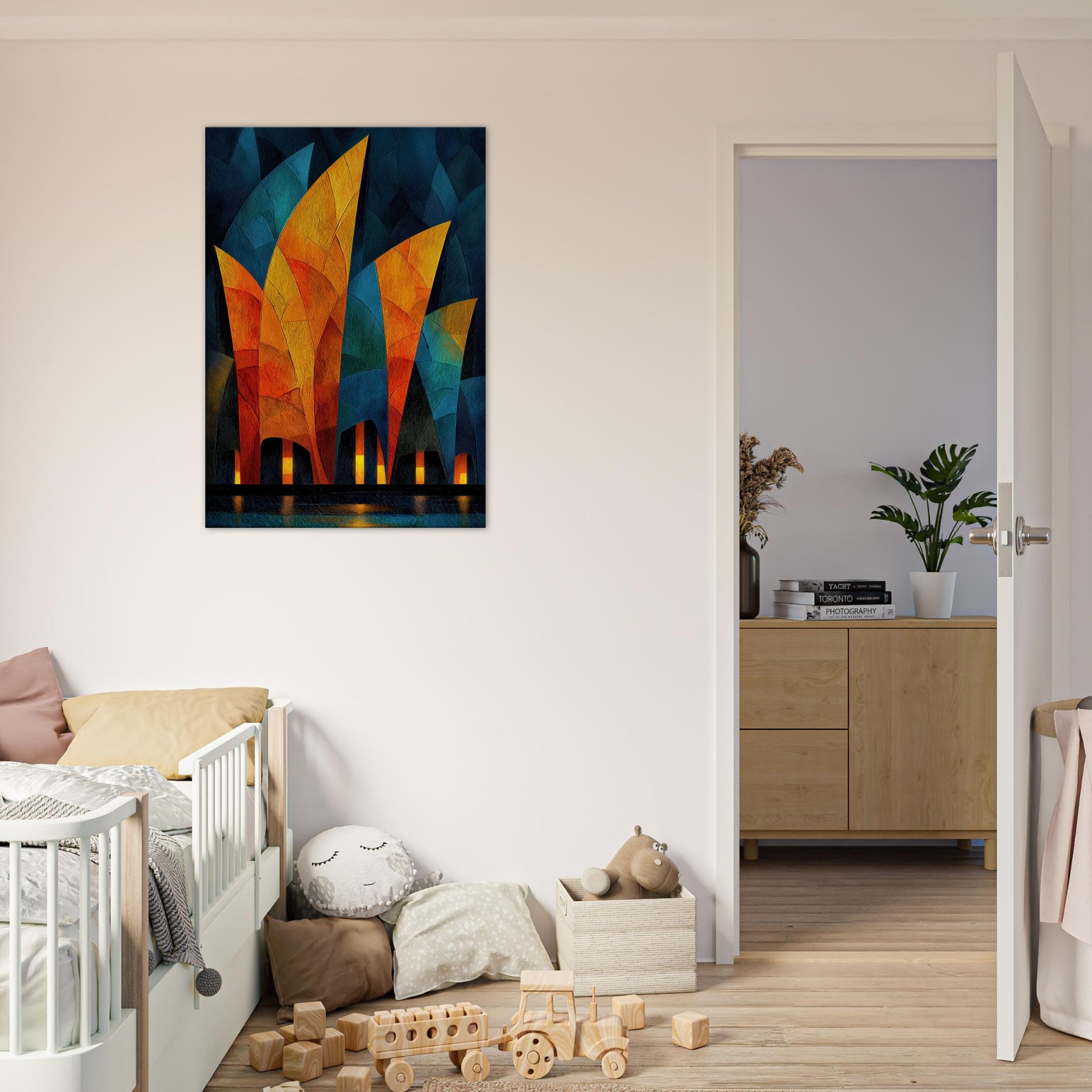 Mist and ember collide as the Sydney Opera House rises in a blaze of color, reimagined as ghostly sails of light. This abstract interpretation breathes energy into any space, turning walls into a harbor of warmth and possibility. You’ll feel the ocean breeze in the cool blues and the sunlit warmth in the radiant oranges, while the deep indigo backdrop grounds the room in quiet drama. Perfect above a sofa or console, it invites conversation, reflection, and a touch of architectural wonder into daily life.