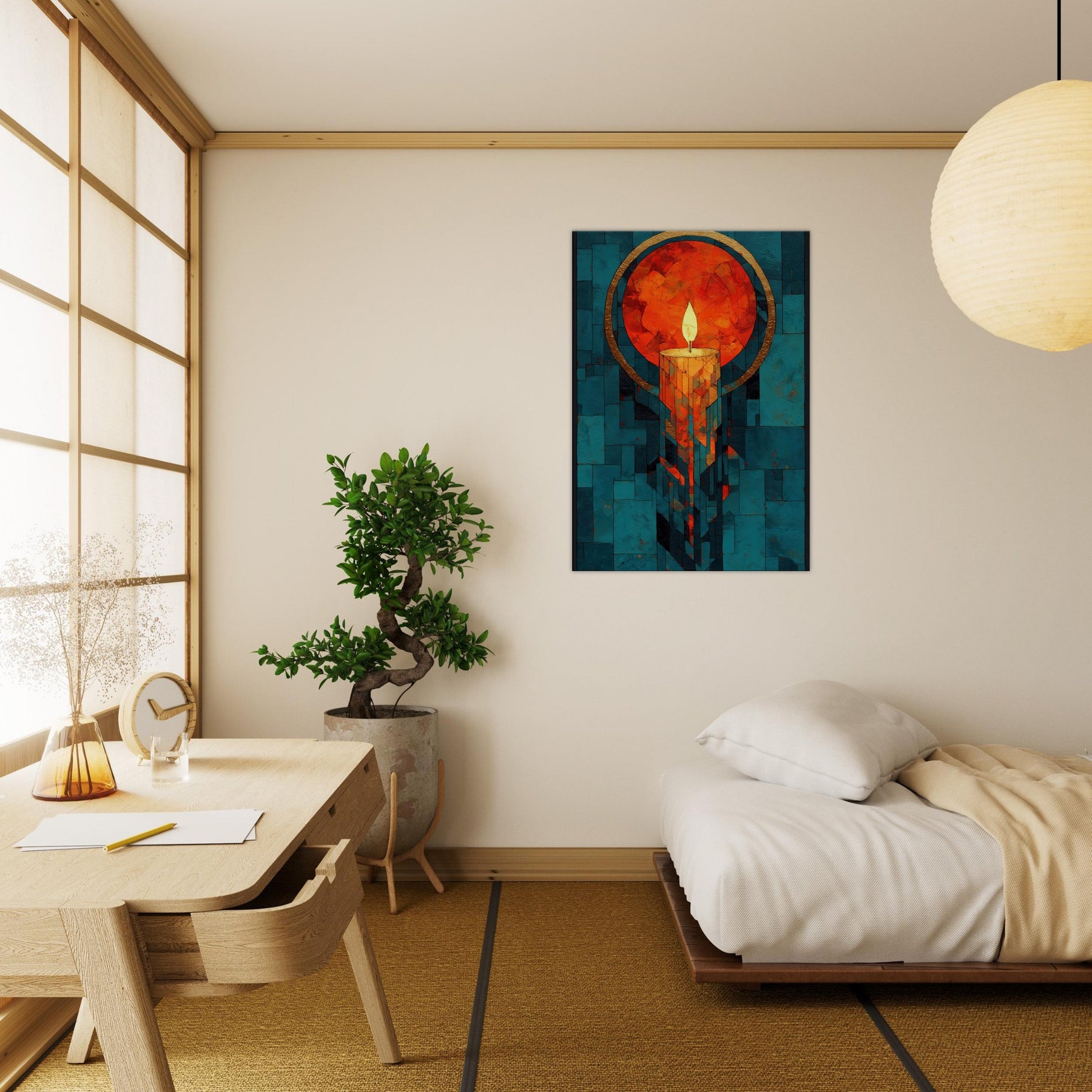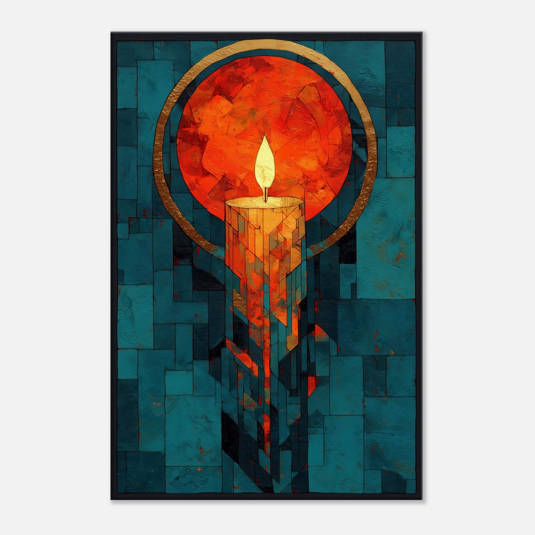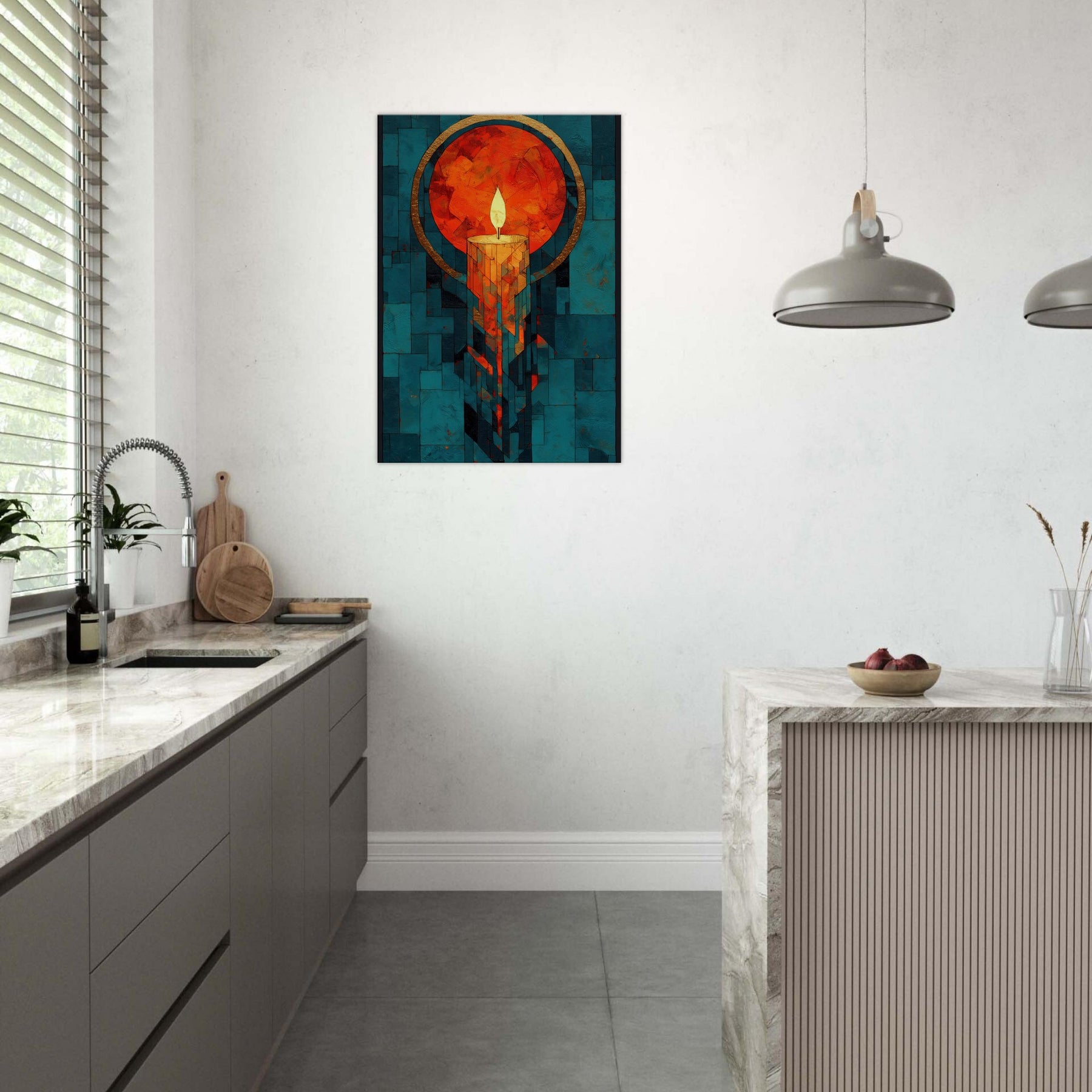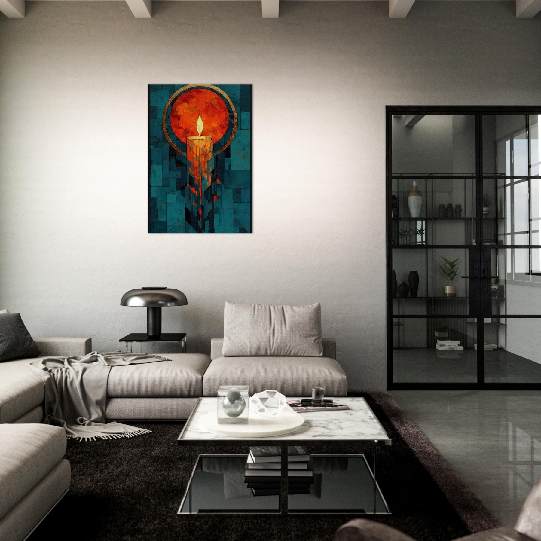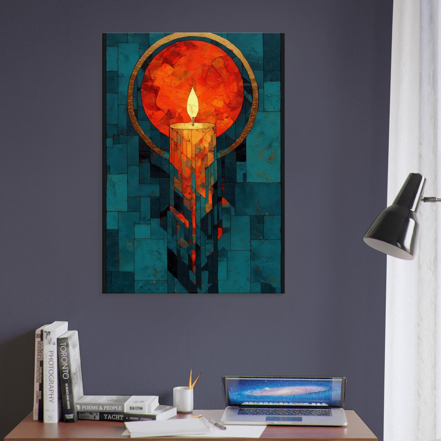 Enter a room bathed in ember light as the Candle with Halo rises from layered geometry. The abstract composition fuses a molten circle with a crystalline ascent, inviting the eye to trace the flame's glow through faceted shapes. Warmth leaks into cool teal walls, turning ordinary evenings into rituals of calm and focus. This artwork carries a sense of quiet ceremony, elevating a living space with memory and glow, turning a corner into a sanctuary where conversation dissolves into soft, luminous contemplation.