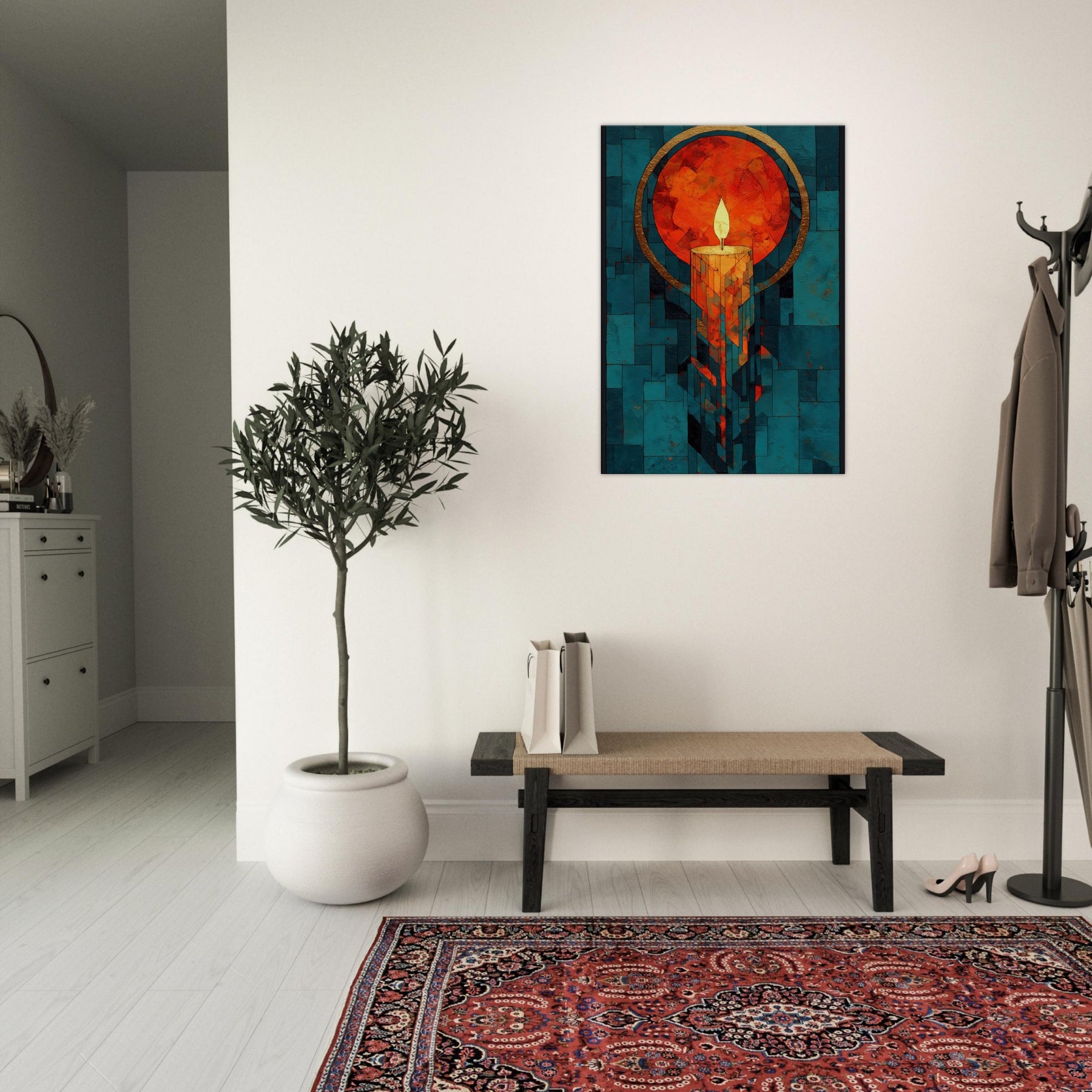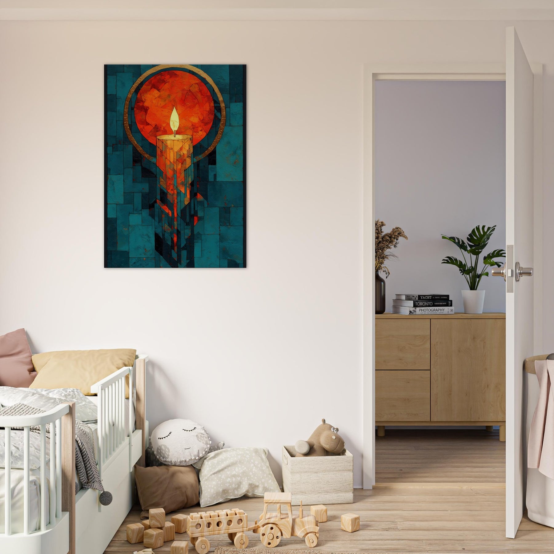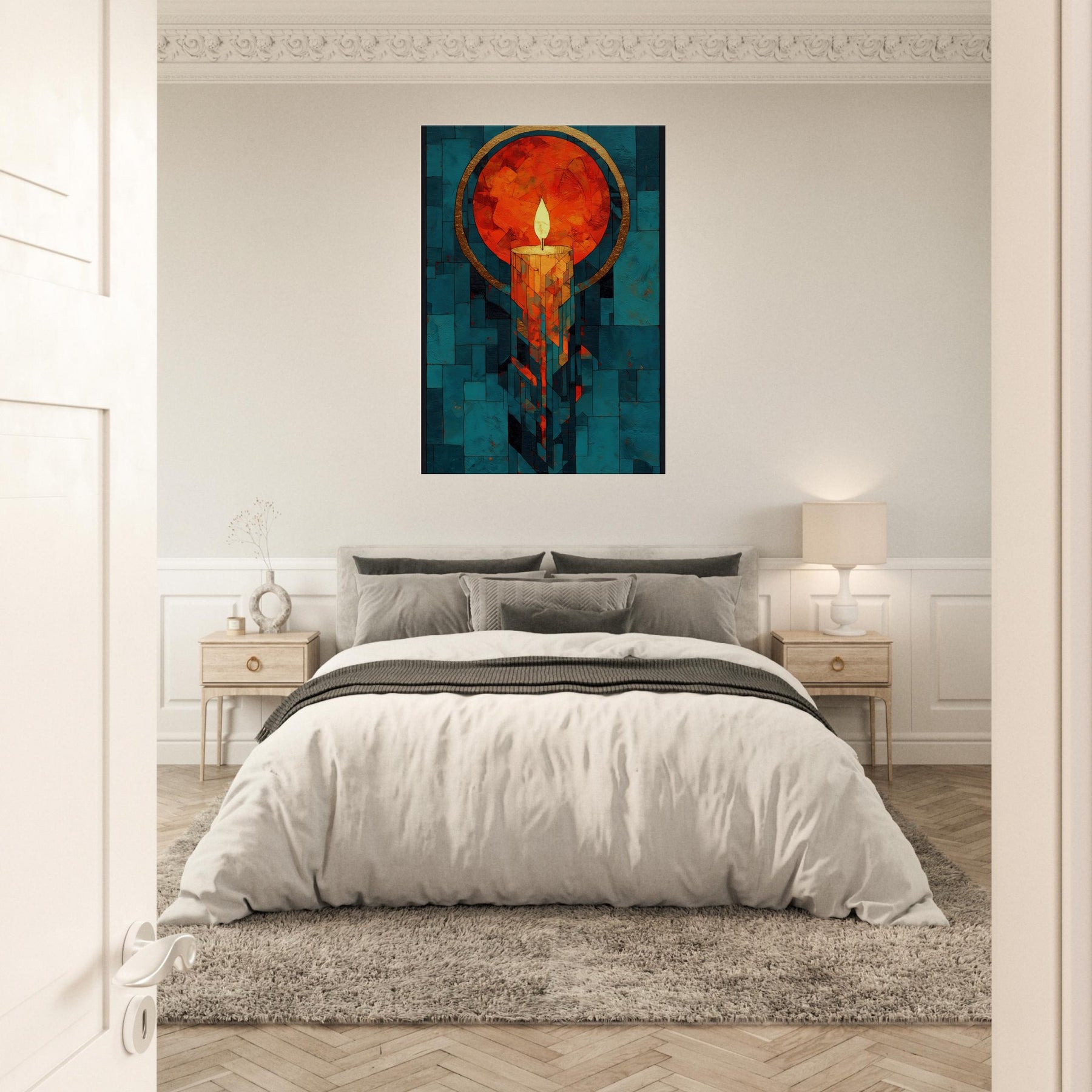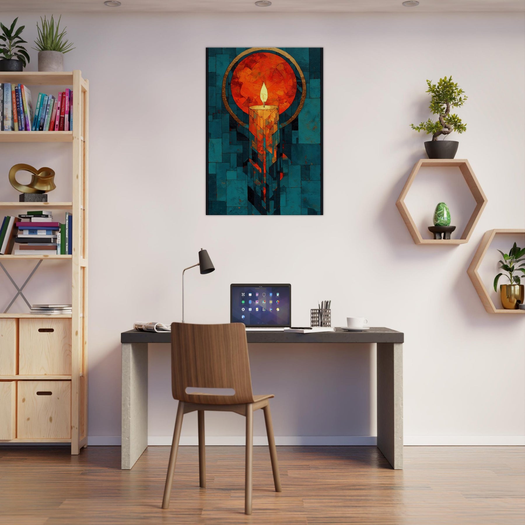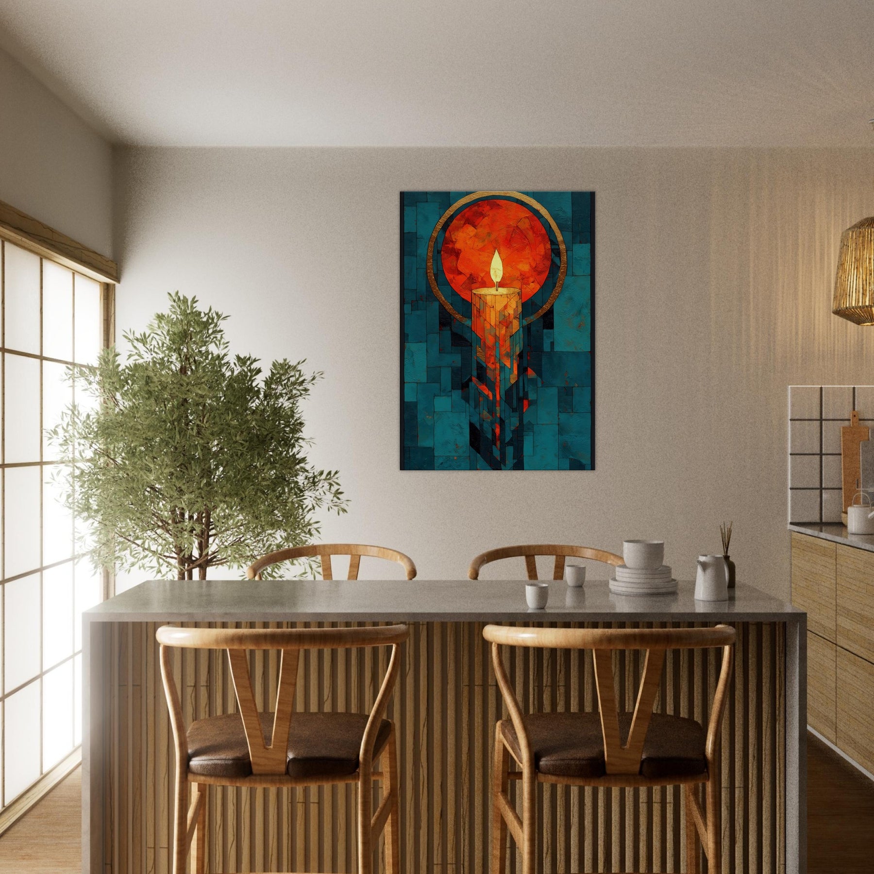 Enter a room bathed in ember light as the Candle with Halo rises from layered geometry. The abstract composition fuses a molten circle with a crystalline ascent, inviting the eye to trace the flame's glow through faceted shapes. Warmth leaks into cool teal walls, turning ordinary evenings into rituals of calm and focus. This artwork carries a sense of quiet ceremony, elevating a living space with memory and glow, turning a corner into a sanctuary where conversation dissolves into soft, luminous contemplation.