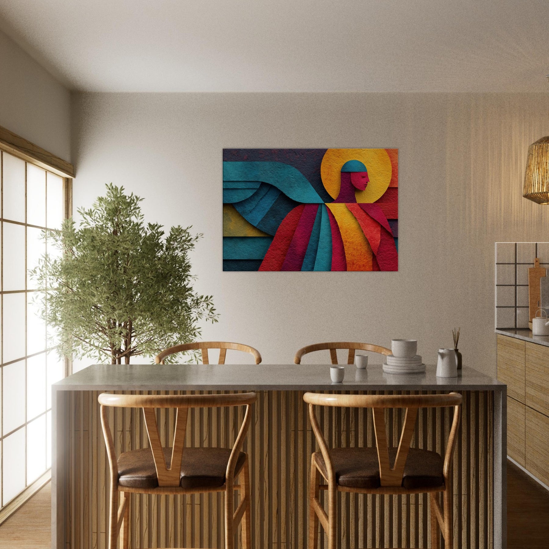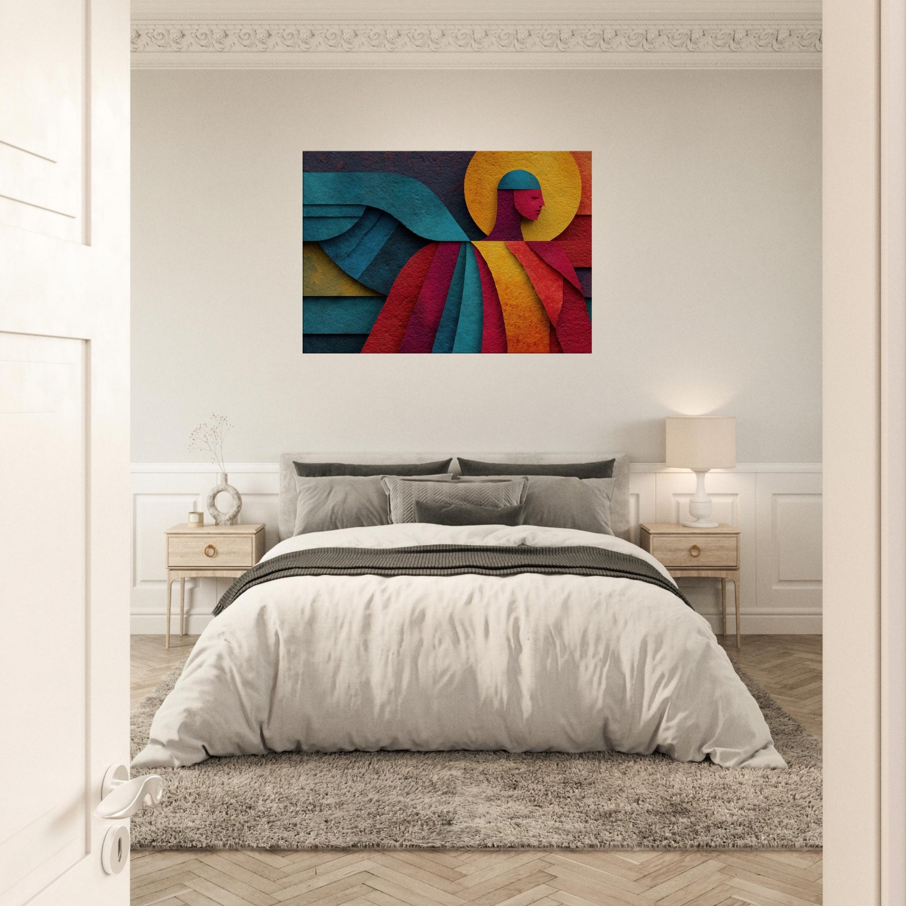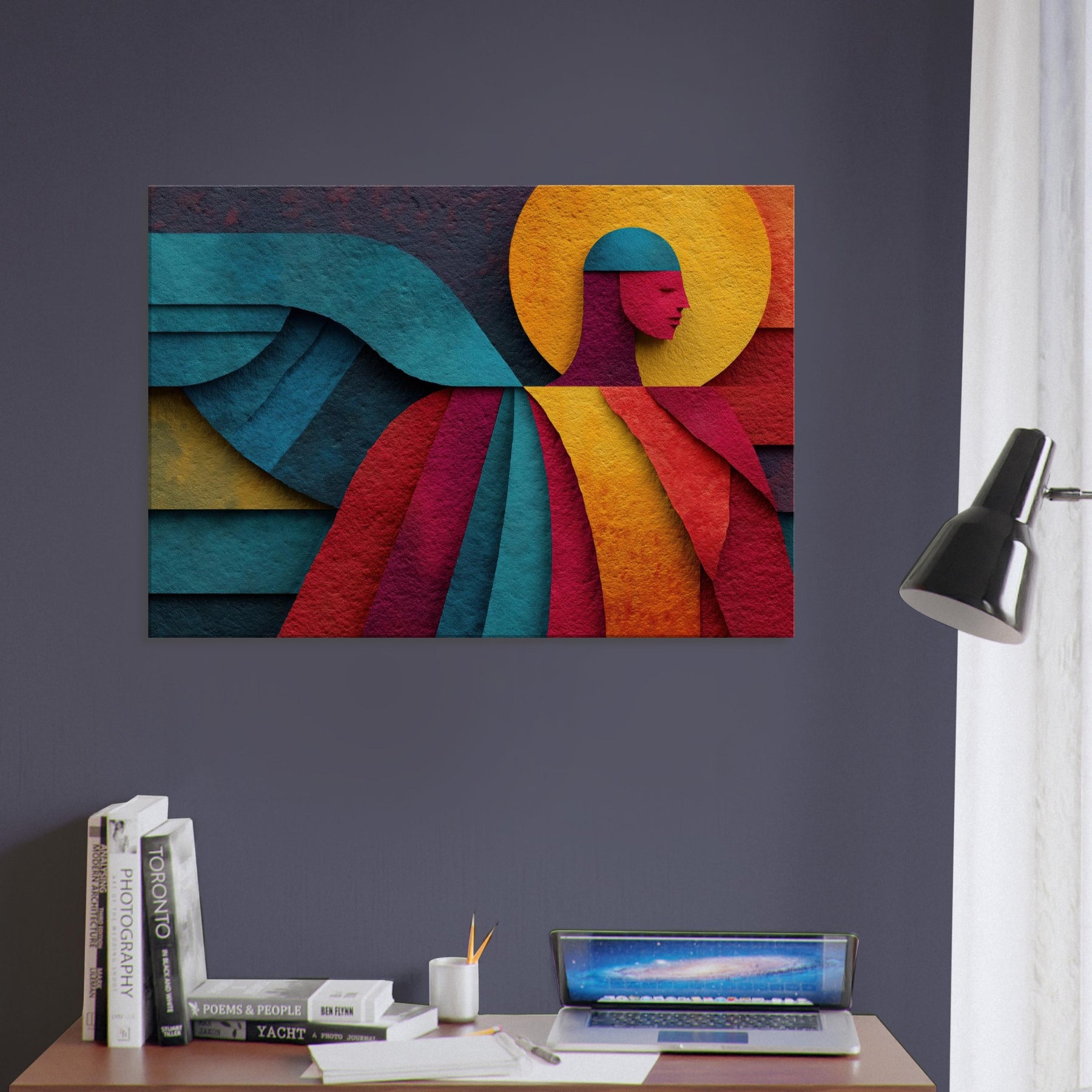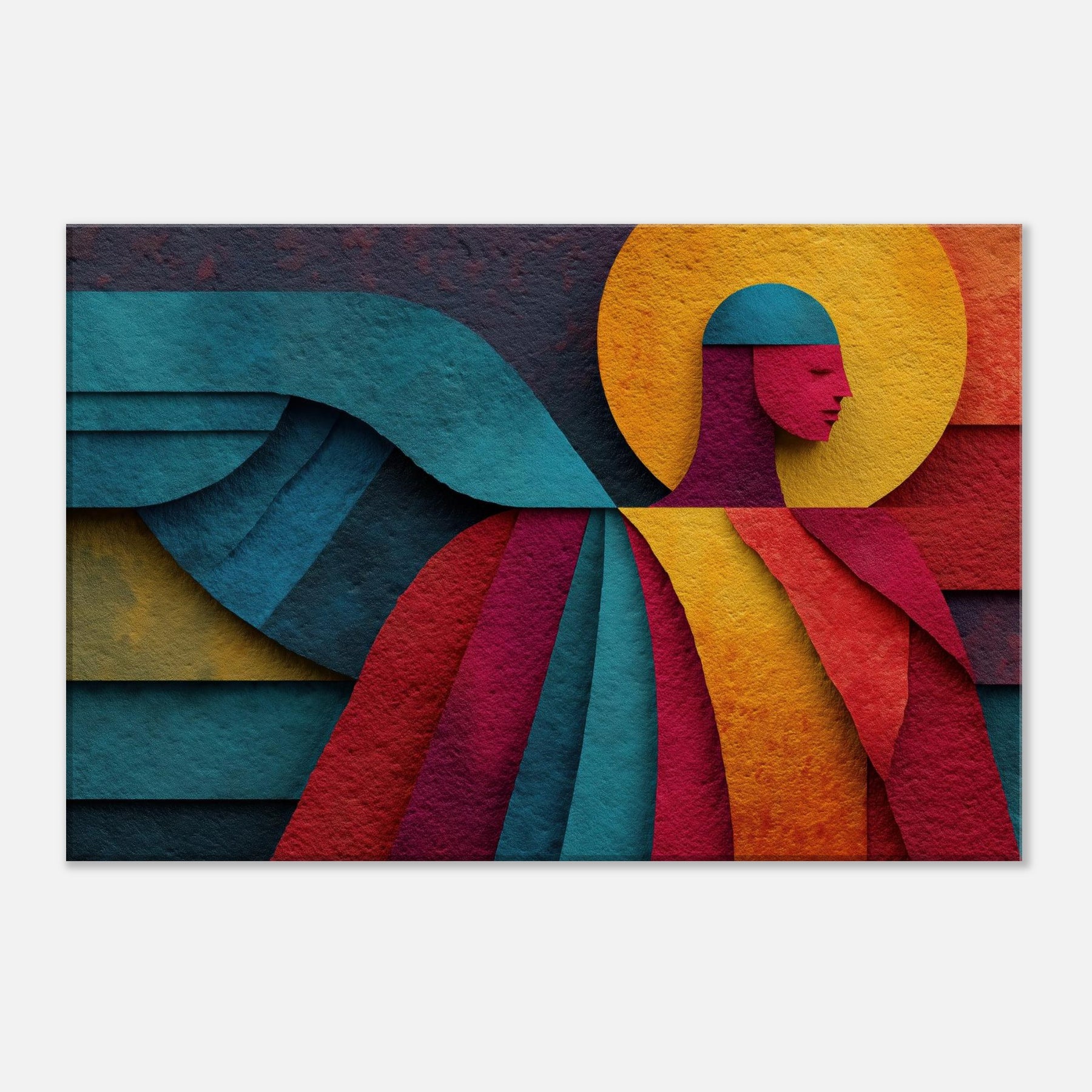 Archangel ascends in a tapestry of color, where bold geometry meets celestial calm. This abstract portrayal dissolves form into luminous planes a halo of amber, a halo shaped circle, azure wings curling across the composition yet its presence feels serene, almost tangible. In a living room, the piece invites whisper soft light to play across walls, turning evenings into quiet reverie and mornings into a moment of breath. A mystic focal point that elevates any space with grace and wonder. The central subject is Angel/Archangel.