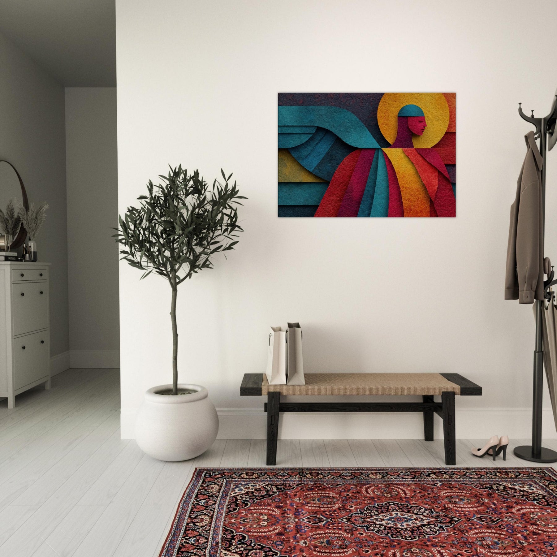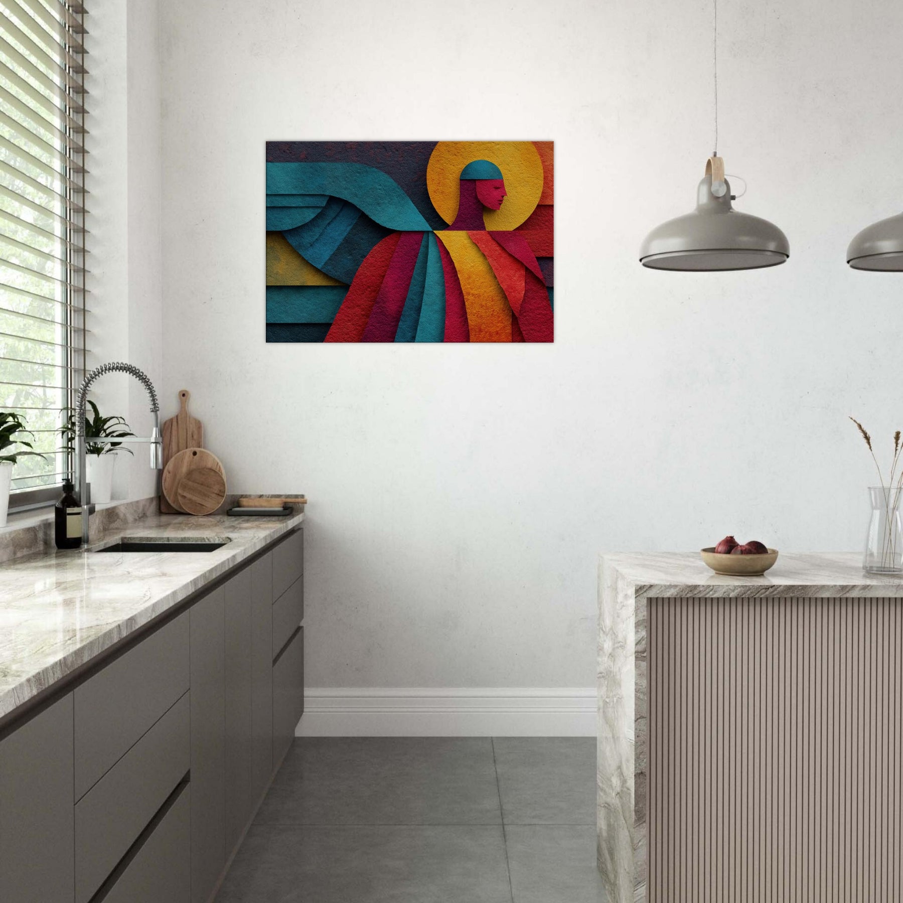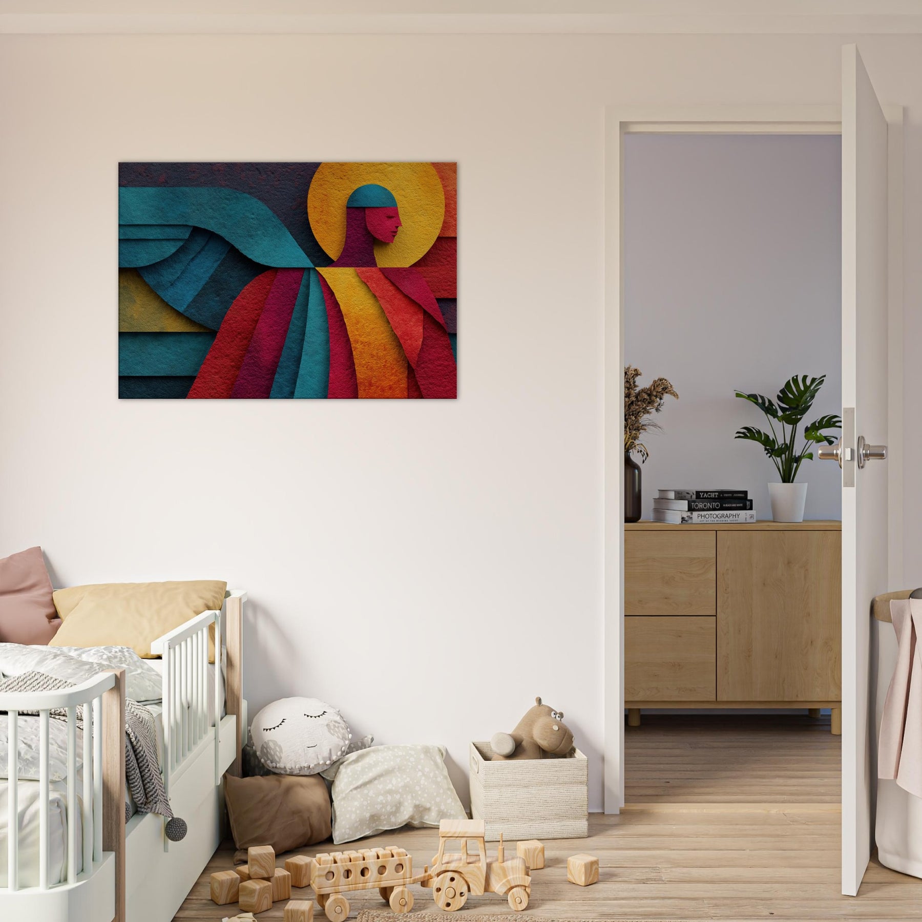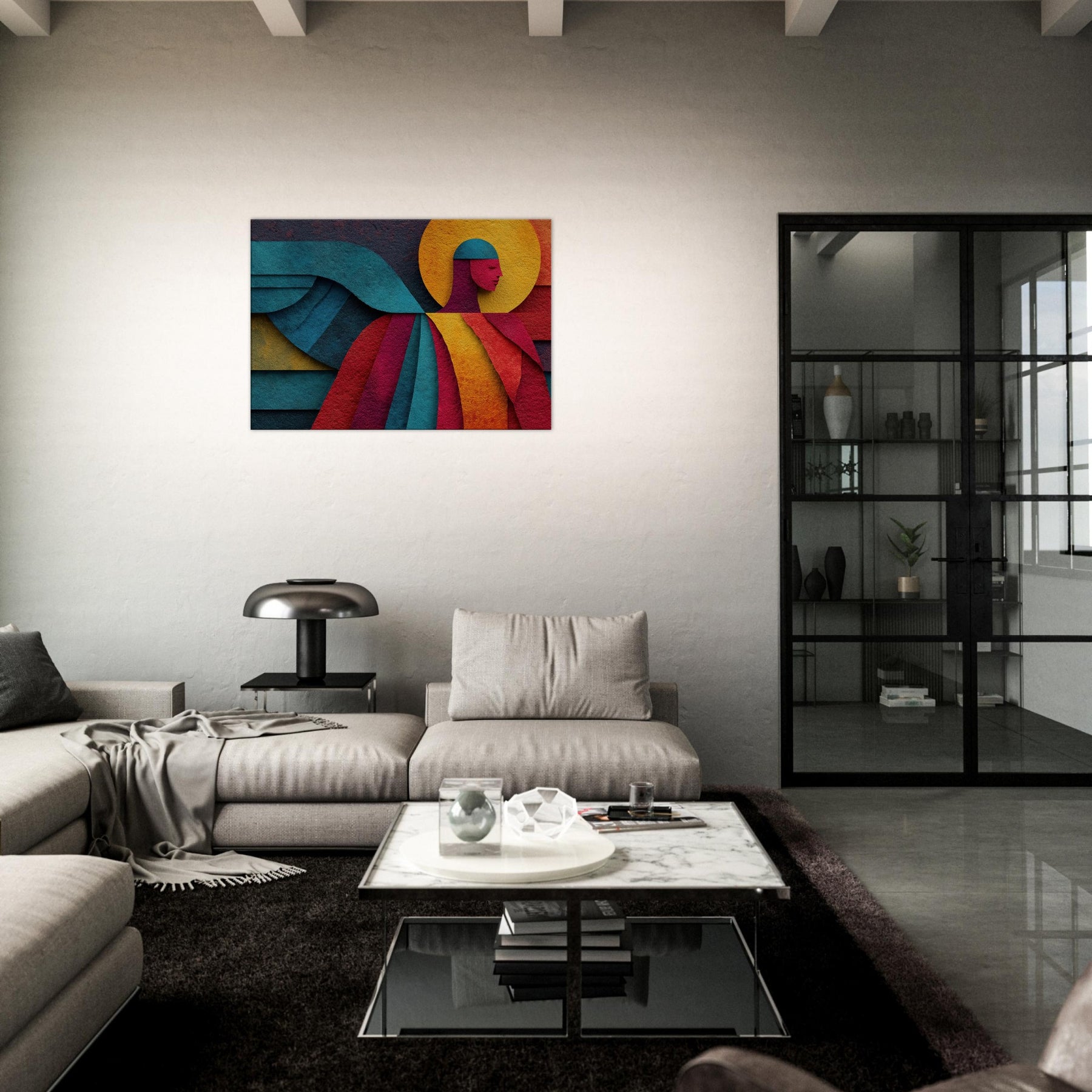 Archangel ascends in a tapestry of color, where bold geometry meets celestial calm. This abstract portrayal dissolves form into luminous planes a halo of amber, a halo shaped circle, azure wings curling across the composition yet its presence feels serene, almost tangible. In a living room, the piece invites whisper soft light to play across walls, turning evenings into quiet reverie and mornings into a moment of breath. A mystic focal point that elevates any space with grace and wonder. The central subject is Angel/Archangel.