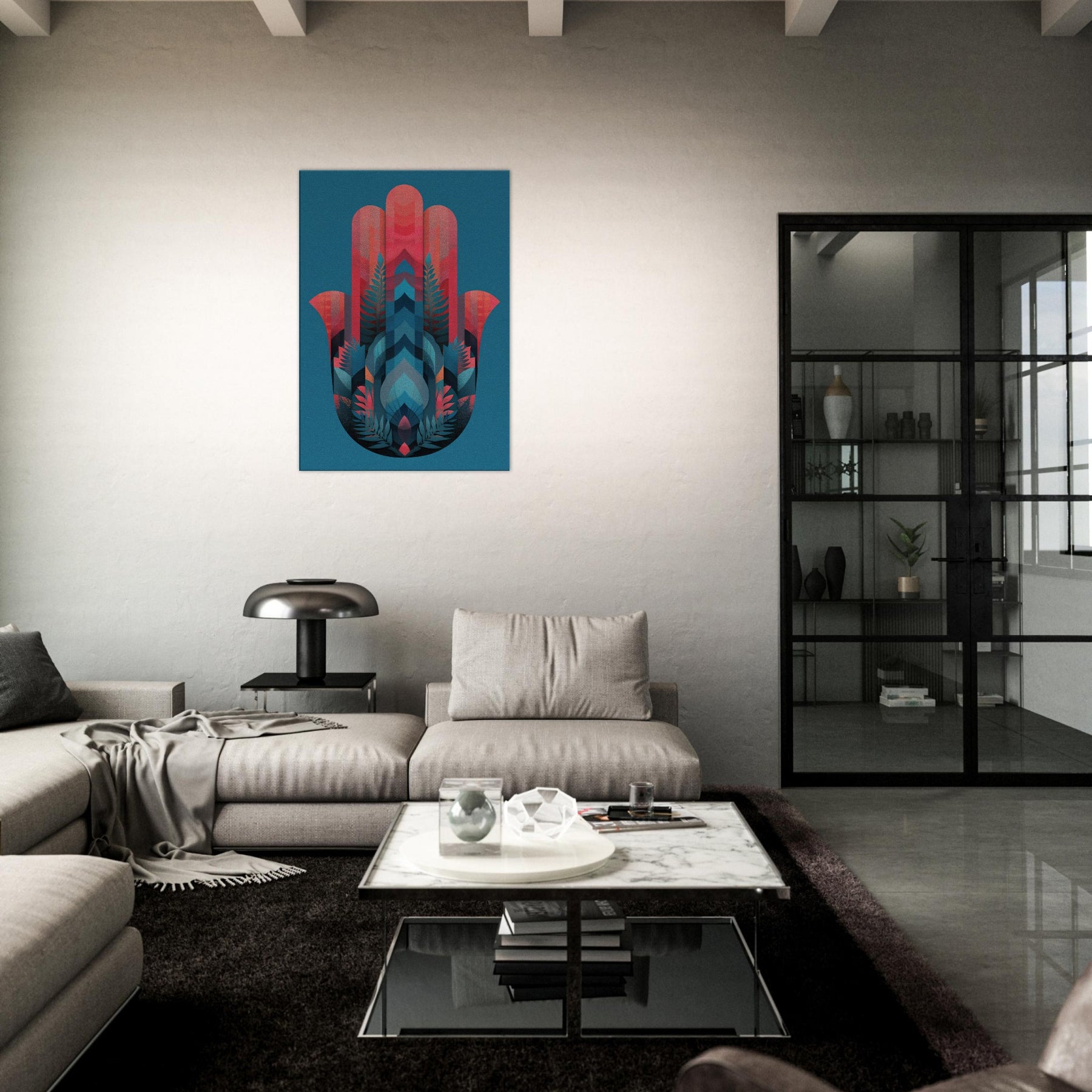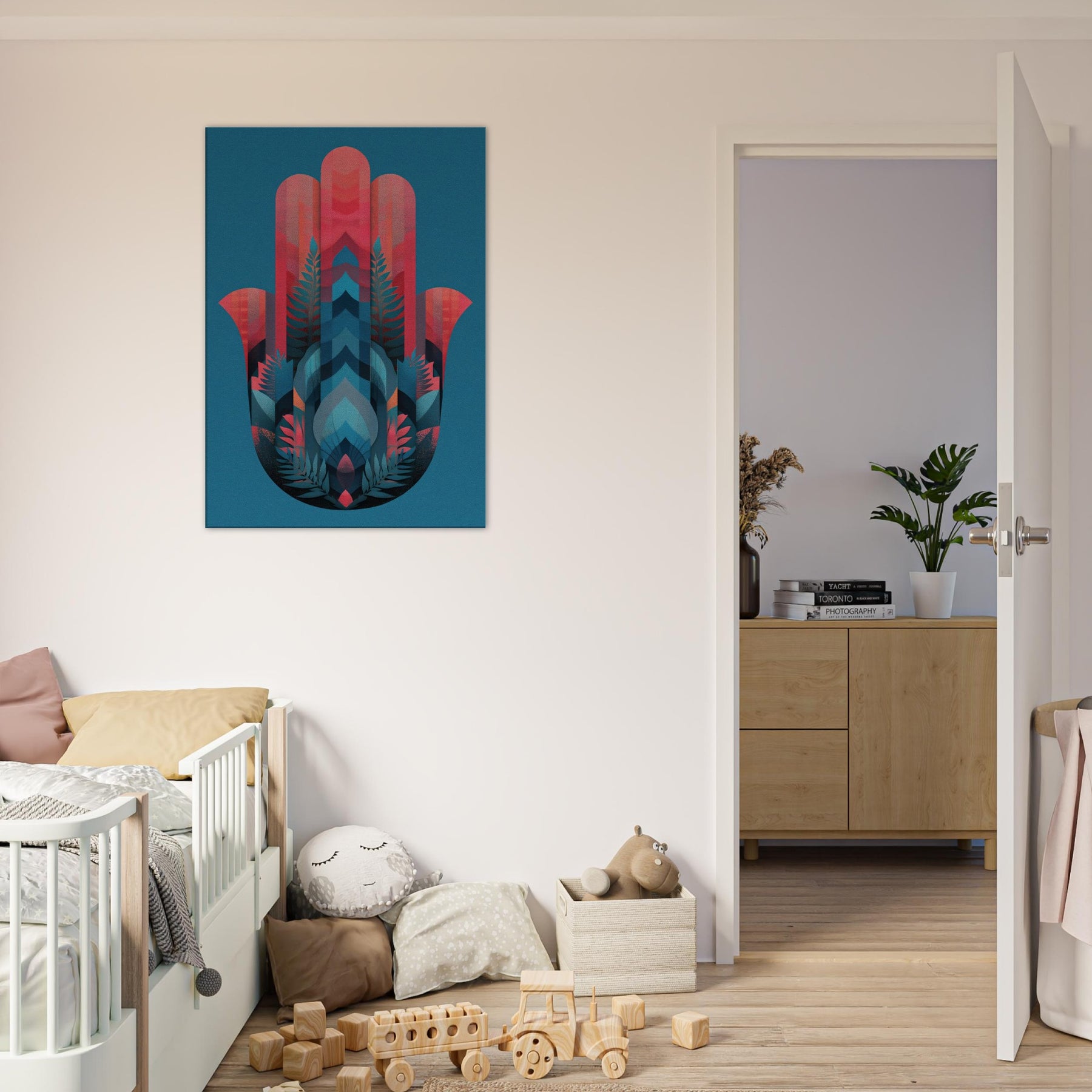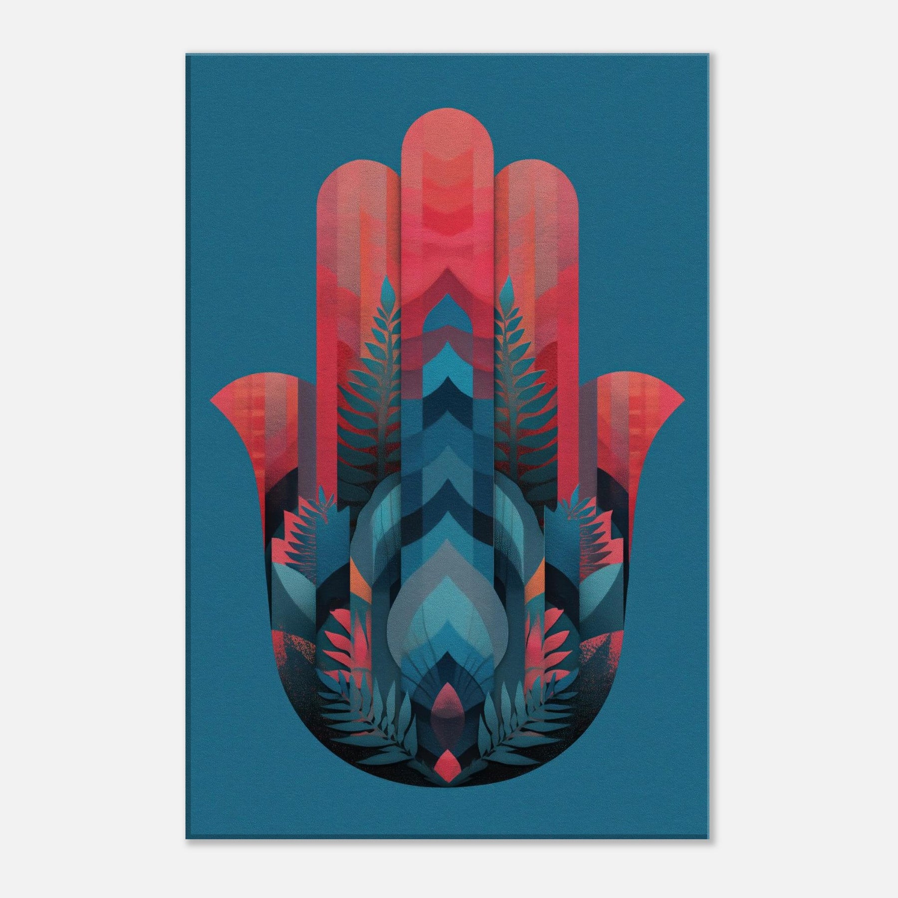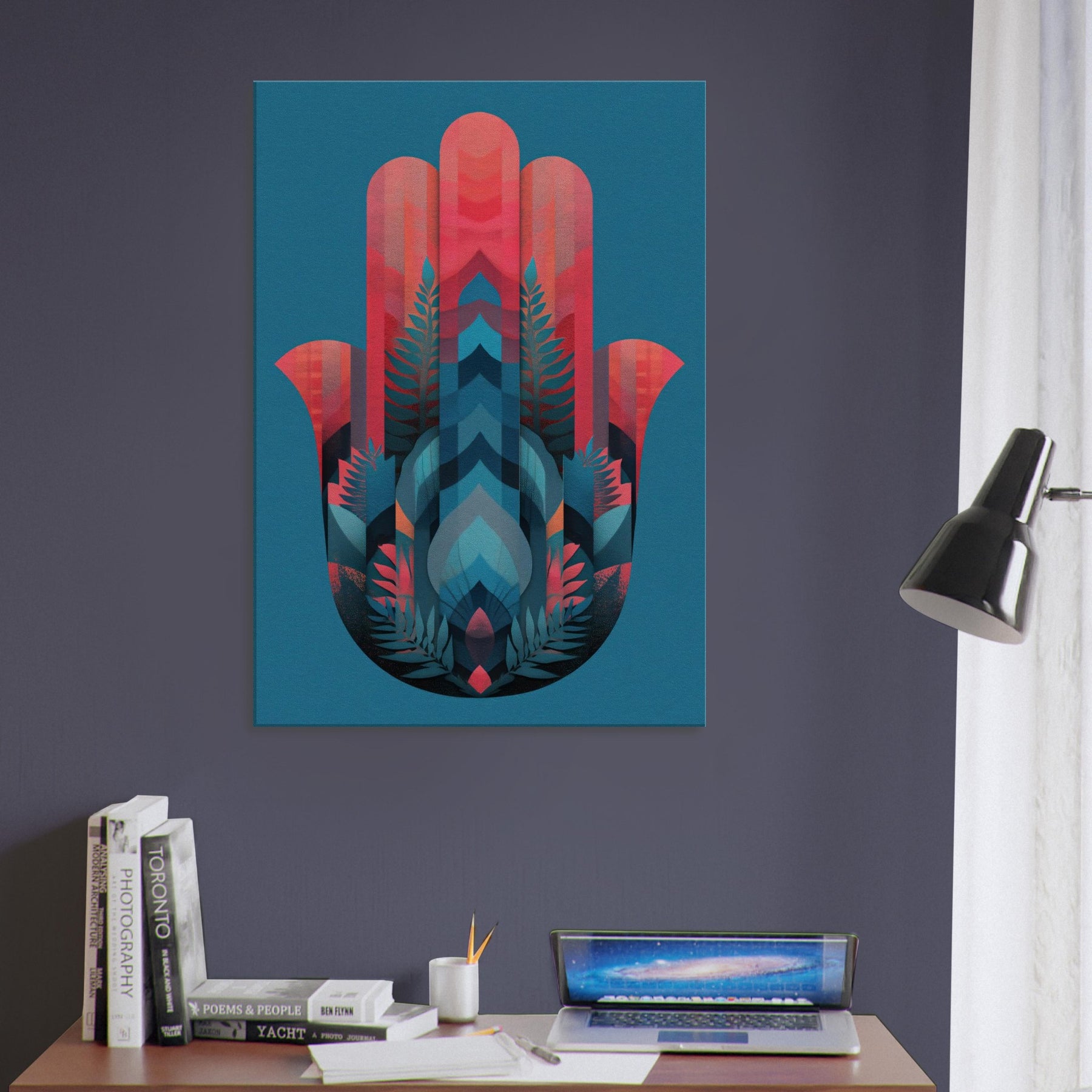 Immerse your space in the protective embrace of the Hamsa rendered as an abstract bloom. This art unfolds in layered teal, coral, and midnight tones, guiding the eye upward like a lantern of calm. The mystical palm becomes a doorway to balance, serenity, and quiet intention, turning a wall into a sanctuary. Let its luminous gradients catch the light at dusk, then glow softly through the evening. A modern centerpiece that harmonizes with contemporary decor while honoring timeless symbolism. The central subject is Hamsa (Hand of Fatima).