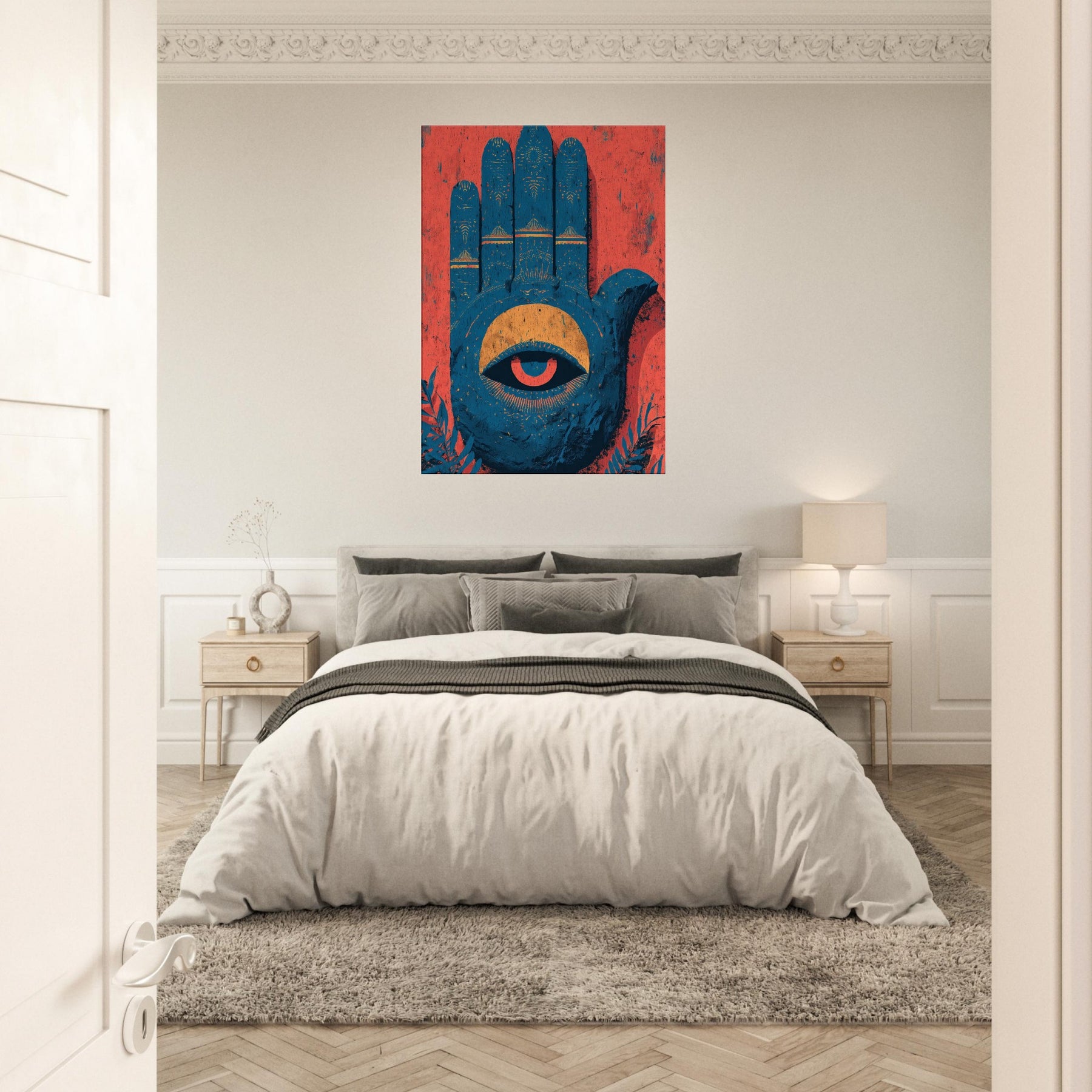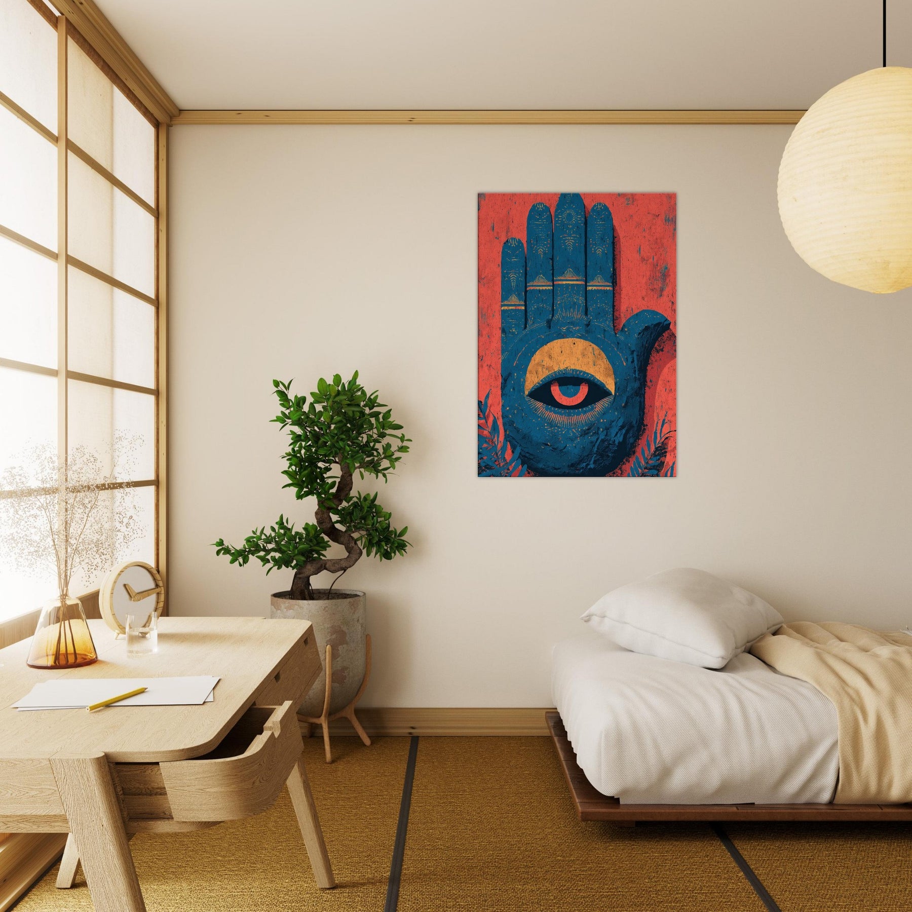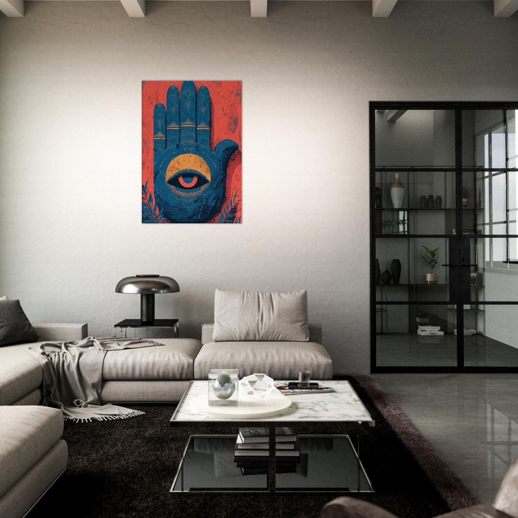 Invite a talisman of warmth and protection into your living space with this Hamsa inspired work. The hand, etched in electric cobalt and gilded arcs, cradles a watching eye that glows with quiet, ceremonial light. Its abstract textures ripple like breath across the canvas, turning walls into a sanctuary where mystery and comfort meet. Perfect above a sofa or in a hallway, it invites calm conversation and a sense of safety, turning everyday rooms into a softly lit temple of modern mystique. The central subject is Hamsa (Hand of Fatima).