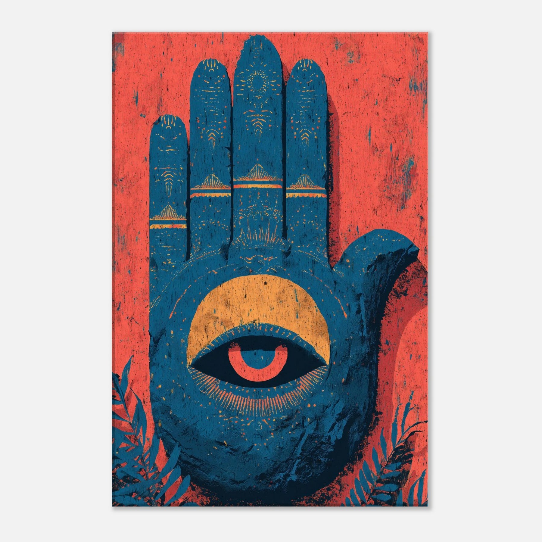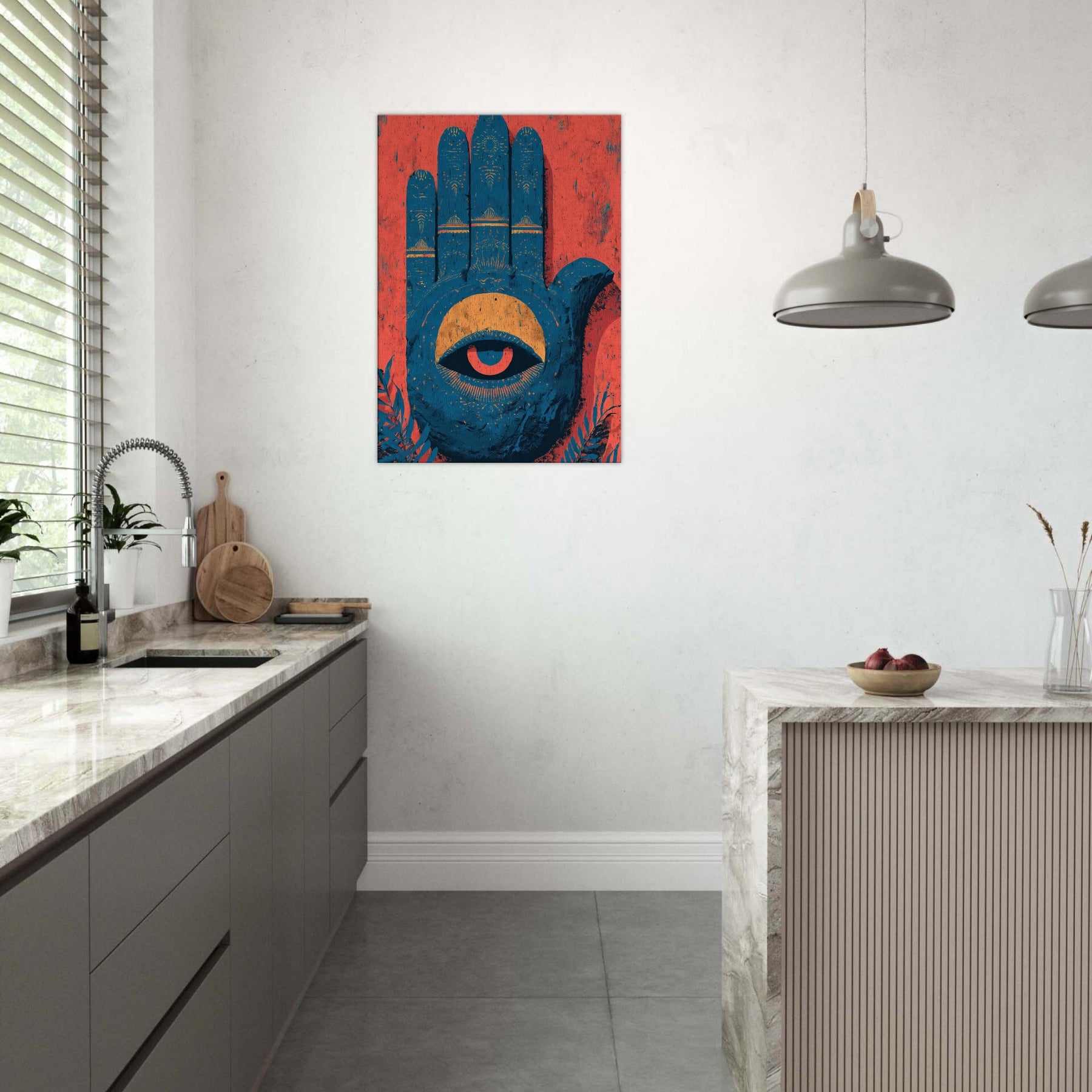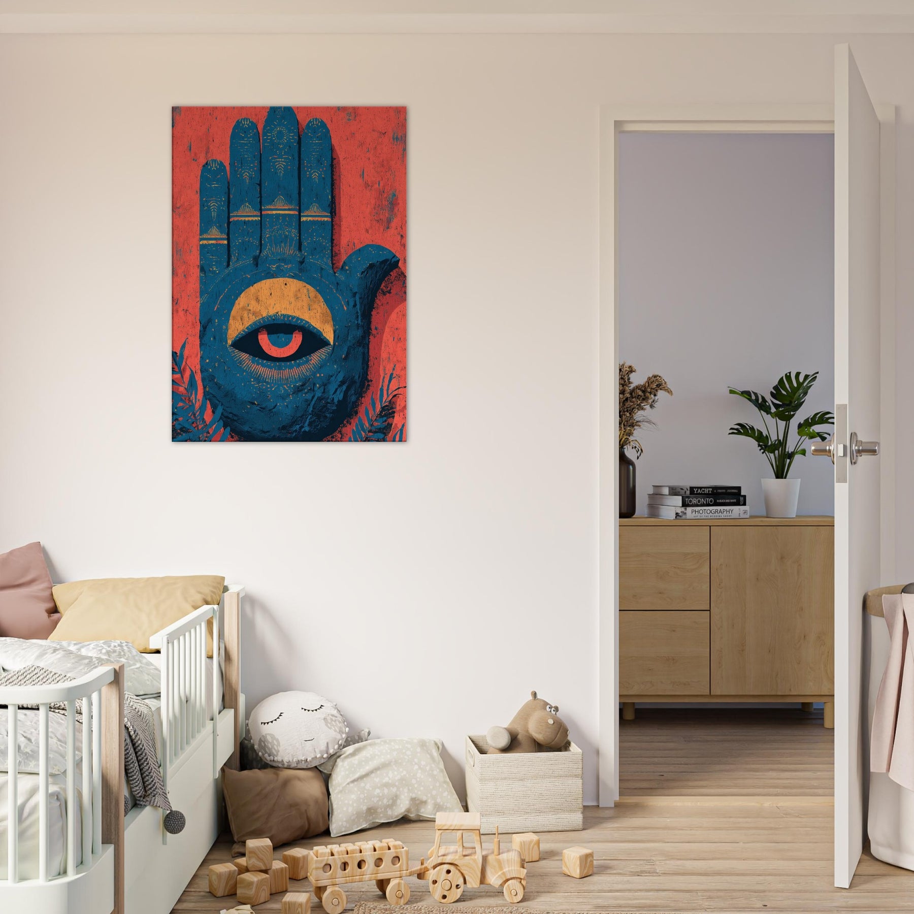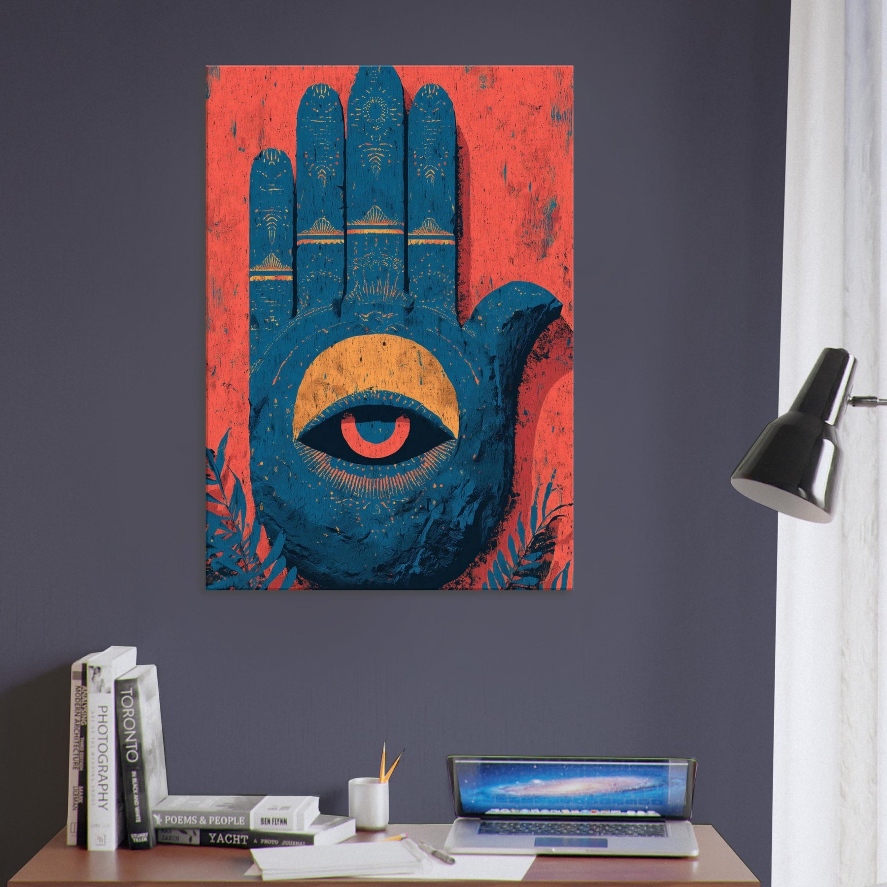 Invite a talisman of warmth and protection into your living space with this Hamsa inspired work. The hand, etched in electric cobalt and gilded arcs, cradles a watching eye that glows with quiet, ceremonial light. Its abstract textures ripple like breath across the canvas, turning walls into a sanctuary where mystery and comfort meet. Perfect above a sofa or in a hallway, it invites calm conversation and a sense of safety, turning everyday rooms into a softly lit temple of modern mystique. The central subject is Hamsa (Hand of Fatima).