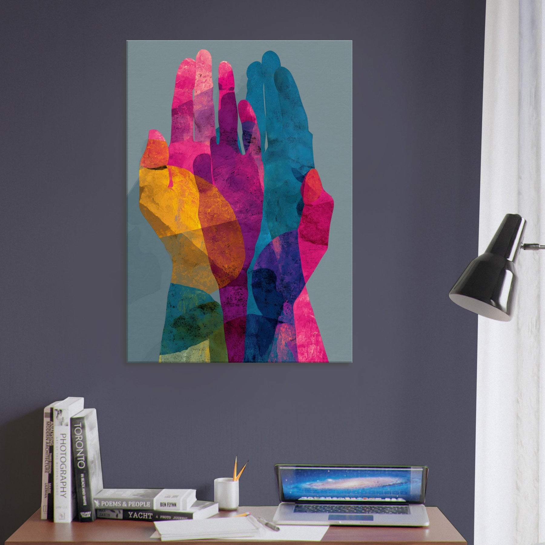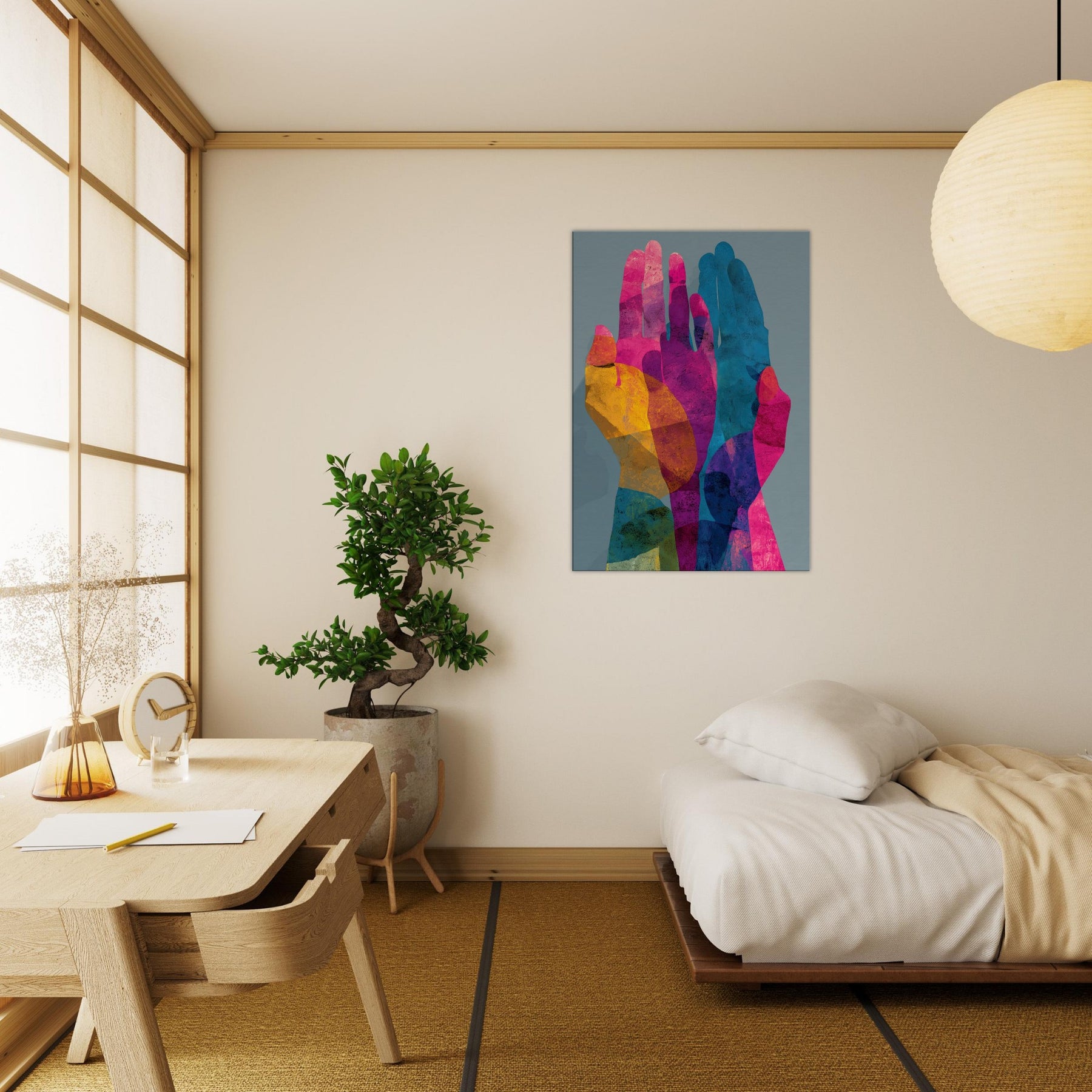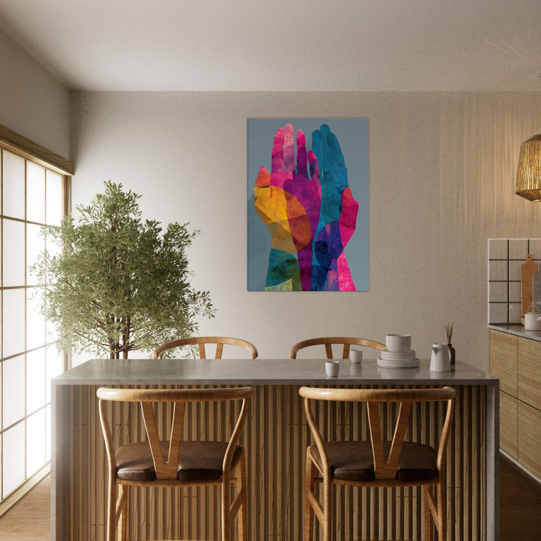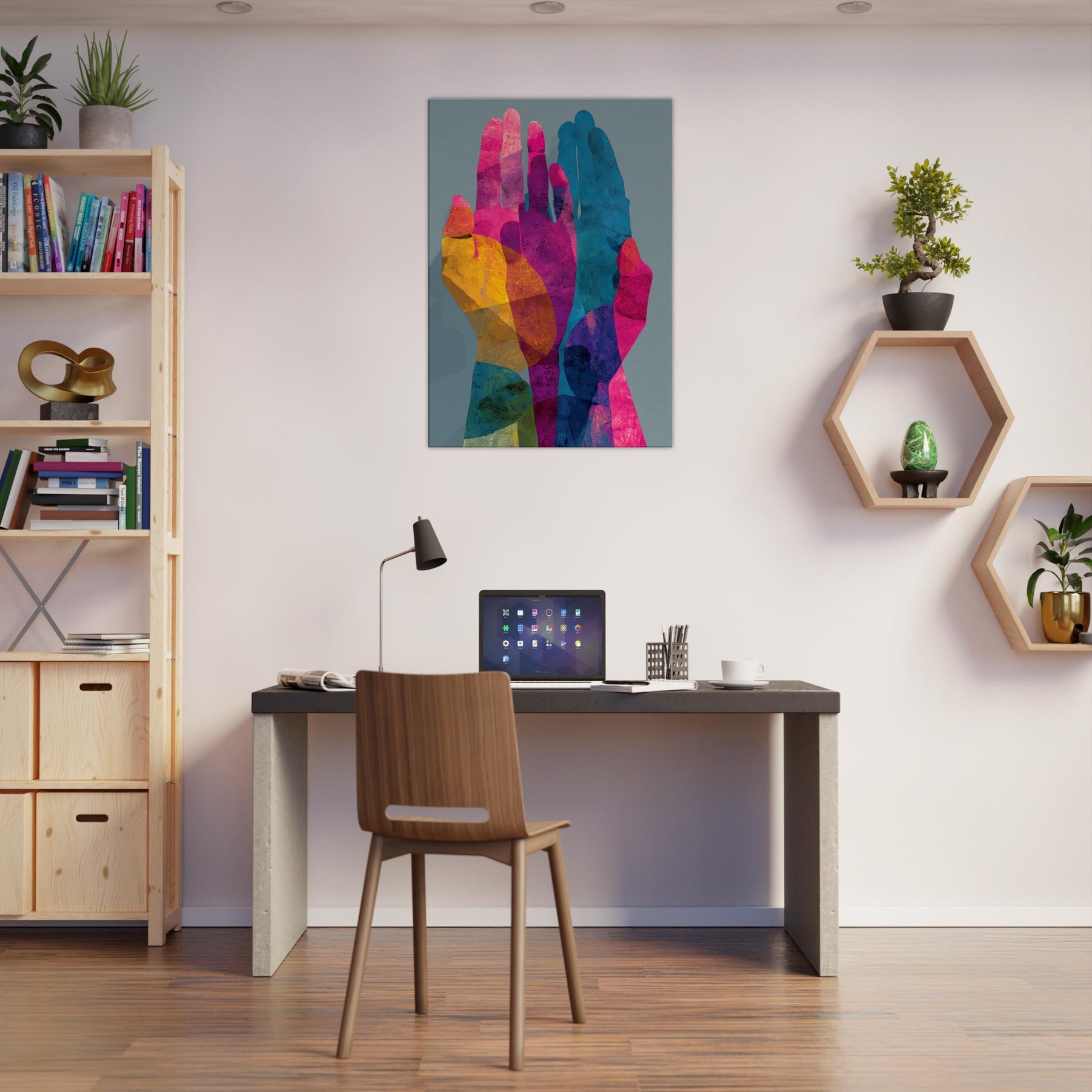 An entrancing meditation in color, this Hands Line Art piece dissolves form into a luminous chorus of arcs and shadows. The abstract faces and bodies mingle through translucent skins of magenta, teal, and gold, inviting a warm, contemplative mood to any room. Hang it where dawn light or evening glow can wash over the lines, turning a hallway or living space into a gallery of quiet conversation. This work speaks of connection, memory, and the pull of touch, inviting viewers to linger.