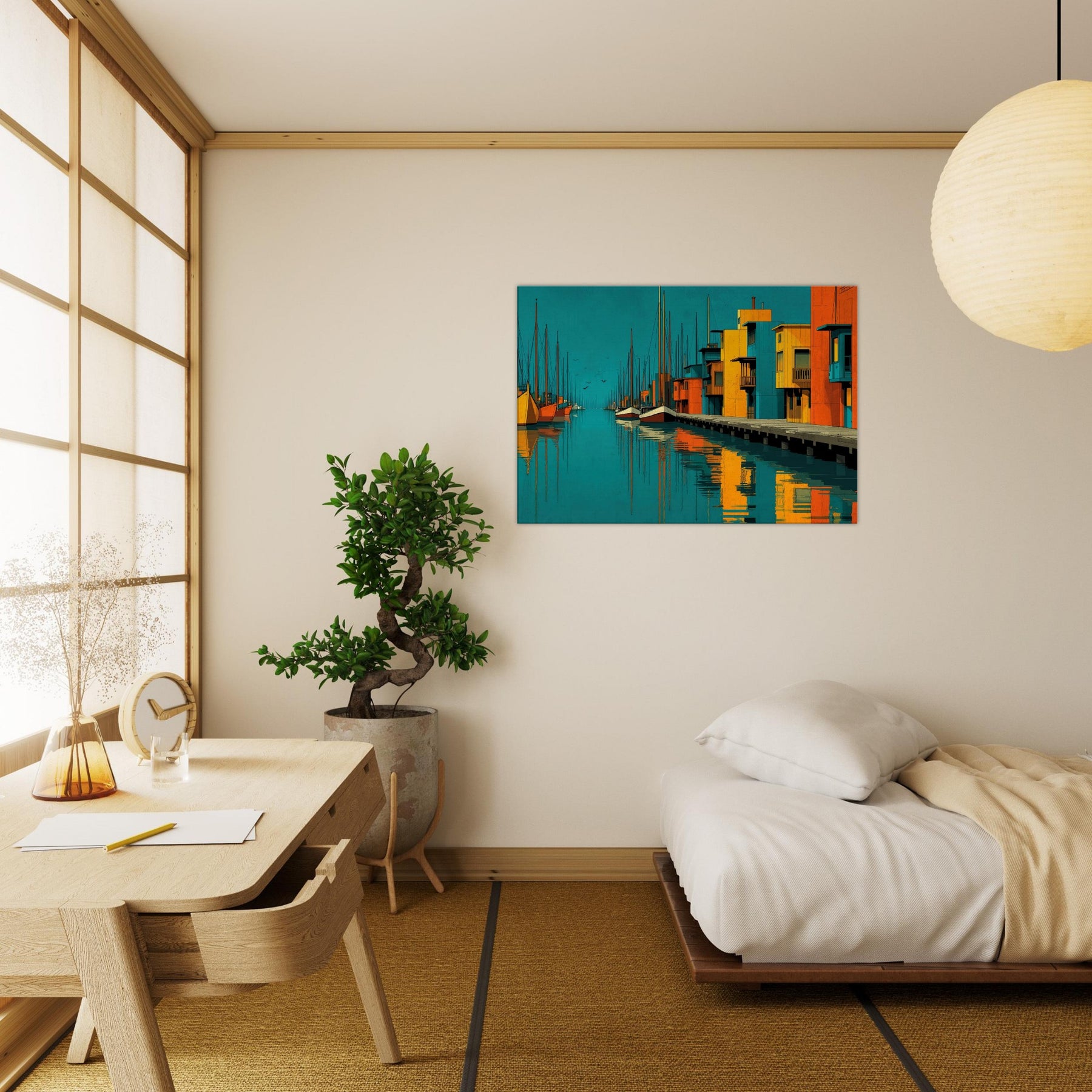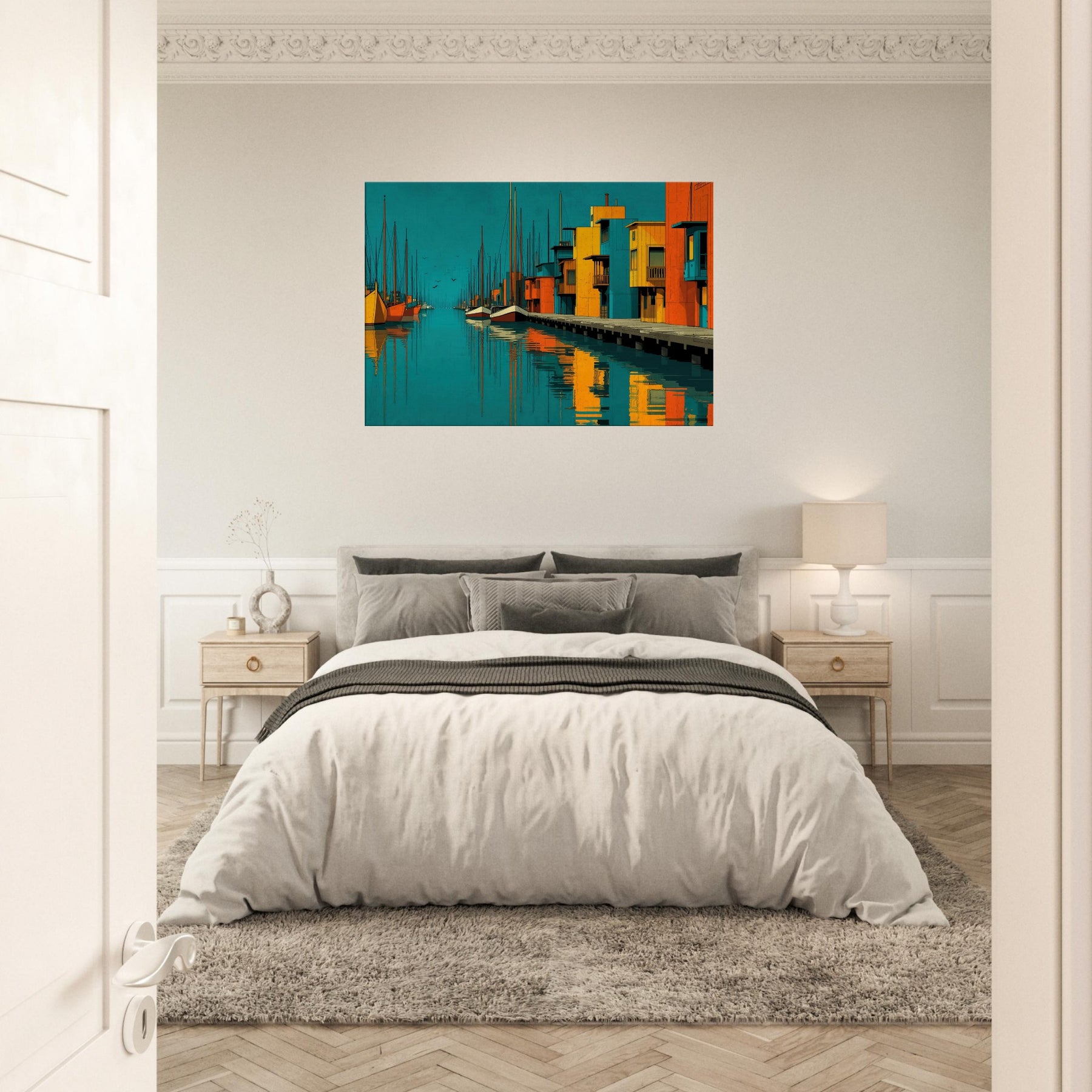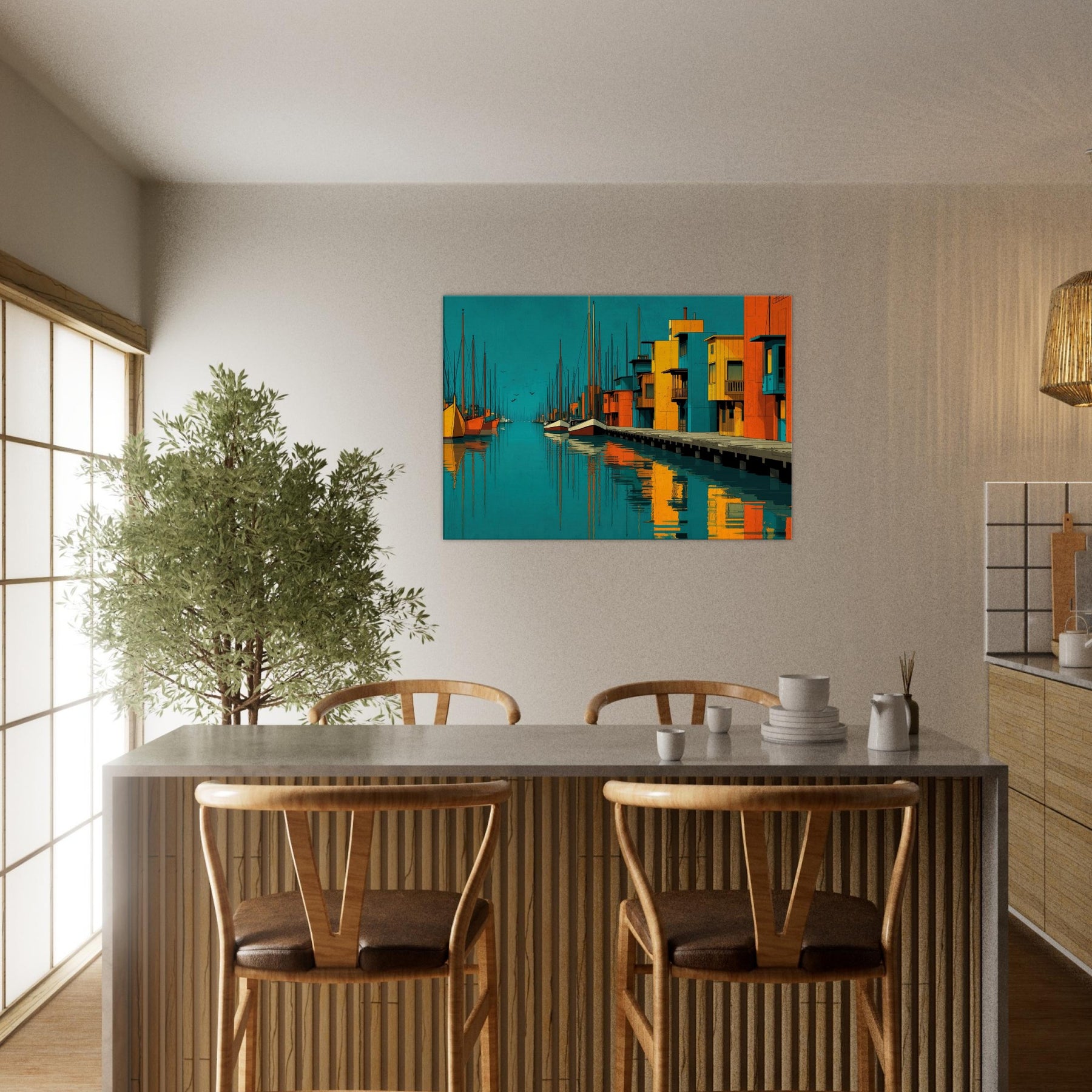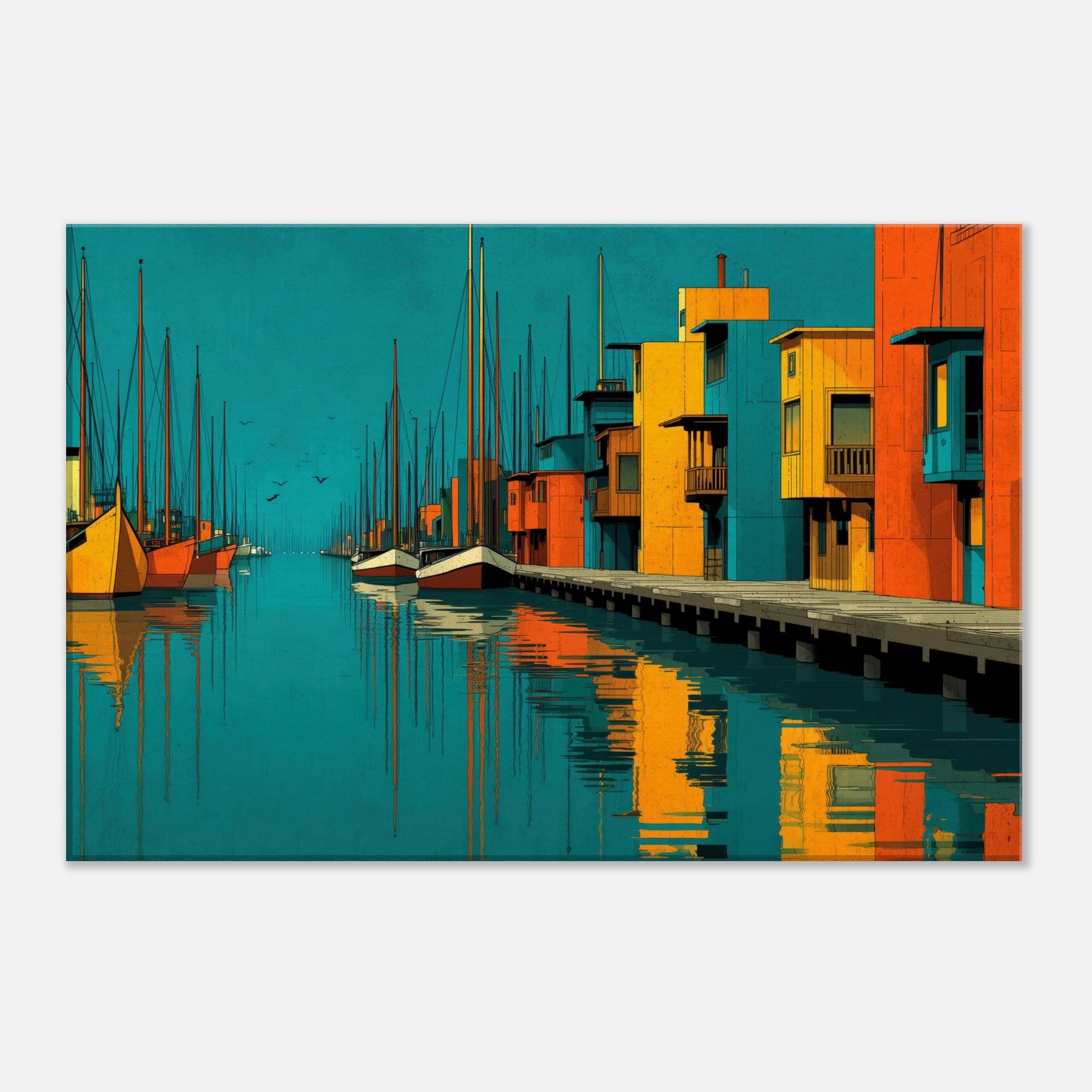 Harbor unfolds as an abstract city by the water, where turquoise tides kiss sunlit piers and bold blocks of color sketch a living rhythm. This piece invites the eye to travel along sketched masts, mirrored reflections, and the quiet pulse of harbor life. The atmosphere is both serene and electric, a daily escape that warms a wall with warmth, depth, and coastal memory. Perfect above a sofa or bedside table, it enriches texture, tone, and conversation in any bright, modern space.