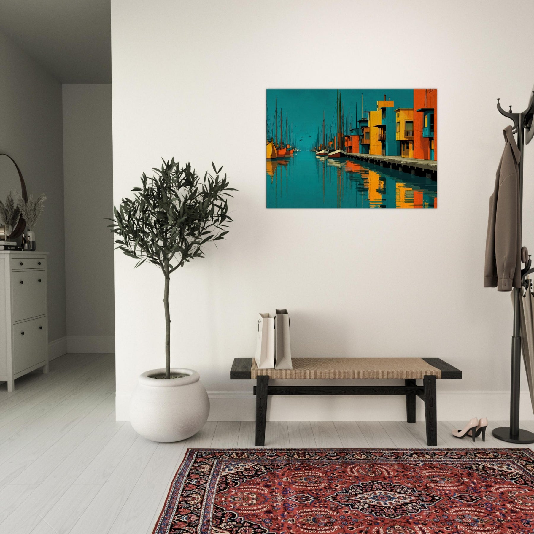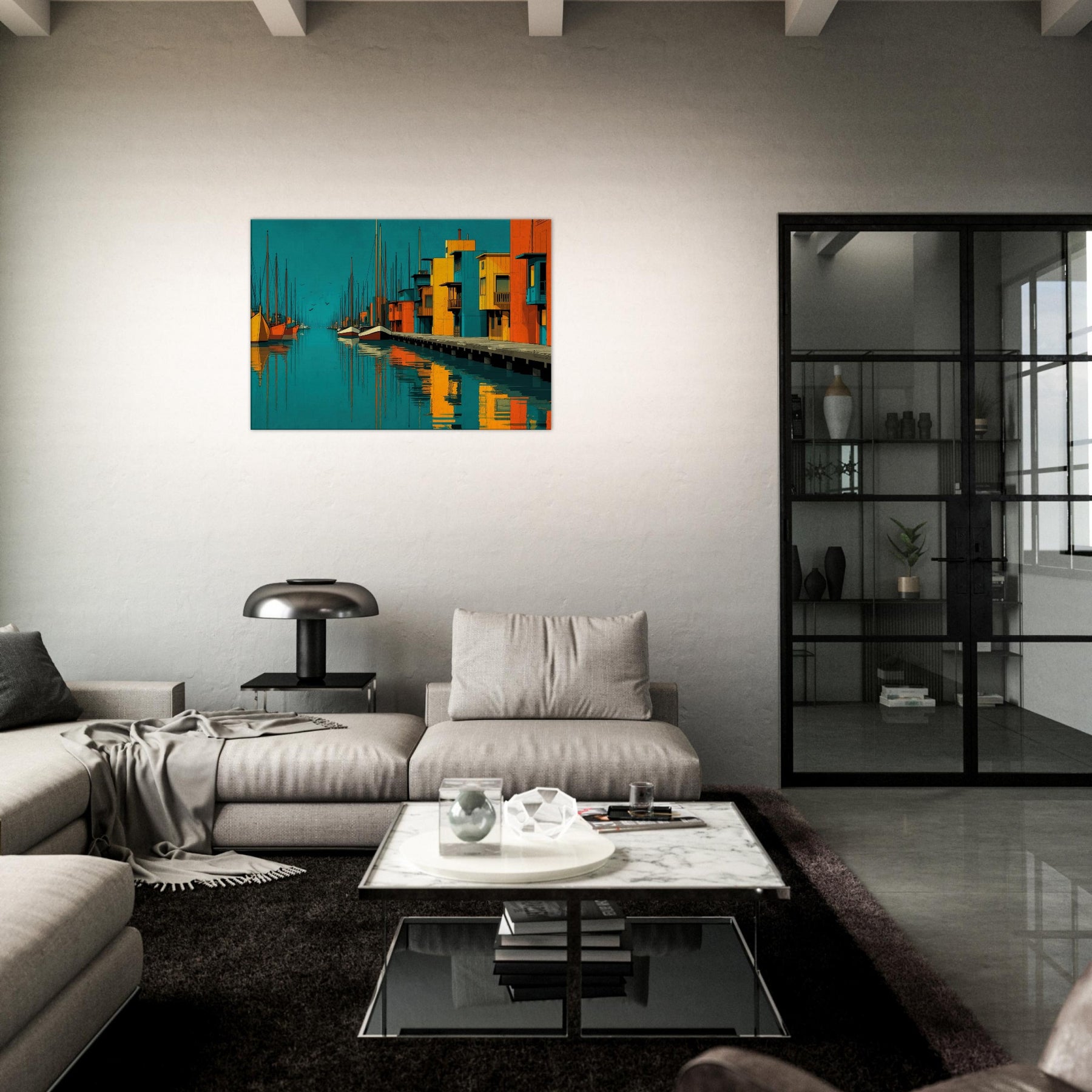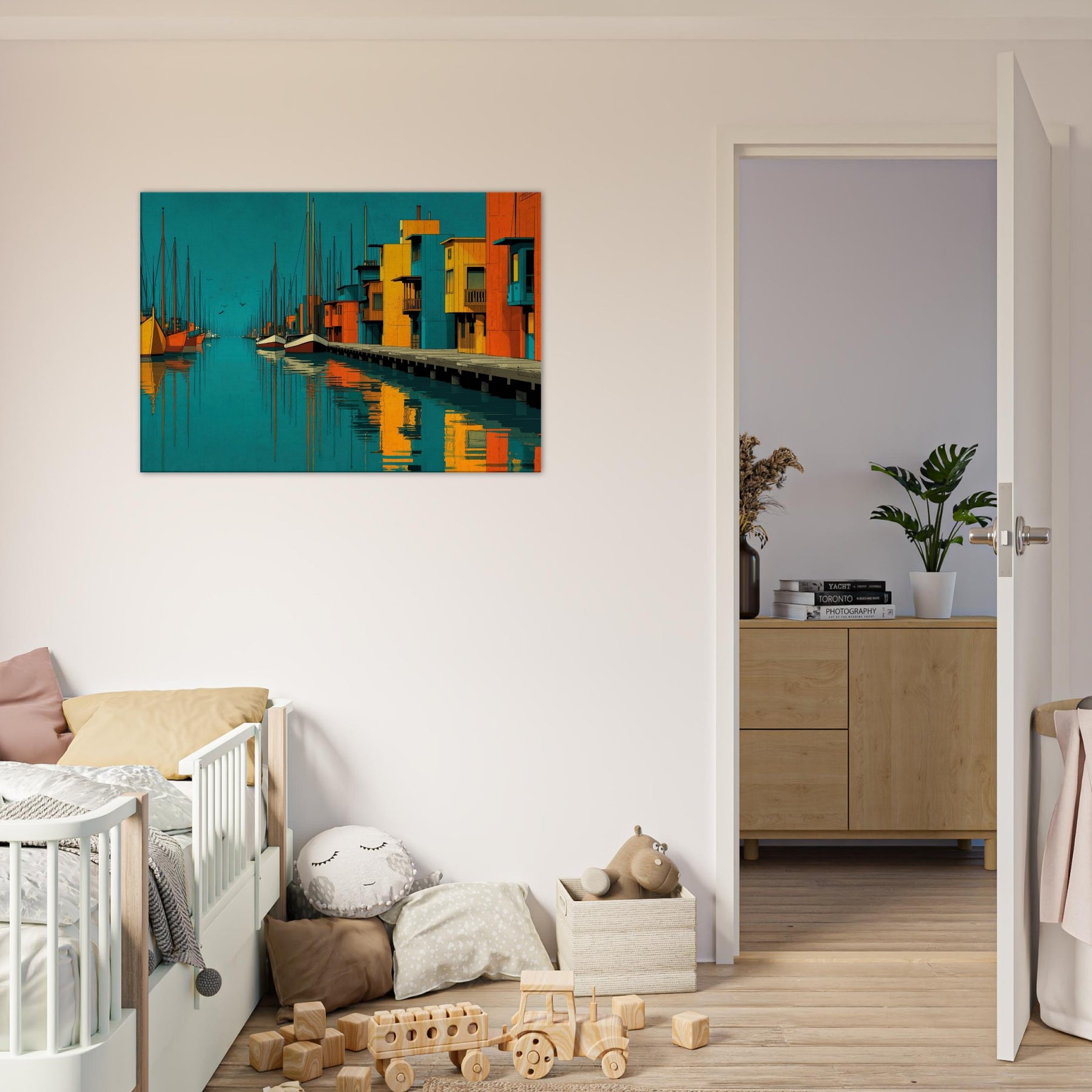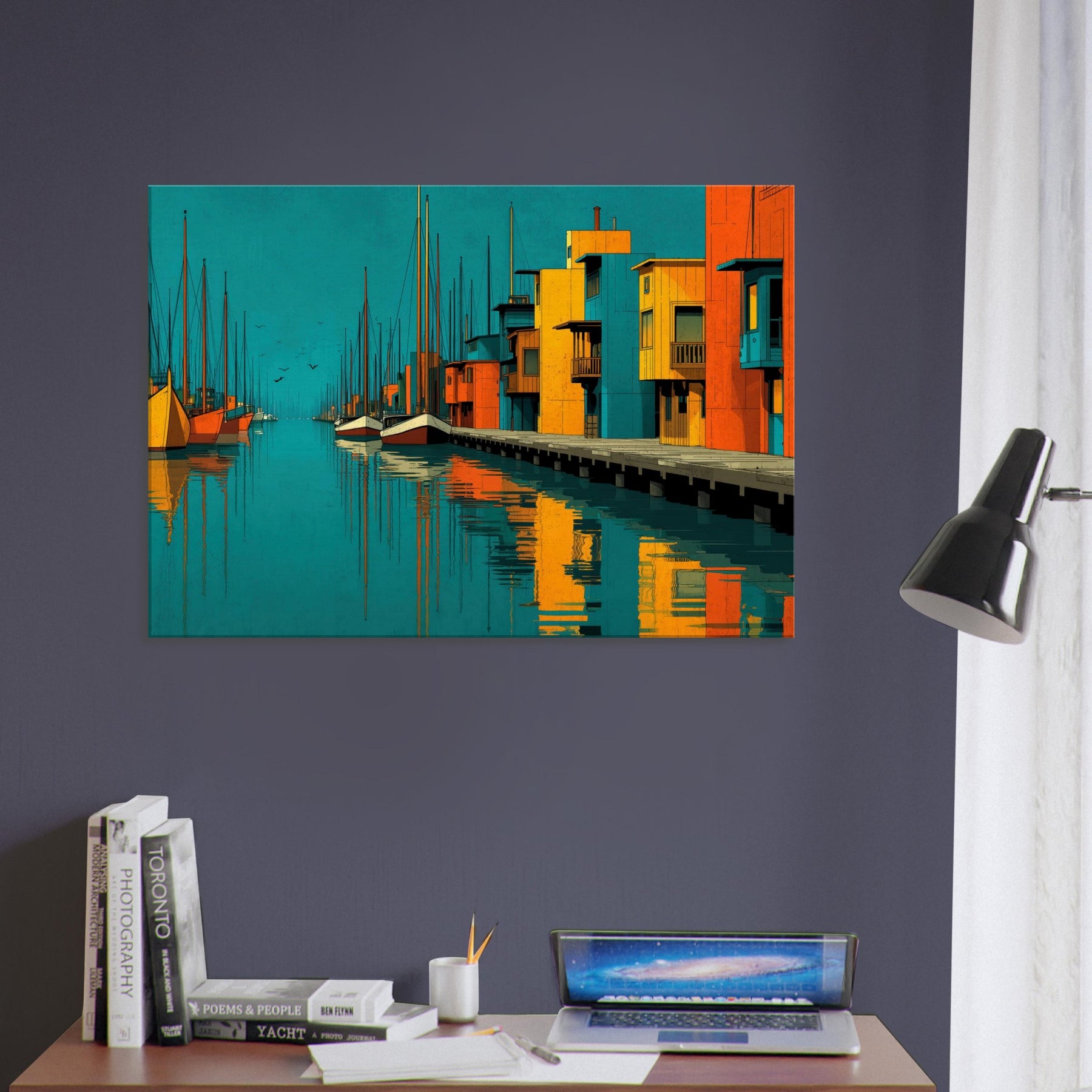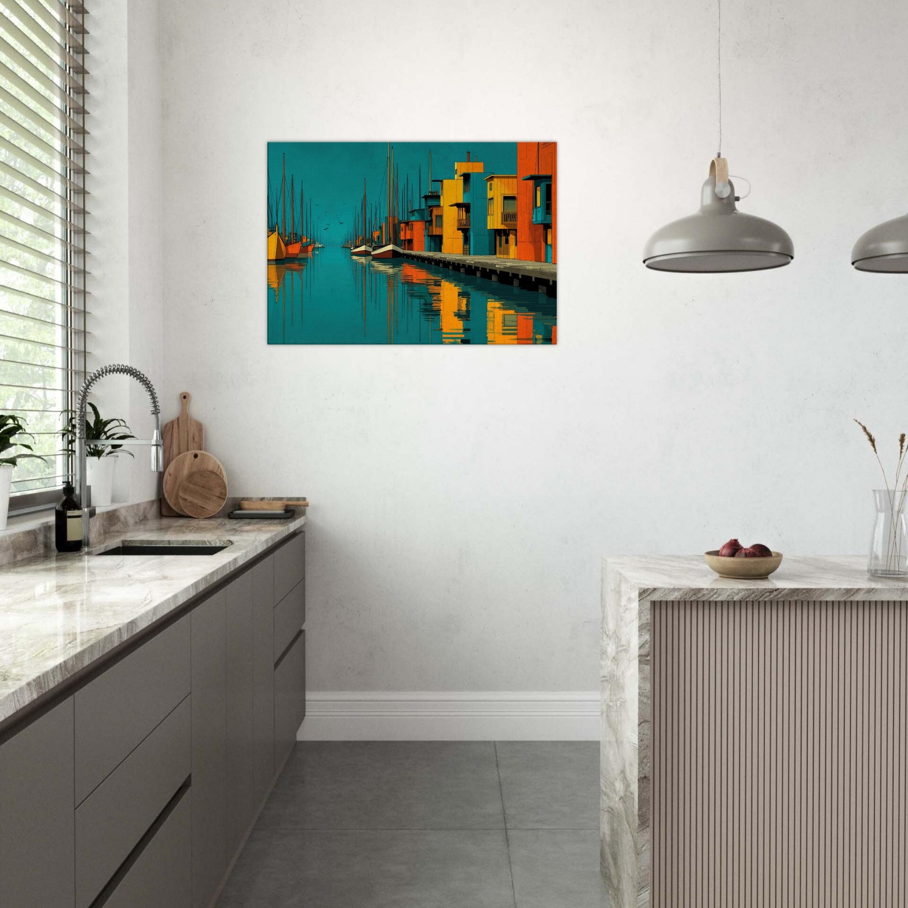 Harbor unfolds as an abstract city by the water, where turquoise tides kiss sunlit piers and bold blocks of color sketch a living rhythm. This piece invites the eye to travel along sketched masts, mirrored reflections, and the quiet pulse of harbor life. The atmosphere is both serene and electric, a daily escape that warms a wall with warmth, depth, and coastal memory. Perfect above a sofa or bedside table, it enriches texture, tone, and conversation in any bright, modern space.