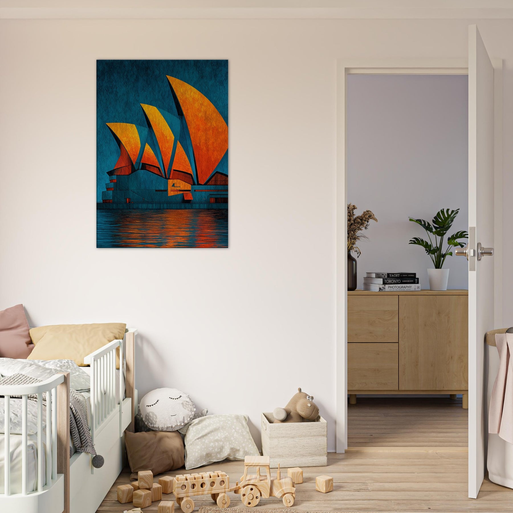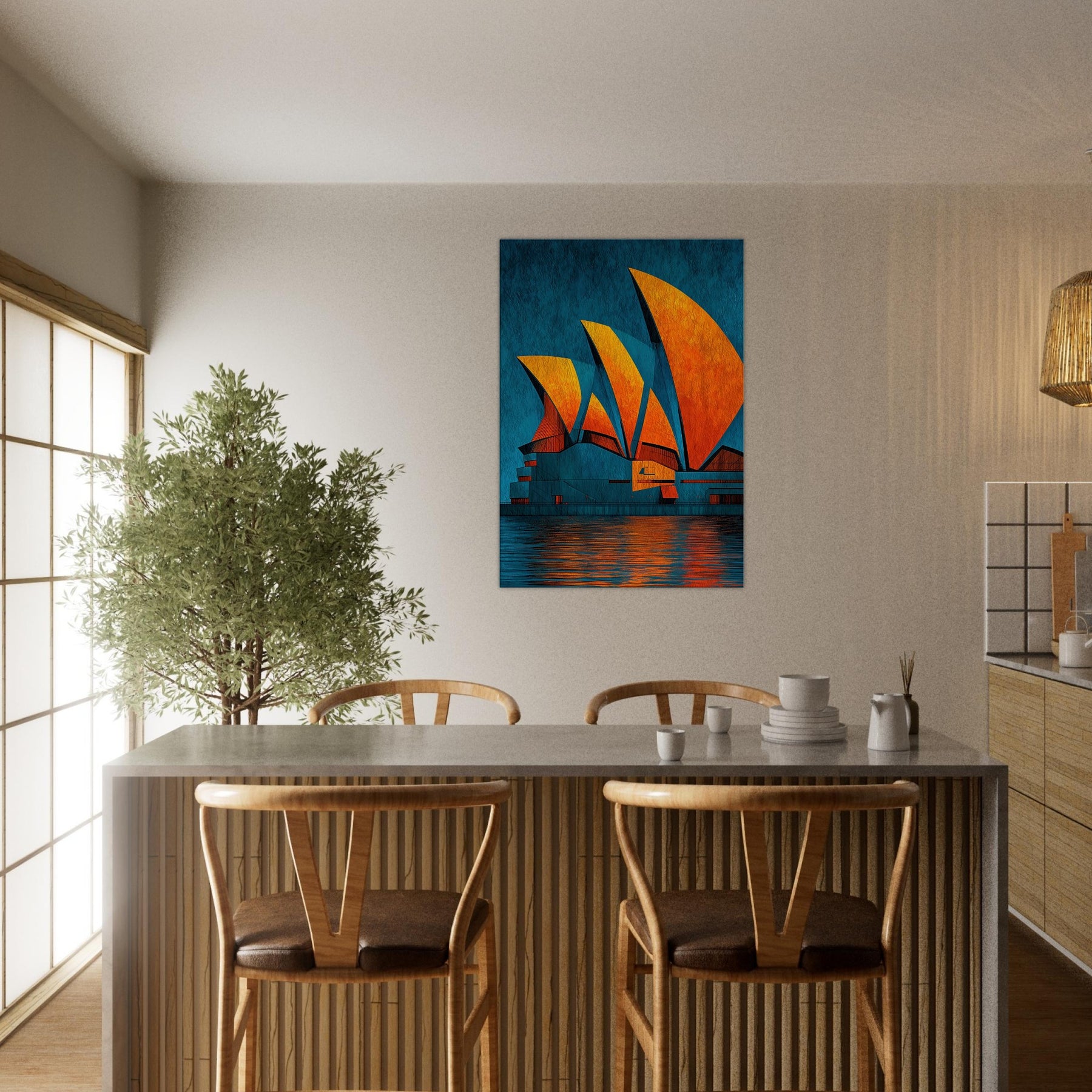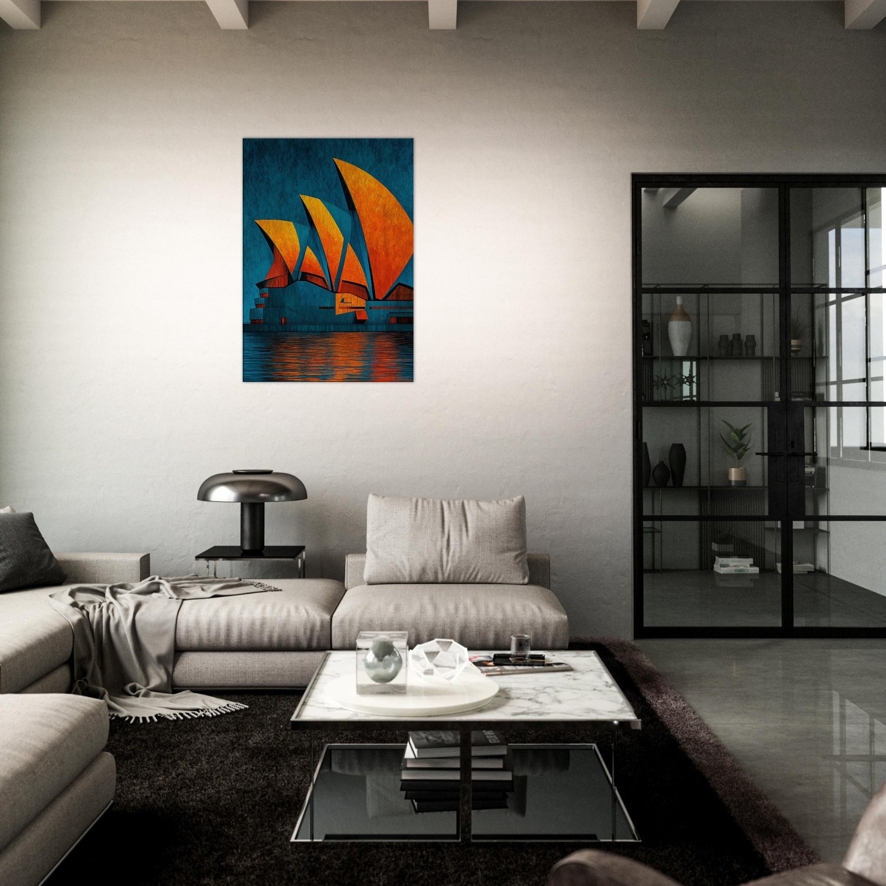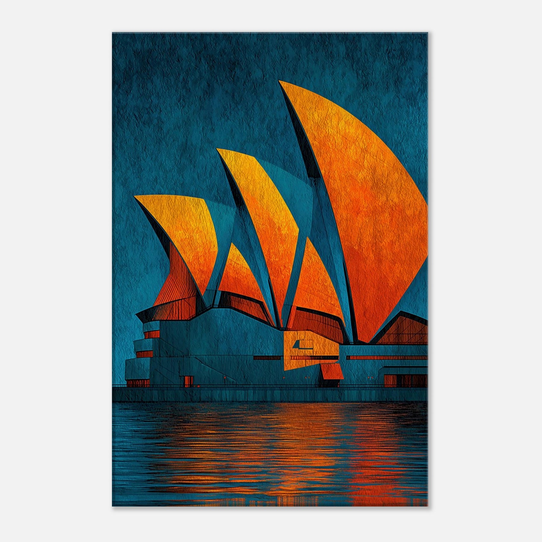 Let the Sydney Opera House unfold in bold, sun warmed strokes that glow against a midnight teal sea. This abstract interpretation invites the eye to sail along the arches, catching the shimmer of light on water and the hush of a harbor at dusk. The piece breathes with texture and depth, adding atmosphere and motion to any living room, making walls feel like a shoreline of memory and possibility where architecture becomes a sensual .