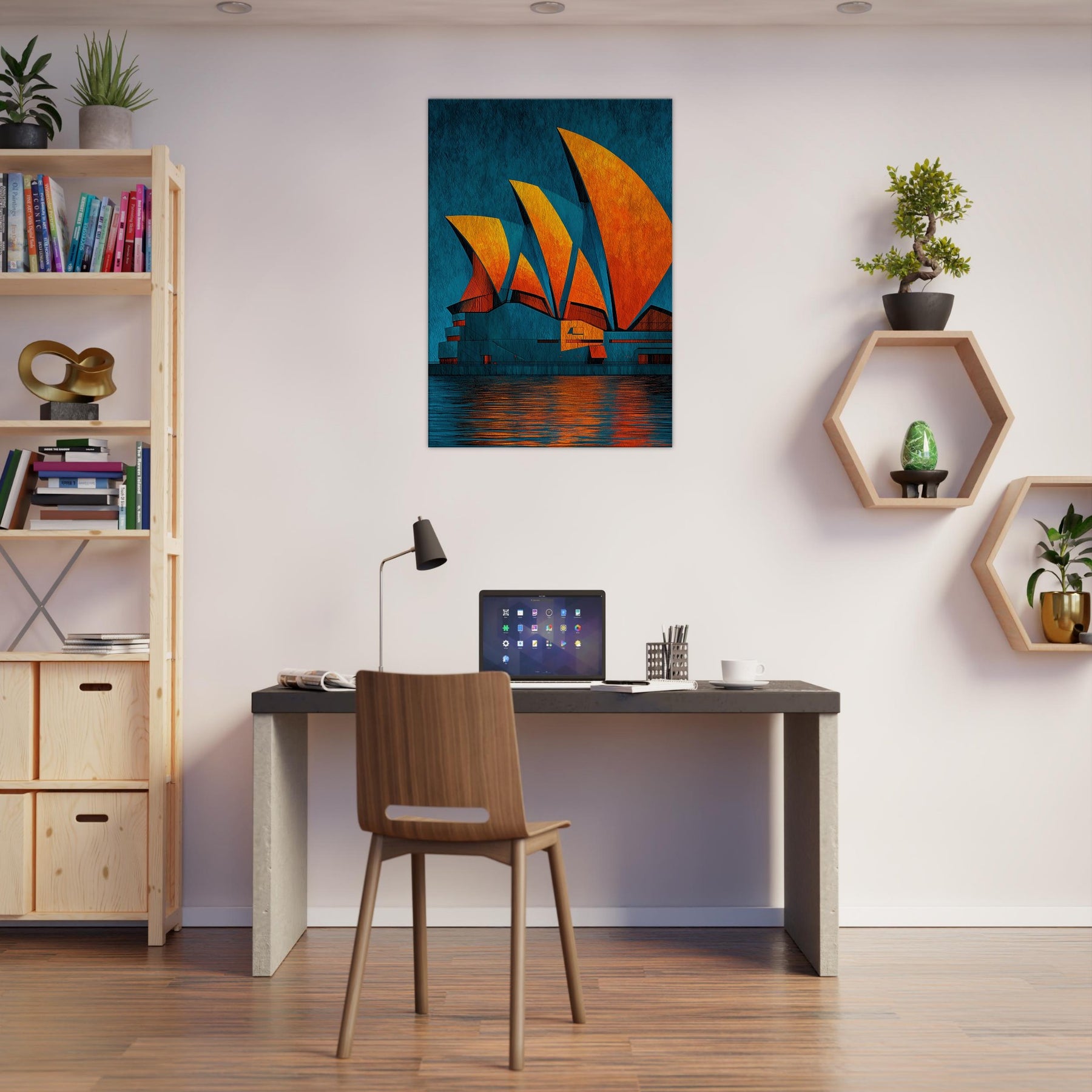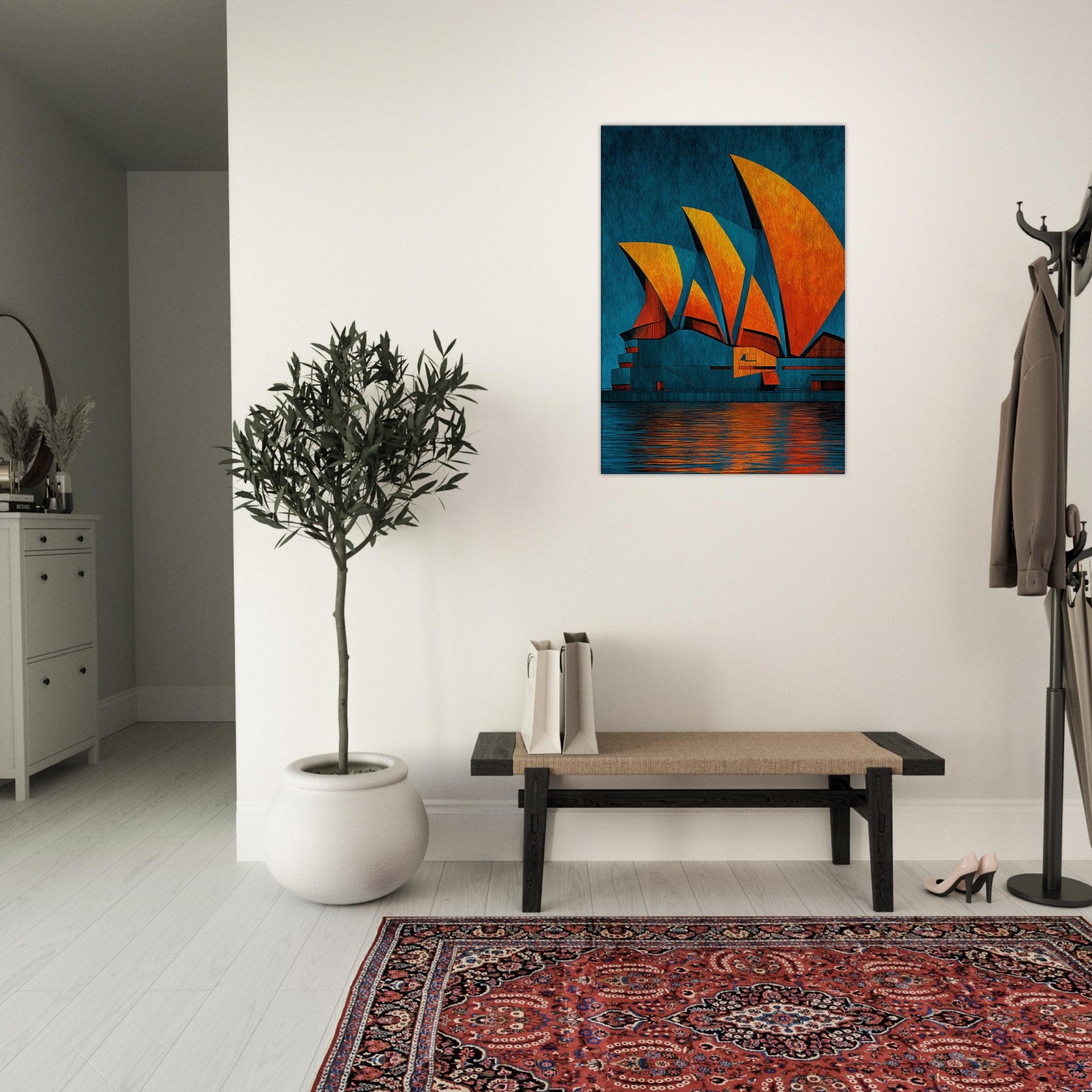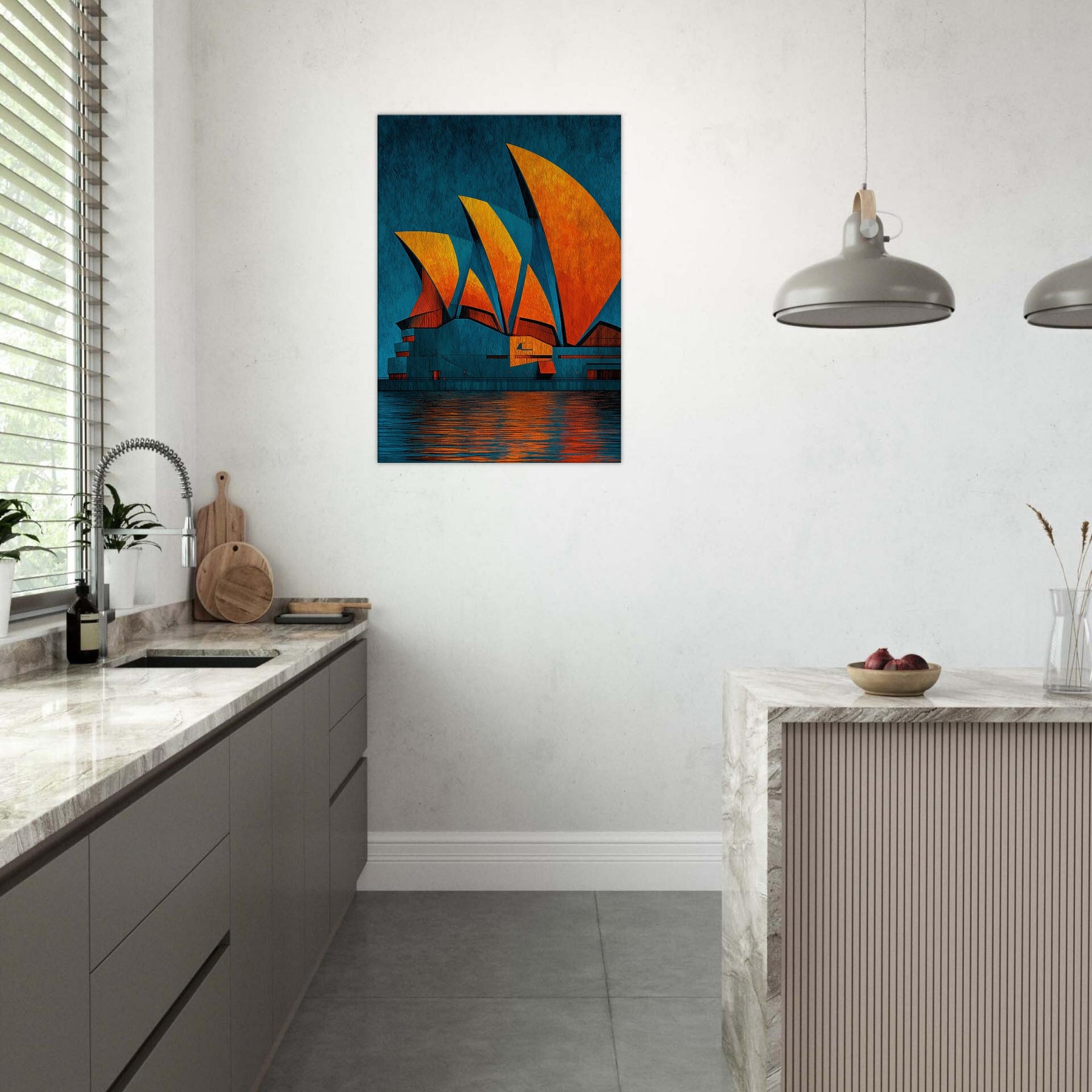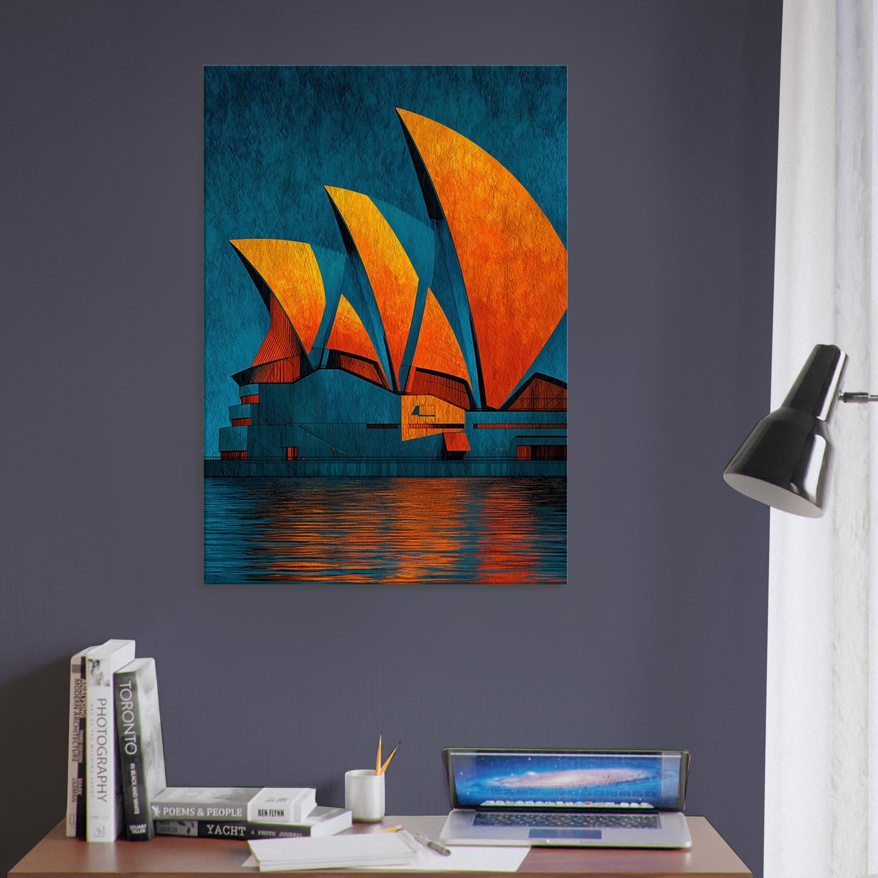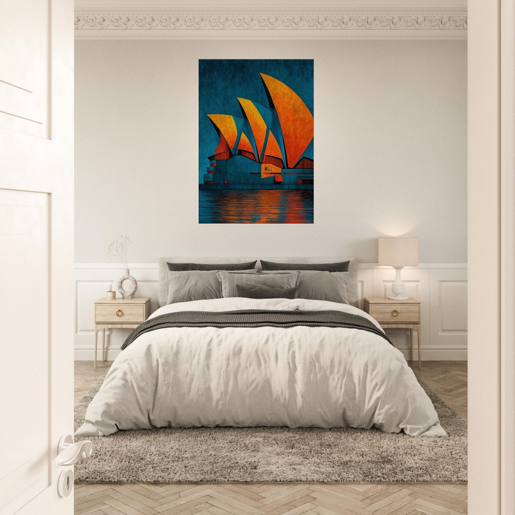 Let the Sydney Opera House unfold in bold, sun warmed strokes that glow against a midnight teal sea. This abstract interpretation invites the eye to sail along the arches, catching the shimmer of light on water and the hush of a harbor at dusk. The piece breathes with texture and depth, adding atmosphere and motion to any living room, making walls feel like a shoreline of memory and possibility where architecture becomes a sensual .