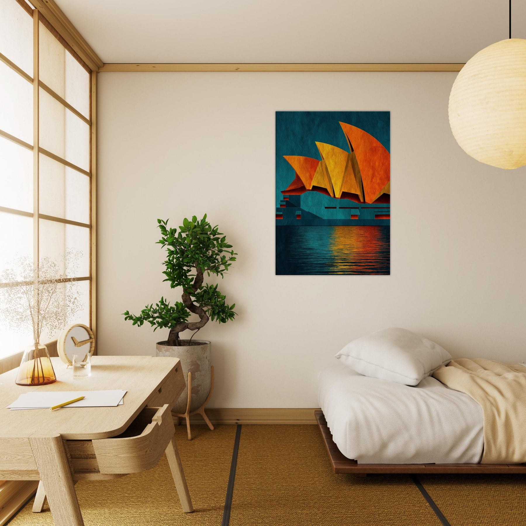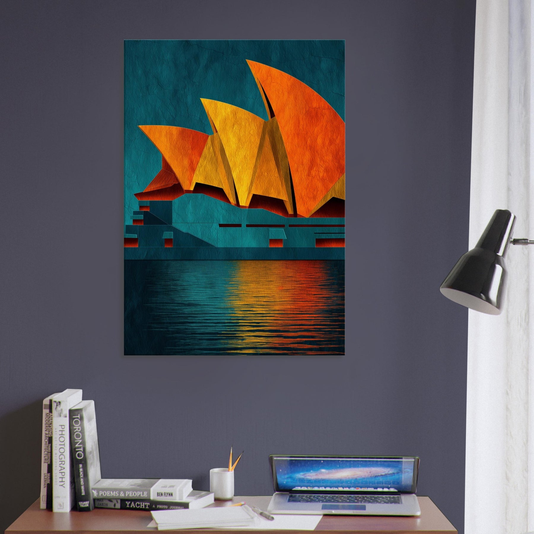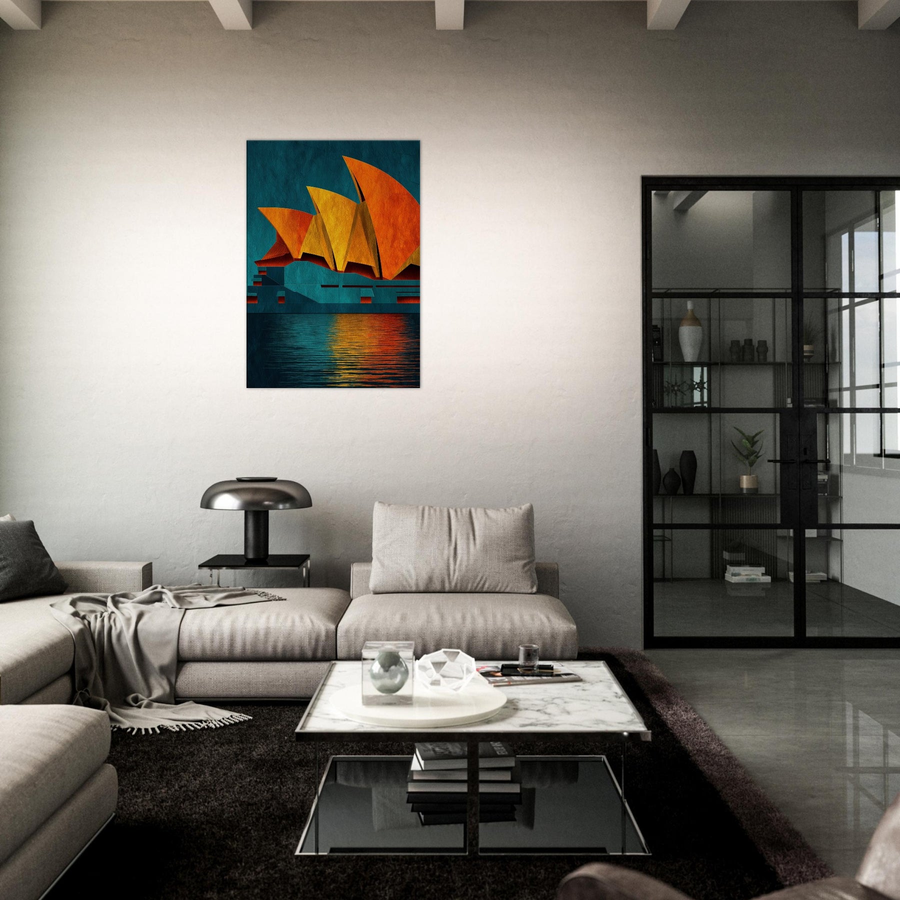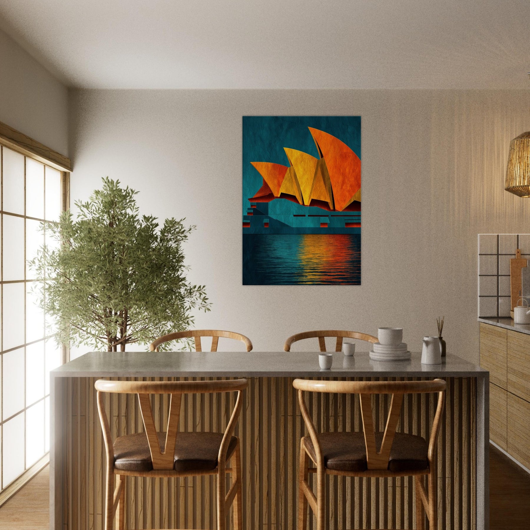 Let the Sydney Opera House shimmer as a sunset silhouette, its sails unfurling in warm oranges and deep golds. This abstract interpretation invites a hush of sea breeze and city lamps, wrapping your space in a soft, melodic glow. The piece breathes atmosphere into a living room, pairing with mineral blues and charcoal accents to create a calm, sophisticated vignette. Hang it where conversations ripple, and let the harbor of memory illuminate every everyday moment.