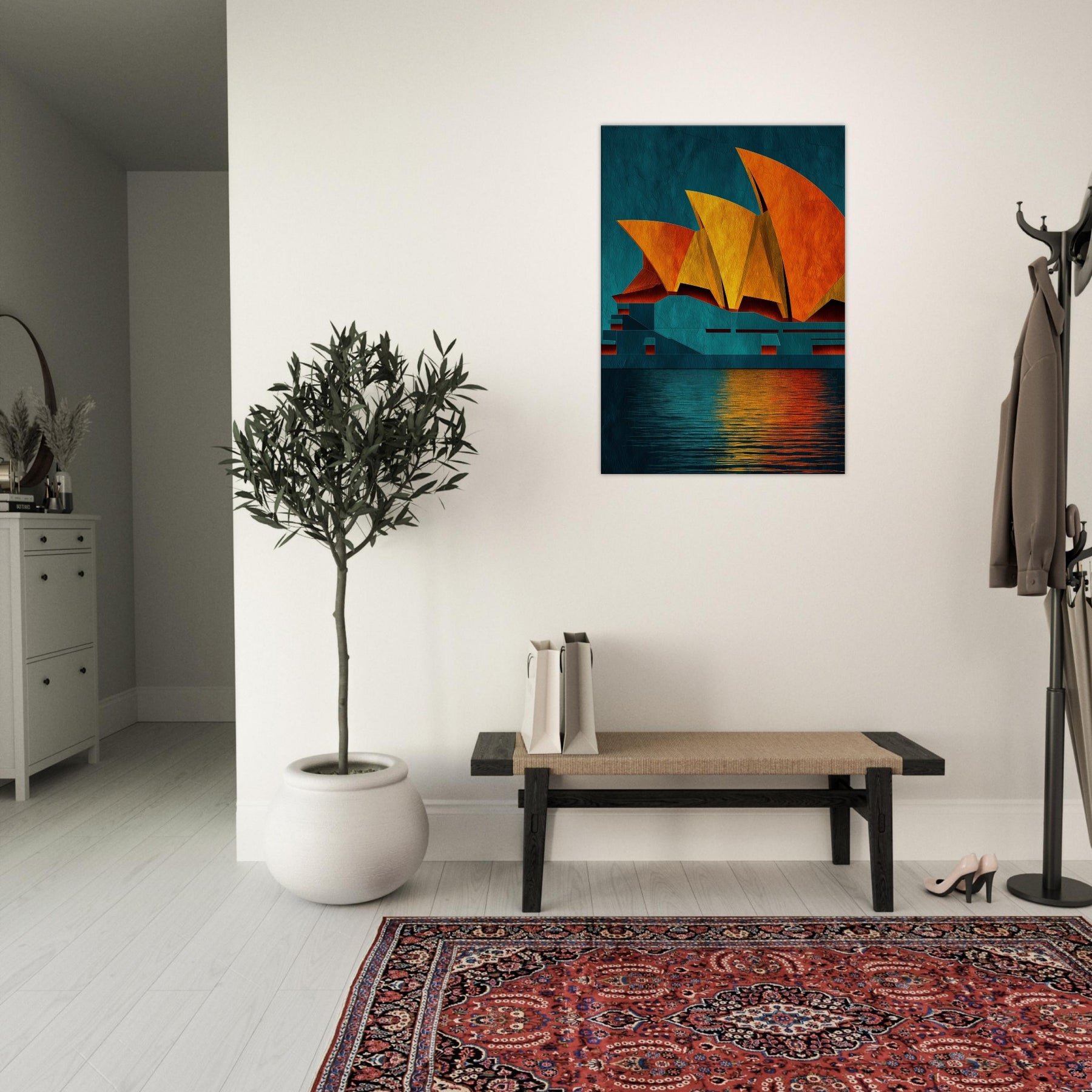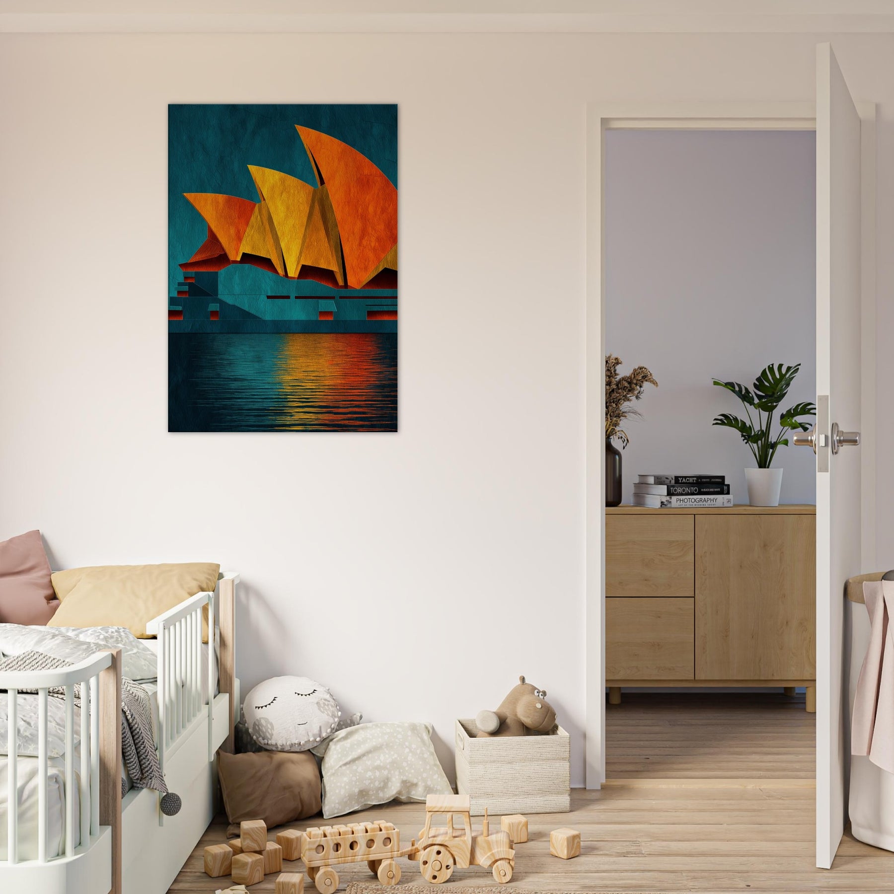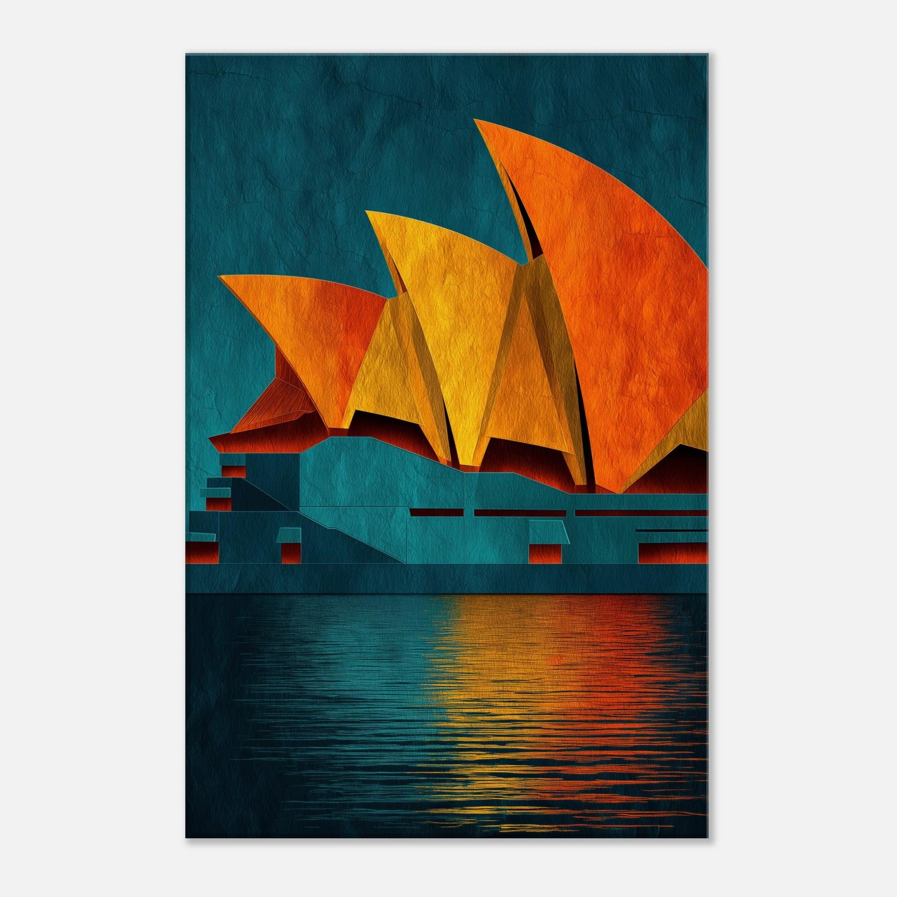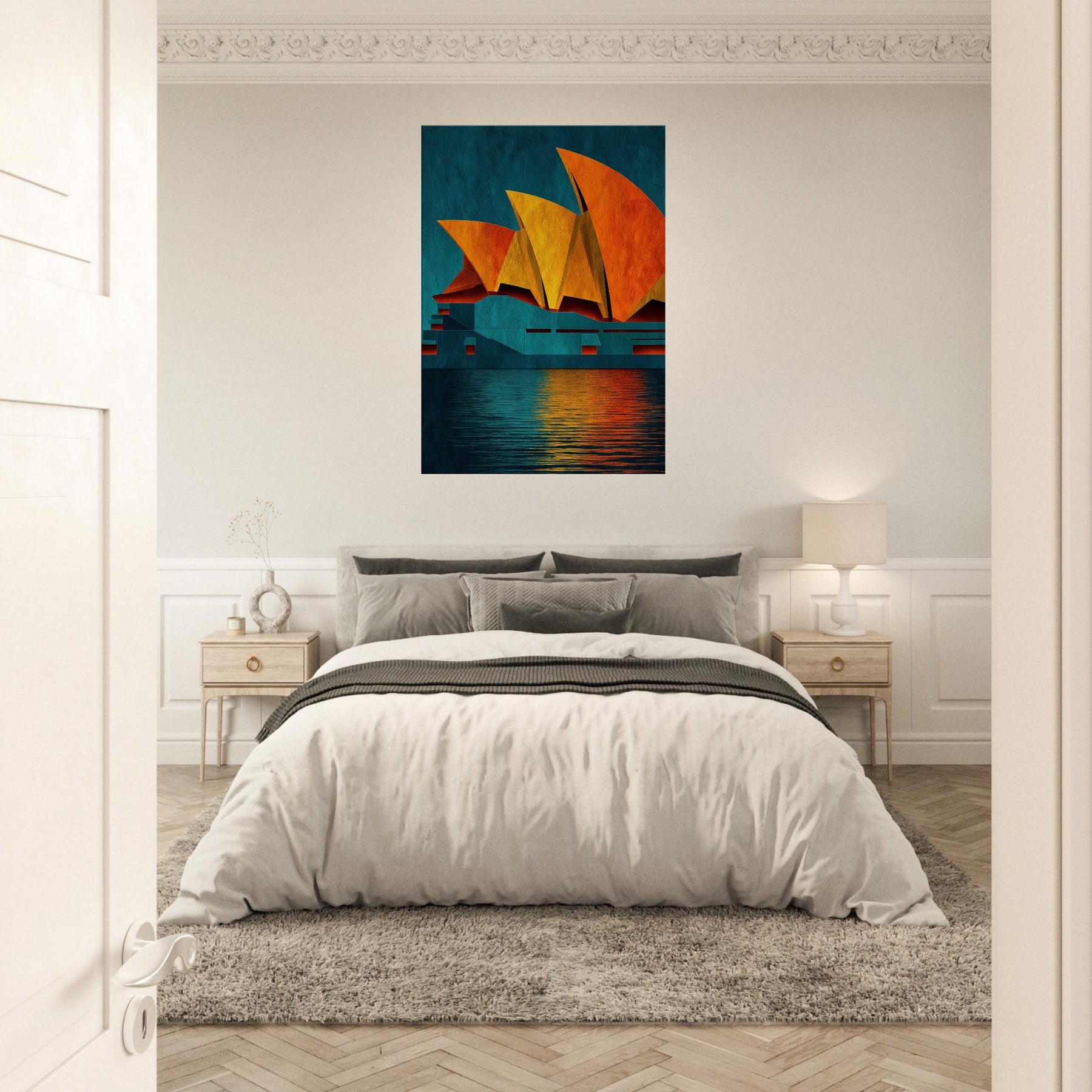 Let the Sydney Opera House shimmer as a sunset silhouette, its sails unfurling in warm oranges and deep golds. This abstract interpretation invites a hush of sea breeze and city lamps, wrapping your space in a soft, melodic glow. The piece breathes atmosphere into a living room, pairing with mineral blues and charcoal accents to create a calm, sophisticated vignette. Hang it where conversations ripple, and let the harbor of memory illuminate every everyday moment.