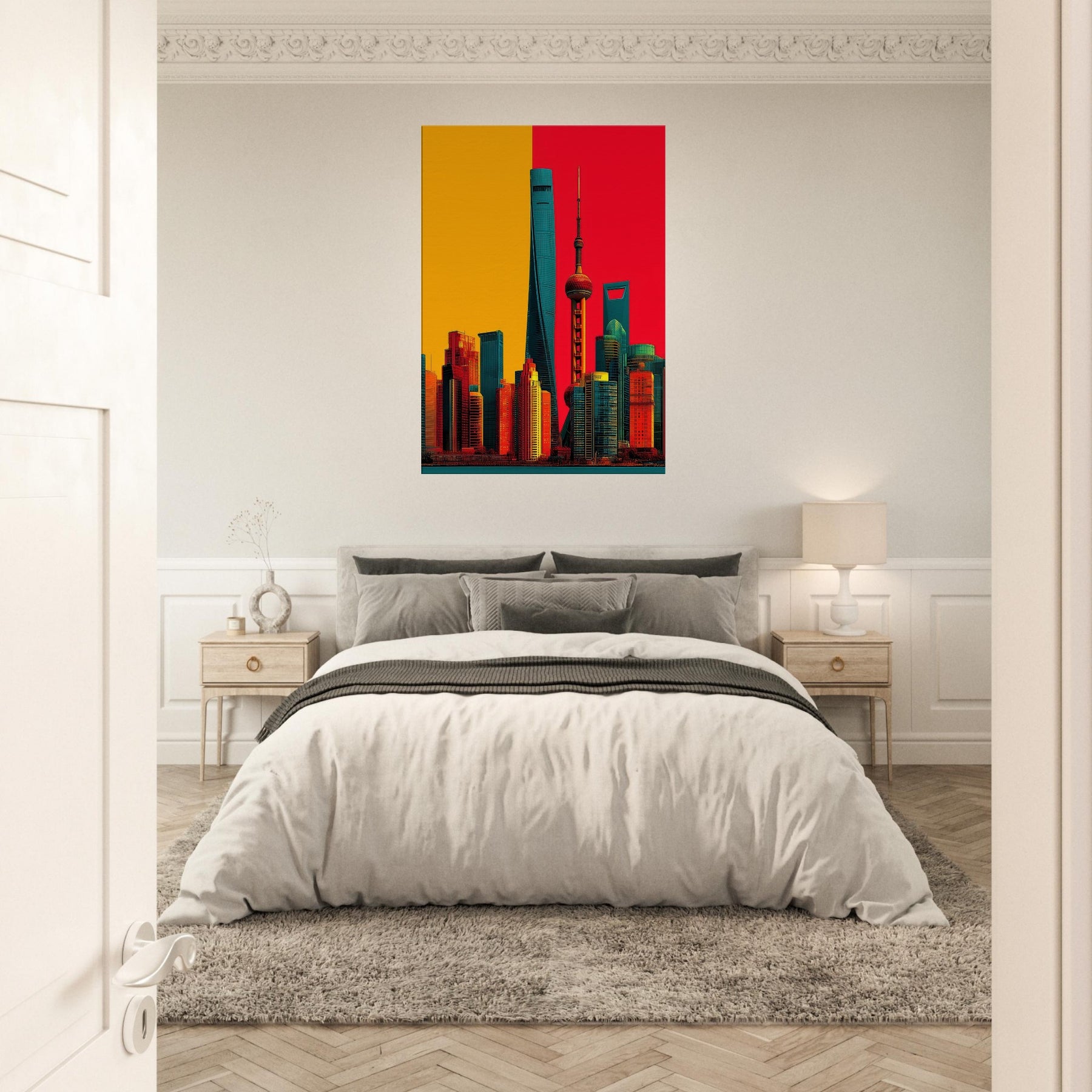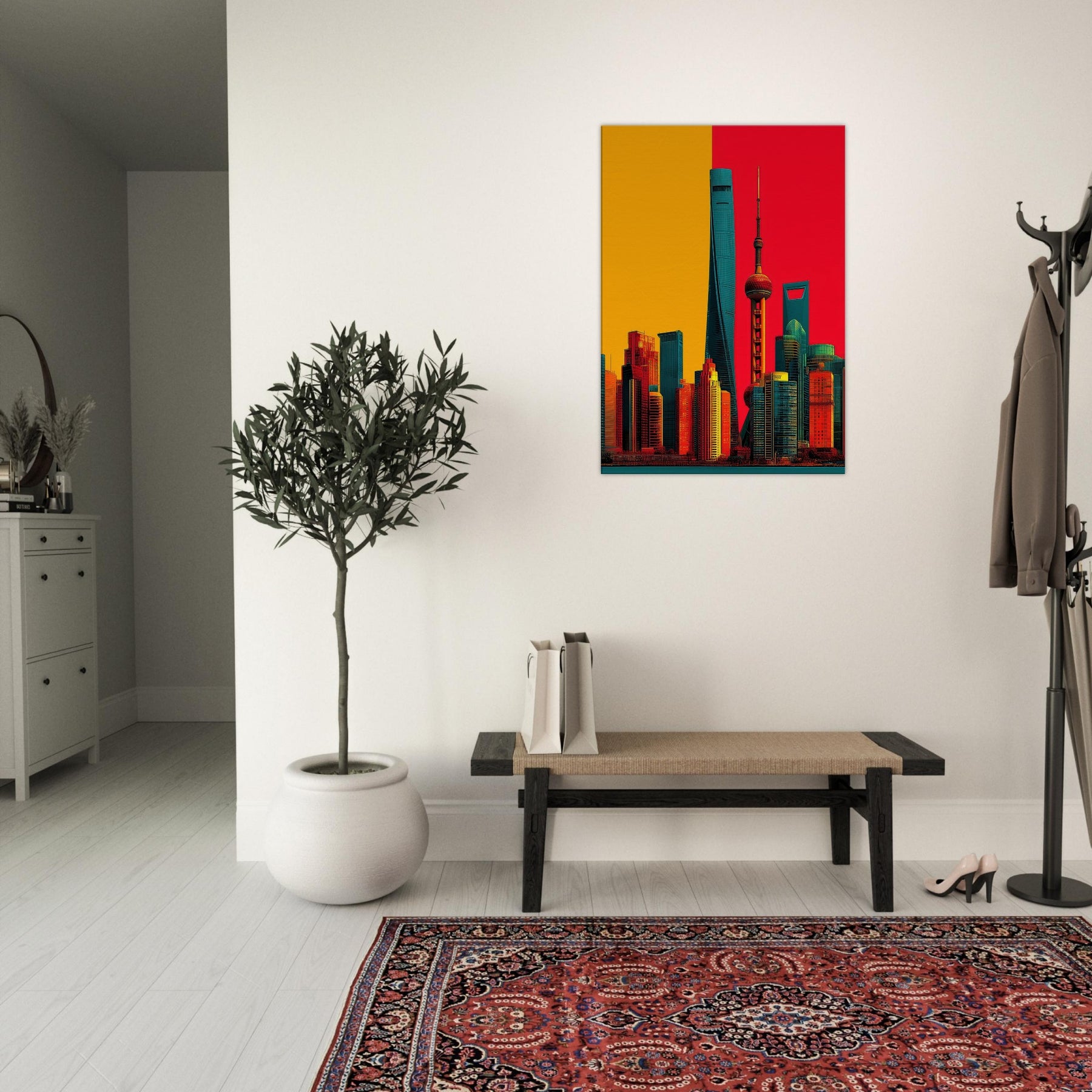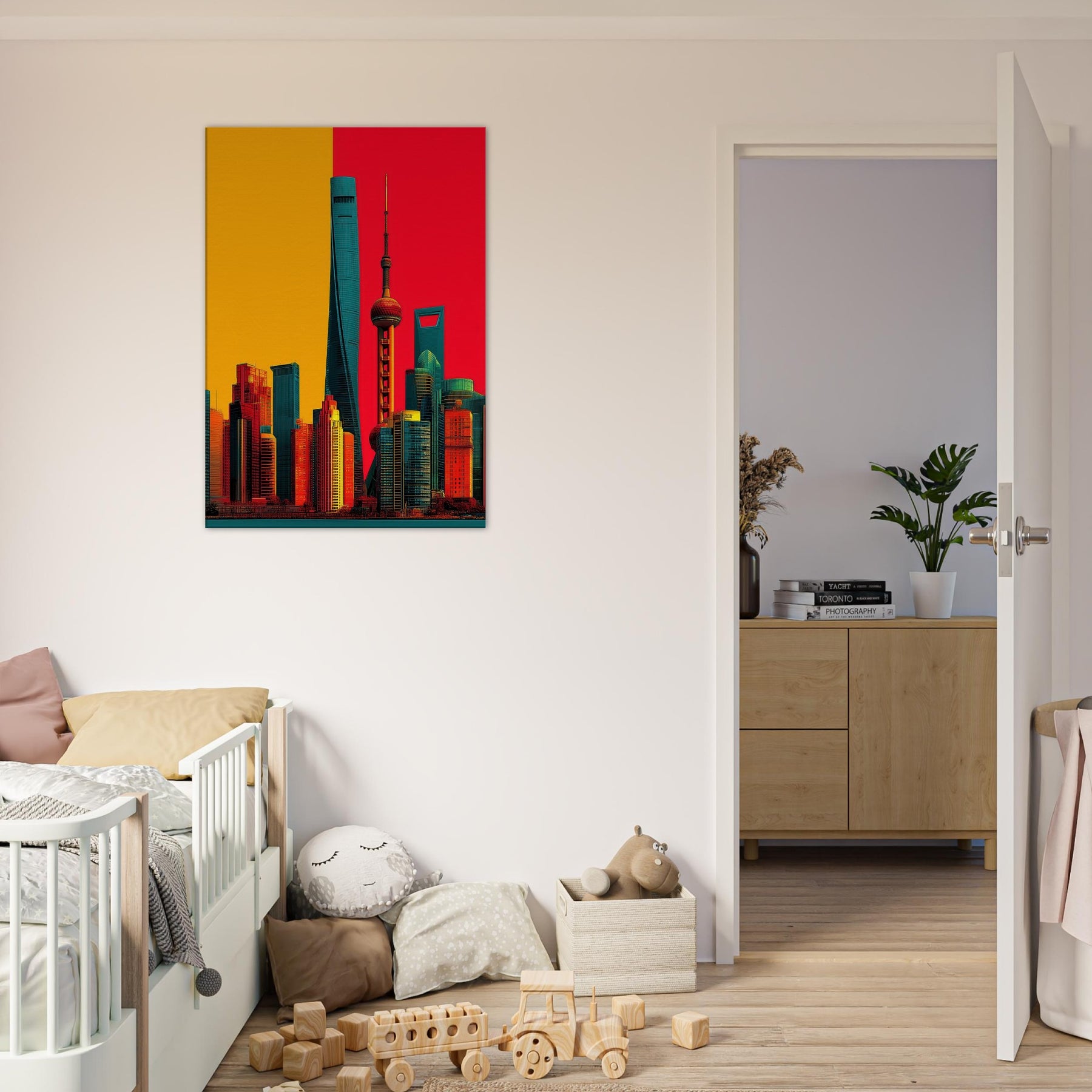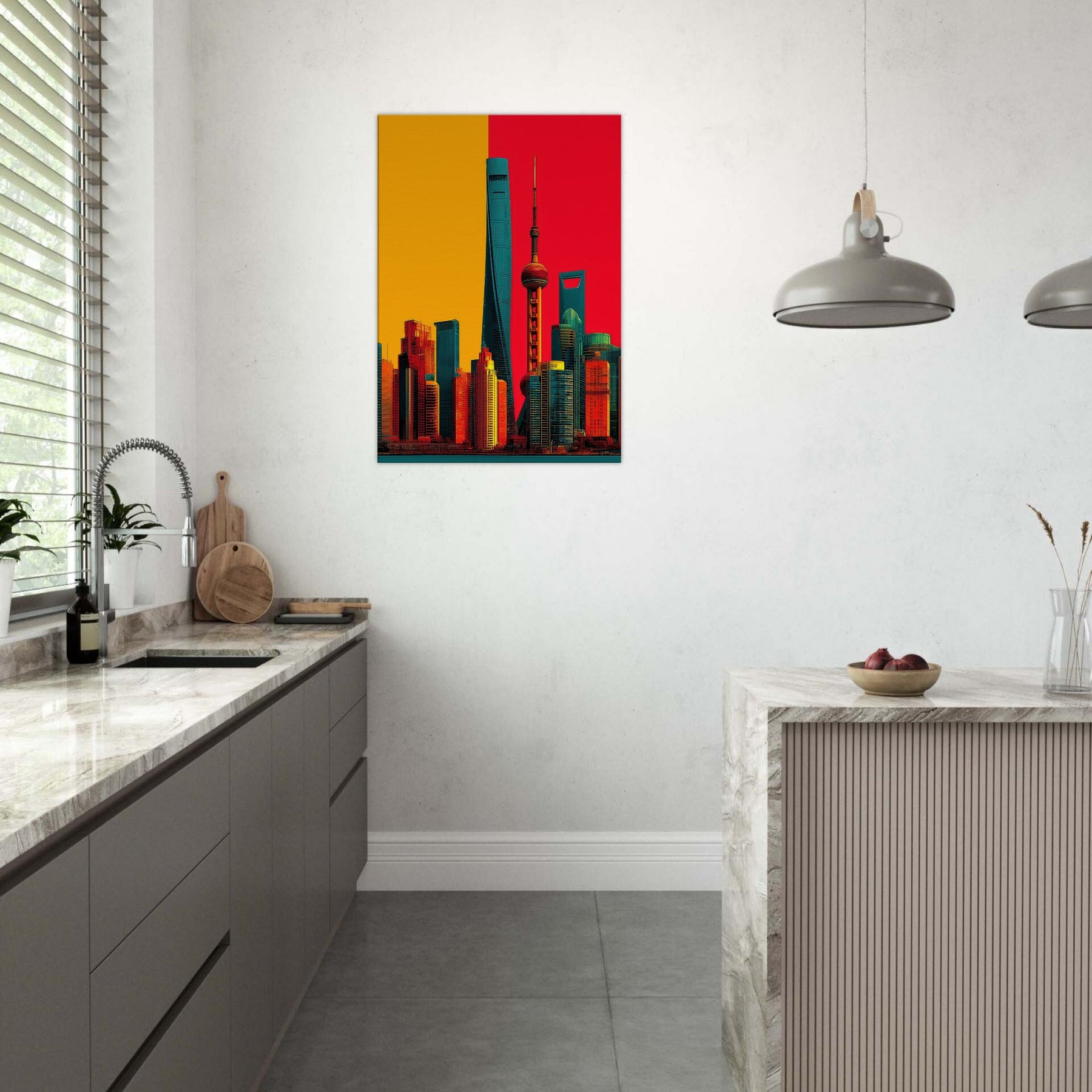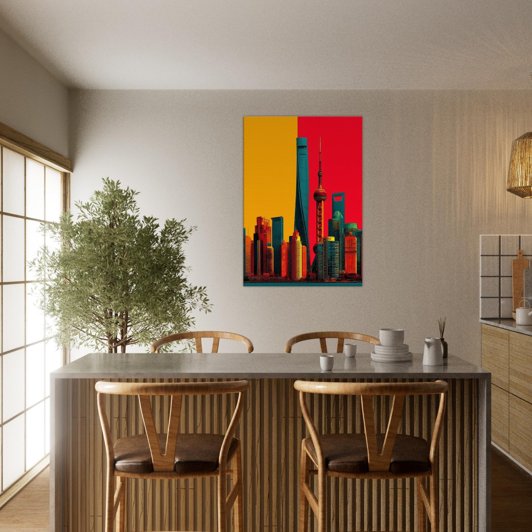 Shanghai arises in a chromatic dream, where bold shapes ripple like water and towers pierce a sky of electric hues. This abstract skyline breathes warmth and momentum, turning any living space into a night market of color and rhythm. The piece invites soft light to cascade across walls, making corners feel intimate and expansive at once. Perfect above a sofa or console, it awakens conversation, memory, and movement an everyday reminder that the city’s pulse can live beautifully inside your home.