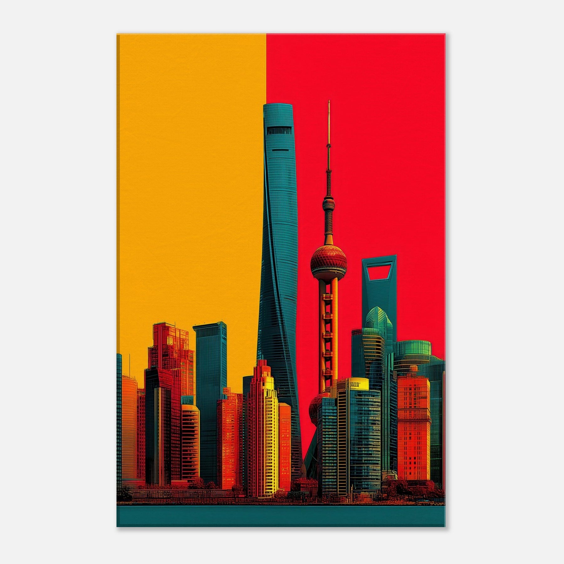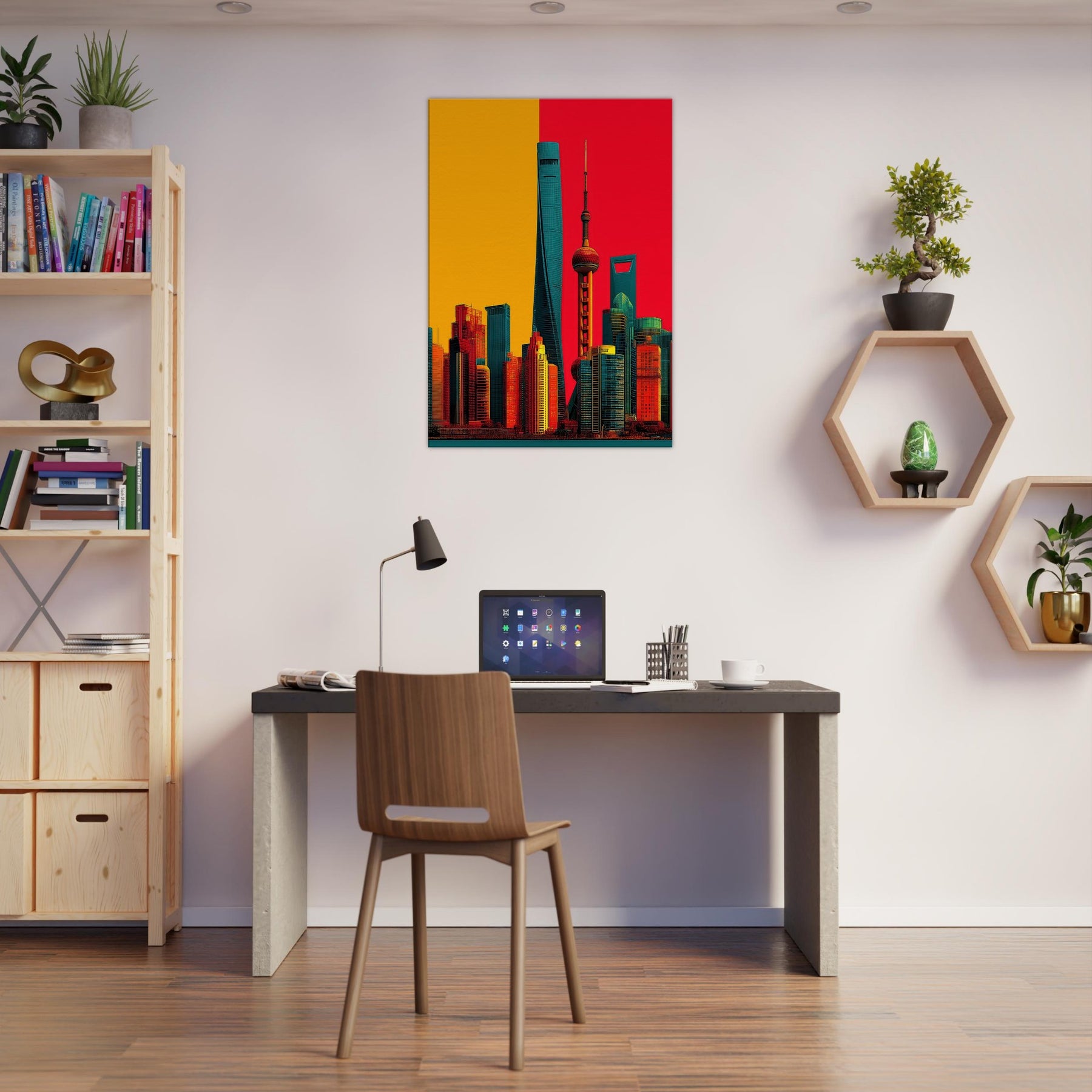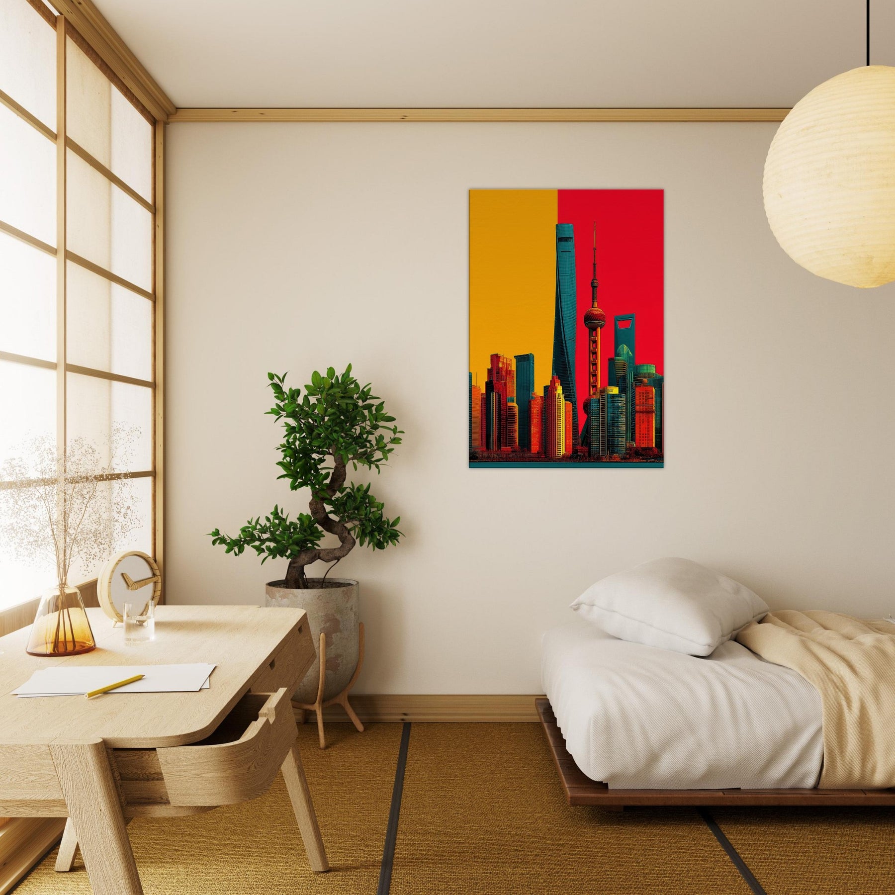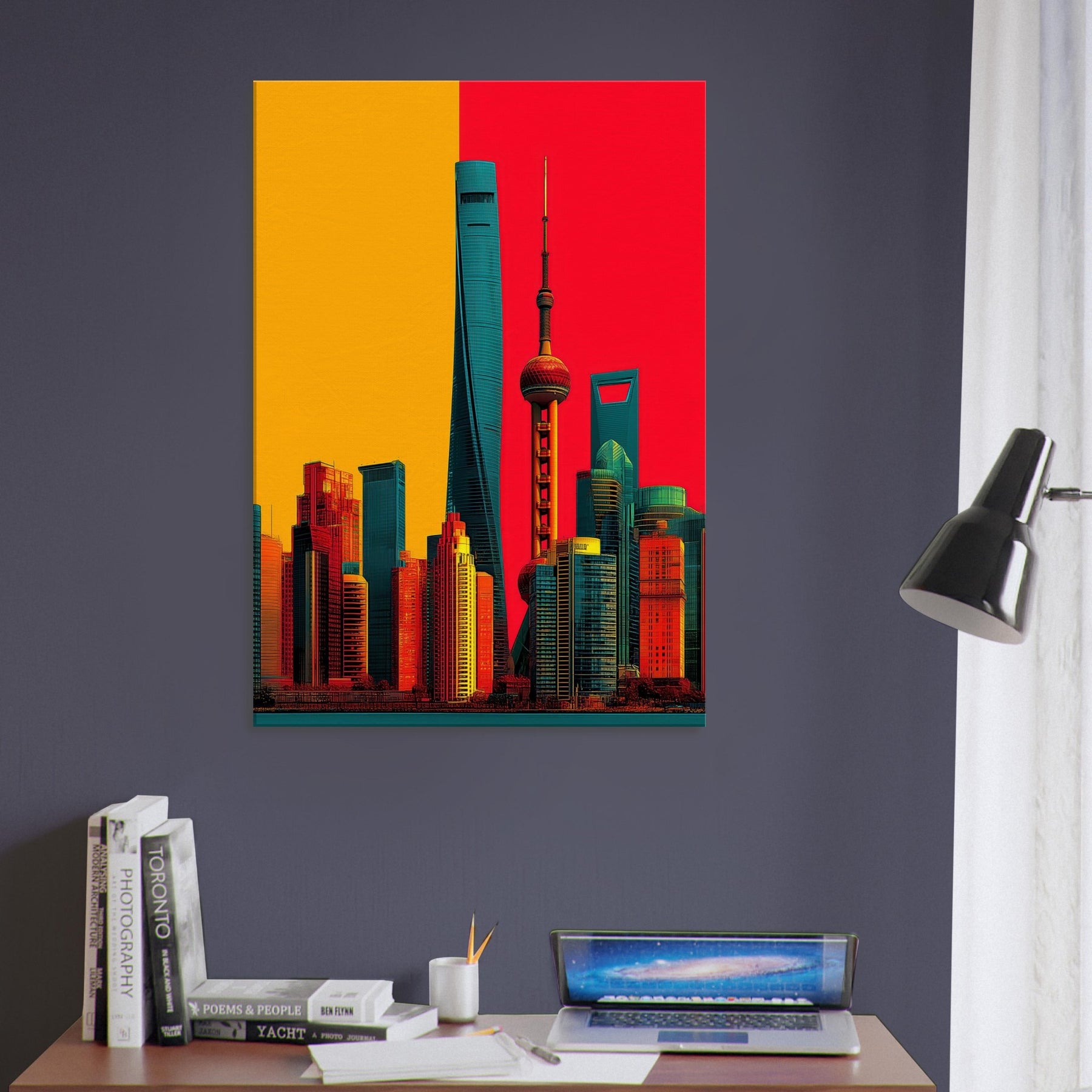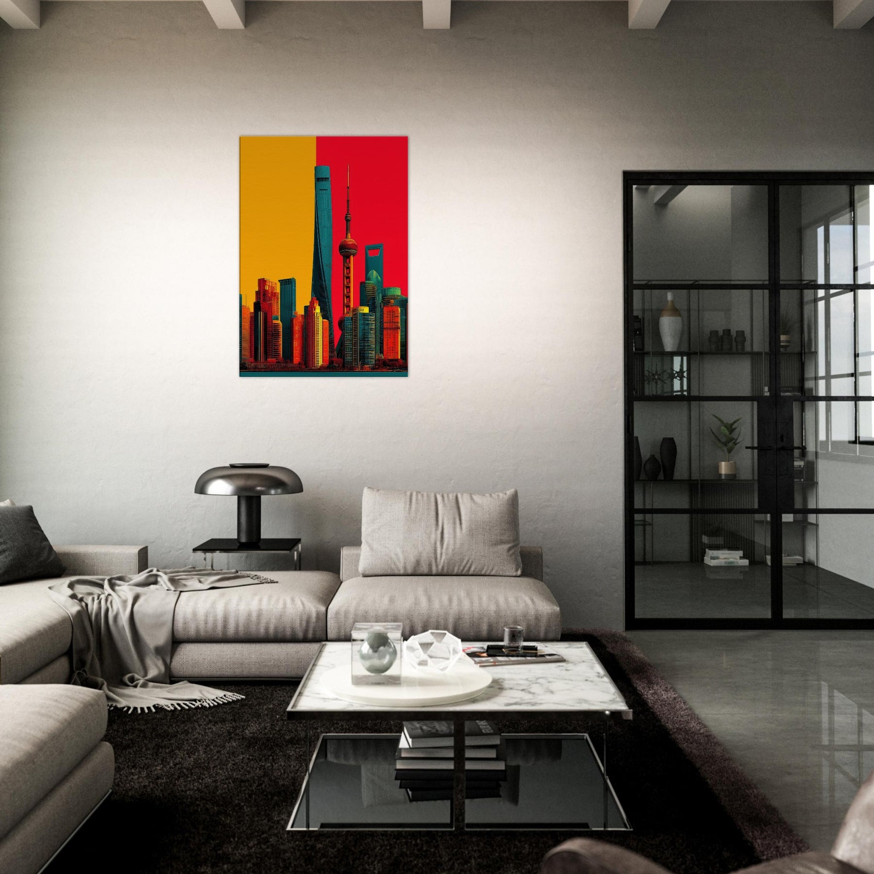 Shanghai arises in a chromatic dream, where bold shapes ripple like water and towers pierce a sky of electric hues. This abstract skyline breathes warmth and momentum, turning any living space into a night market of color and rhythm. The piece invites soft light to cascade across walls, making corners feel intimate and expansive at once. Perfect above a sofa or console, it awakens conversation, memory, and movement an everyday reminder that the city’s pulse can live beautifully inside your home.
