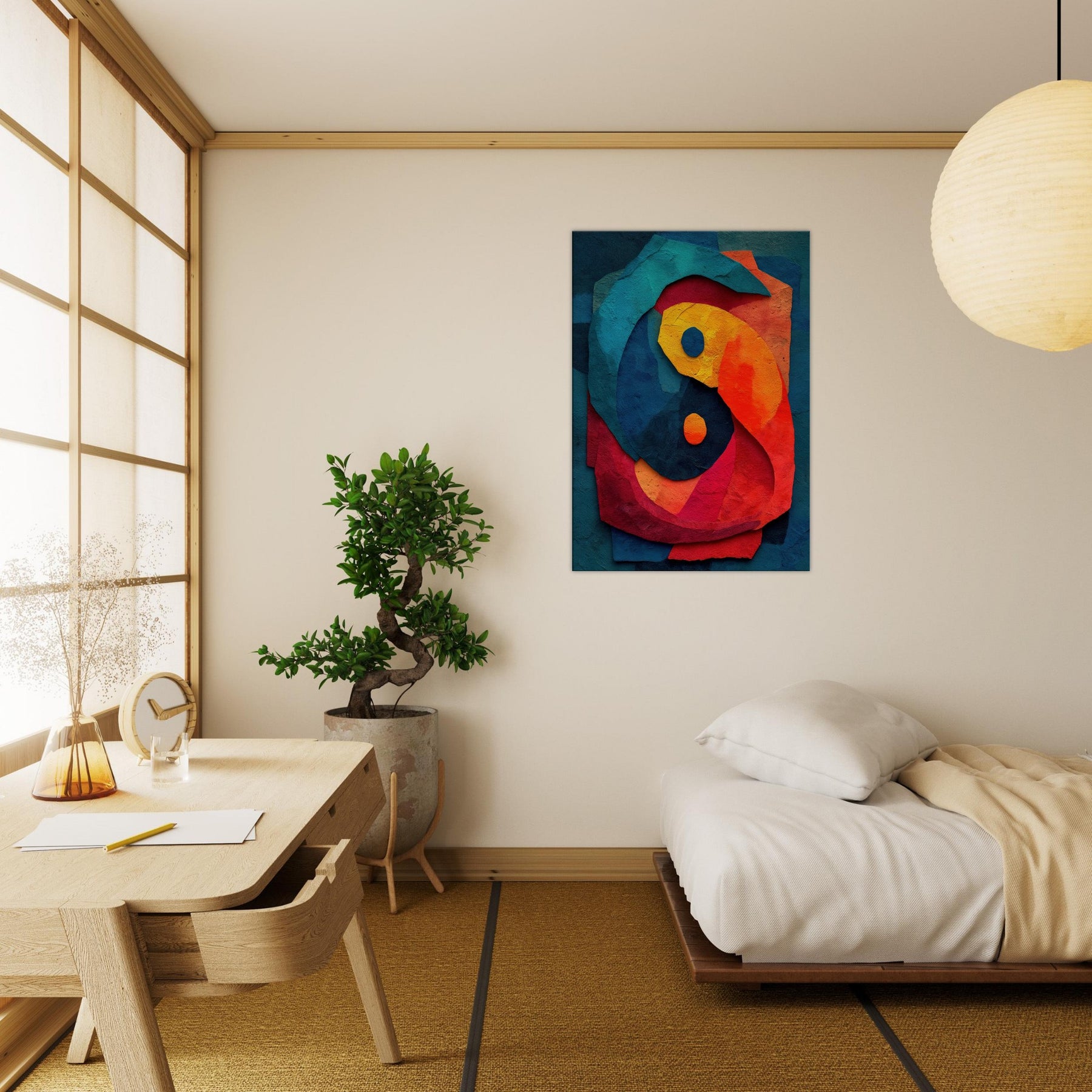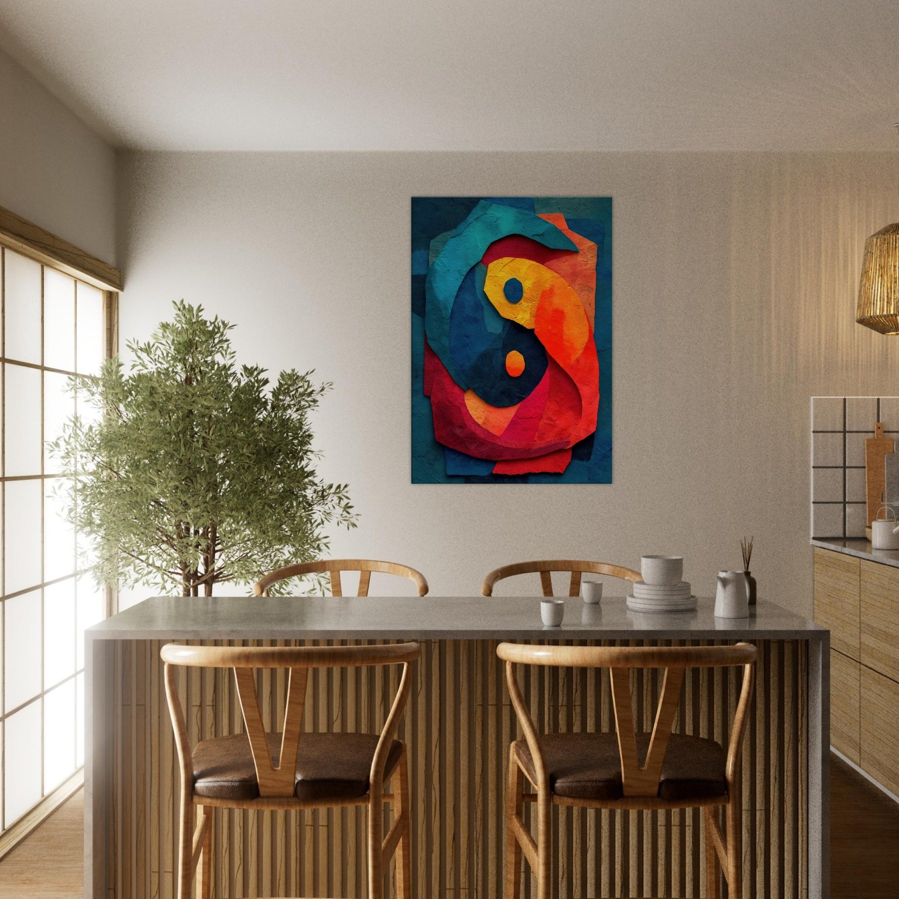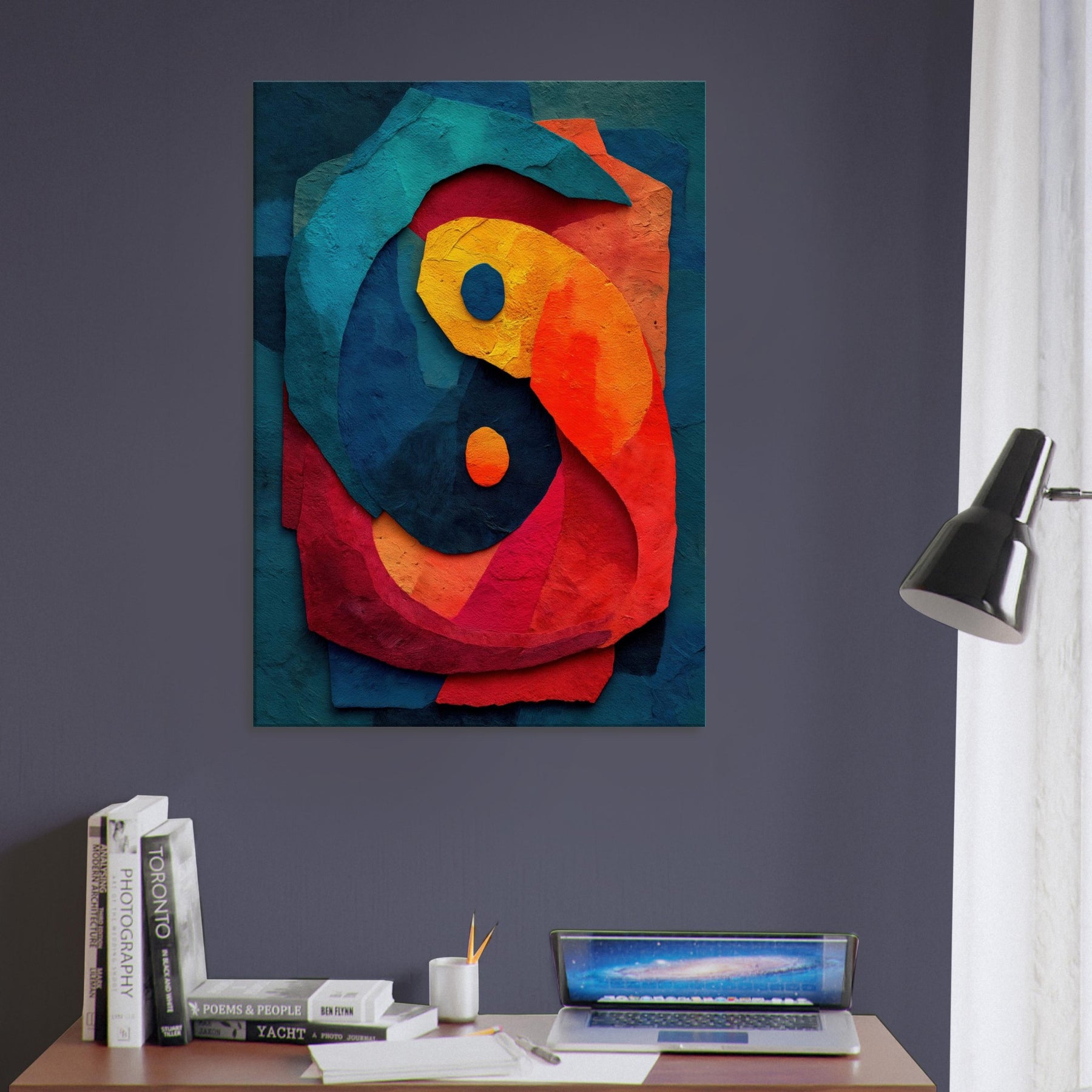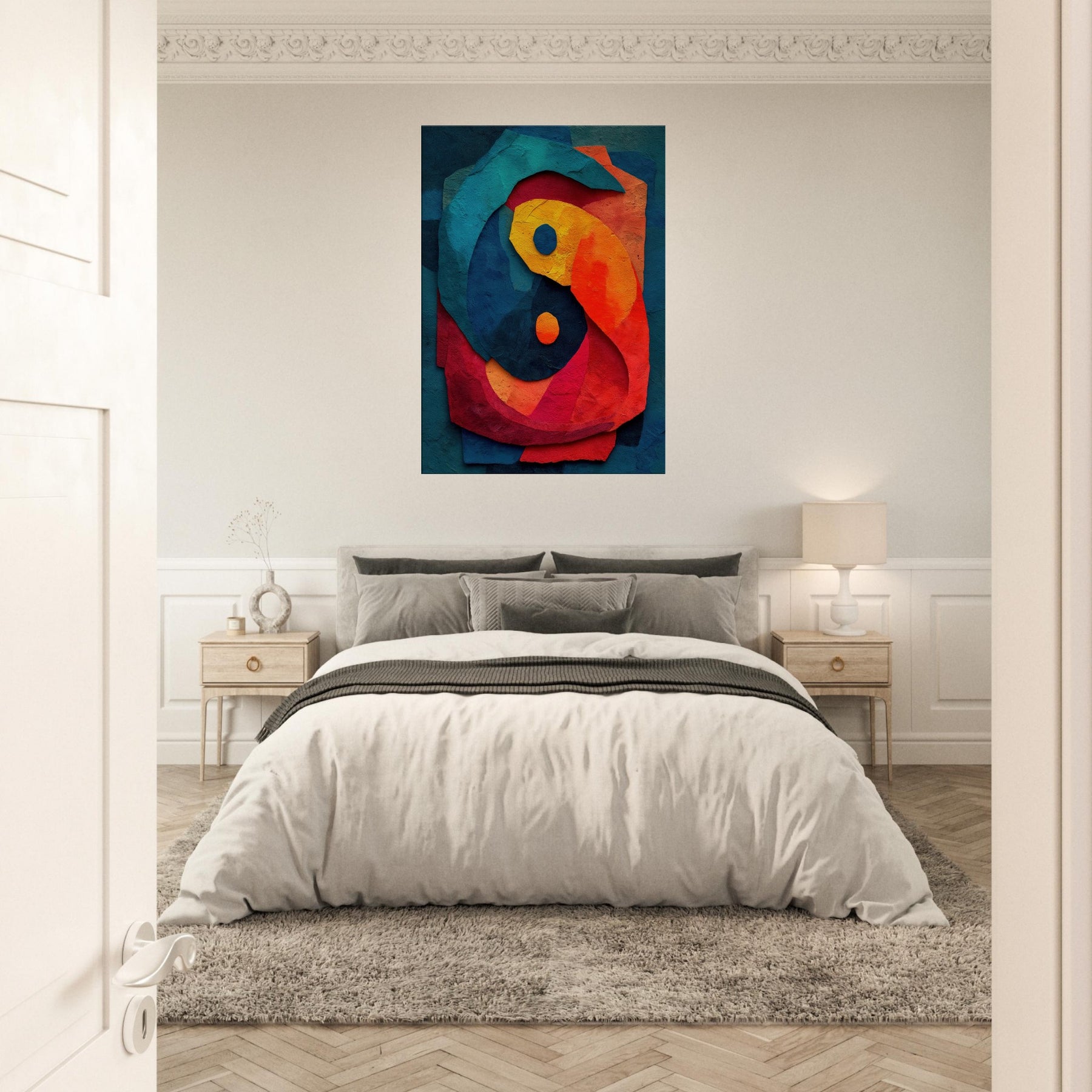 This artwork centers on Yin Yang, the Primary Subject of balance and mystique, rendered as layered color and form in an abstract study. Swirls of teal and cobalt cradle a warm arc of orange and gold, while a midnight shape anchors the composition. The result is a sensory invitation cool serenity meeting warm energy that elevates a living space, turning a corner or lounge into a sanctuary of reflection and subtle dynamism.