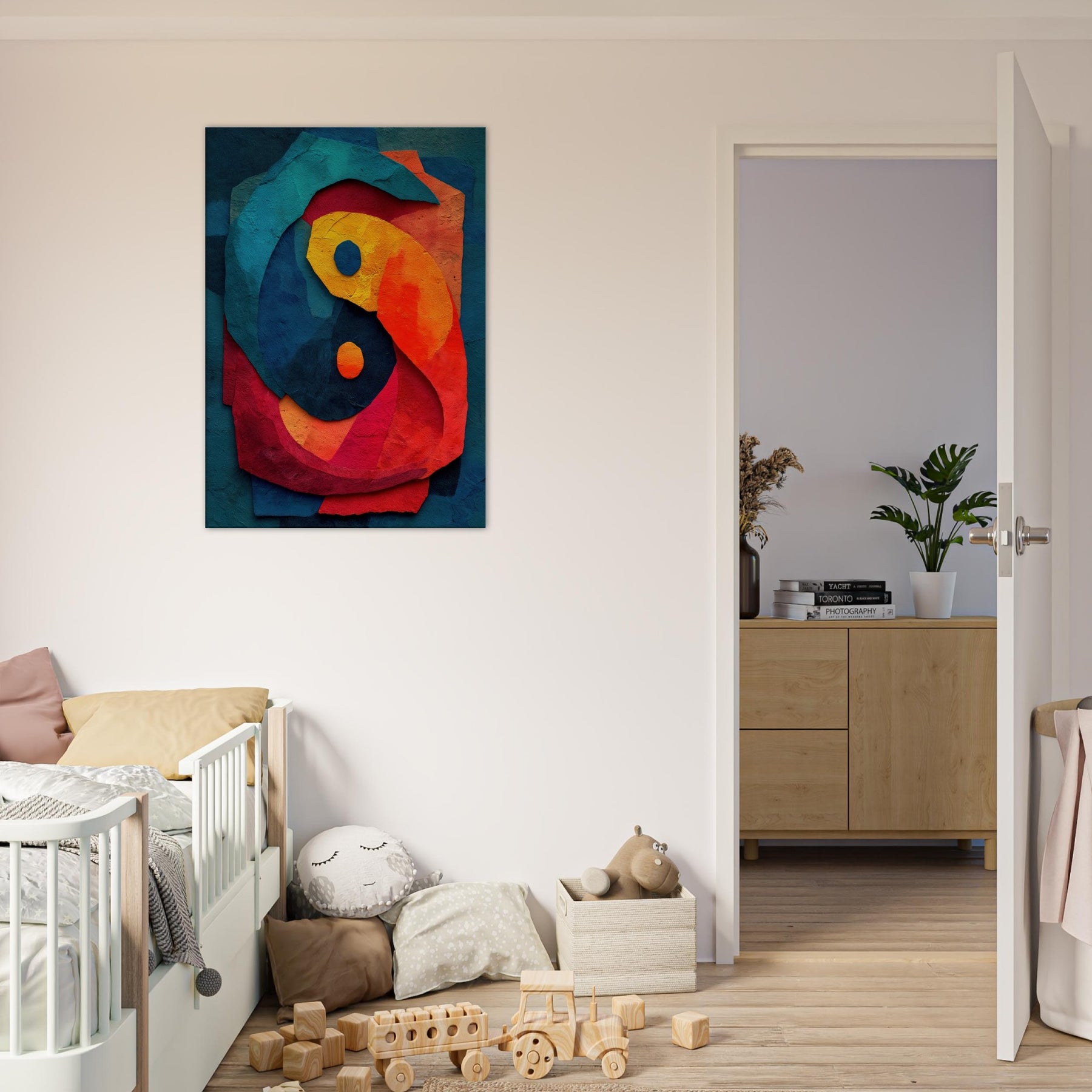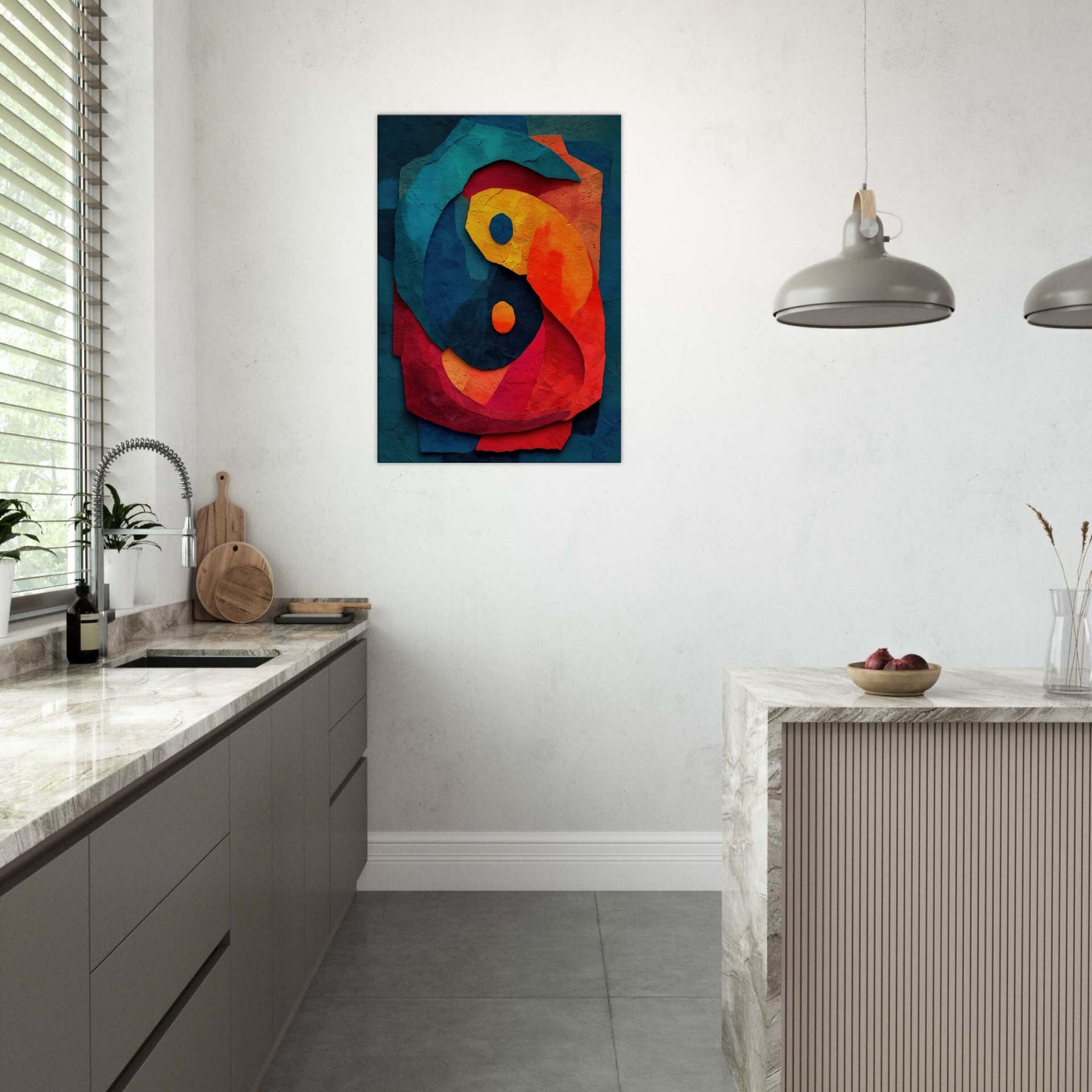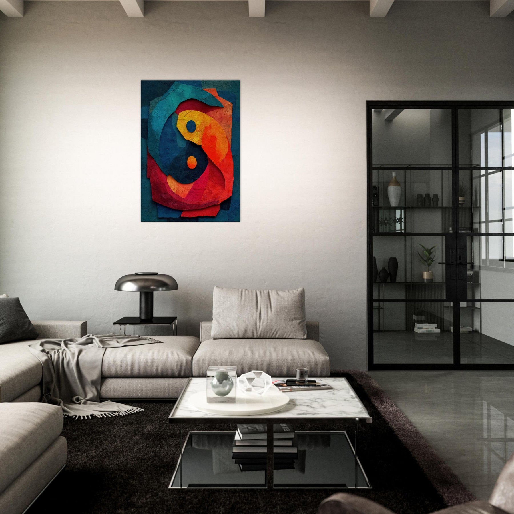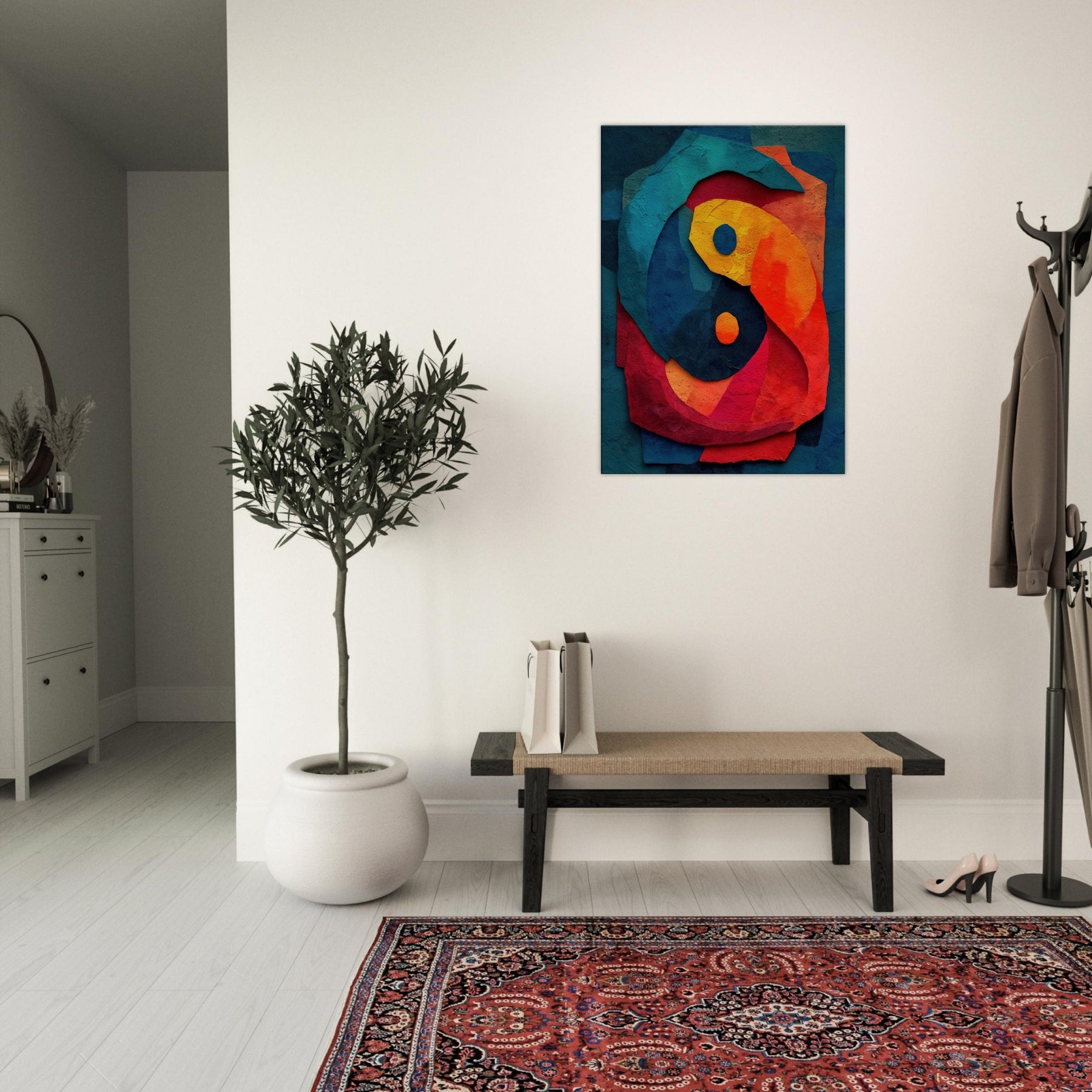 This artwork centers on Yin Yang, the Primary Subject of balance and mystique, rendered as layered color and form in an abstract study. Swirls of teal and cobalt cradle a warm arc of orange and gold, while a midnight shape anchors the composition. The result is a sensory invitation cool serenity meeting warm energy that elevates a living space, turning a corner or lounge into a sanctuary of reflection and subtle dynamism.