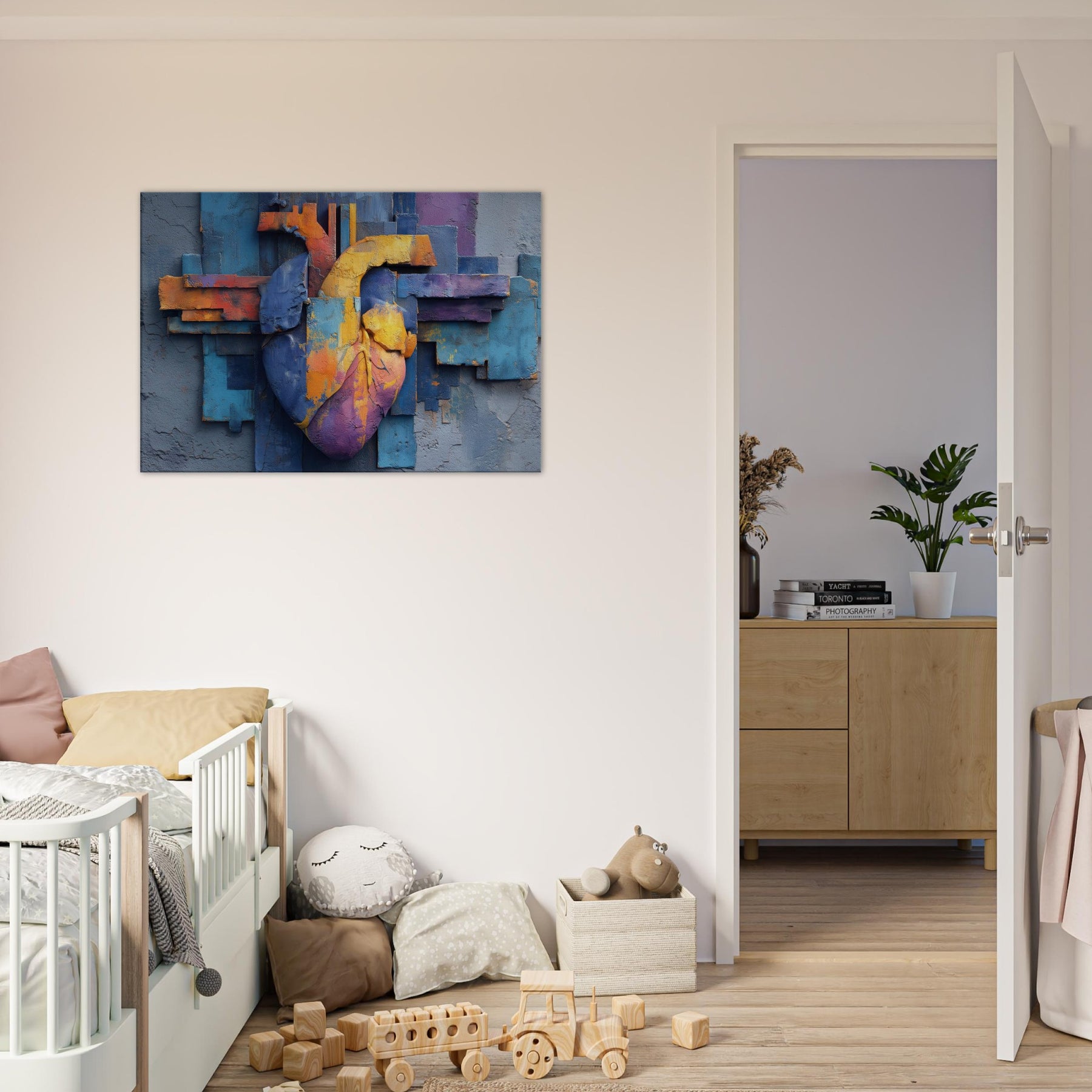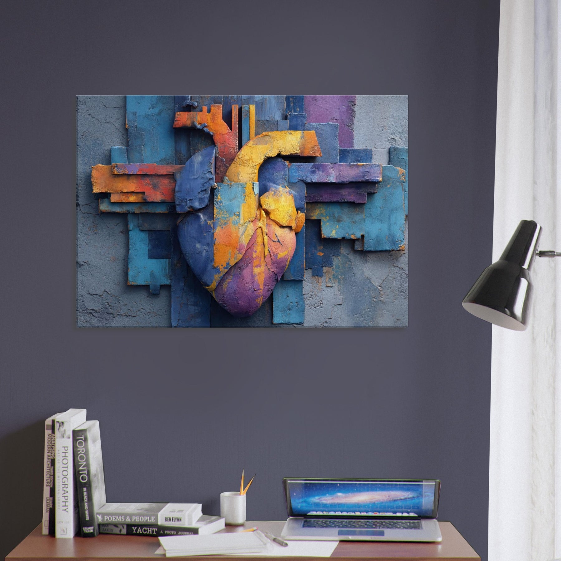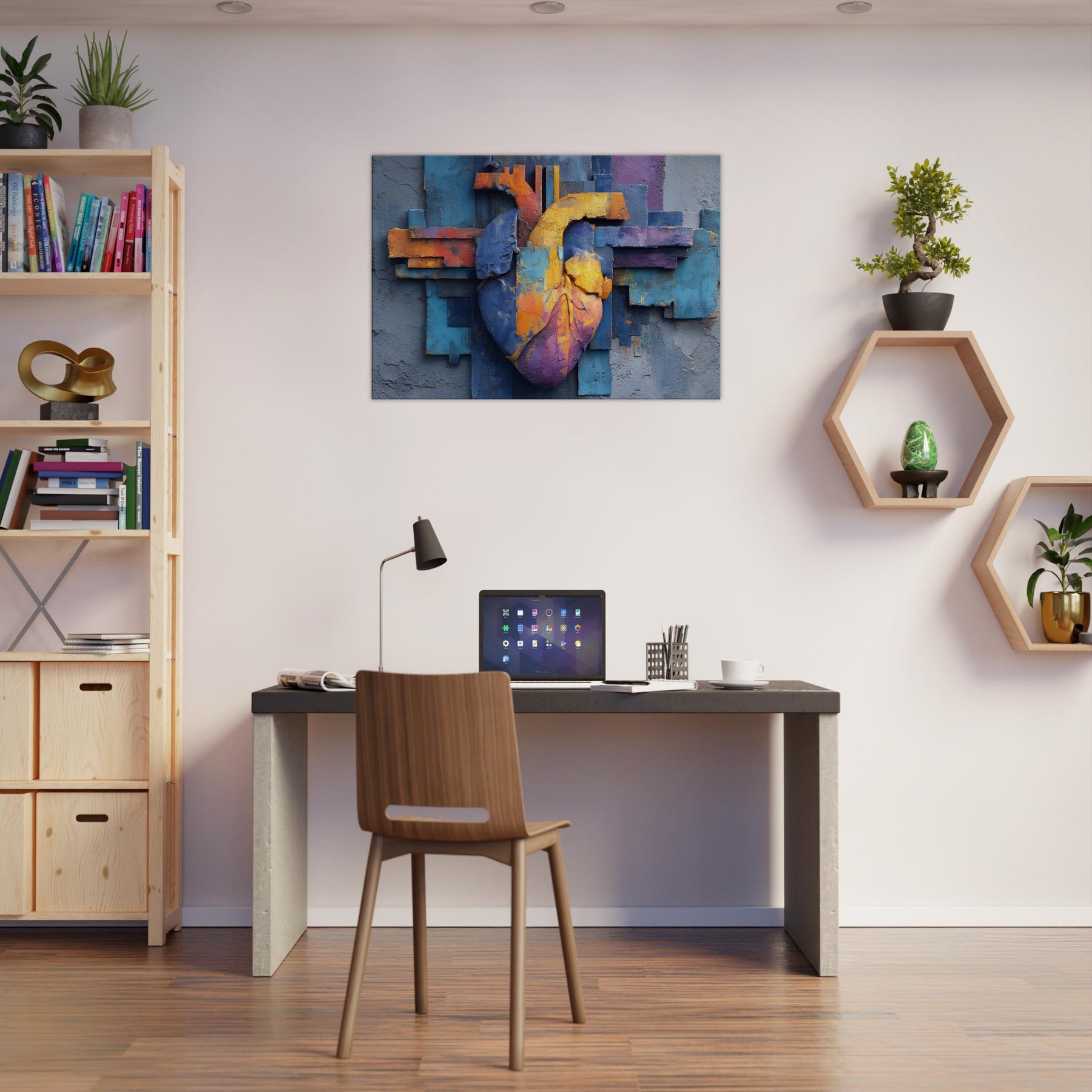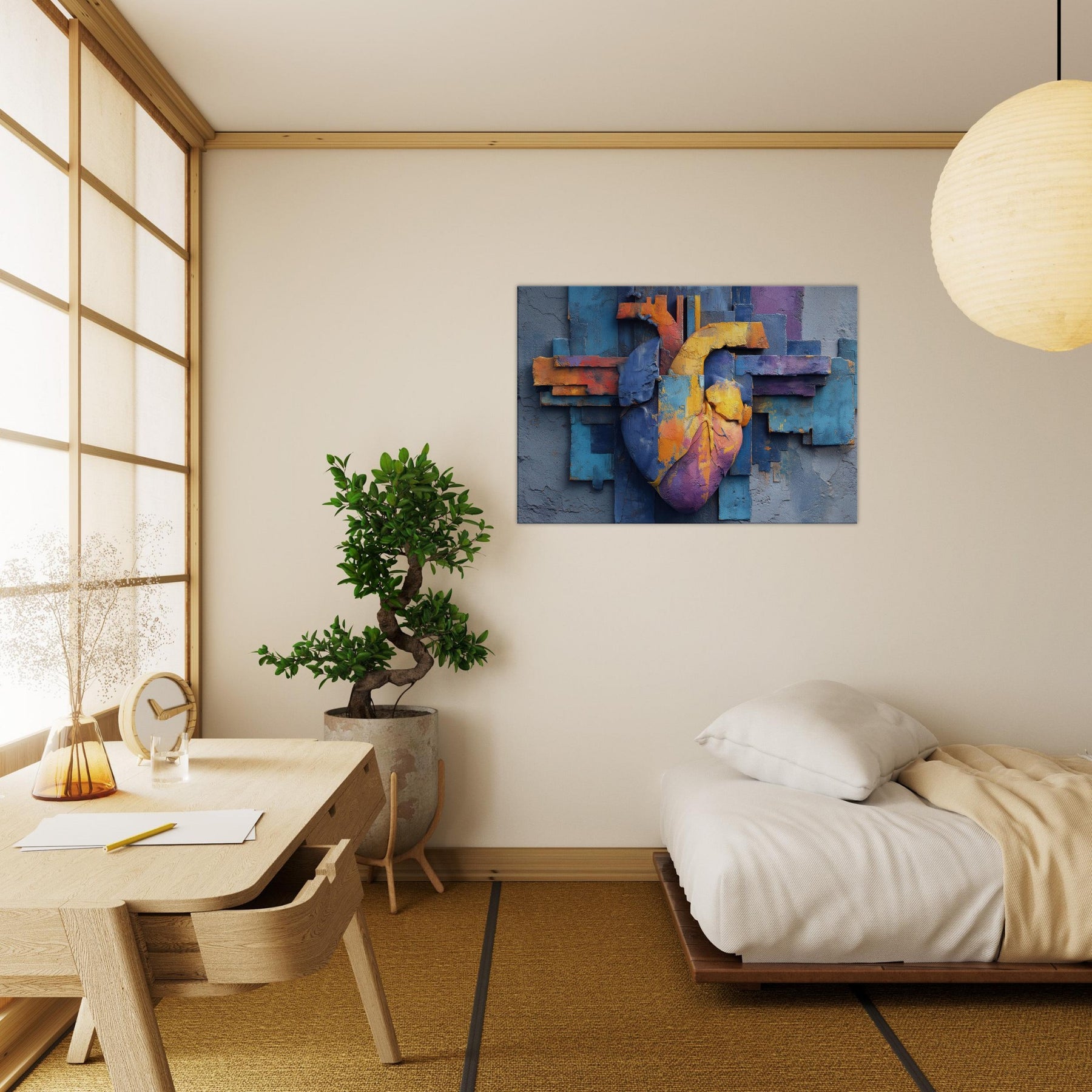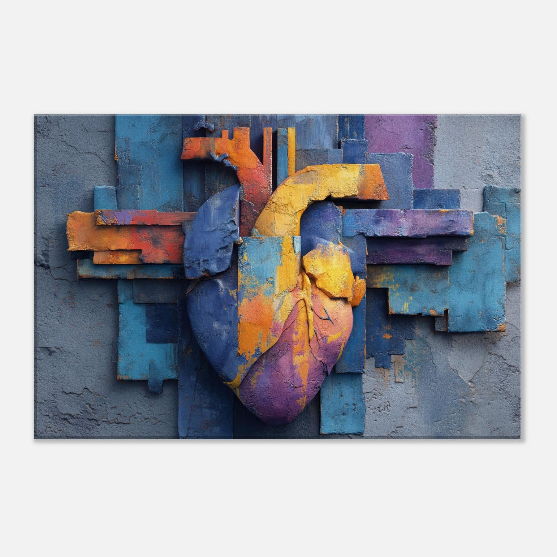 An abstract meditation on the Sacred Heart, this piece folds light and color into a luminous, living heartbeat. Layers of pigment drift like whispering flames, while coppery yellows, cobalt blues, and lilac hints mingle to evoke reverence and wonder. The central form glows with quiet intensity, resting against a textured, mural like backdrop that feels ancient and modern at once. Hang it where you sit, and let a sense of sacred stillness awaken every room with warmth and intention.