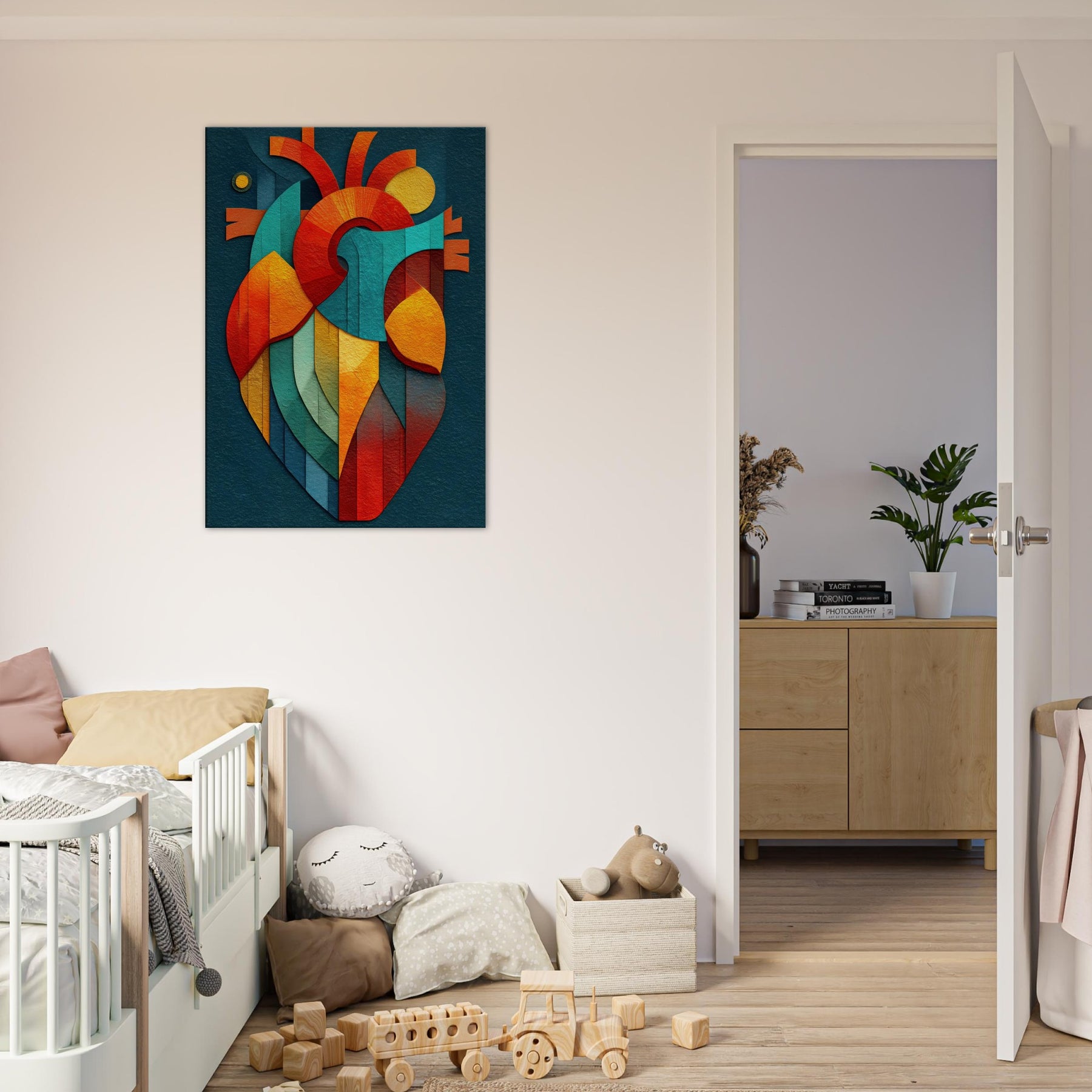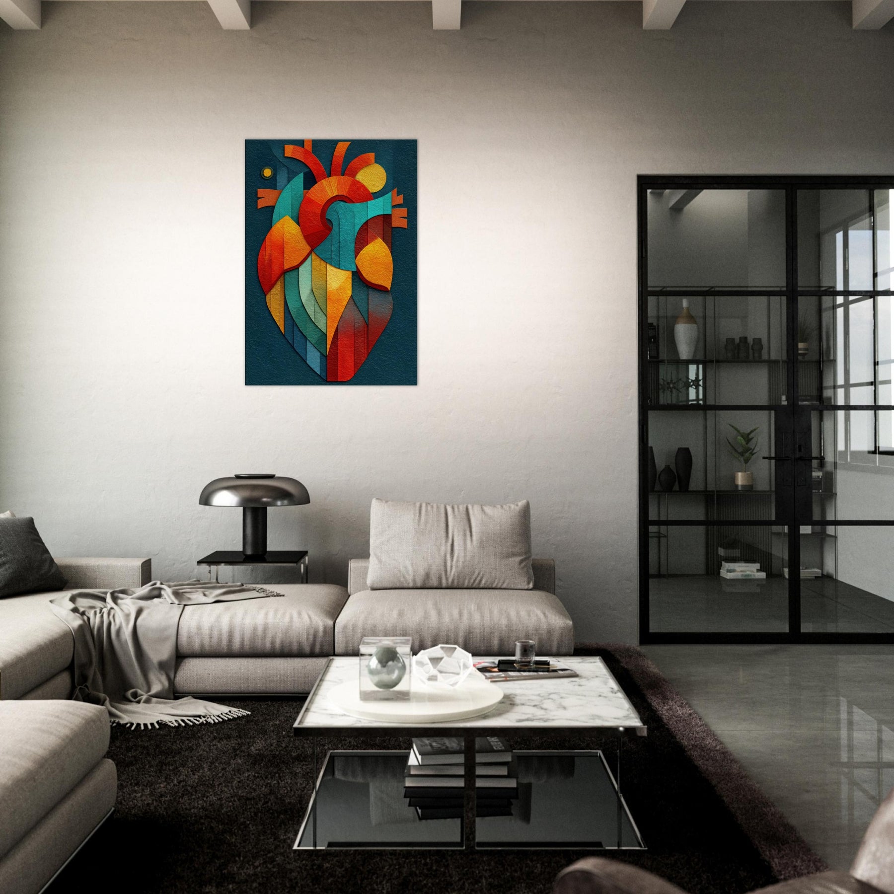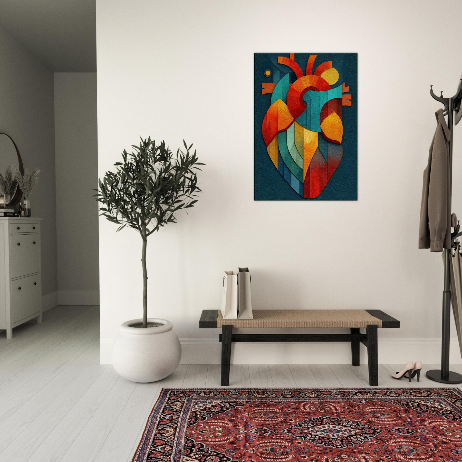Within this Sacred Heart inspired composition, color becomes a language of light. The abstract forms unfold like a whispered meditation, weaving reds, golds, teals, and soft blues into a living, breathing heart that seems to pulse with warmth and mystery. The layered textures catch and reflect room light, creating a gentle glow that enriches the atmosphere. In a living room or sanctuary, this piece invites slow gaze and mood elevation, turning walls into a sanctuary of rhythm, reverence, and mystical resonance.