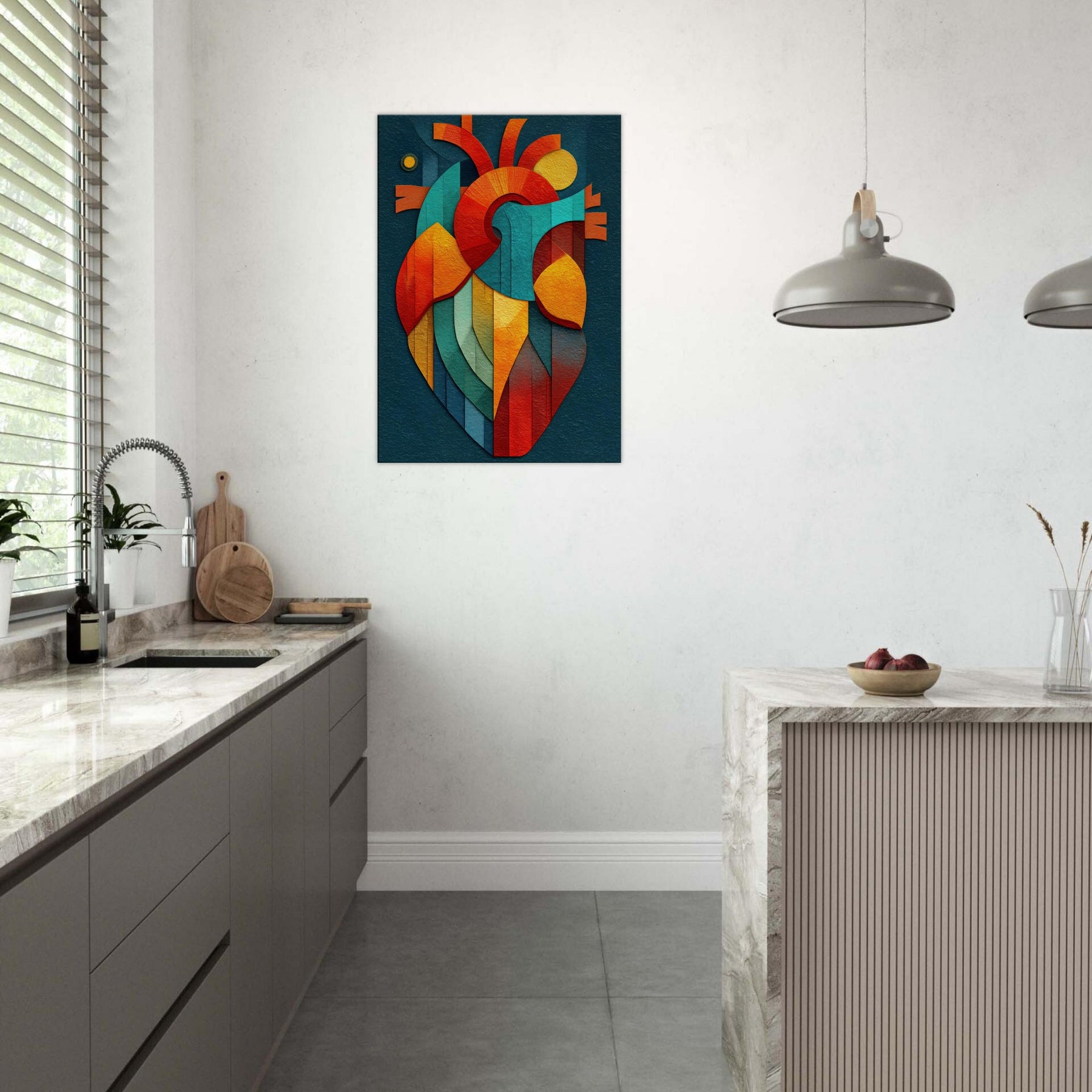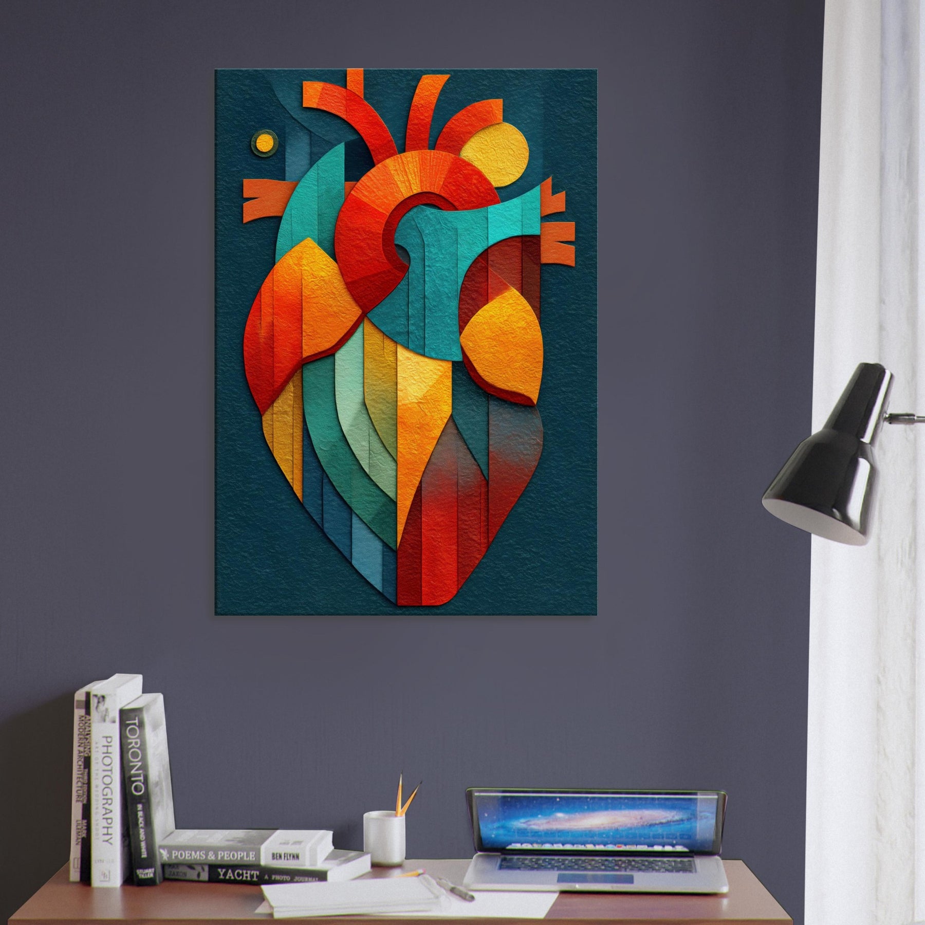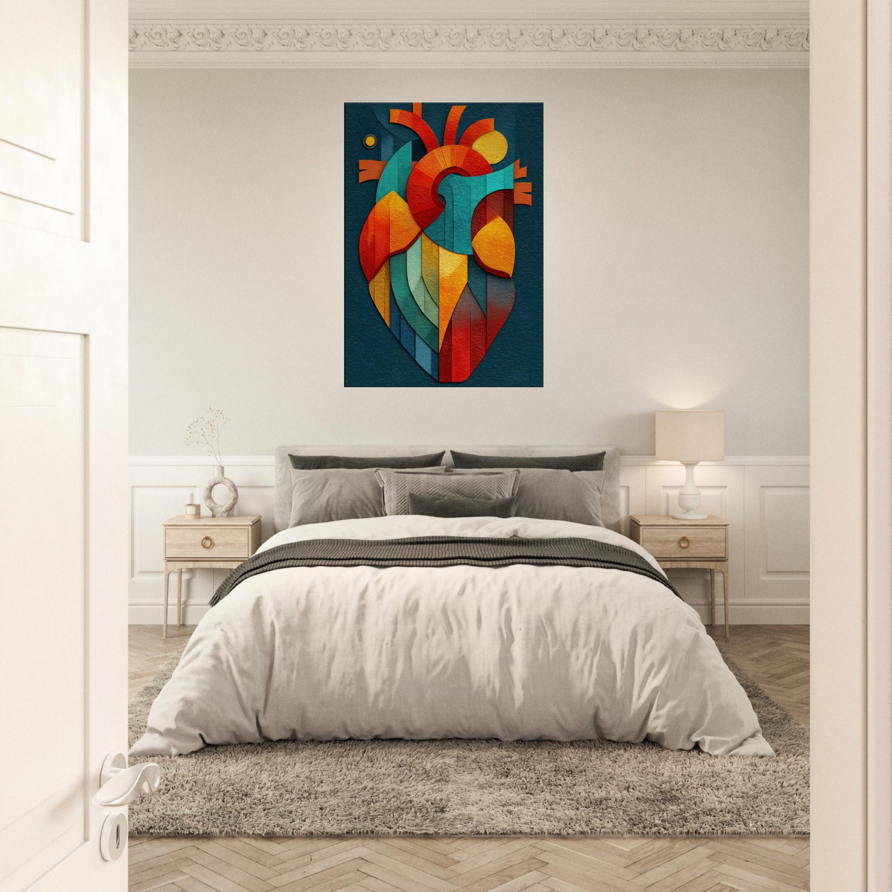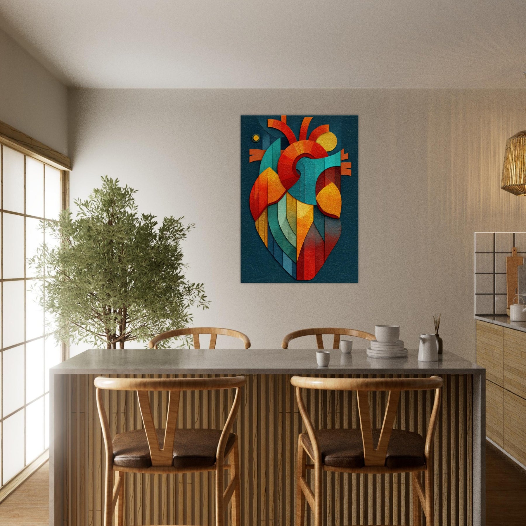 Within this Sacred Heart inspired composition, color becomes a language of light. The abstract forms unfold like a whispered meditation, weaving reds, golds, teals, and soft blues into a living, breathing heart that seems to pulse with warmth and mystery. The layered textures catch and reflect room light, creating a gentle glow that enriches the atmosphere. In a living room or sanctuary, this piece invites slow gaze and mood elevation, turning walls into a sanctuary of rhythm, reverence, and mystical resonance.