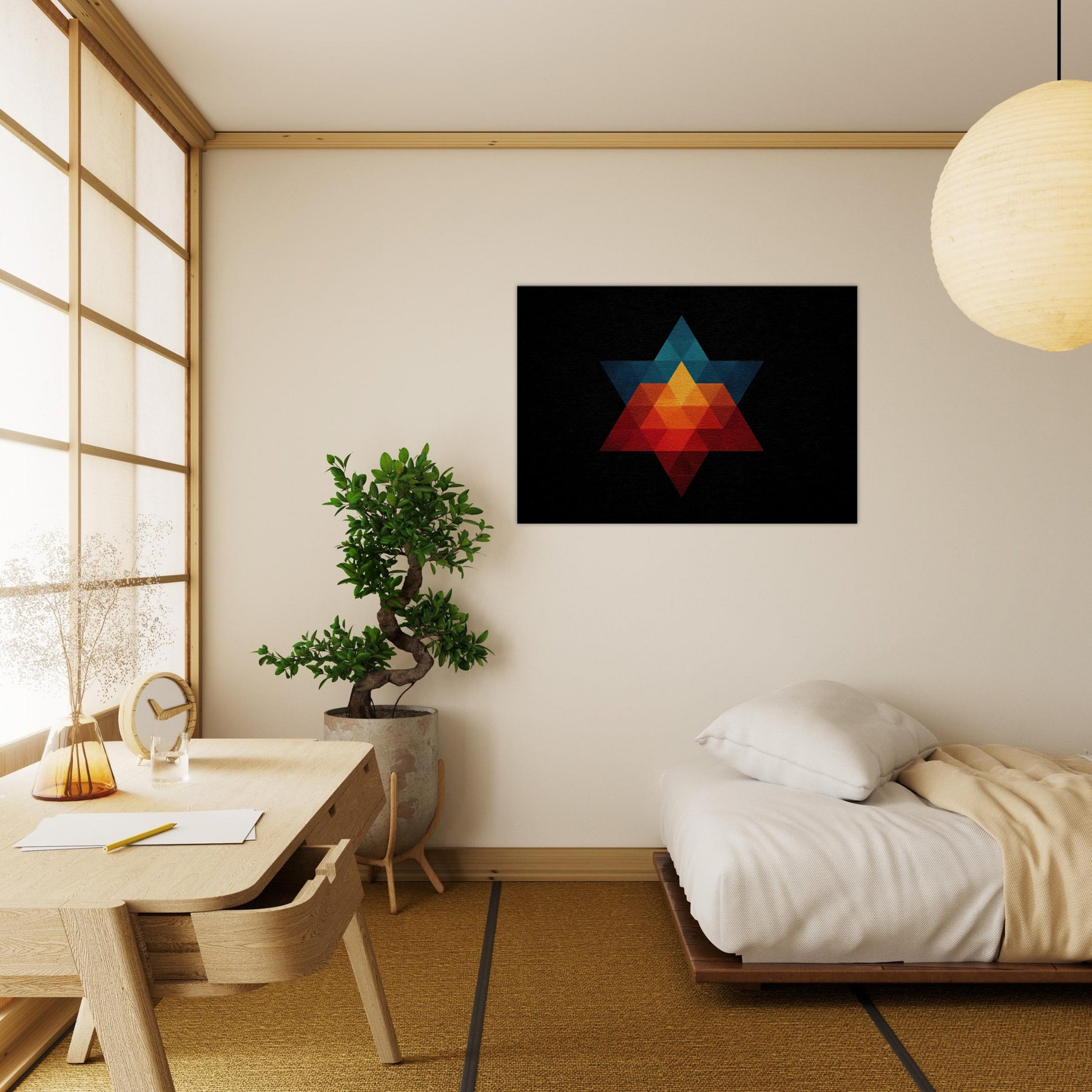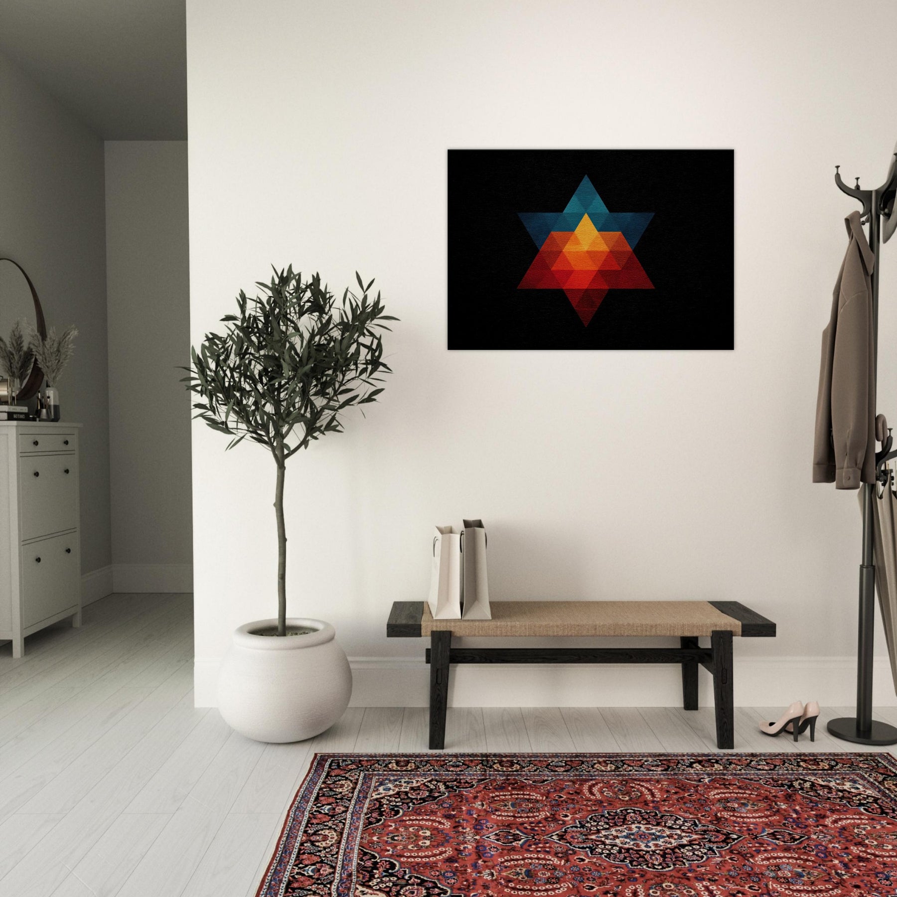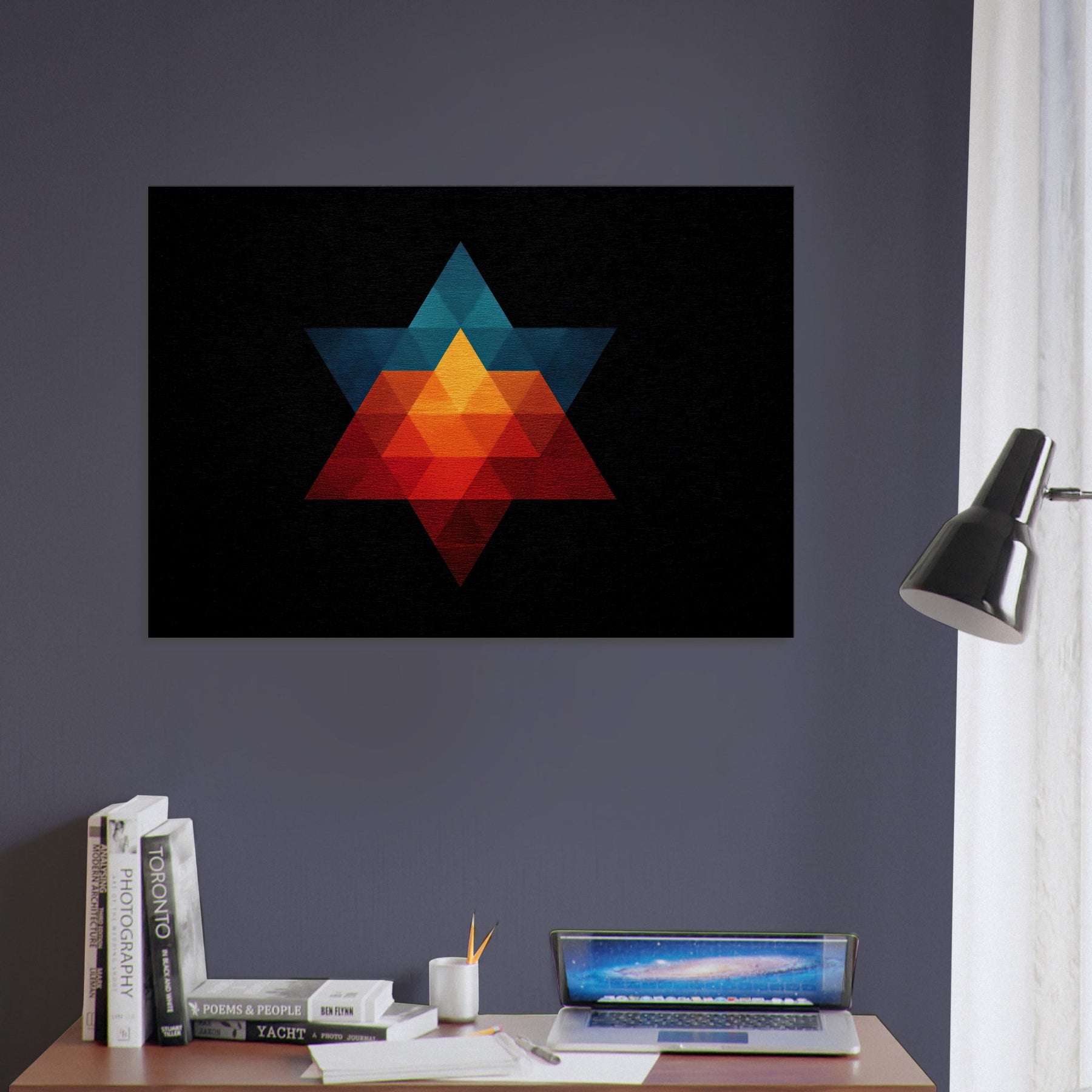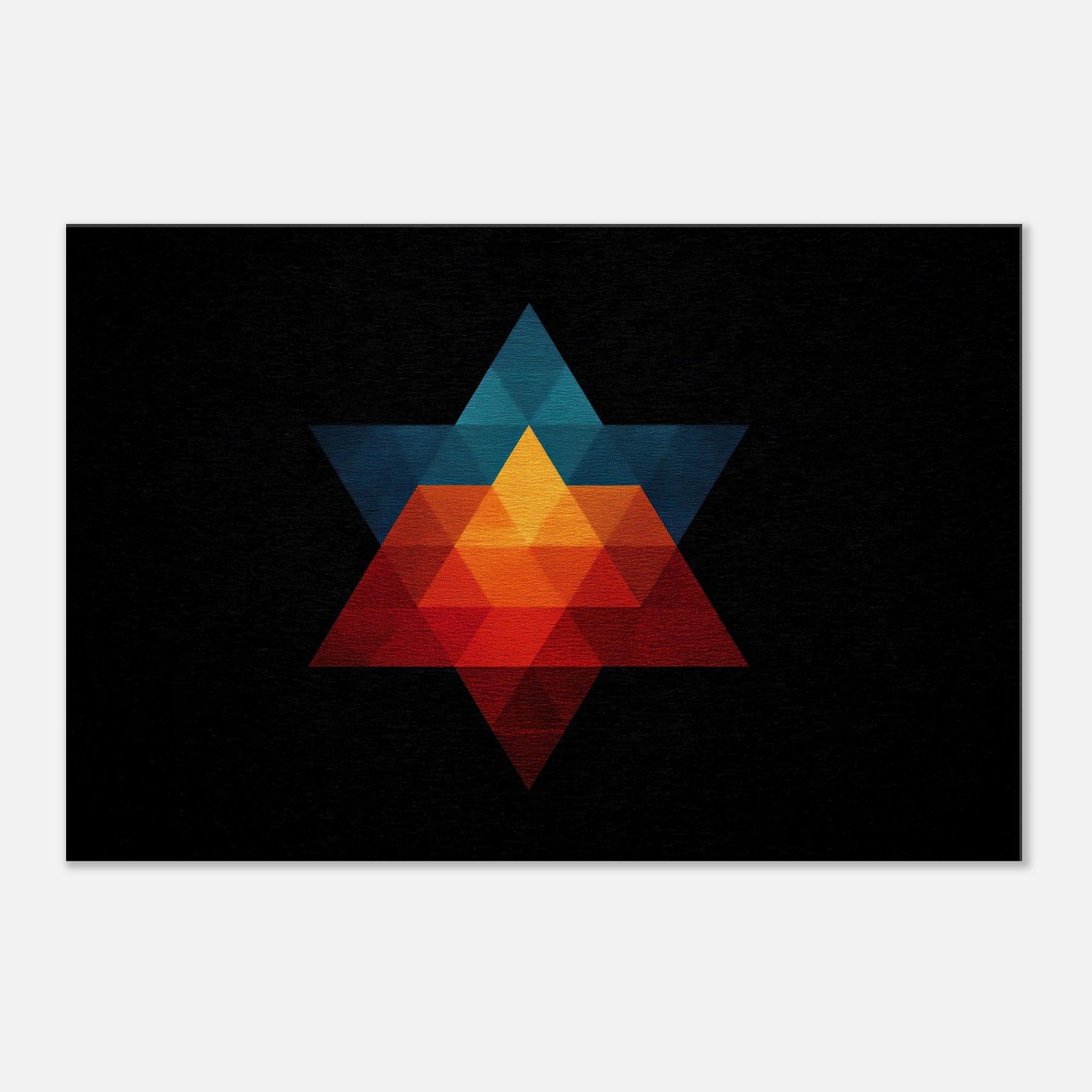 An elegant study in light and geometry, this Star of David appears as a constellation drawn with quiet, deliberate strokes. The abstract arrangement of overlapping triangles awakens a soft, molten glow blue at the crown, warming through amber to a deep crimson at the base like twilight poured into a single frame. Minimalist and mystical, it invites contemplation and calm, turning a living space into a sanctuary where color and form meet. Hang it where you seek balance, conversation, and a subtle, radiant energy. The central subject is Star of David (Minimal Line).