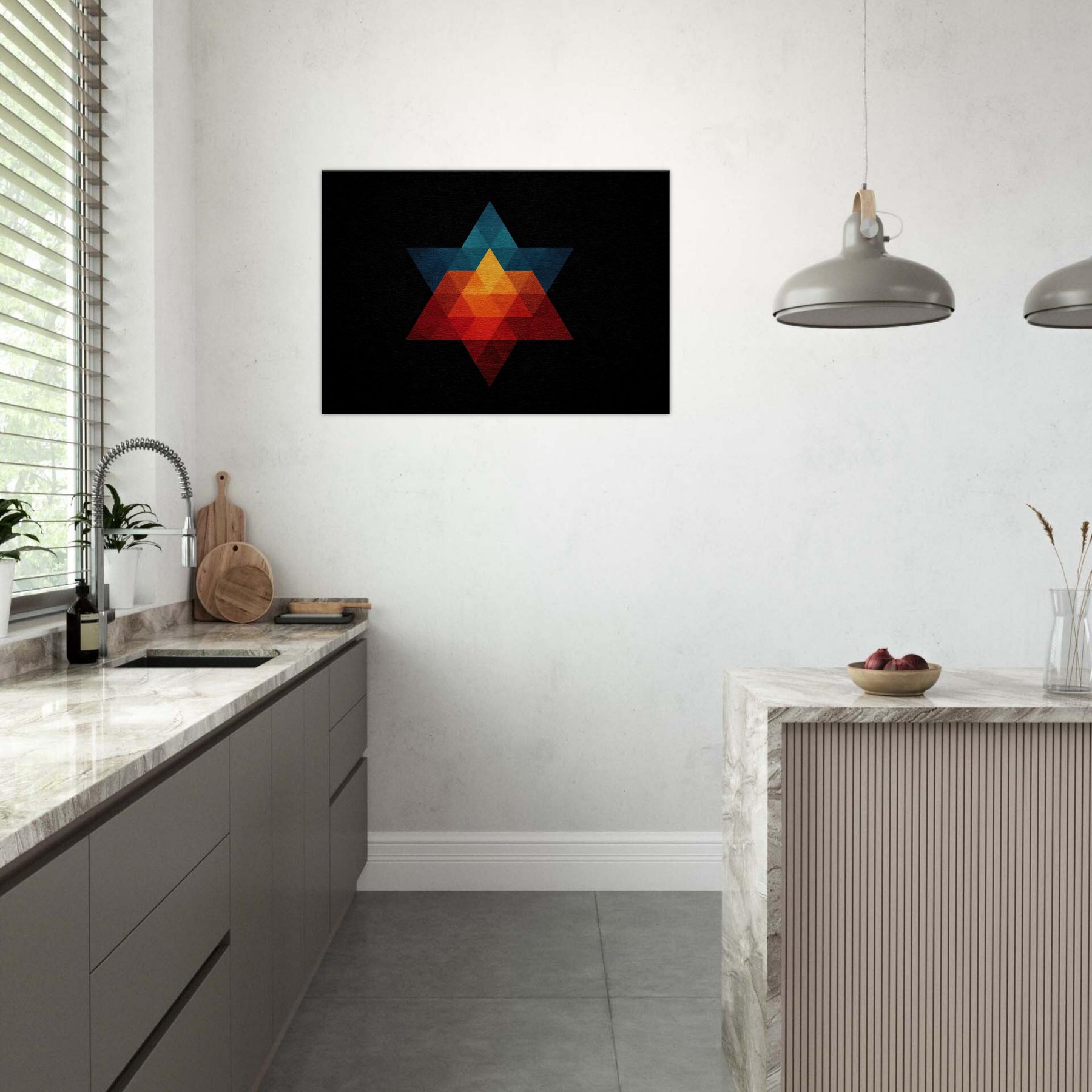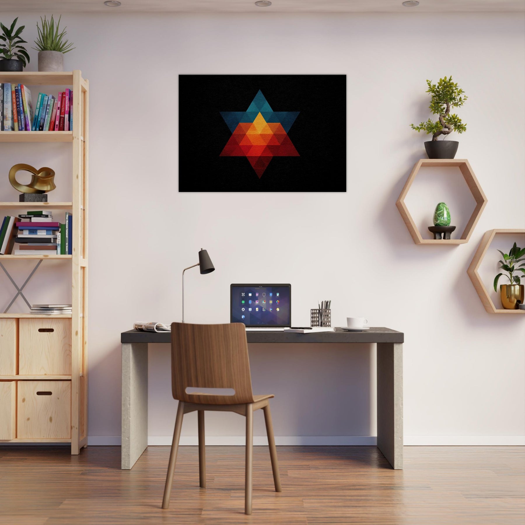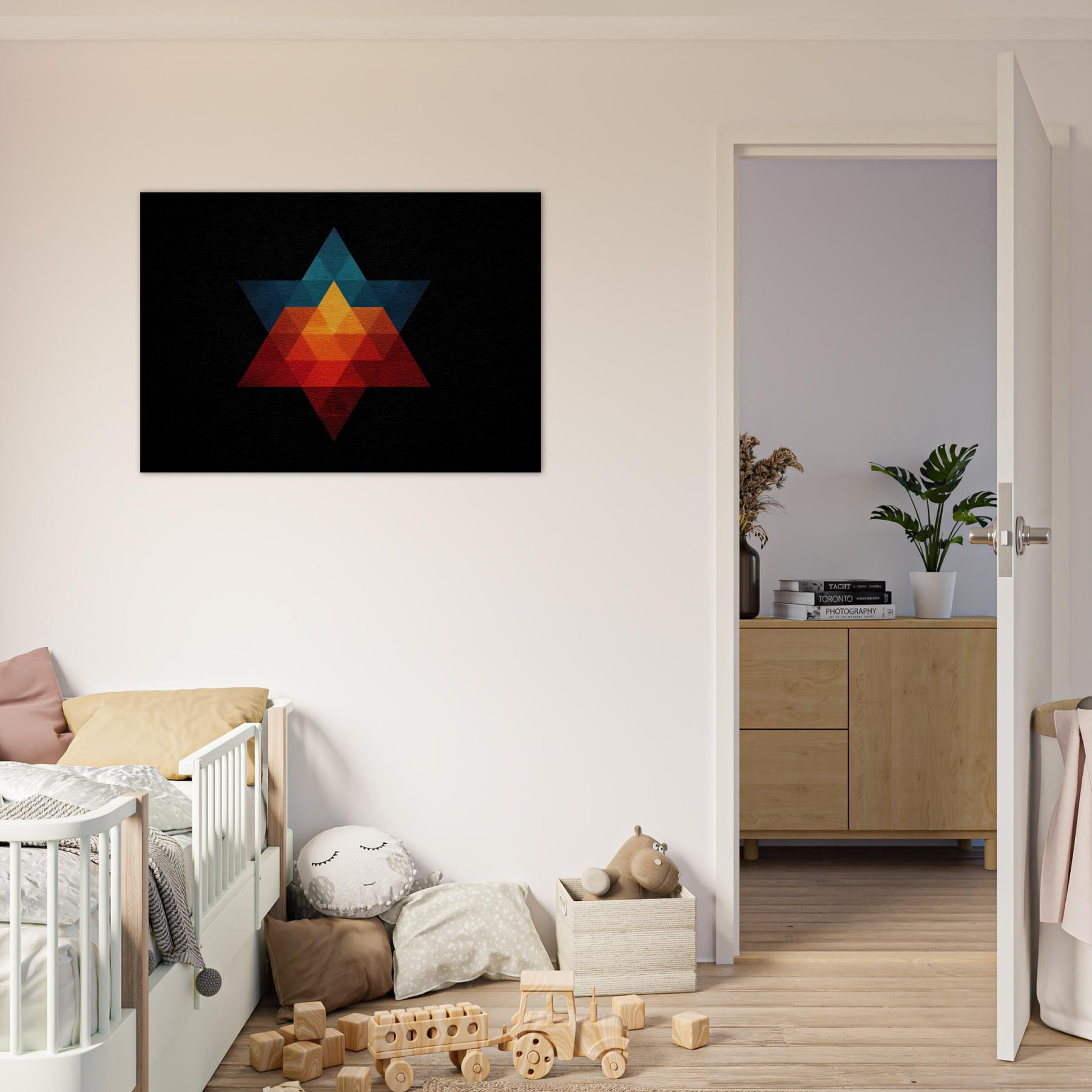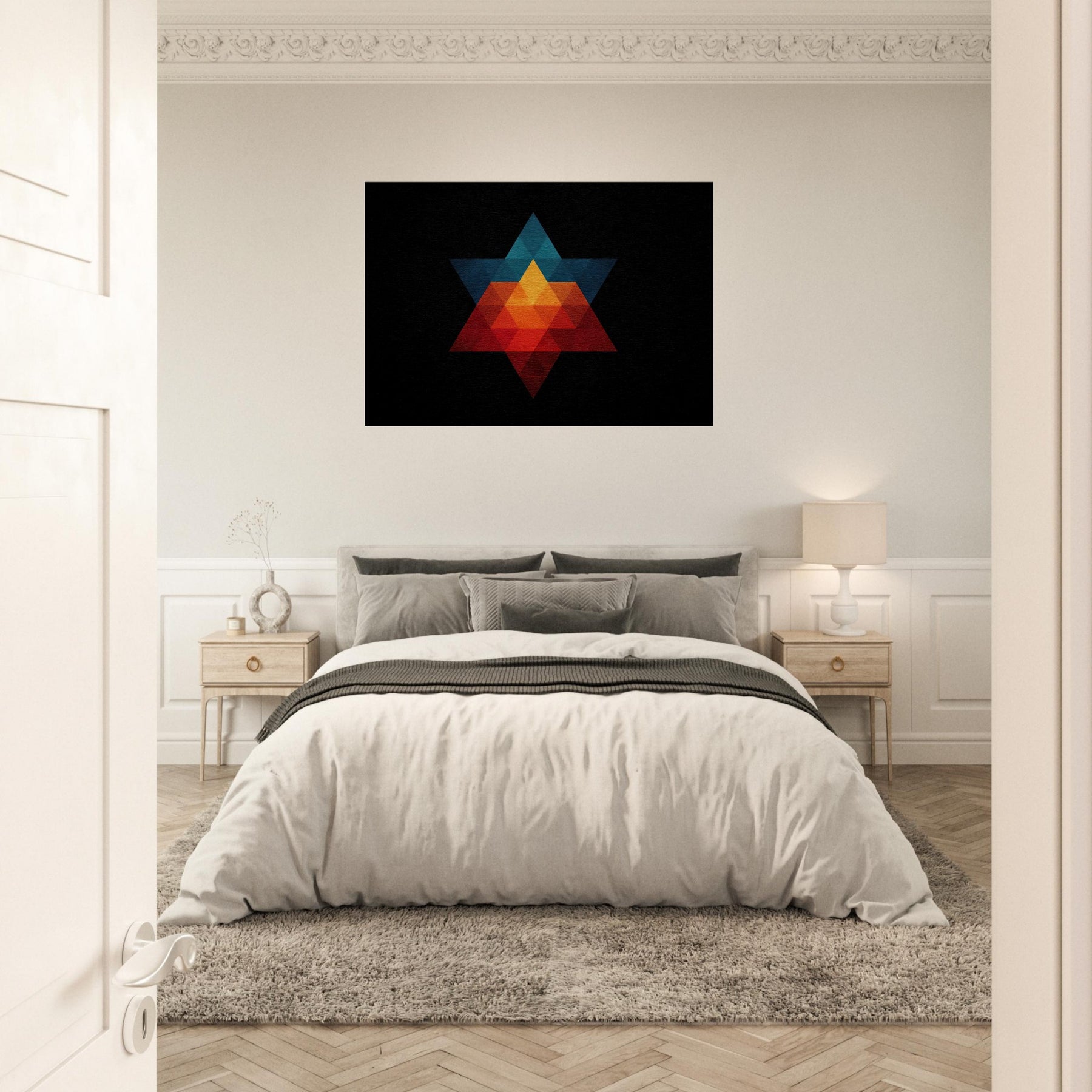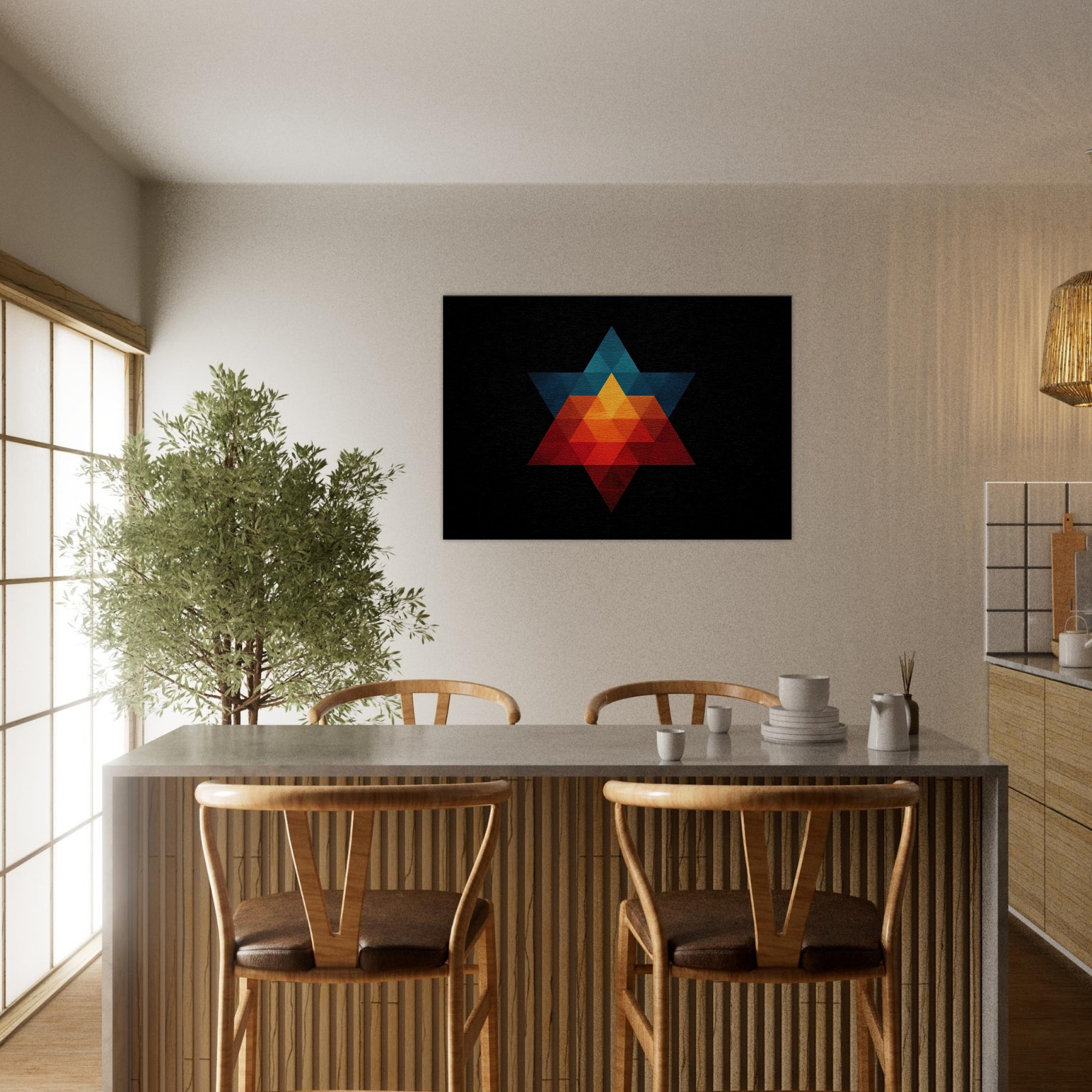 An elegant study in light and geometry, this Star of David appears as a constellation drawn with quiet, deliberate strokes. The abstract arrangement of overlapping triangles awakens a soft, molten glow blue at the crown, warming through amber to a deep crimson at the base like twilight poured into a single frame. Minimalist and mystical, it invites contemplation and calm, turning a living space into a sanctuary where color and form meet. Hang it where you seek balance, conversation, and a subtle, radiant energy. The central subject is Star of David (Minimal Line).