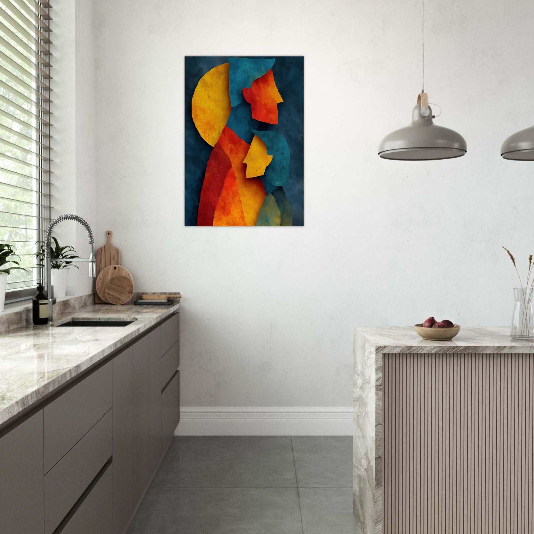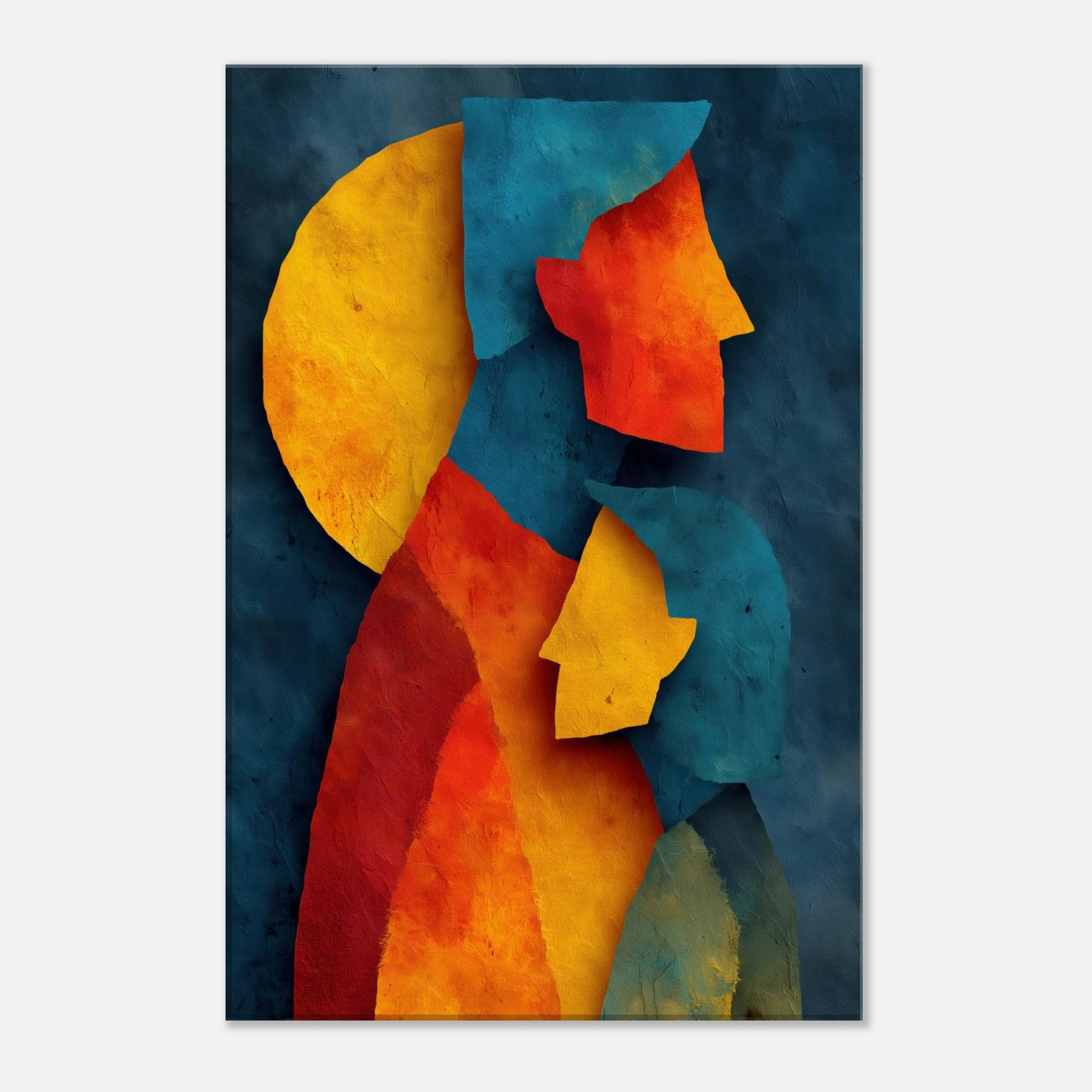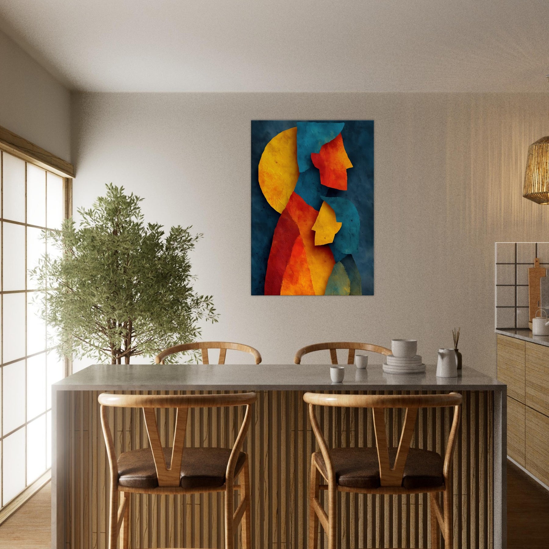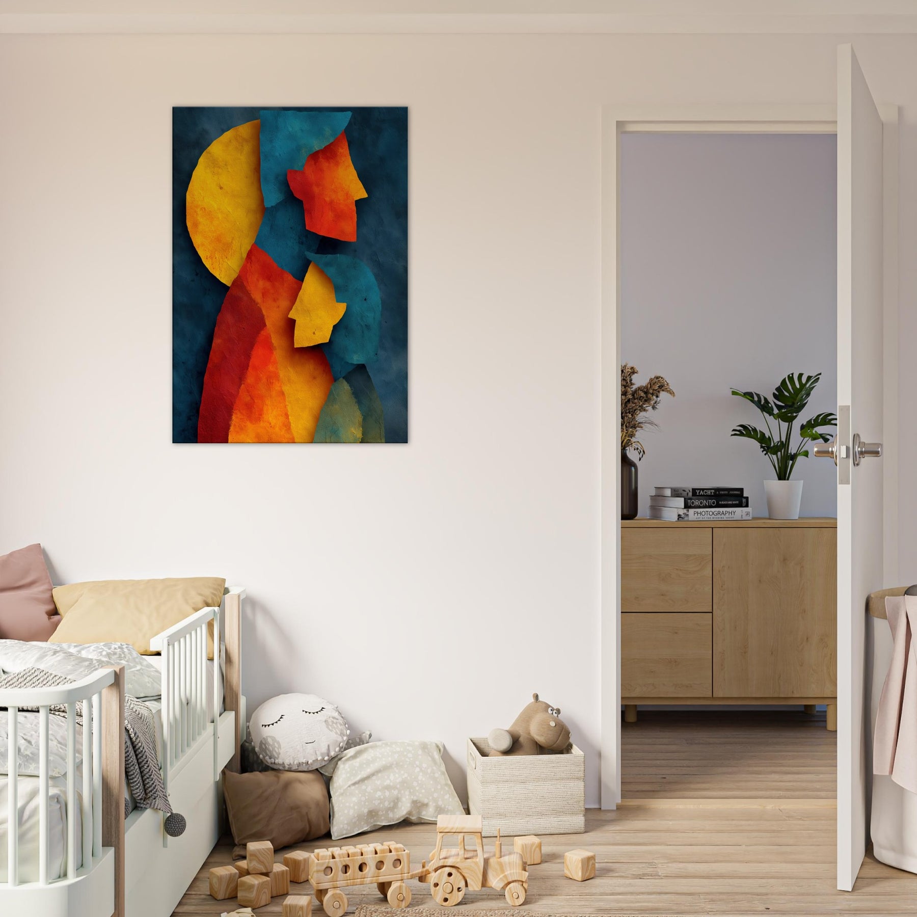 Framed around the Primary Subject a parent and child this abstract study gathers luminous crescents and torn paper shapes into a tender, kinetic dialogue. Warm yellows and coral reds circle against a midnight blue, inviting sunlight and memory to mingle on your wall. The composition exudes protection, curiosity, and quiet joy, turning any living space into a sanctuary where connection is felt as much as seen. Hang this piece to soften rooms, spark conversation, and remind everyday life of intimate, enduring bonds.