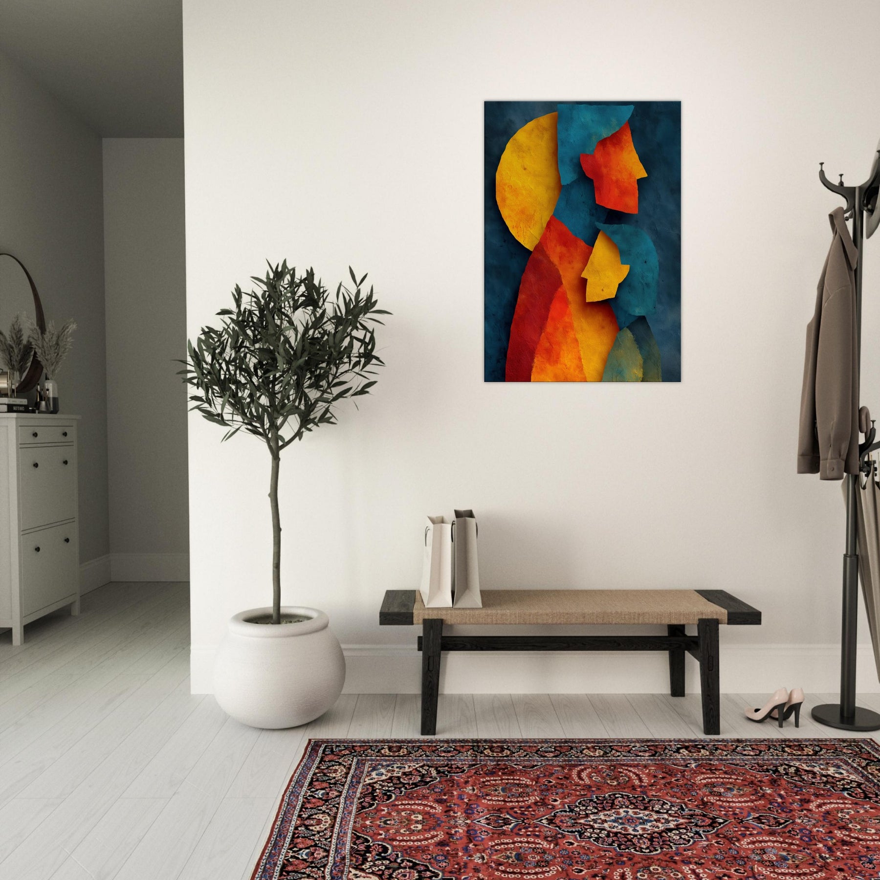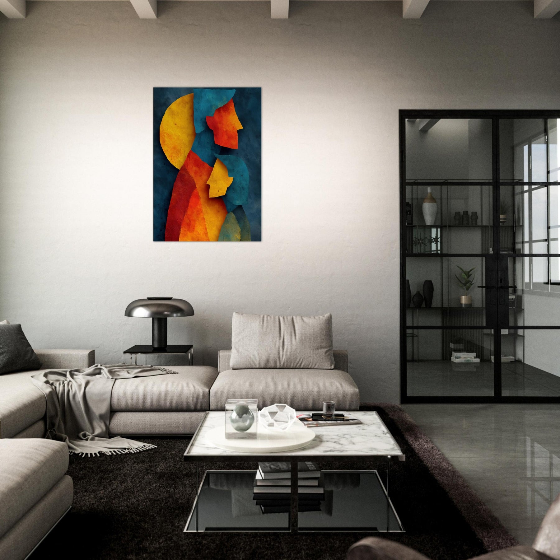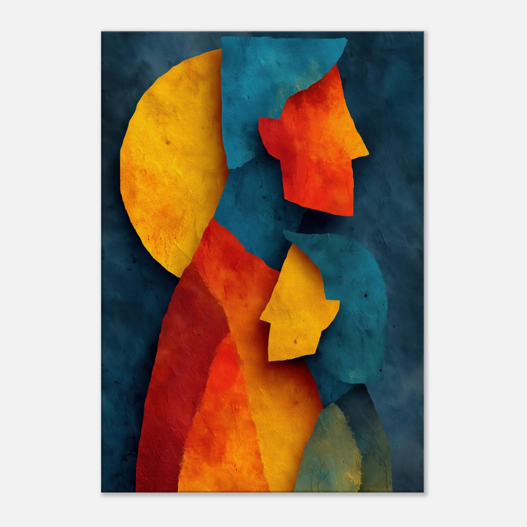 Framed around the Primary Subject a parent and child this abstract study gathers luminous crescents and torn paper shapes into a tender, kinetic dialogue. Warm yellows and coral reds circle against a midnight blue, inviting sunlight and memory to mingle on your wall. The composition exudes protection, curiosity, and quiet joy, turning any living space into a sanctuary where connection is felt as much as seen. Hang this piece to soften rooms, spark conversation, and remind everyday life of intimate, enduring bonds.