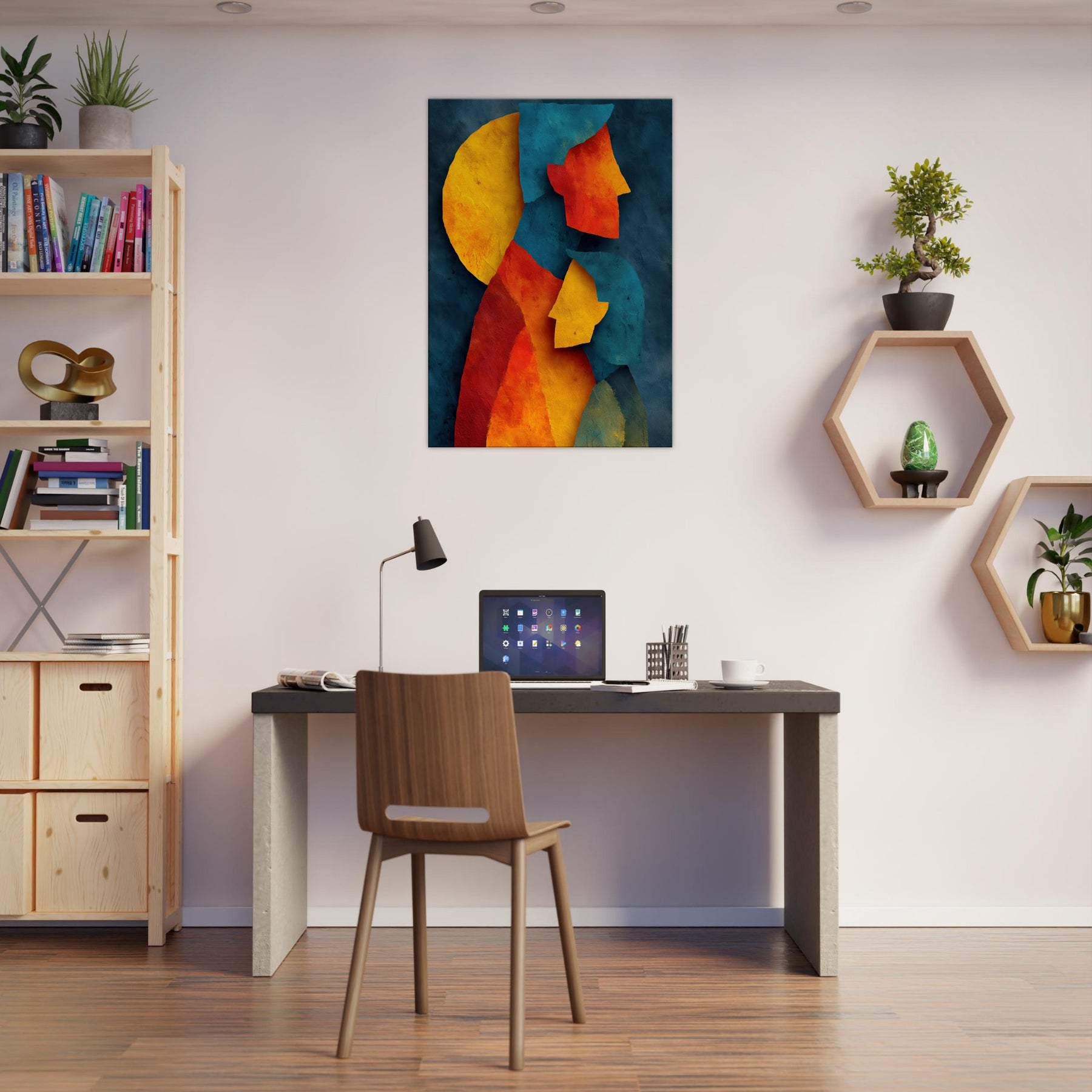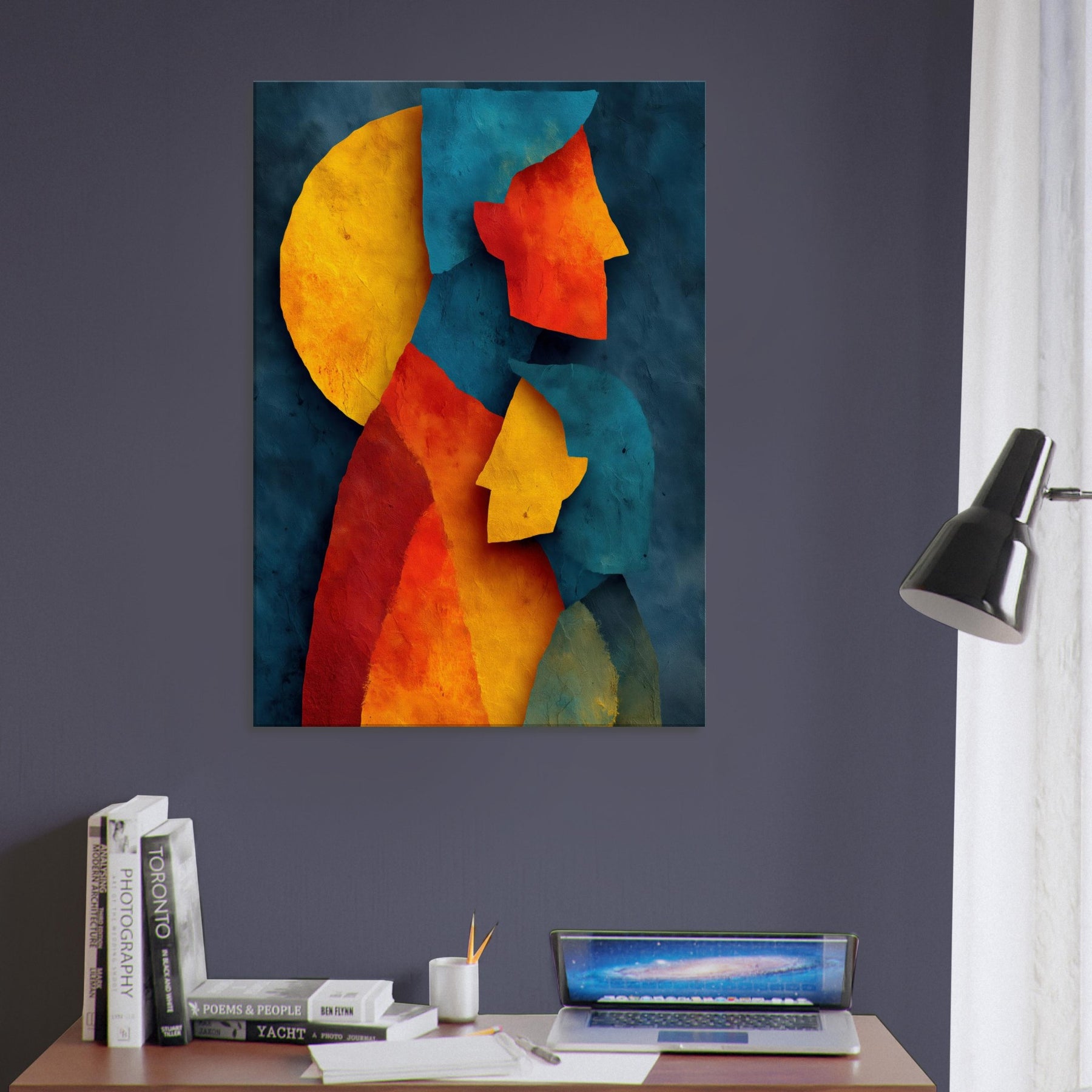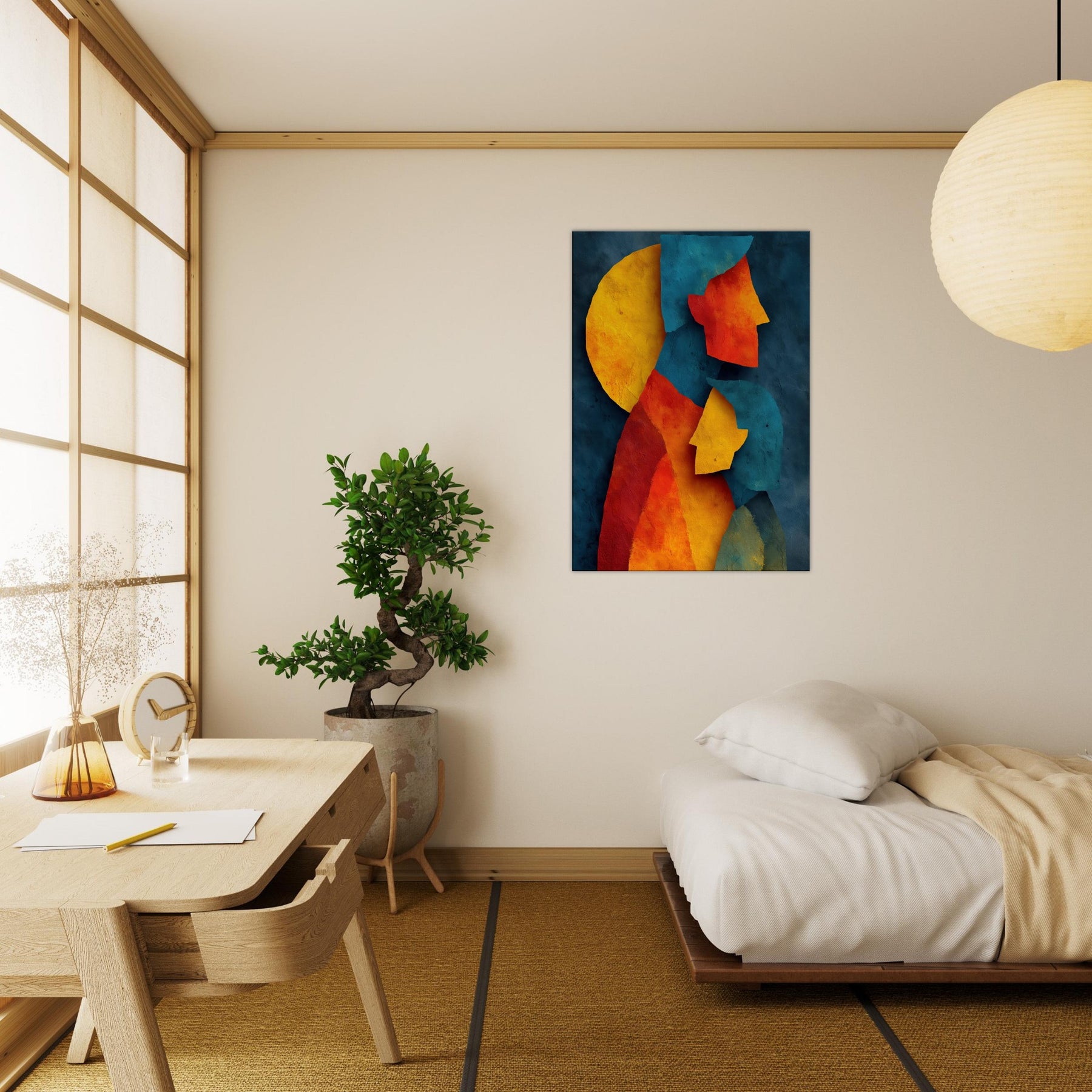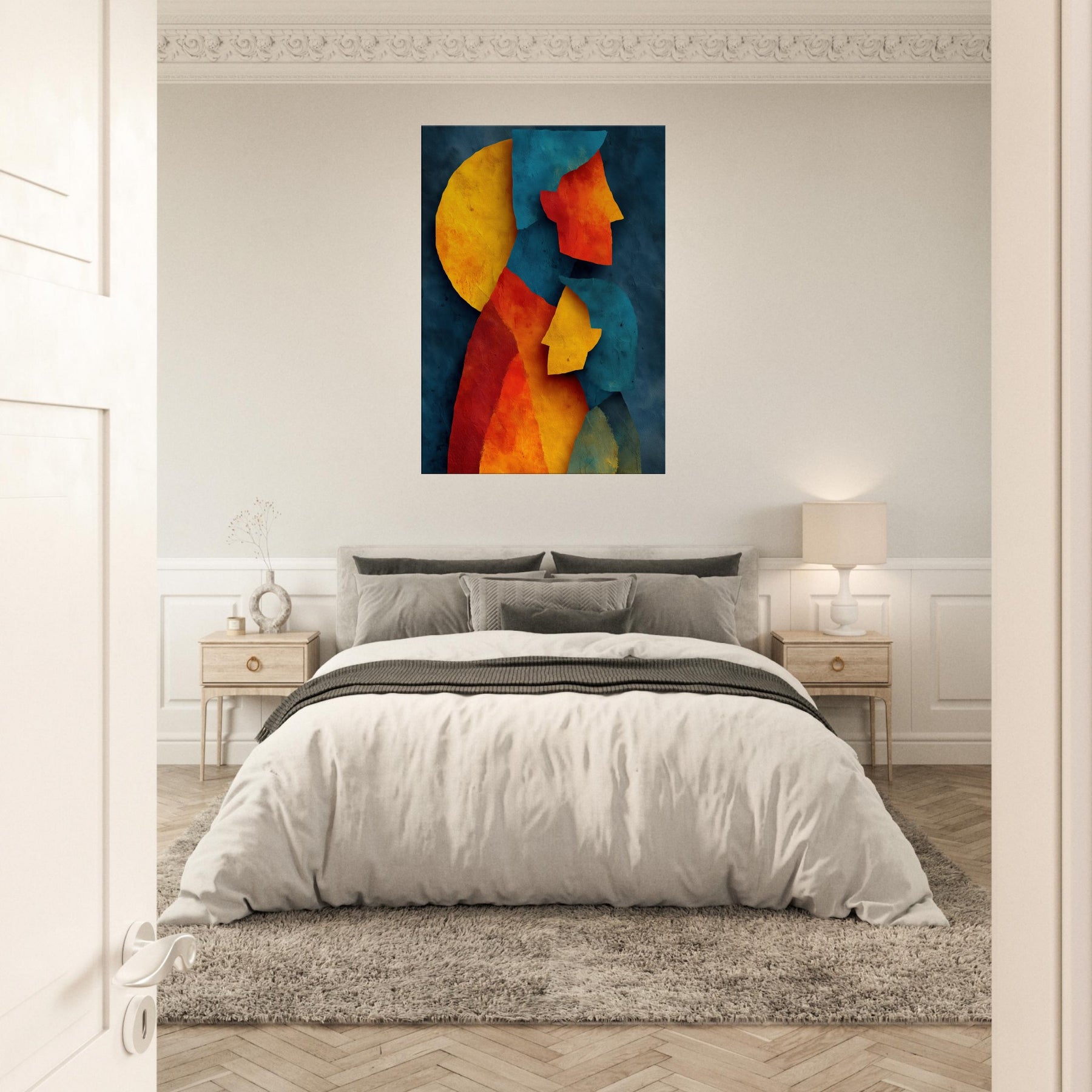 Framed around the Primary Subject a parent and child this abstract study gathers luminous crescents and torn paper shapes into a tender, kinetic dialogue. Warm yellows and coral reds circle against a midnight blue, inviting sunlight and memory to mingle on your wall. The composition exudes protection, curiosity, and quiet joy, turning any living space into a sanctuary where connection is felt as much as seen. Hang this piece to soften rooms, spark conversation, and remind everyday life of intimate, enduring bonds.