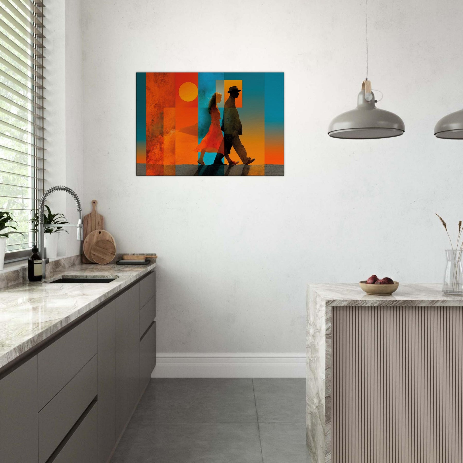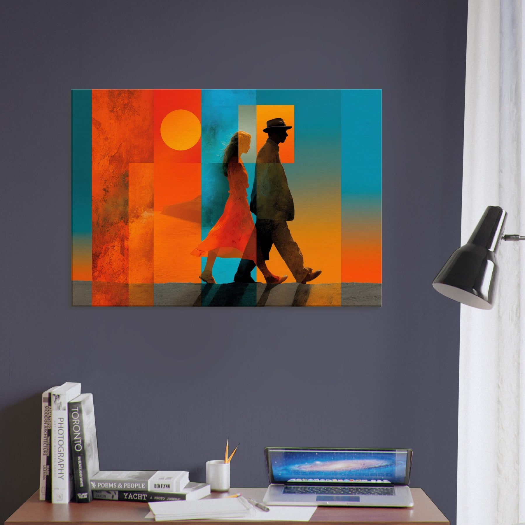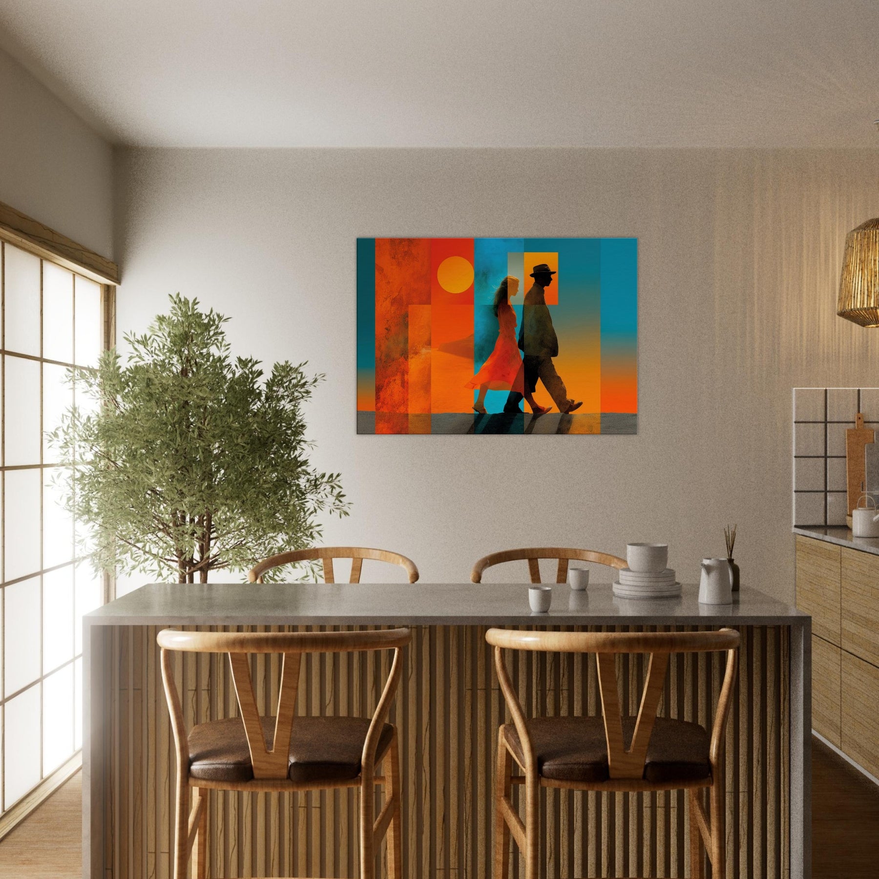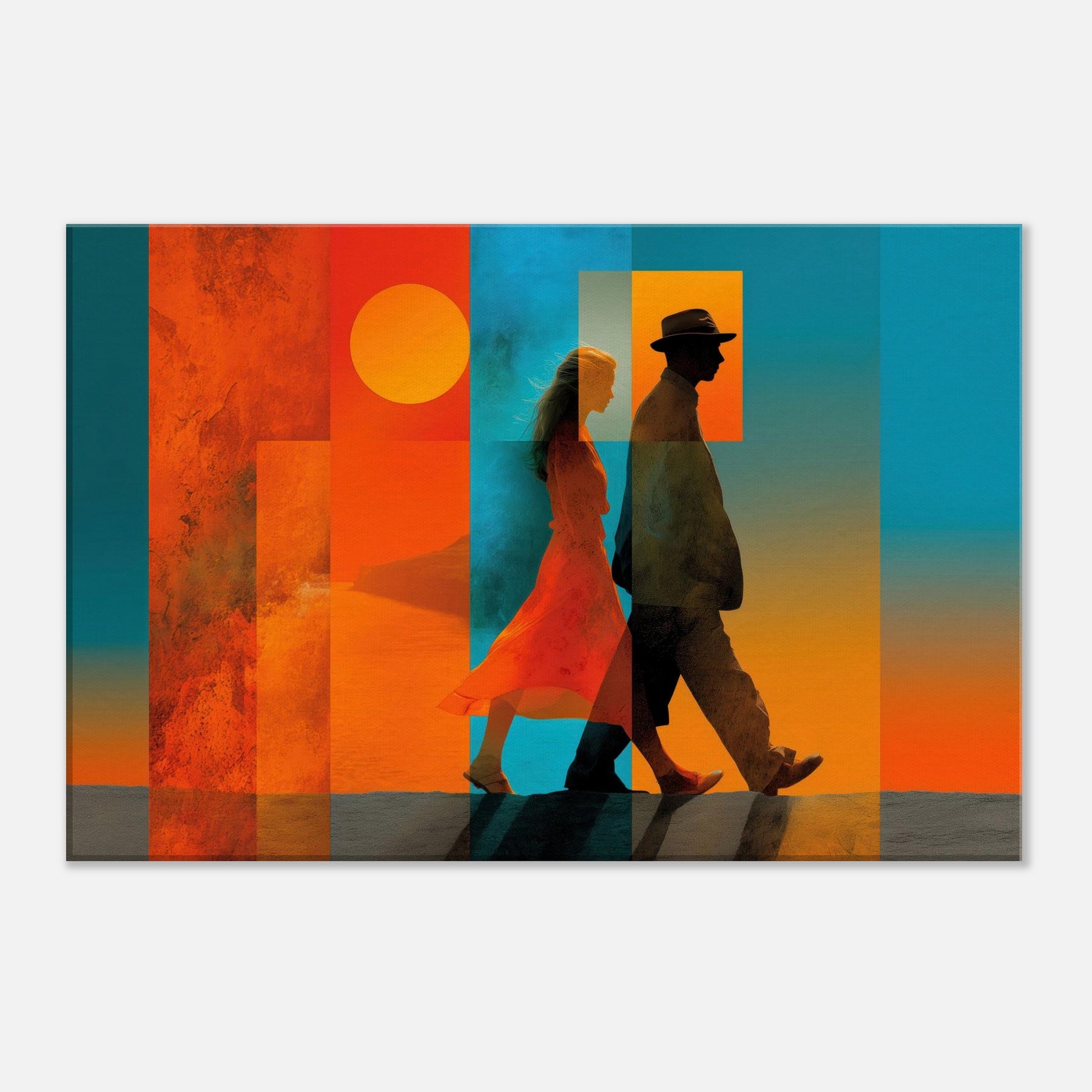 Couple Walking strides through a dream of color, alive with sunlit warmth and oceanic blues. This abstract composition layers translucent panels that catch light and cast shifting shadows, turning a wall into a quiet horizon. The Couple Walking becomes a focal point of calm energy, inviting conversation and memory, while the saturated warmth anchors a room with intimacy and movement. Perfect for a living room, bedroom, or entryway, it pairs crisp silhouettes with warm gradients to elevate mood and style.