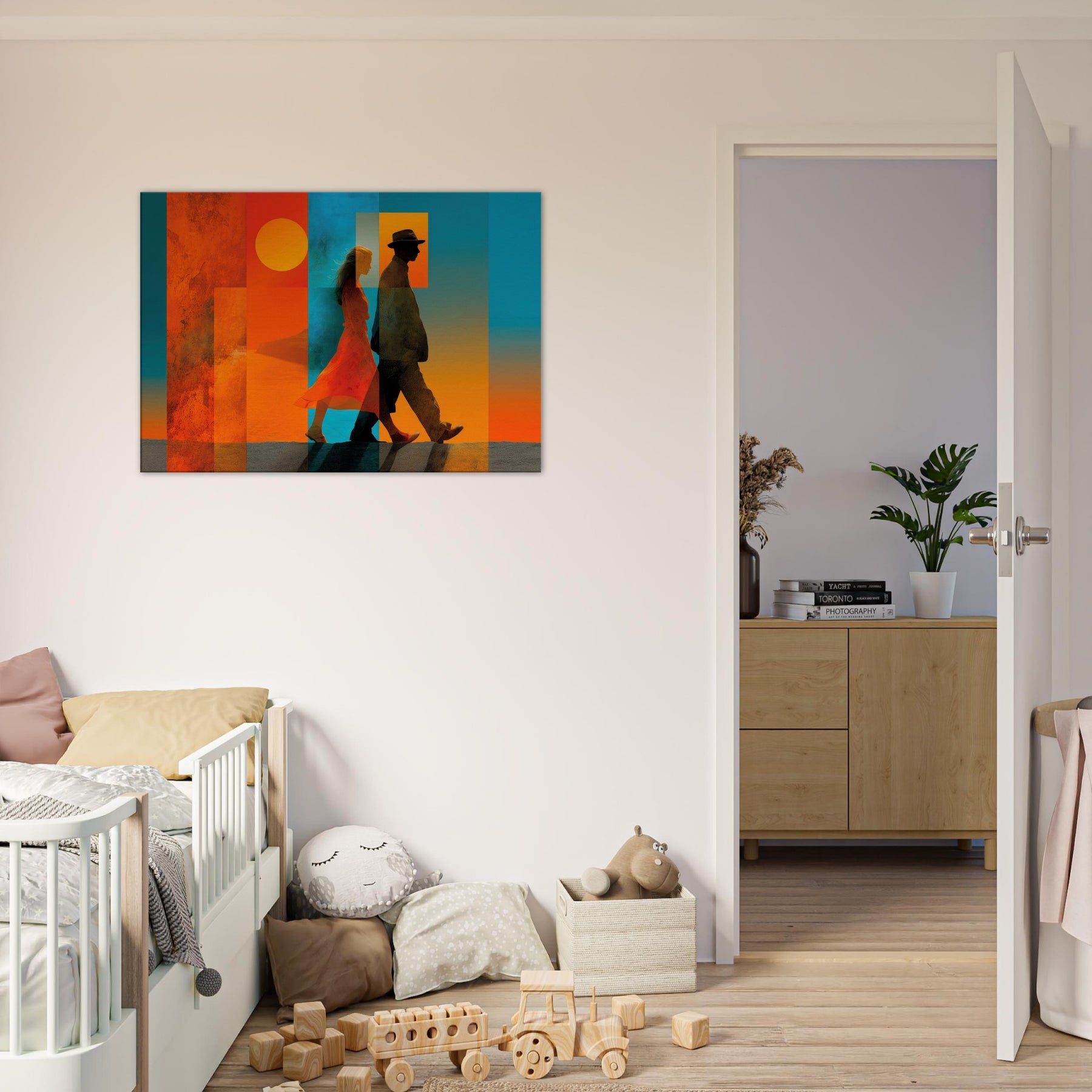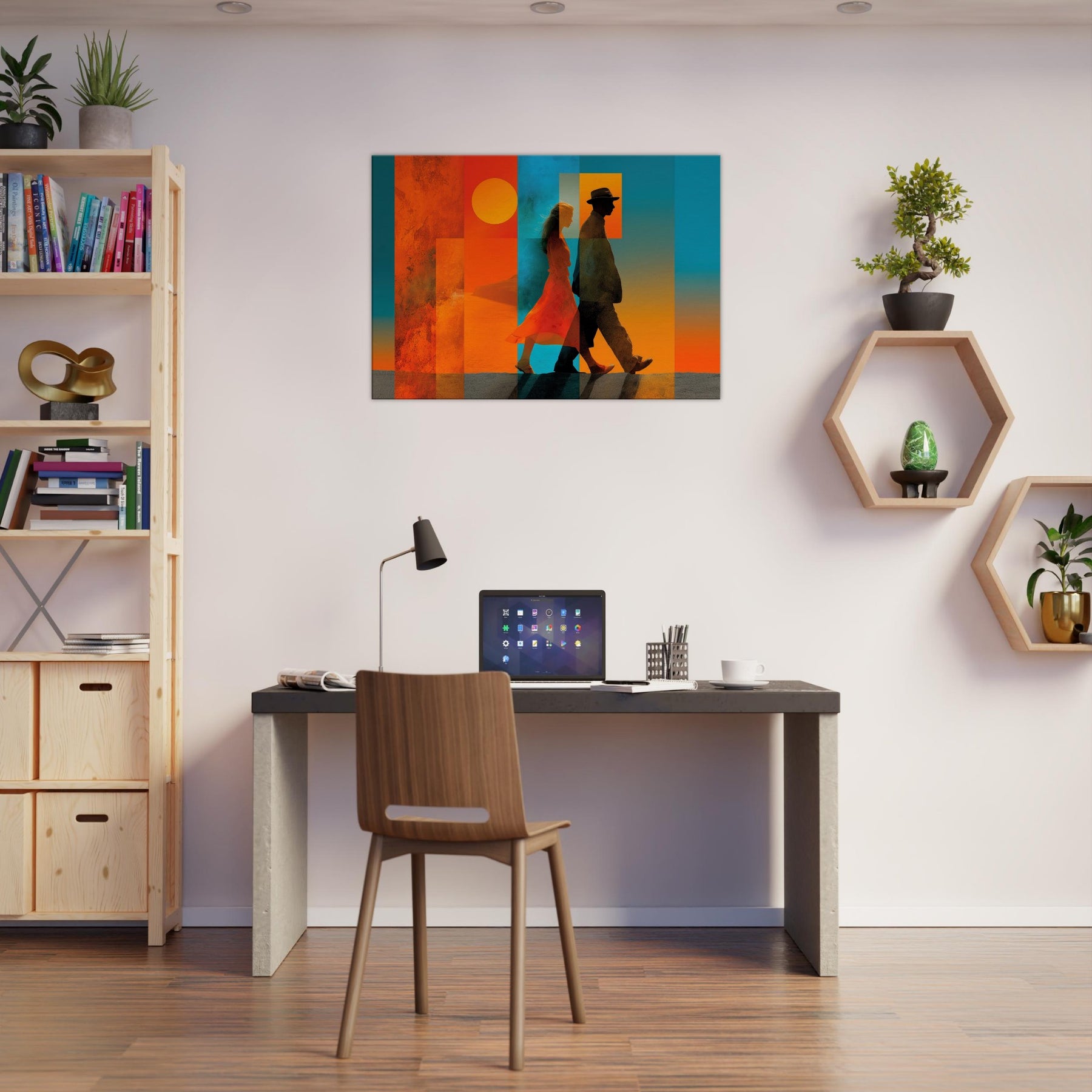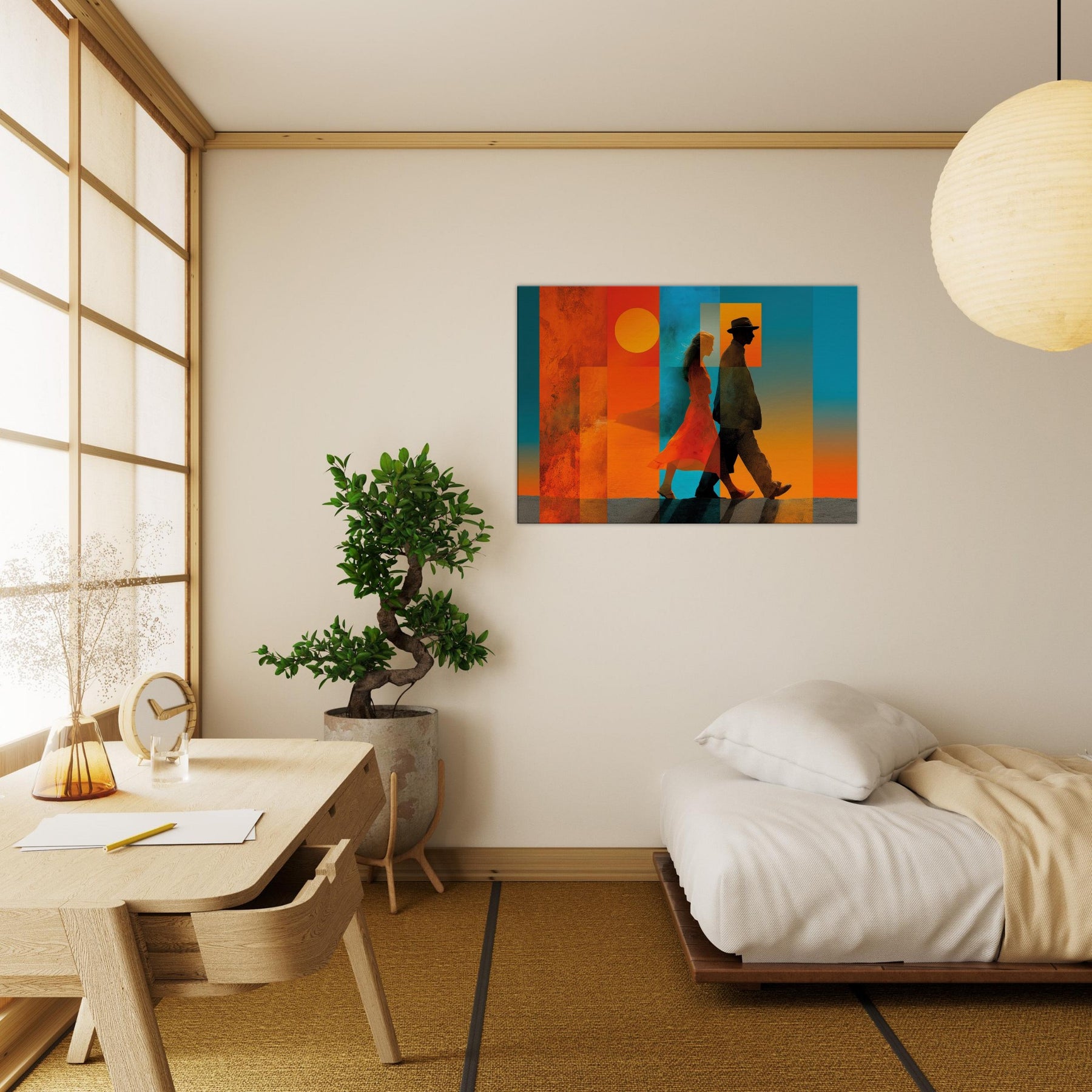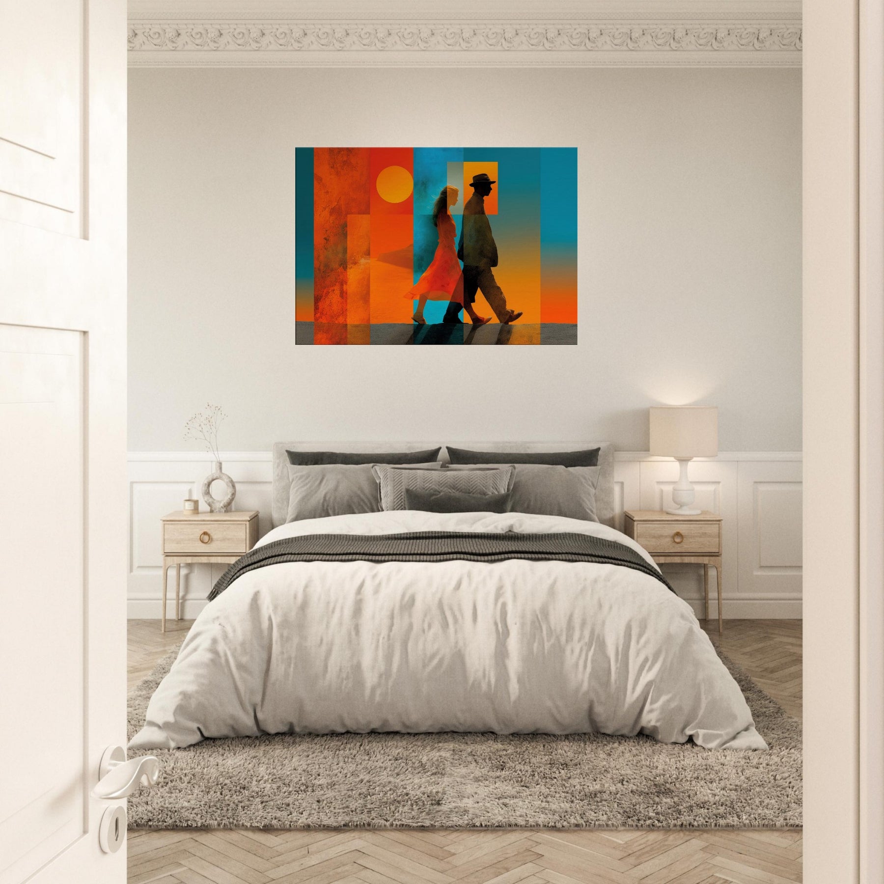 Couple Walking strides through a dream of color, alive with sunlit warmth and oceanic blues. This abstract composition layers translucent panels that catch light and cast shifting shadows, turning a wall into a quiet horizon. The Couple Walking becomes a focal point of calm energy, inviting conversation and memory, while the saturated warmth anchors a room with intimacy and movement. Perfect for a living room, bedroom, or entryway, it pairs crisp silhouettes with warm gradients to elevate mood and style.