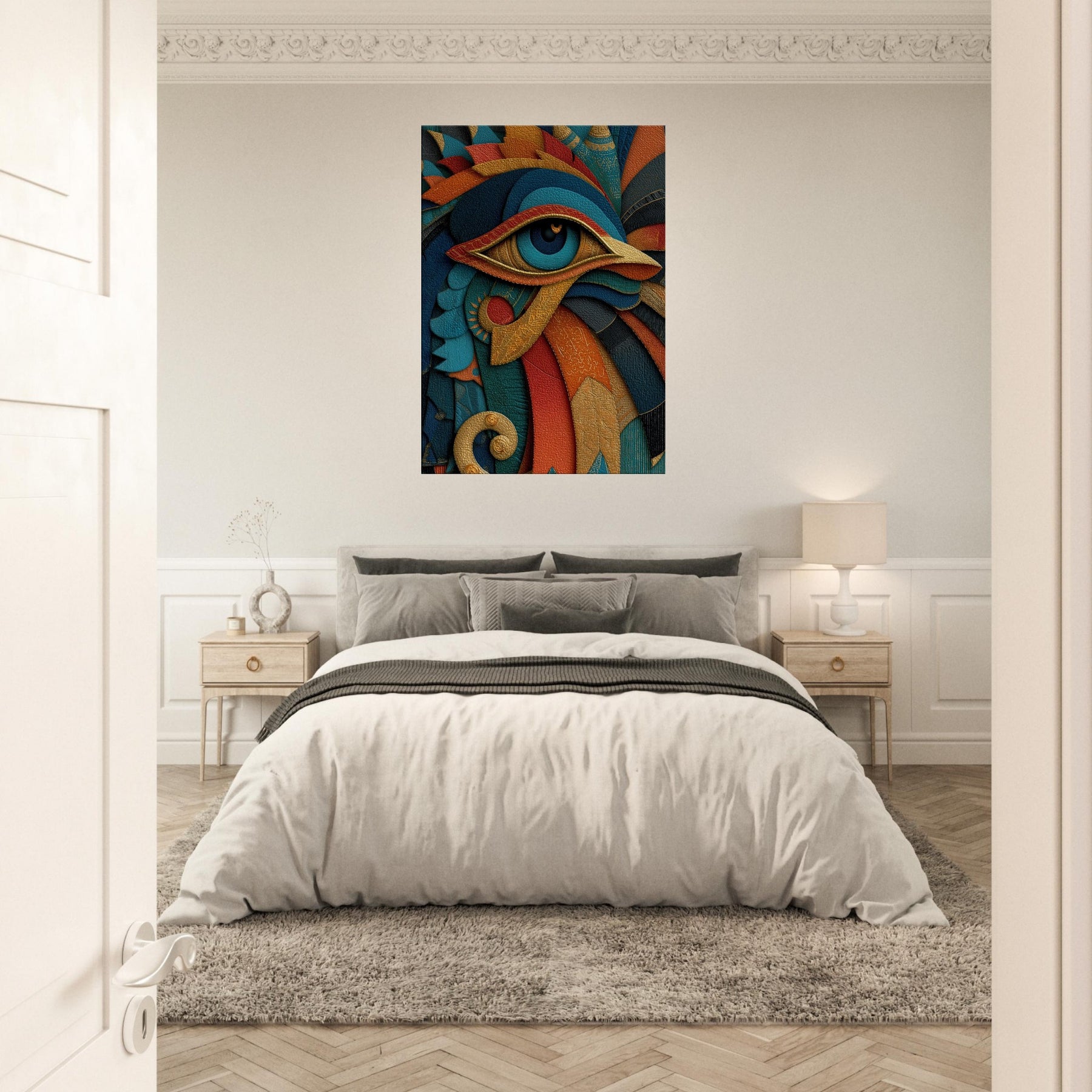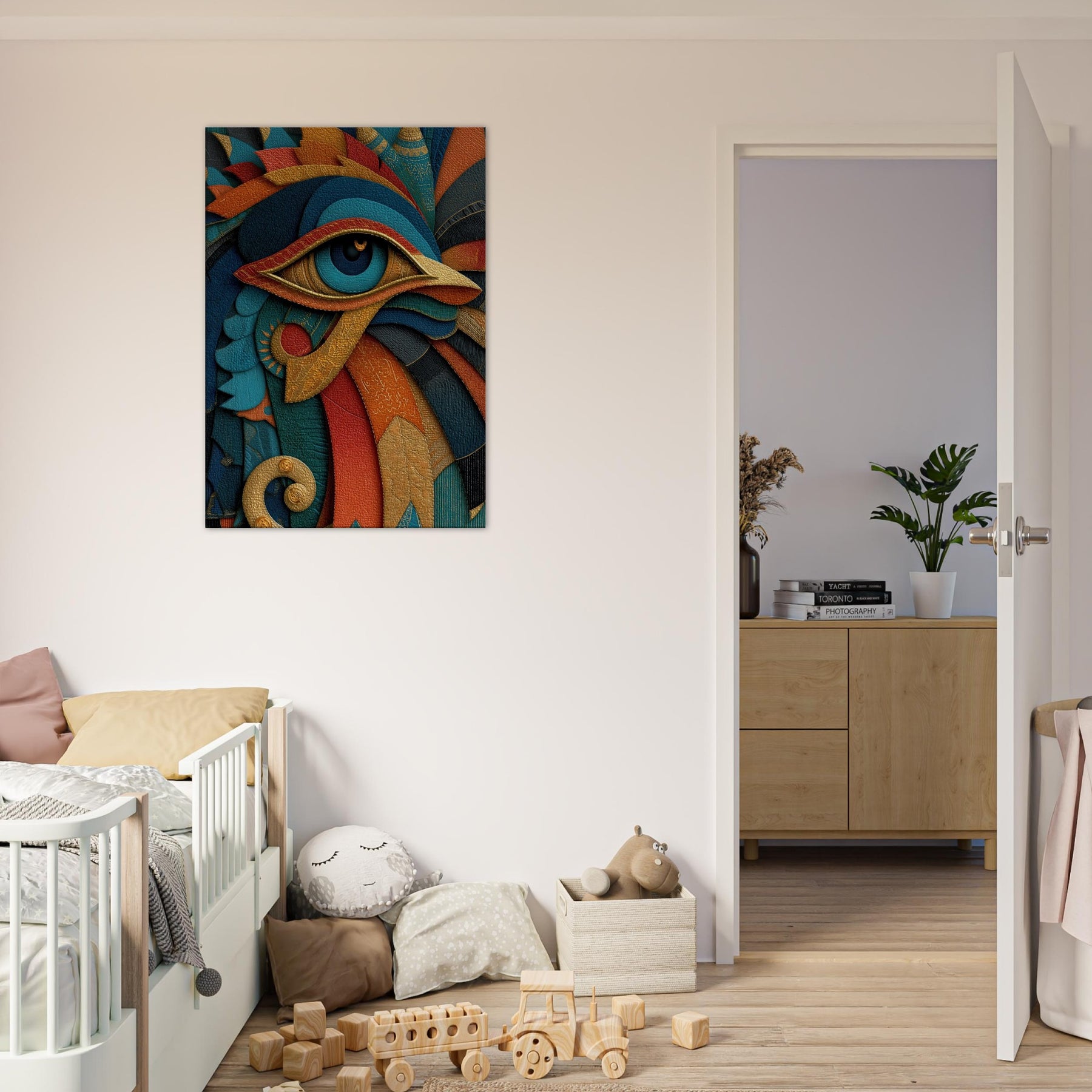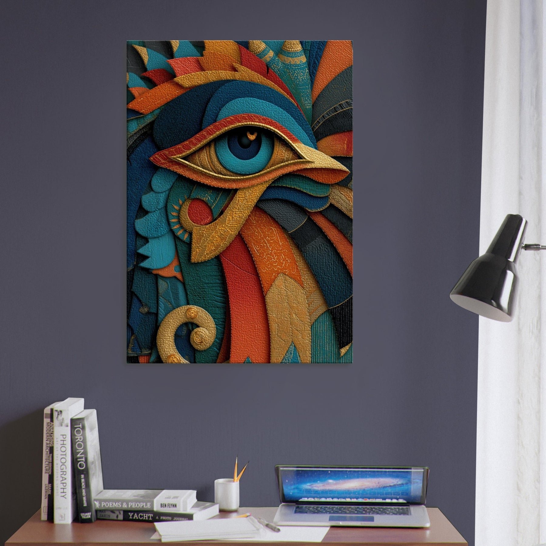 Eye of Horus unfolds as a luminous puzzle of color and rhythm, where ancient symbolism meets contemporary chiaroscuro. Abstract forms spiral around a centered Eye of Horus, rendered in jewel tones of turquoise, gold, and burnt orange that shimmer like relics in afternoon light. The textured layers invite a tactile pause, turning any wall into a sanctuary of mystery and protection. Hang it where you wish for focus to rise the living room, study, or hallway and let the mystical gaze guide conversations and dreams alike.