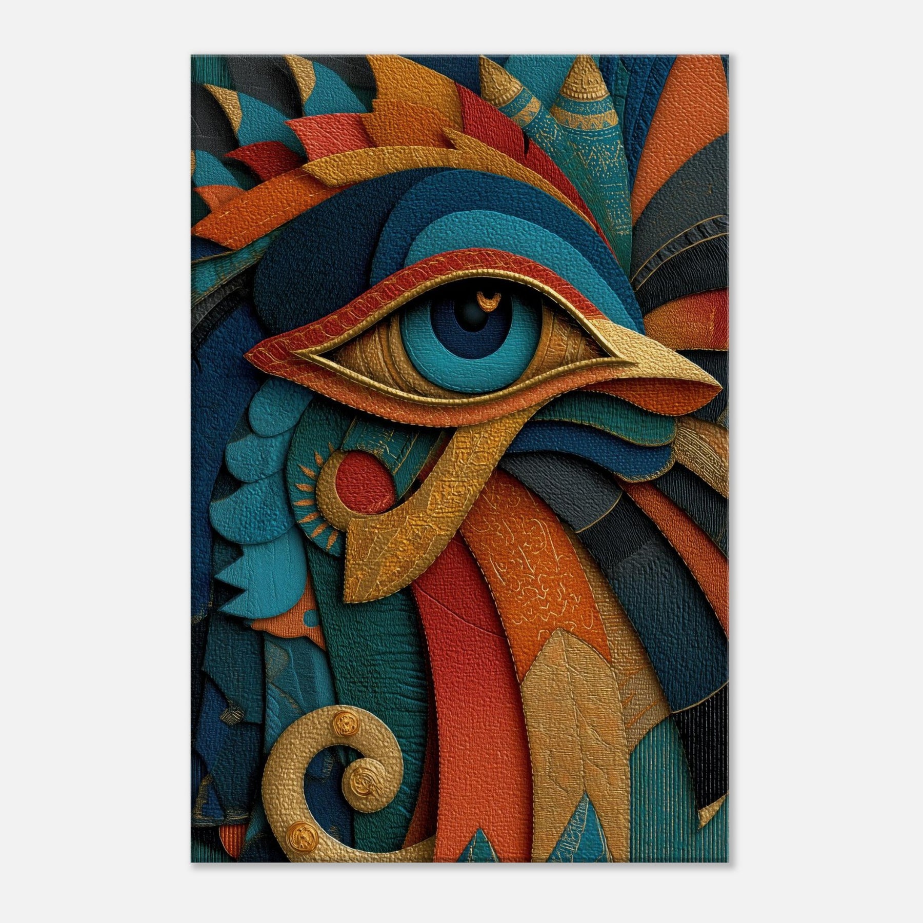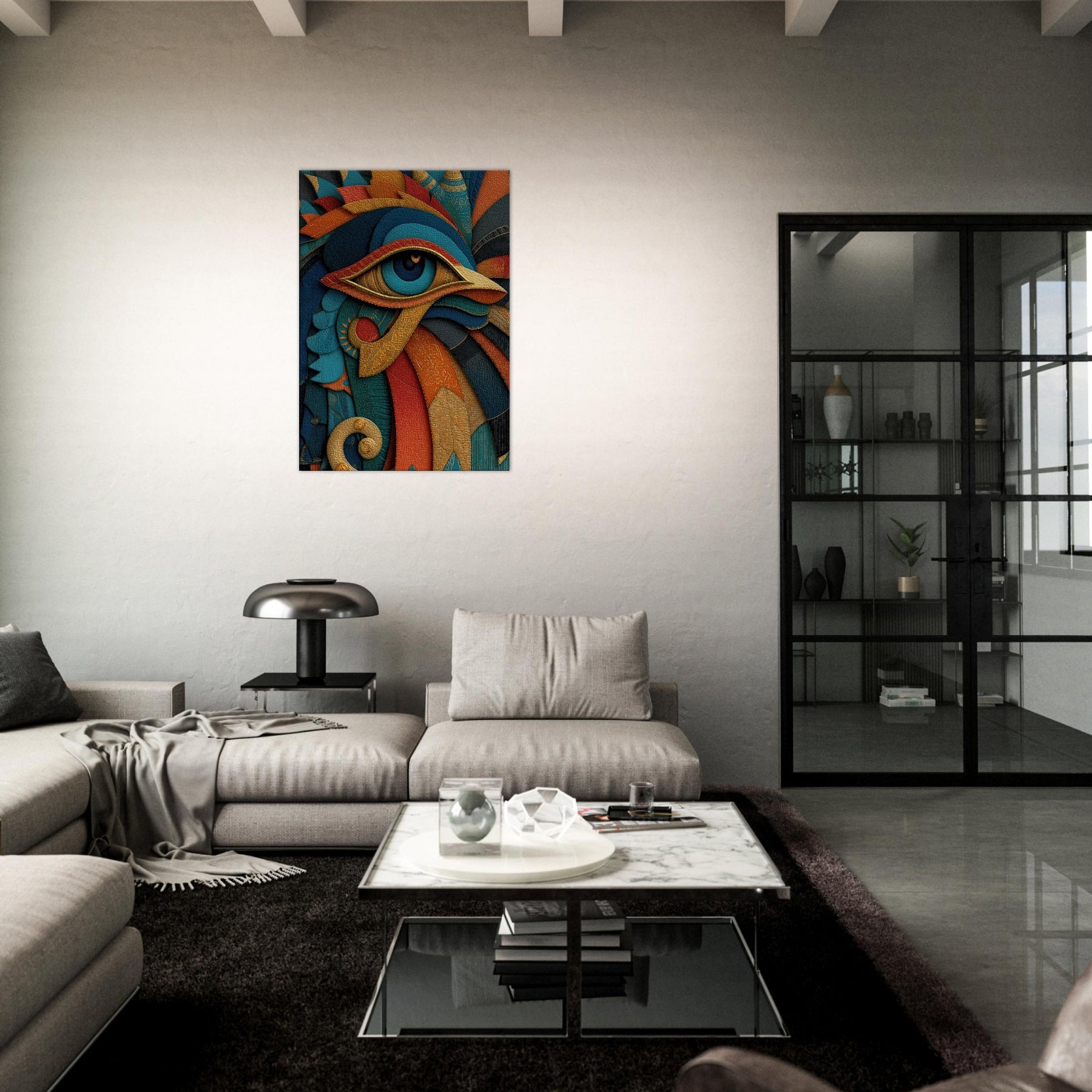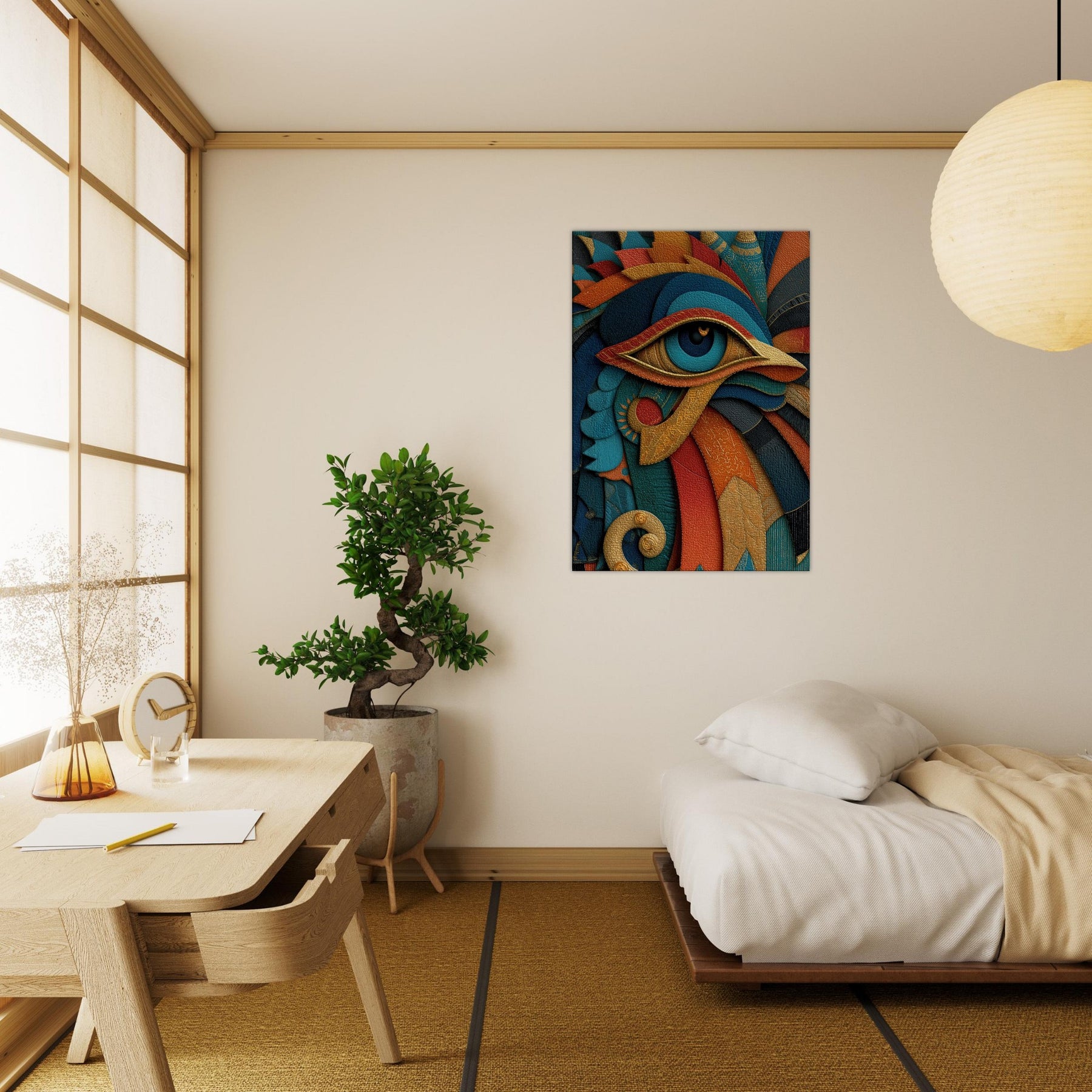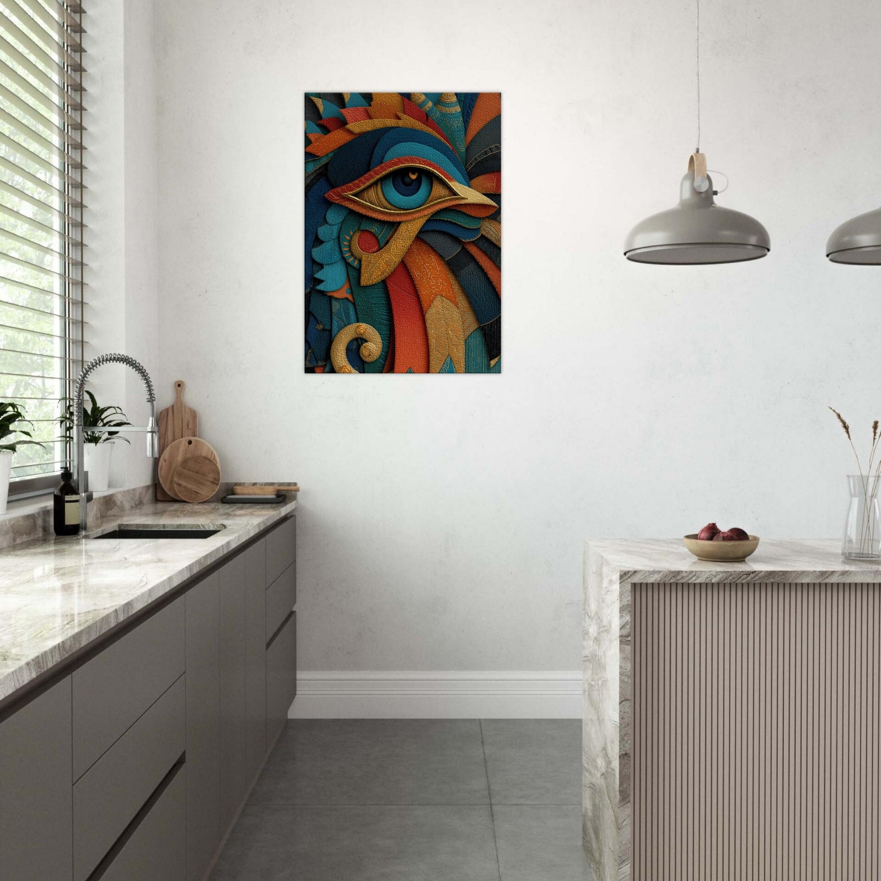 Eye of Horus unfolds as a luminous puzzle of color and rhythm, where ancient symbolism meets contemporary chiaroscuro. Abstract forms spiral around a centered Eye of Horus, rendered in jewel tones of turquoise, gold, and burnt orange that shimmer like relics in afternoon light. The textured layers invite a tactile pause, turning any wall into a sanctuary of mystery and protection. Hang it where you wish for focus to rise the living room, study, or hallway and let the mystical gaze guide conversations and dreams alike.