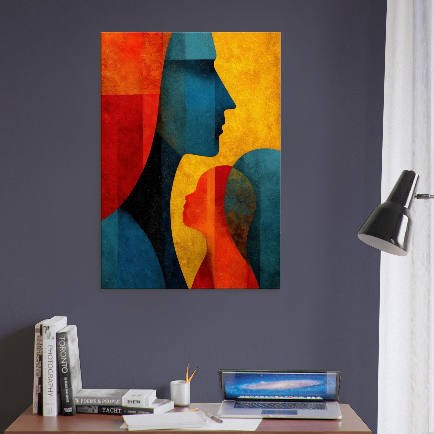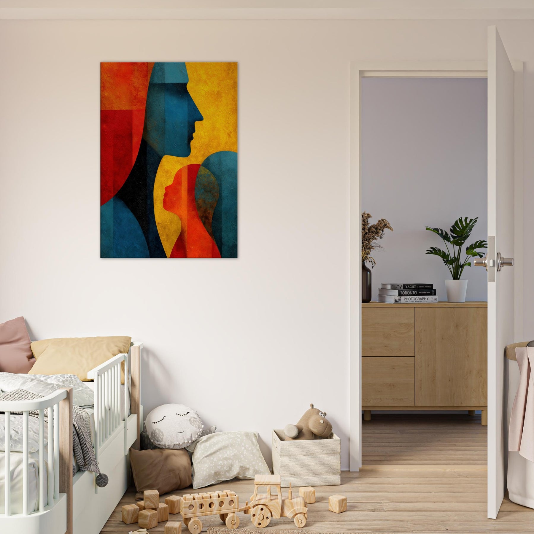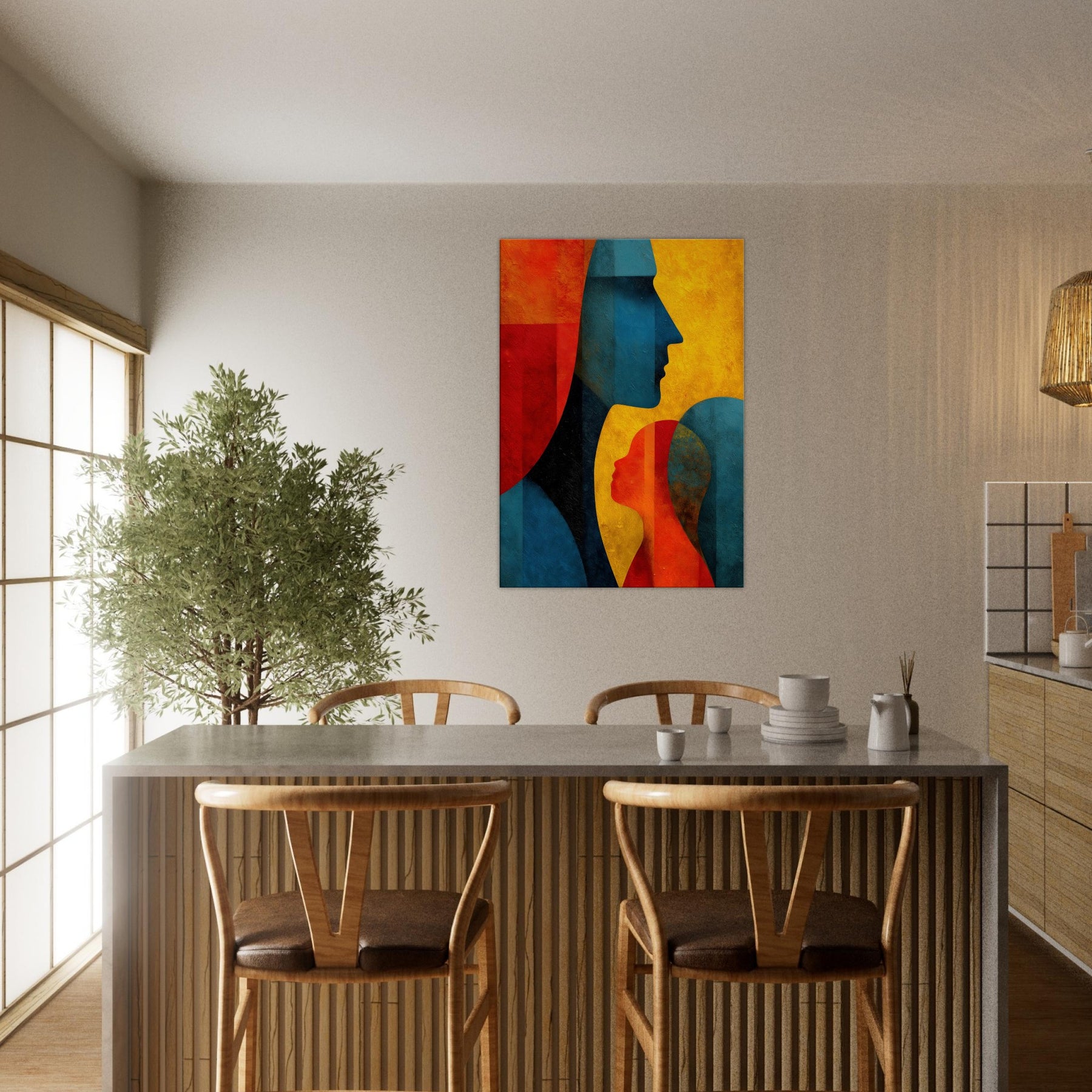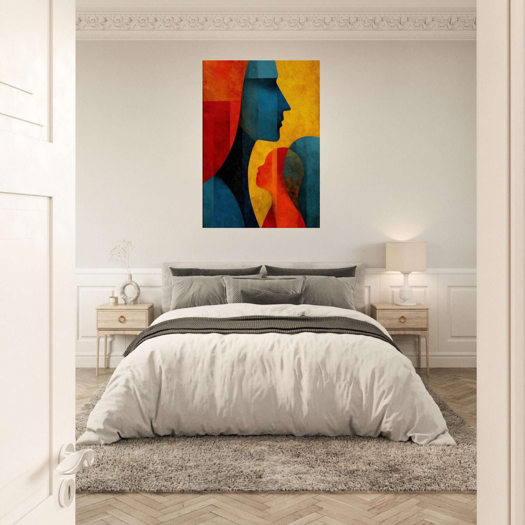 Meditative yet luminous, this abstract composition traces the quiet resonance between a parent and child. Bold blocks of color fold into intimate silhouettes, inviting soft light and warm conversations into your space. The layered tones cobalt, saffron, and ember flow like memory across the wall, turning a hallway into a sanctuary or a cozy living room into a haven of connection. Hang it where daily rituals unfold, and let the piece cradle the eye with a gentle, living atmosphere.