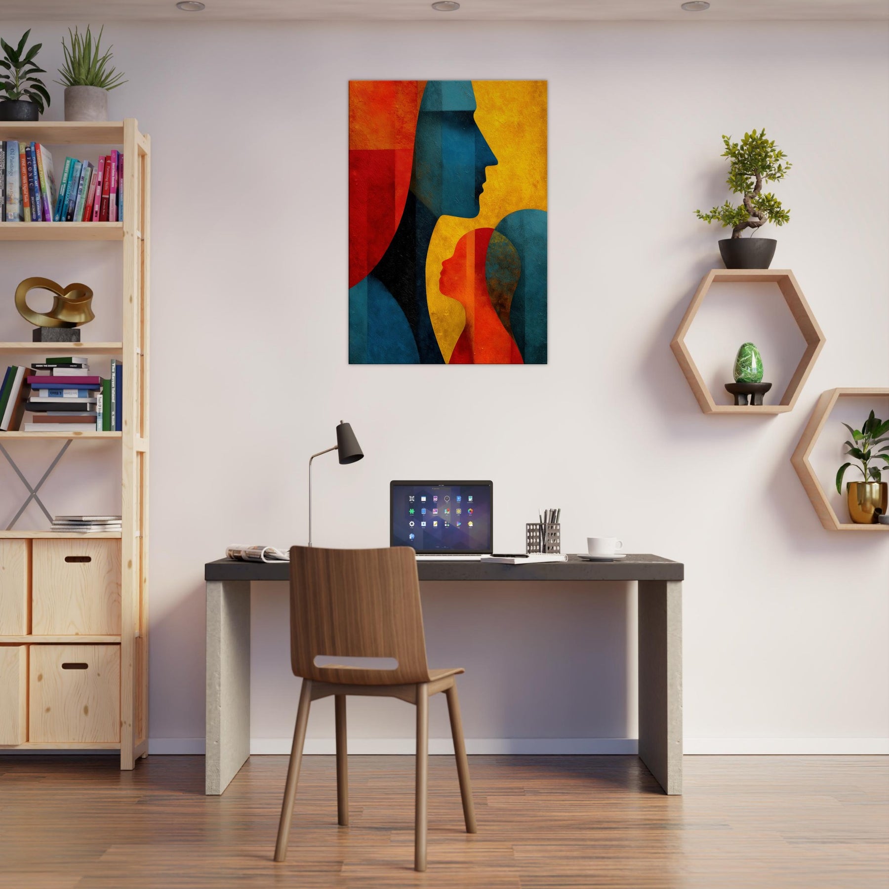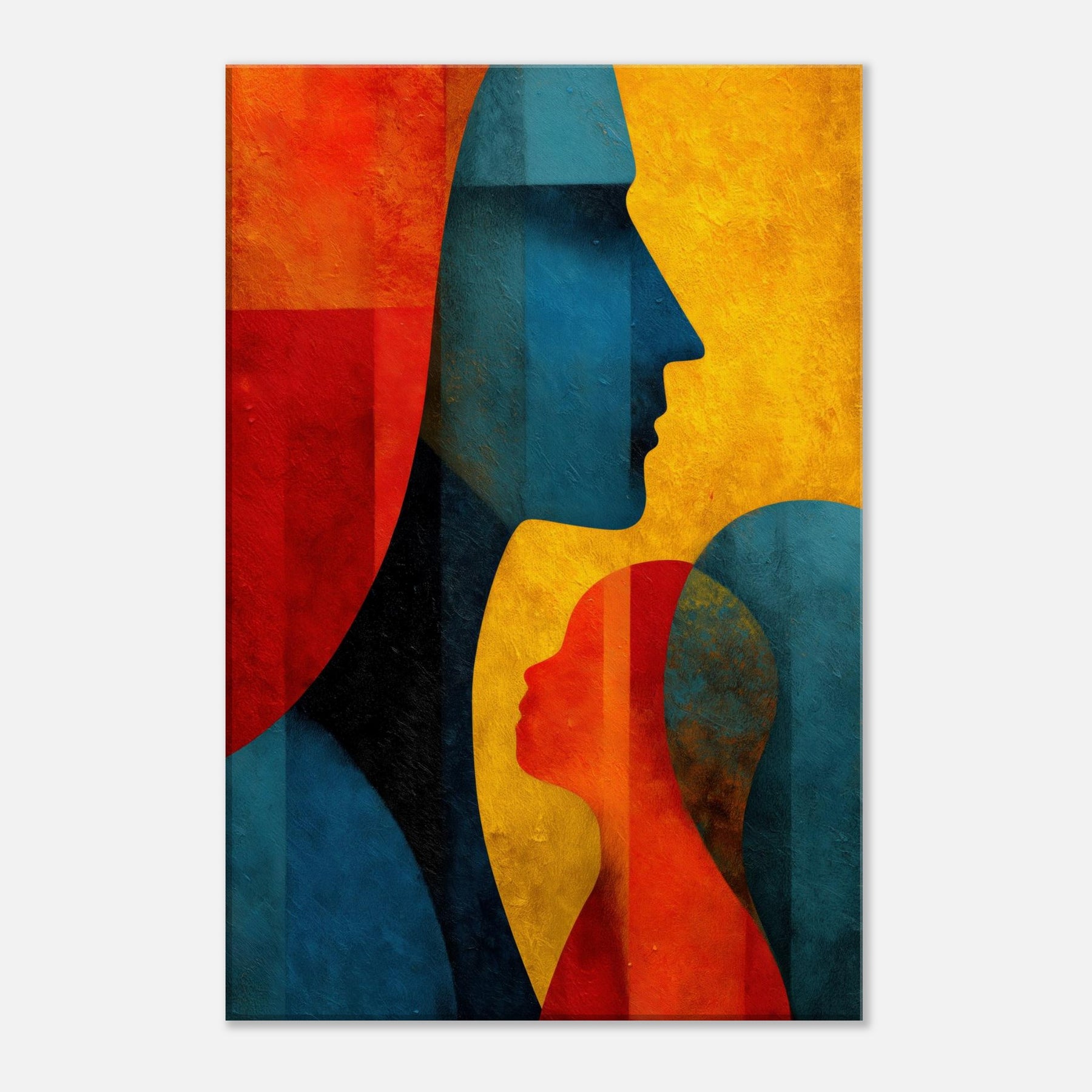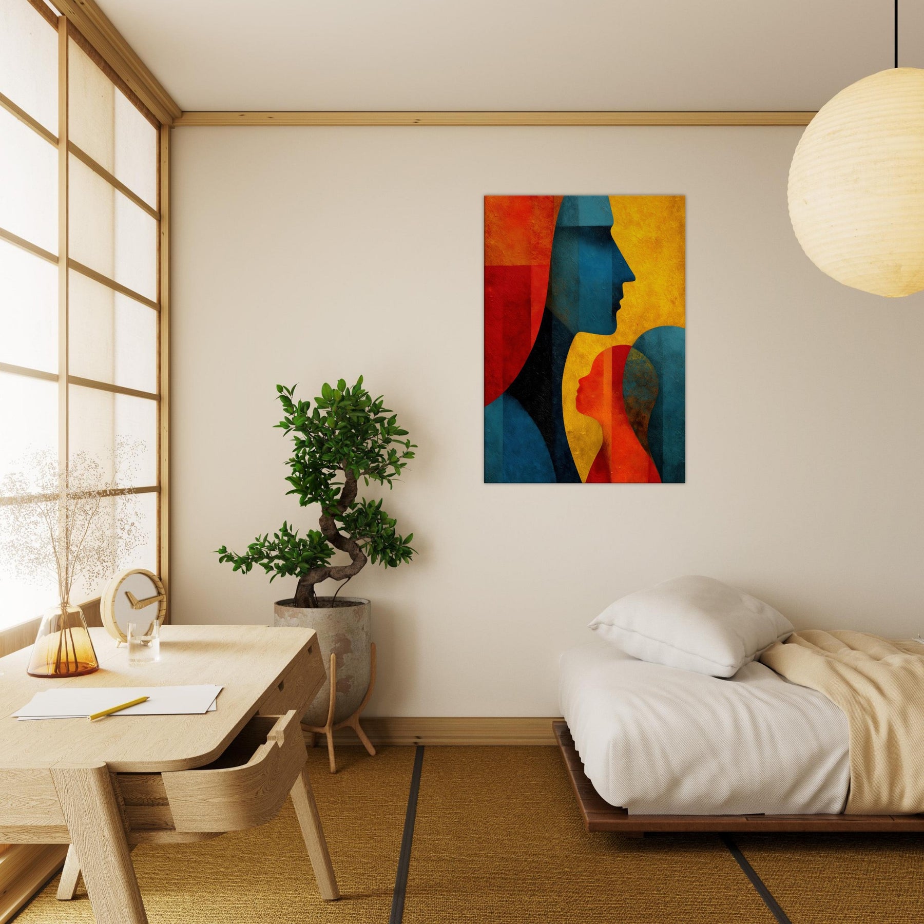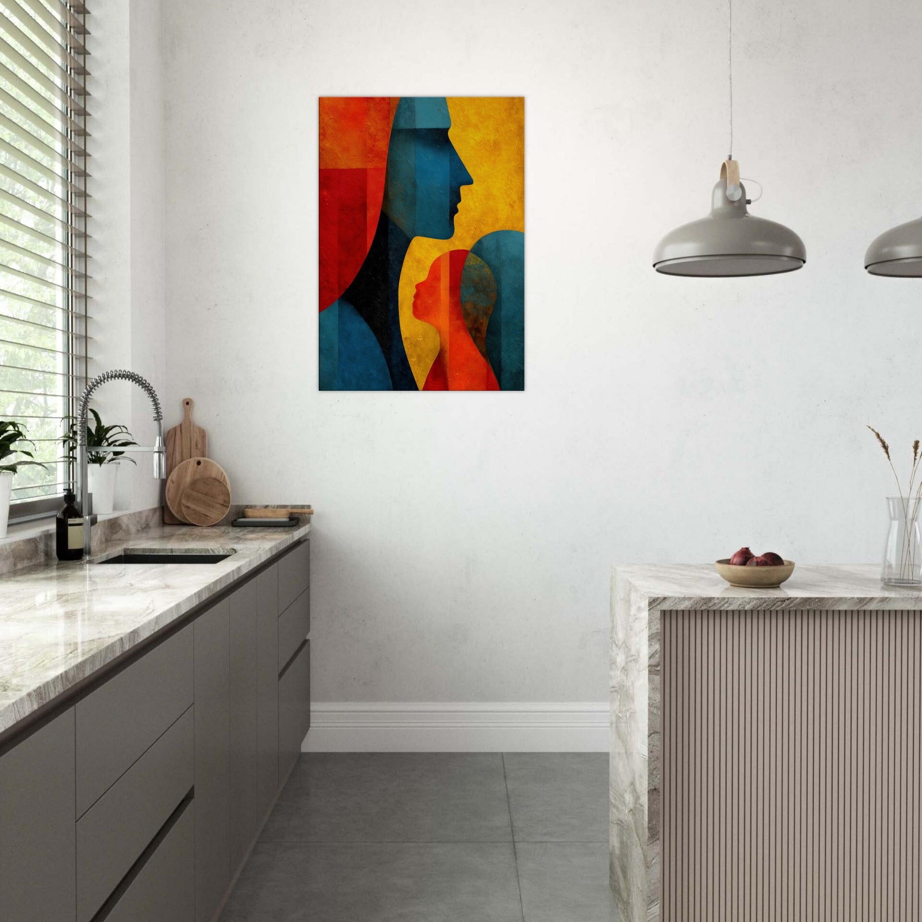 Meditative yet luminous, this abstract composition traces the quiet resonance between a parent and child. Bold blocks of color fold into intimate silhouettes, inviting soft light and warm conversations into your space. The layered tones cobalt, saffron, and ember flow like memory across the wall, turning a hallway into a sanctuary or a cozy living room into a haven of connection. Hang it where daily rituals unfold, and let the piece cradle the eye with a gentle, living atmosphere.