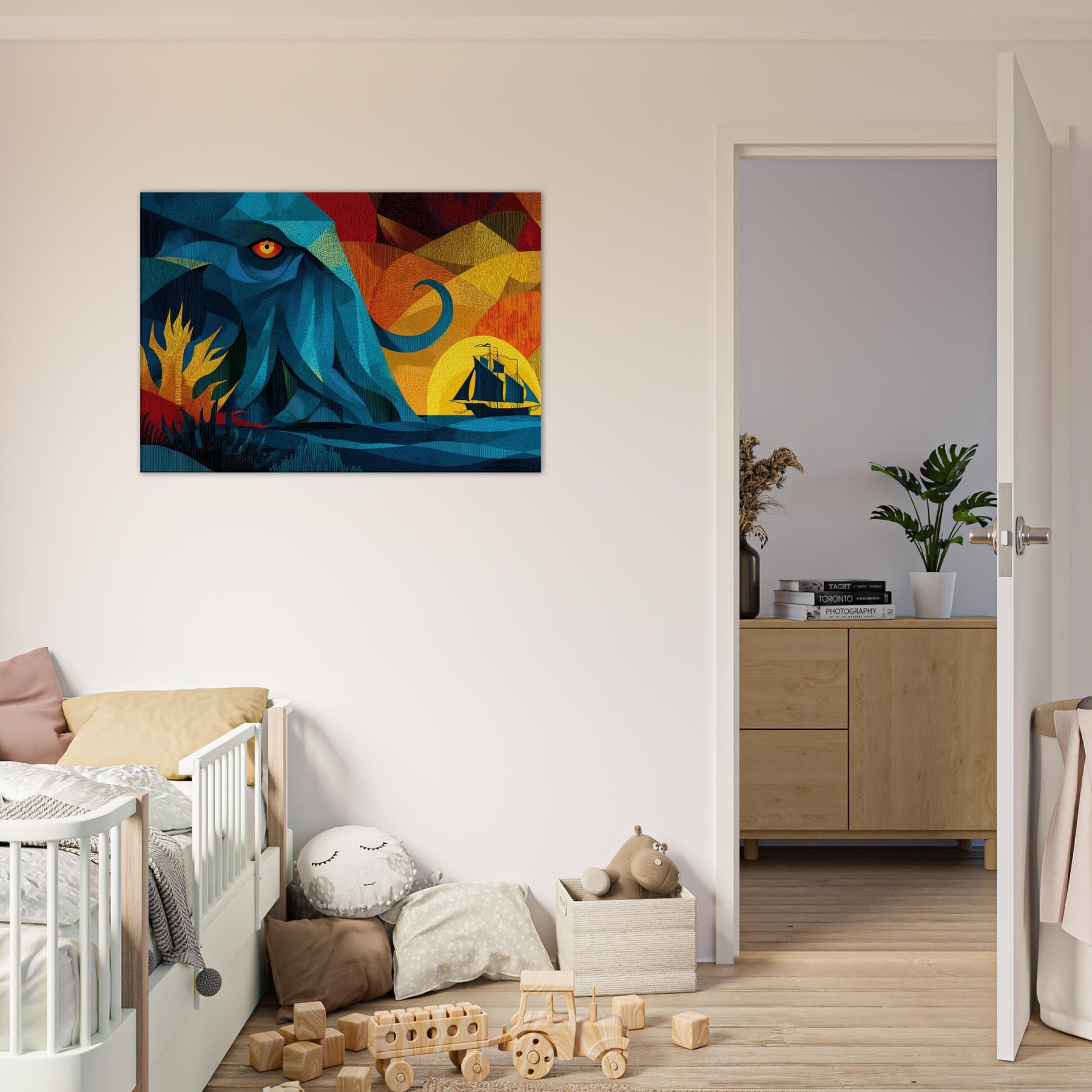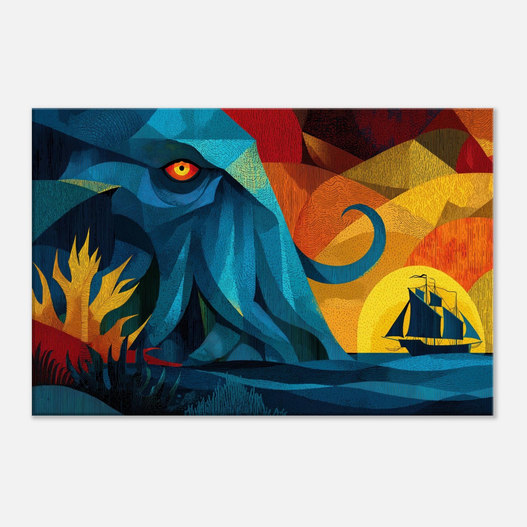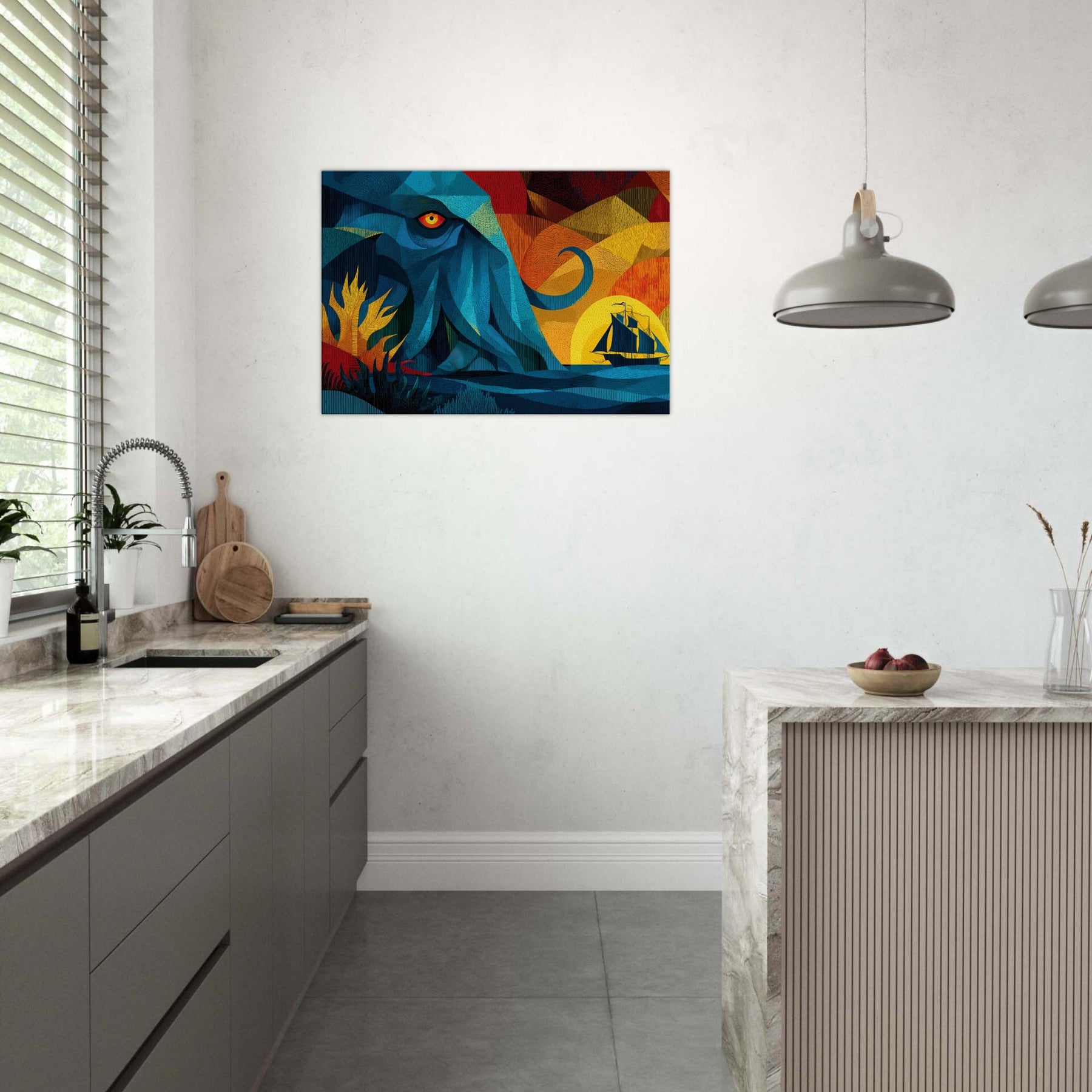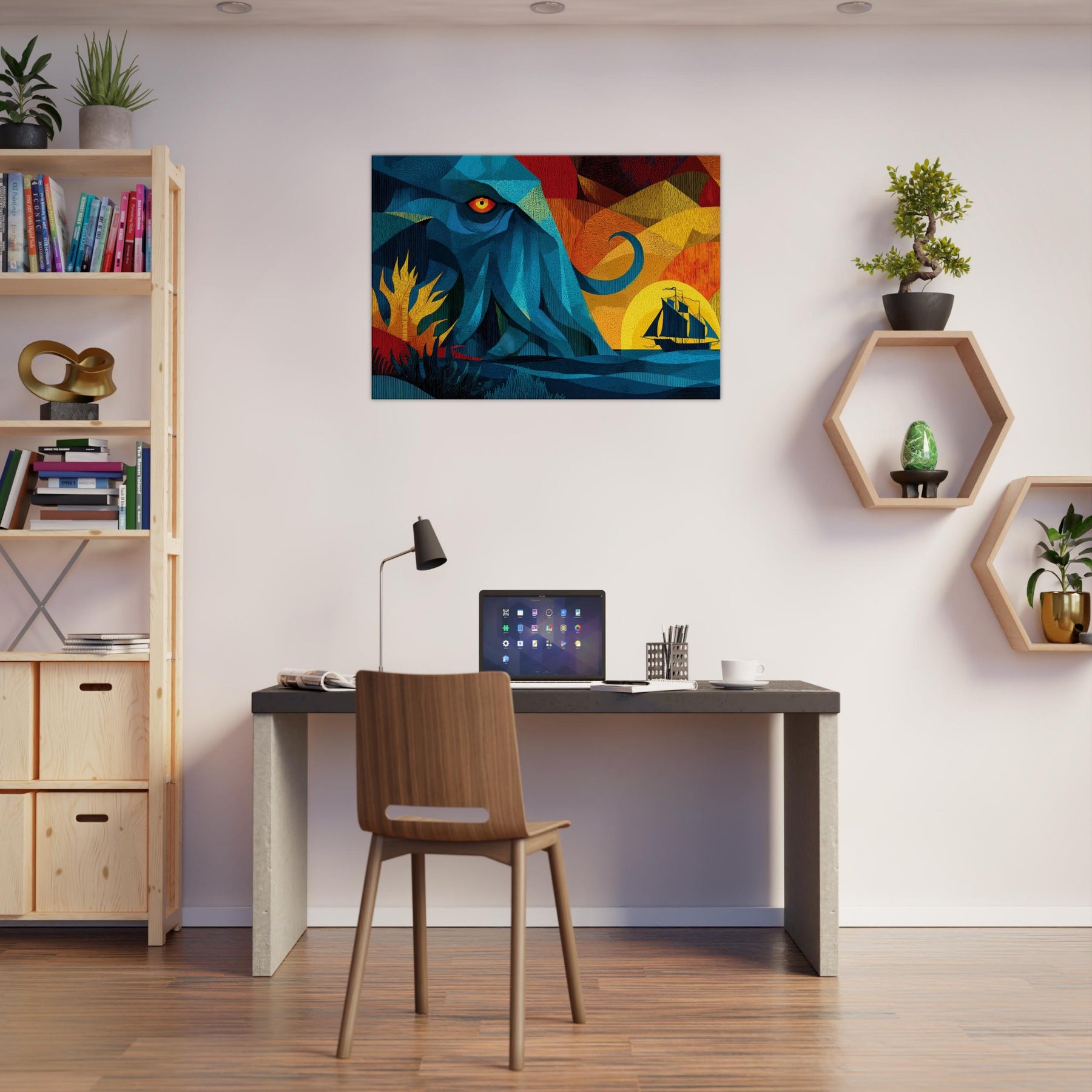 Step into a horizon where color surges like a storm and the Giant Kraken Emerging from the Sea looms with quiet majesty. This abstract composition blends cobalt depths with sun warmed ochres, inviting the eye to travel along curling tentacles and a distant sailing ship caught in a mythic dawn. The artwork hums with tactile textures and luminescent contrasts, transforming a wall into a theater of wonder perfect for a bedroom or study that longs for imaginative depth and a touch of nautical awe.