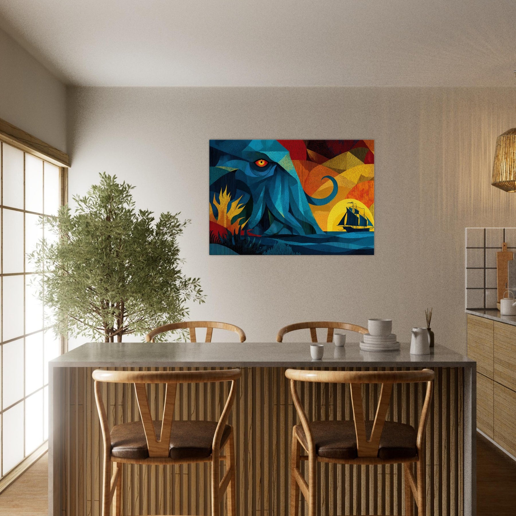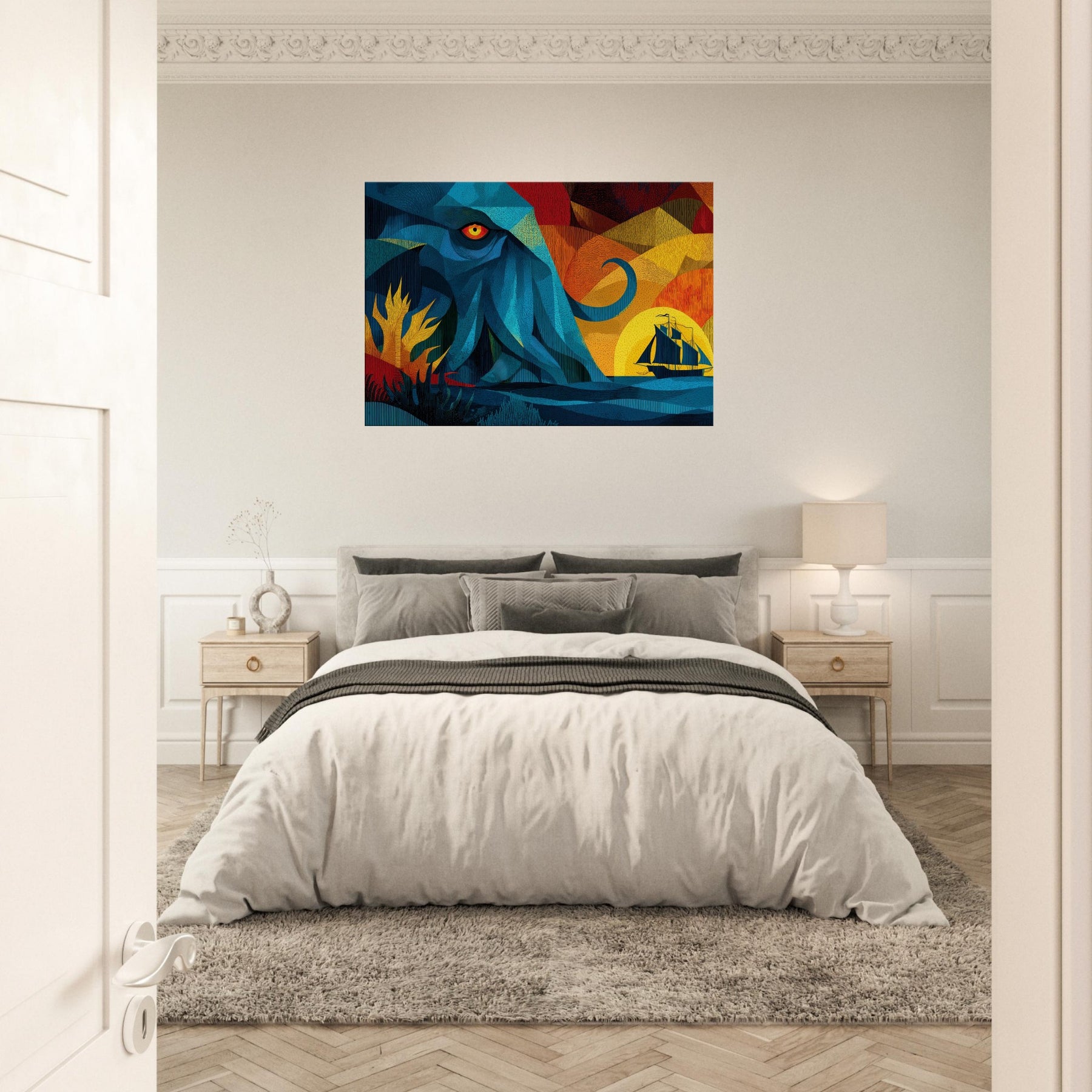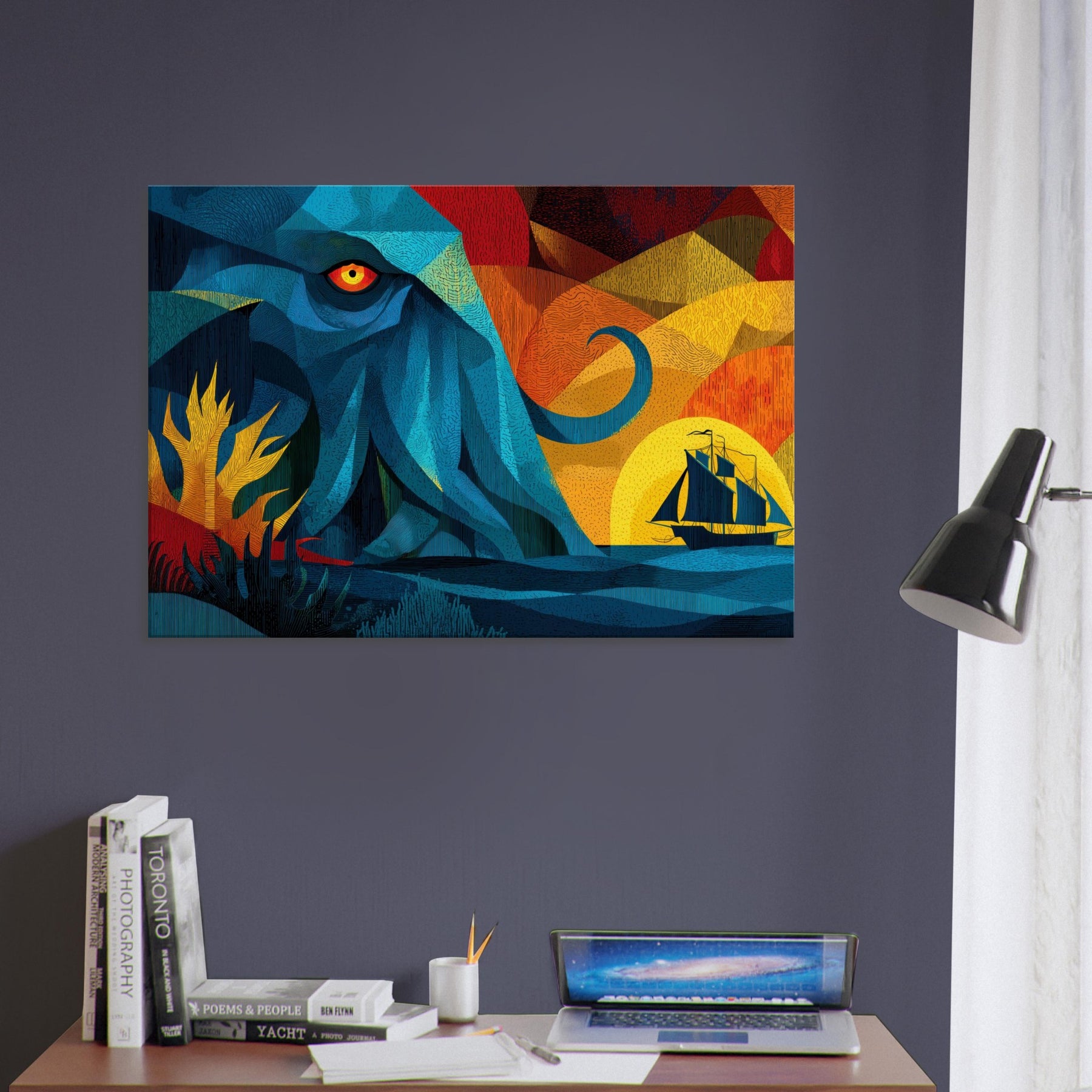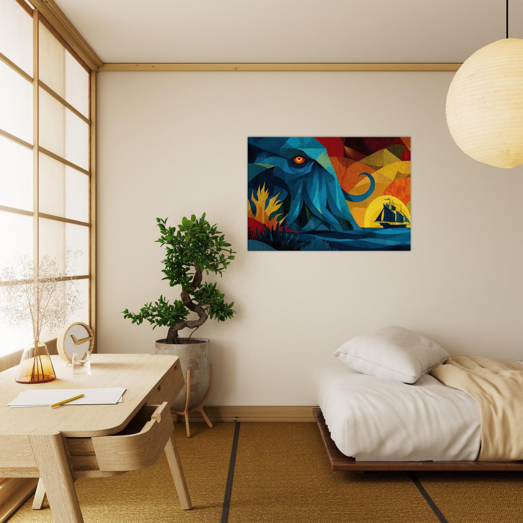 Step into a horizon where color surges like a storm and the Giant Kraken Emerging from the Sea looms with quiet majesty. This abstract composition blends cobalt depths with sun warmed ochres, inviting the eye to travel along curling tentacles and a distant sailing ship caught in a mythic dawn. The artwork hums with tactile textures and luminescent contrasts, transforming a wall into a theater of wonder perfect for a bedroom or study that longs for imaginative depth and a touch of nautical awe.